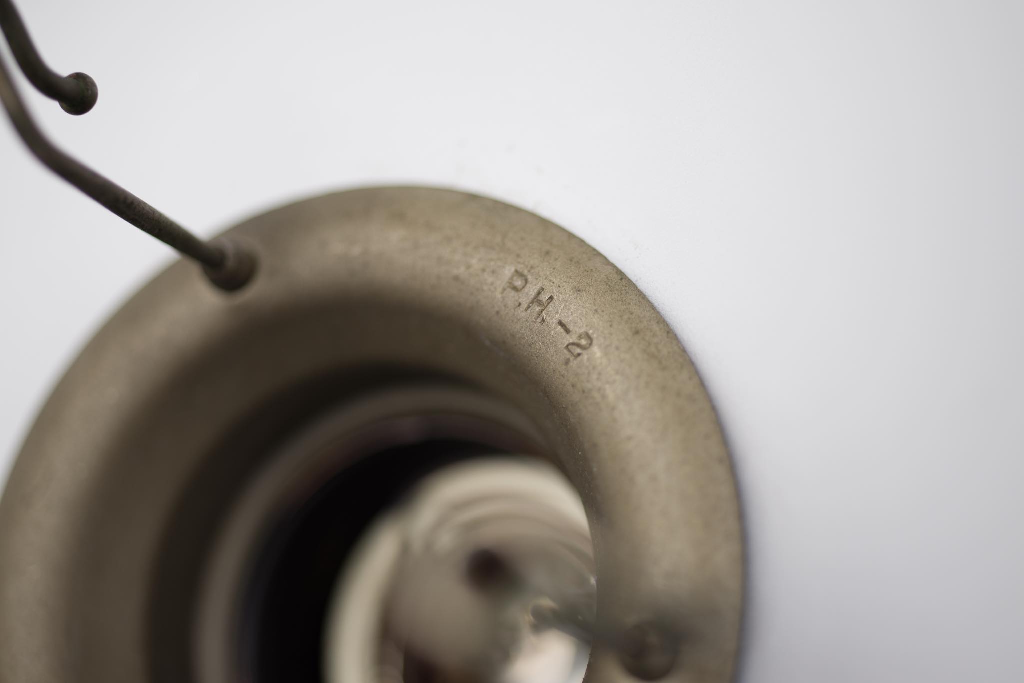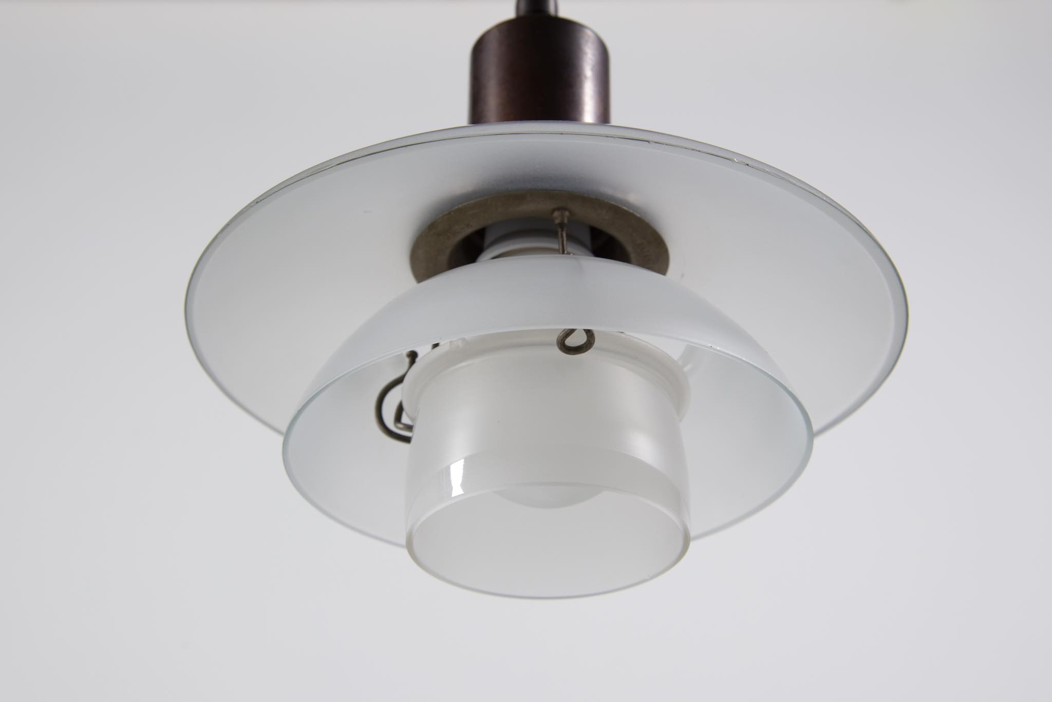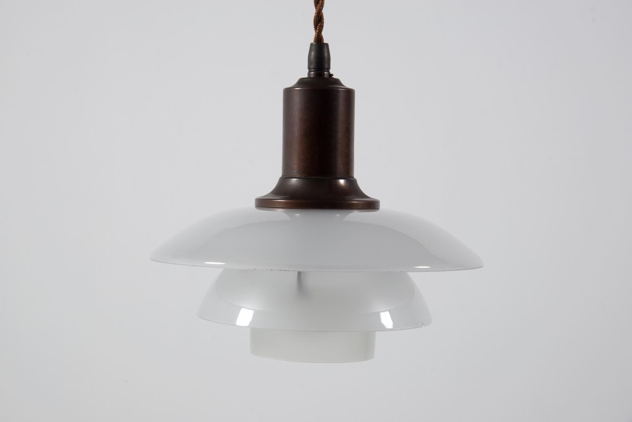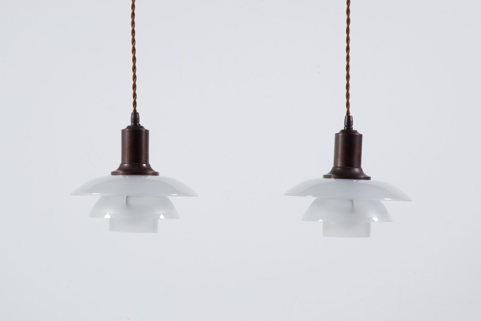 Poul Henningsen/ポール・ヘニングセンによってデザインされた、PH2/2ペンダントランプ一対です。1931年に発表されたモデルで、こちらはその頃に作られたものでしょう。銅製のソケットハウスにフロストガラスのシェードが伴います。綺麗な状態を保っており、配線などの消耗部品は新しいものに交換済みです。こちらは一対での販売となります。
