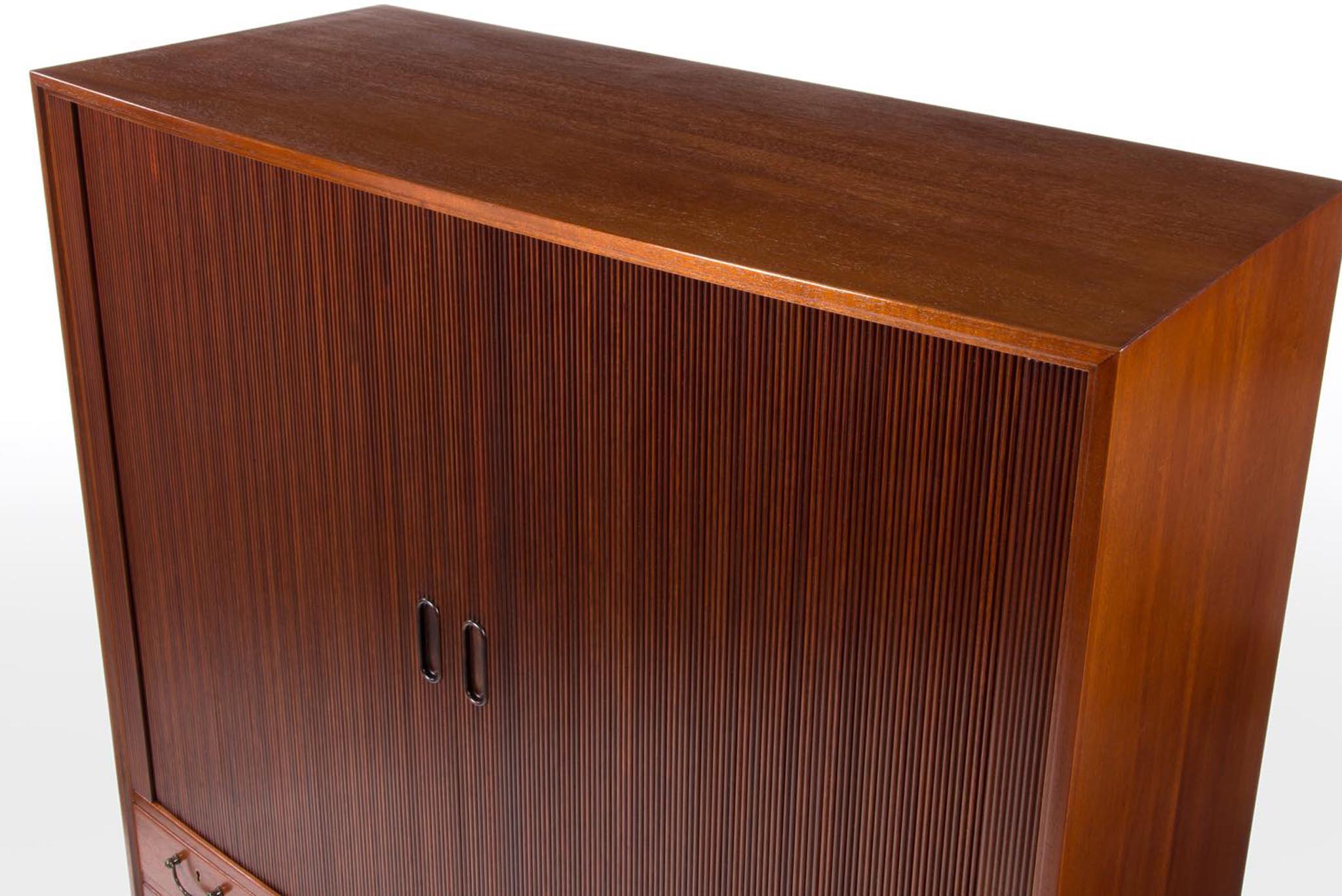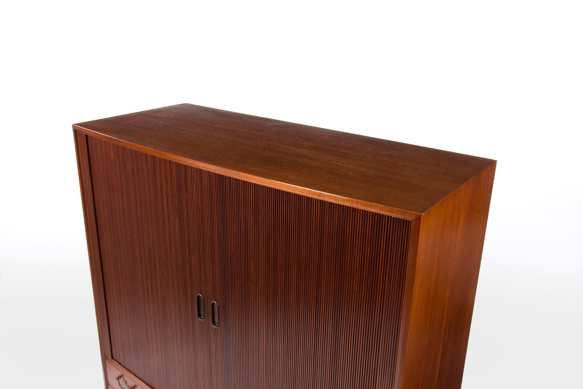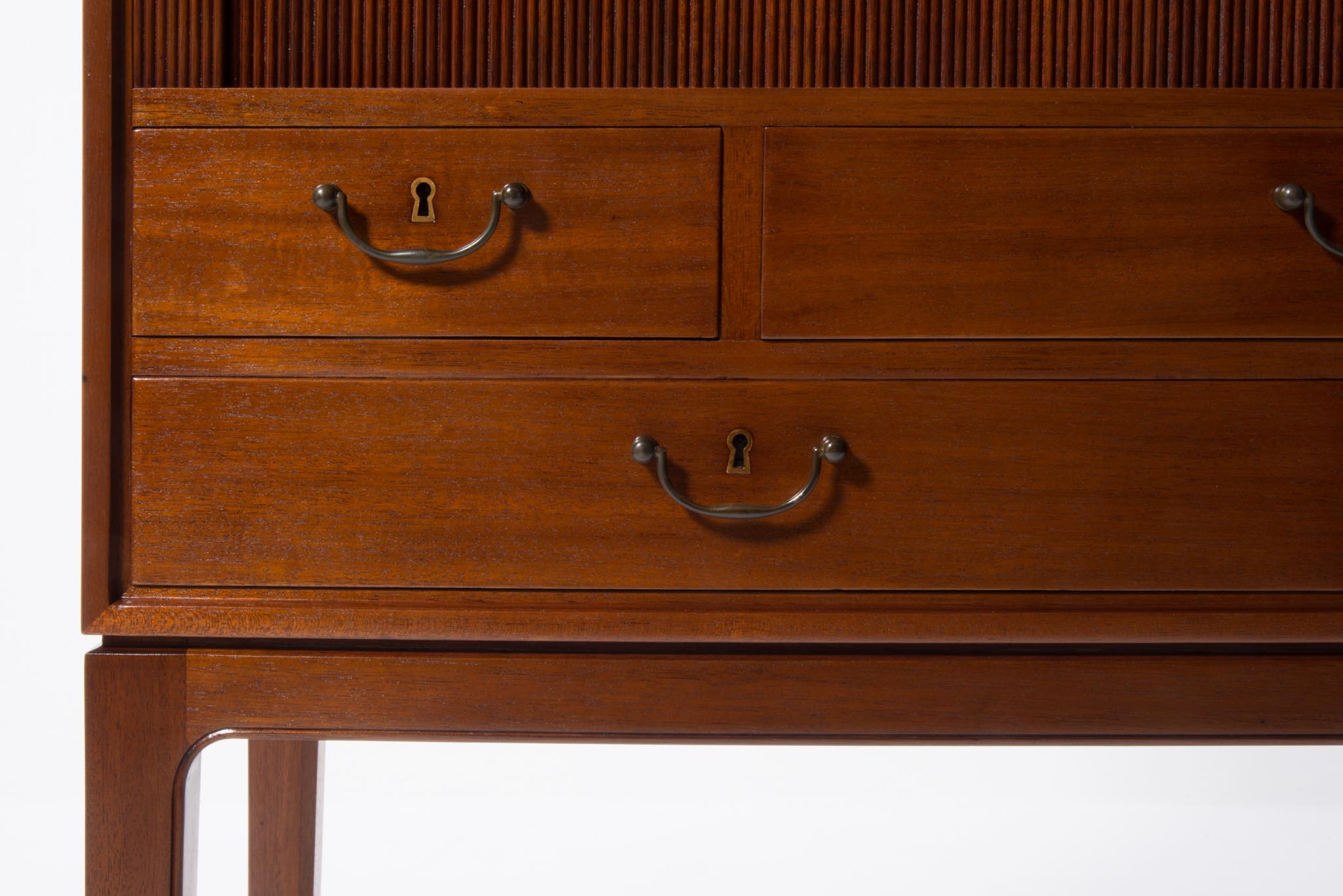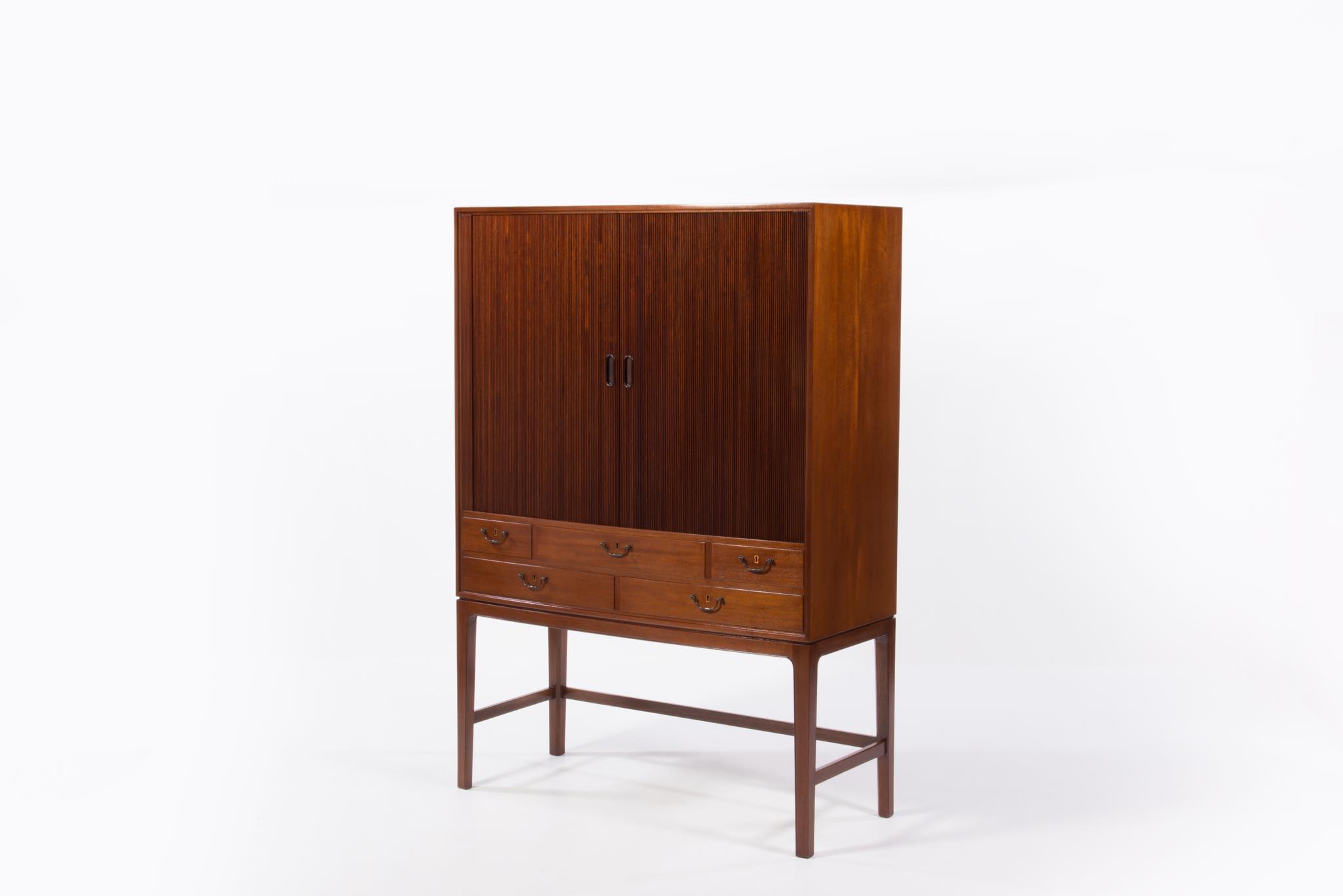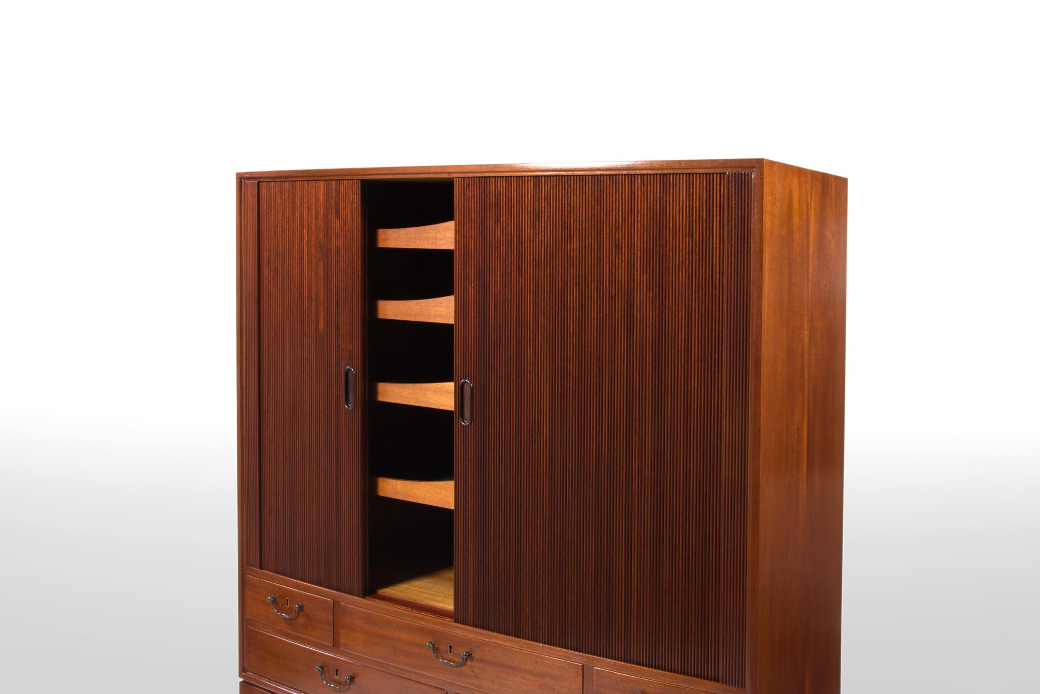 20世紀のデンマークを代表する家具デザイナーで、王立アカデミー家具科の主任教授も務めた、Ole Wanscher/オーレ・ヴァンシャーによるカップボードキャビネットです。20世紀の半ばにコペンハーゲンのインテリア百貨店 Illums Bolighus/イルムス・ボリフスにて販売されたモデルで、マホガニー材が用いられております。タンブールドアと呼ばれる蛇腹の引戸が特徴的で、抽斗には真鍮製のハンドルが備わります。コンディションは良好で、とても綺麗な状態です。棚板の片面に輪染みが見られますが、返すと同じ作りで綺麗な状態です。鍵が一本付属し抽斗の施錠が可能ですが、左上の抽斗のみ施錠出来ません。