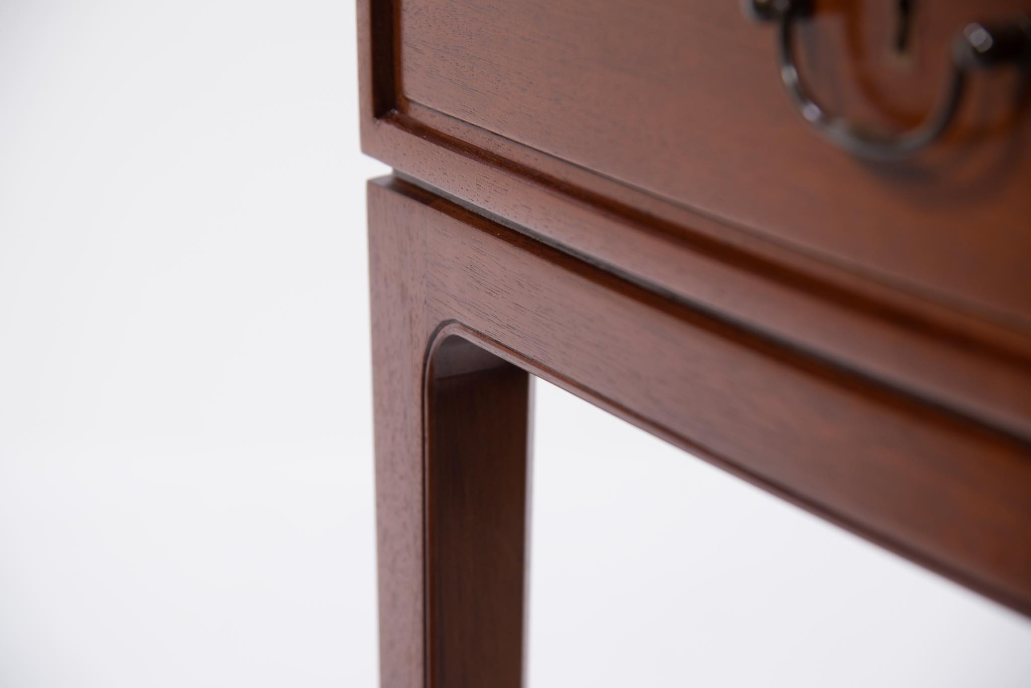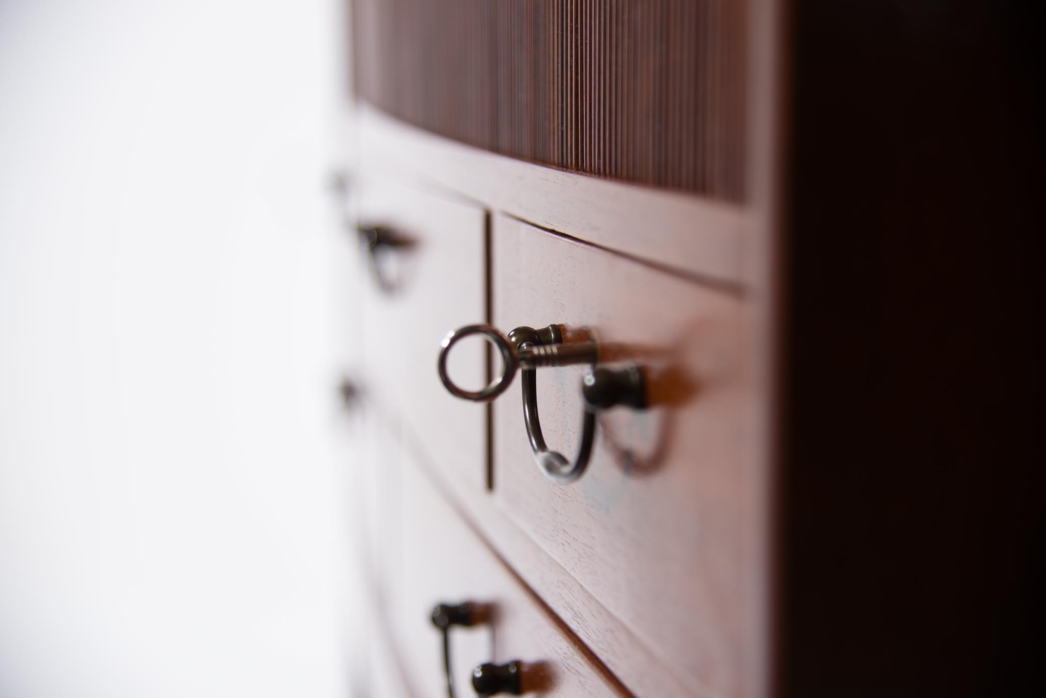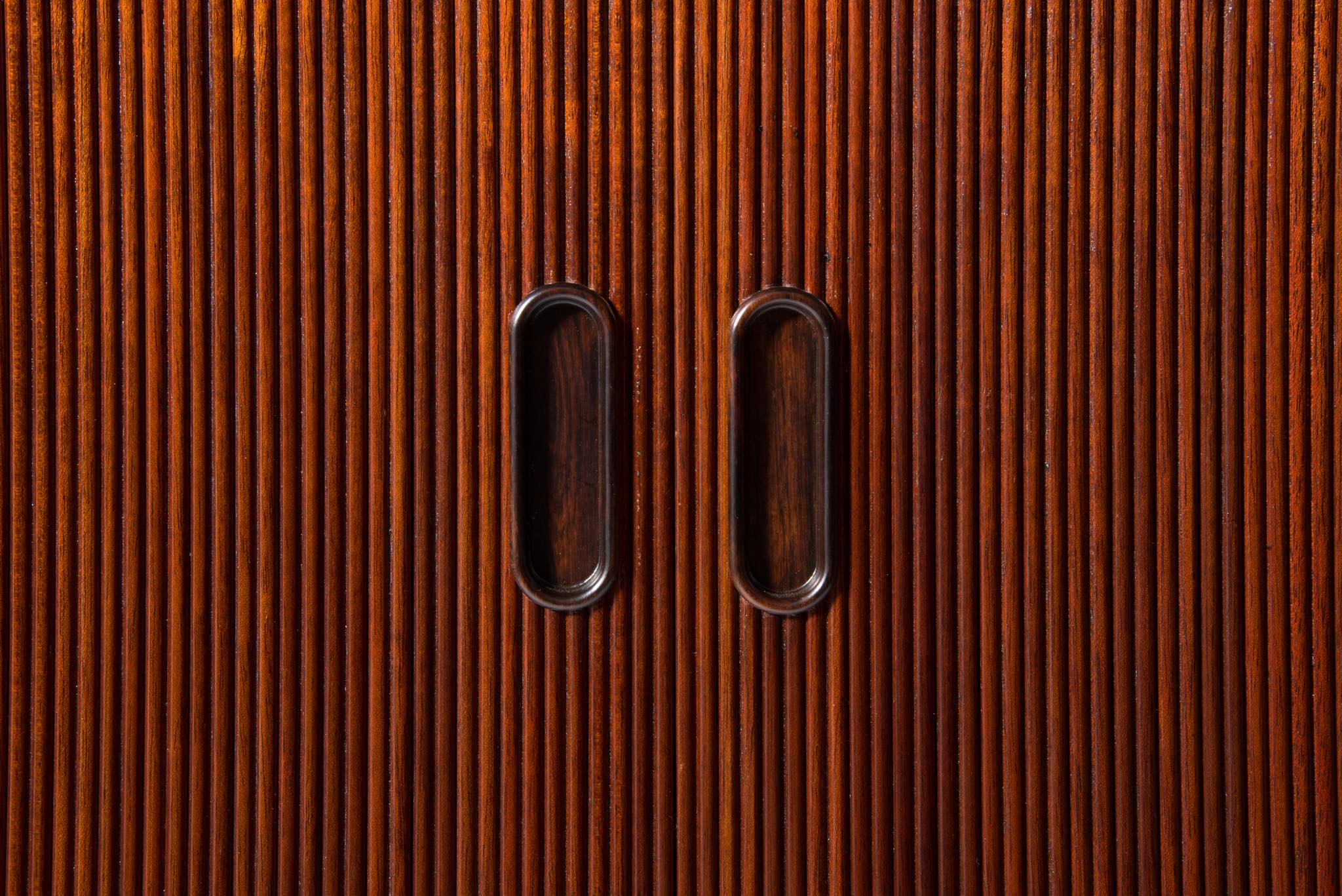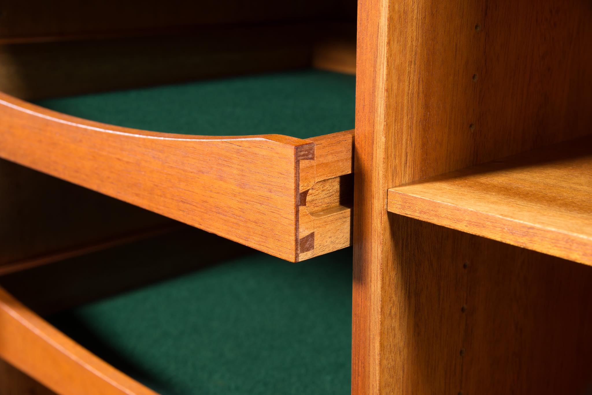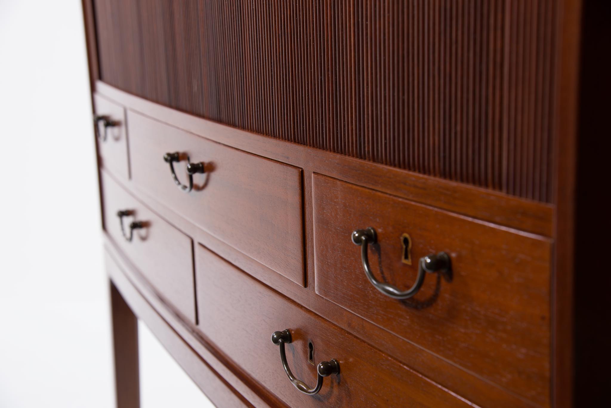 20世紀のデンマークを代表する家具デザイナーで、王立アカデミー家具科の主任教授も務めた、Ole Wanscher/オーレ・ヴァンシャーによるカップボードキャビネットです。20世紀の半ばにコペンハーゲンのインテリア百貨店 Illums Bolighus/イルムス・ボリフスにて販売されたモデルで、マホガニー材が用いられております。タンブールドアと呼ばれる蛇腹の引戸が特徴的で、抽斗には真鍮製のハンドルが備わります。コンディションは良好で、とても綺麗な状態です。棚板の片面に輪染みが見られますが、返すと同じ作りで綺麗な状態です。鍵が一本付属し抽斗の施錠が可能ですが、左上の抽斗のみ施錠出来ません。