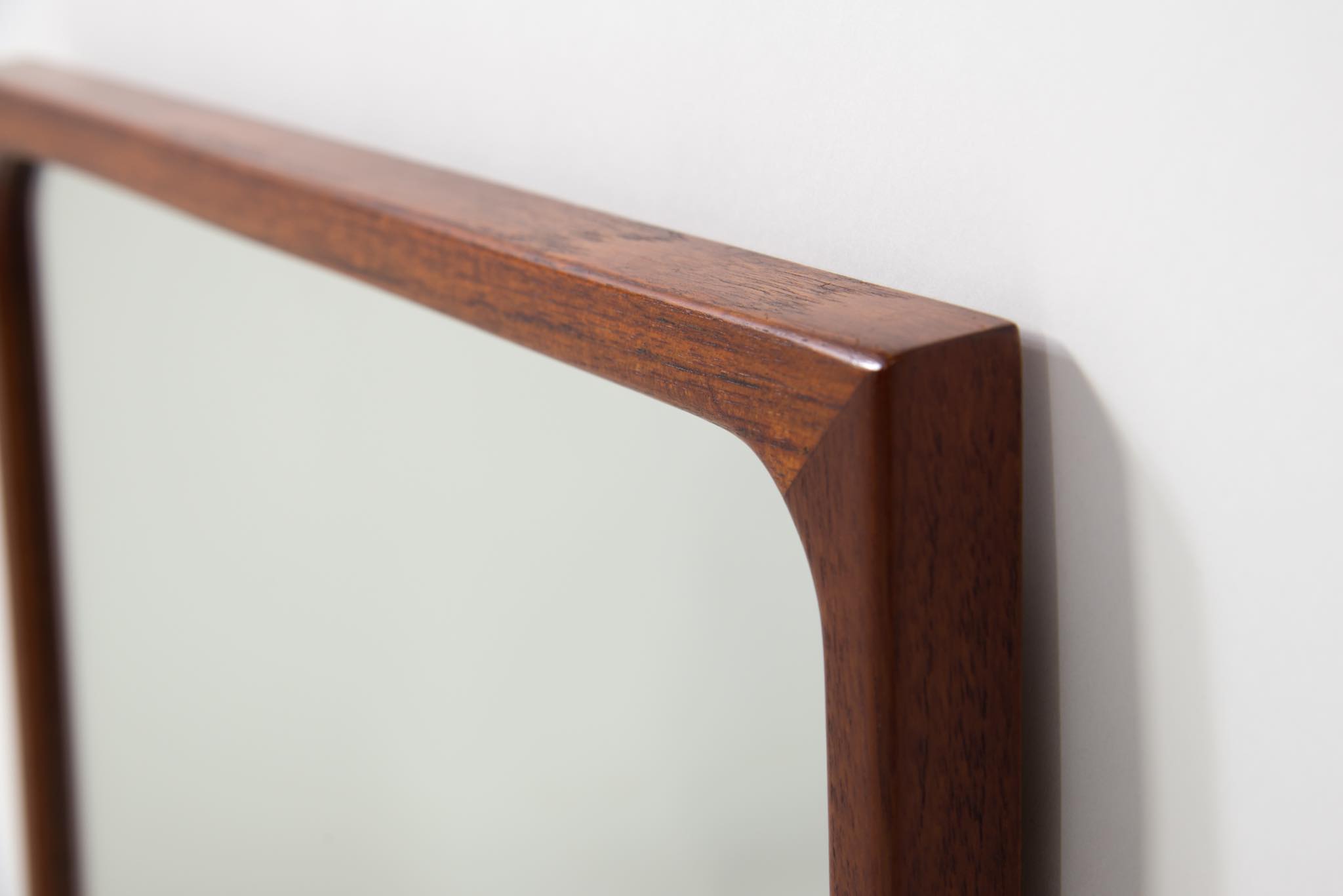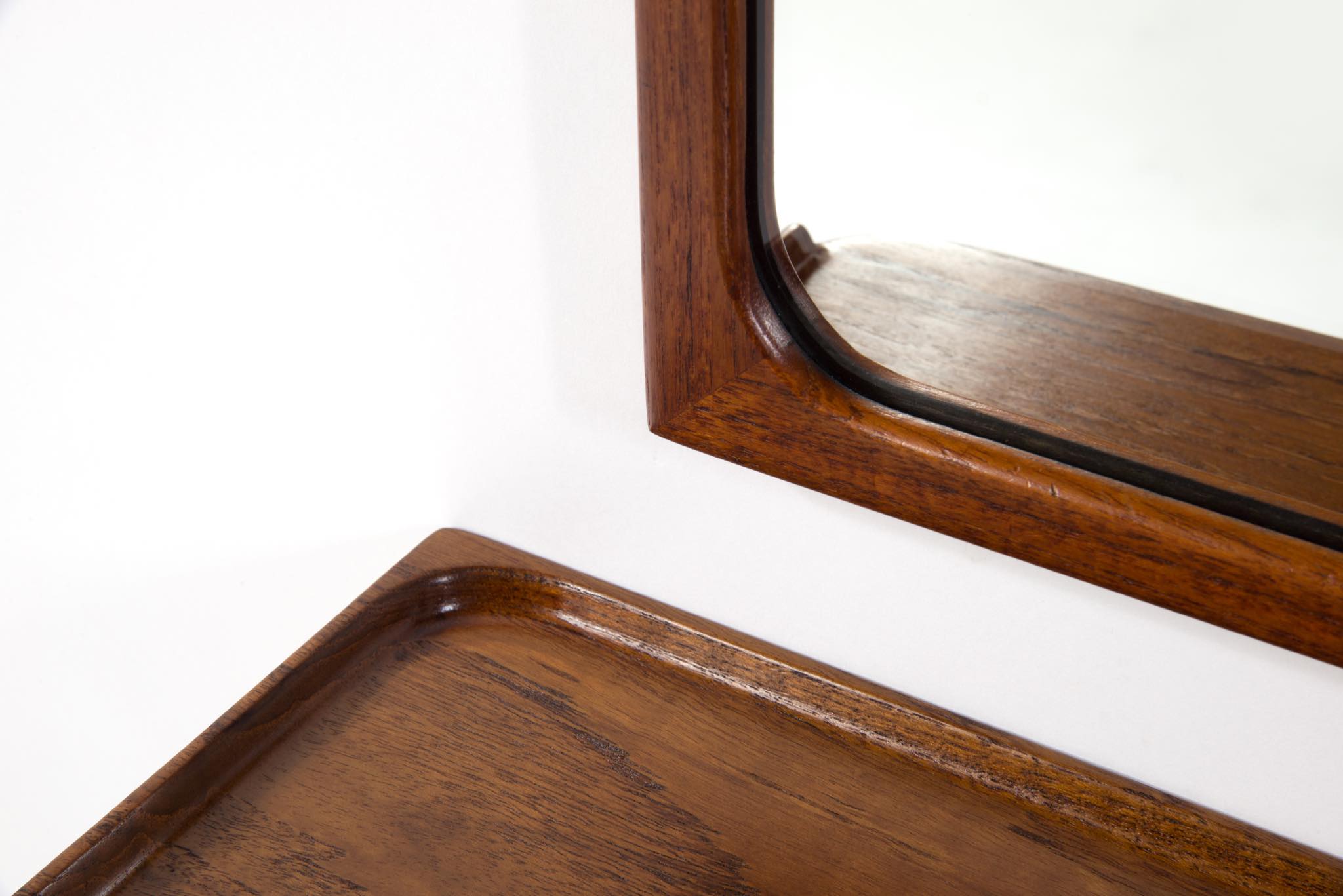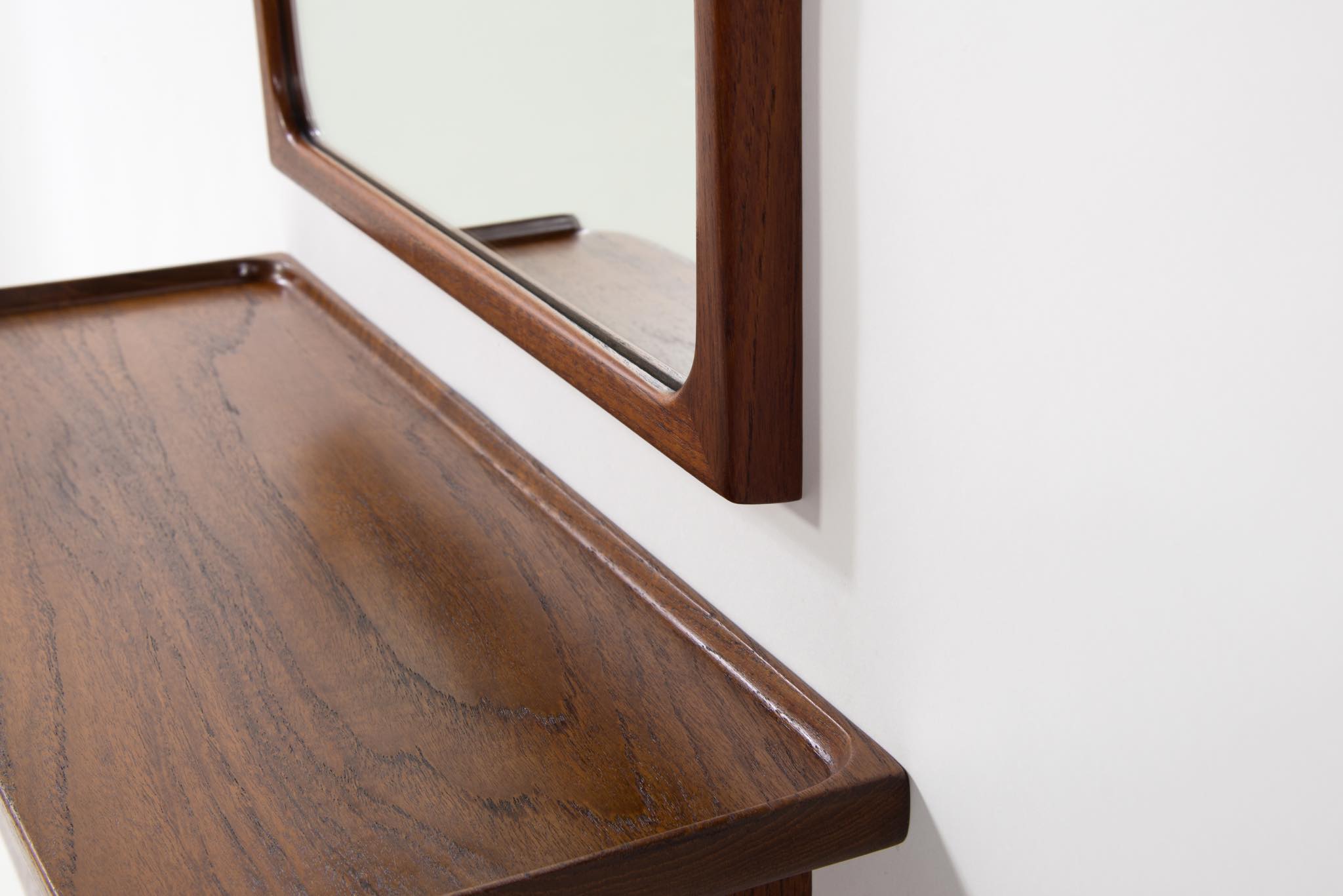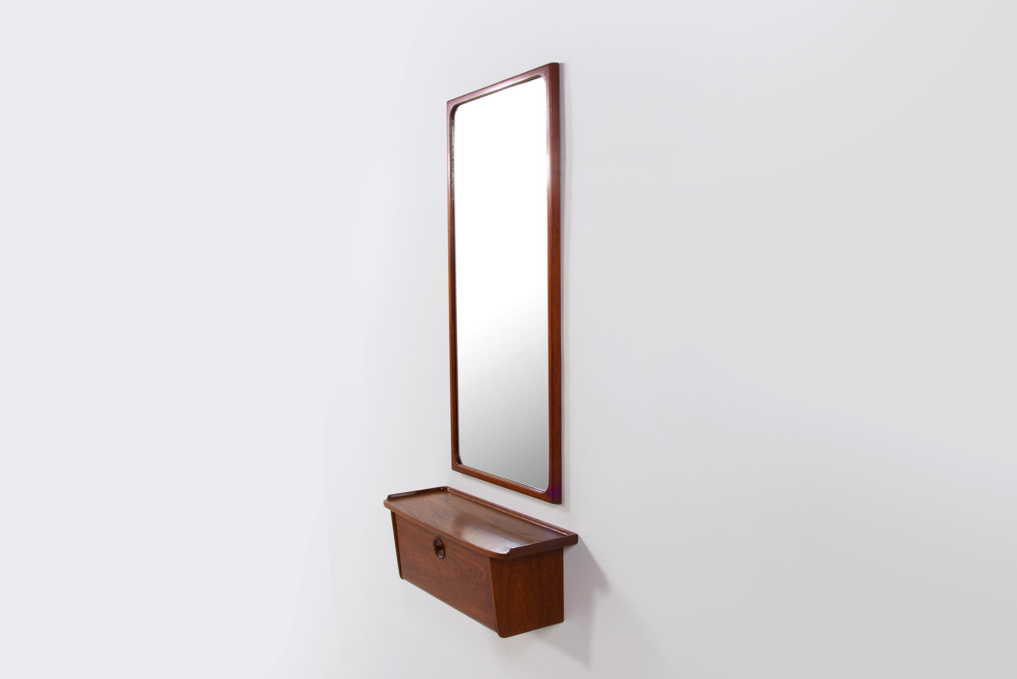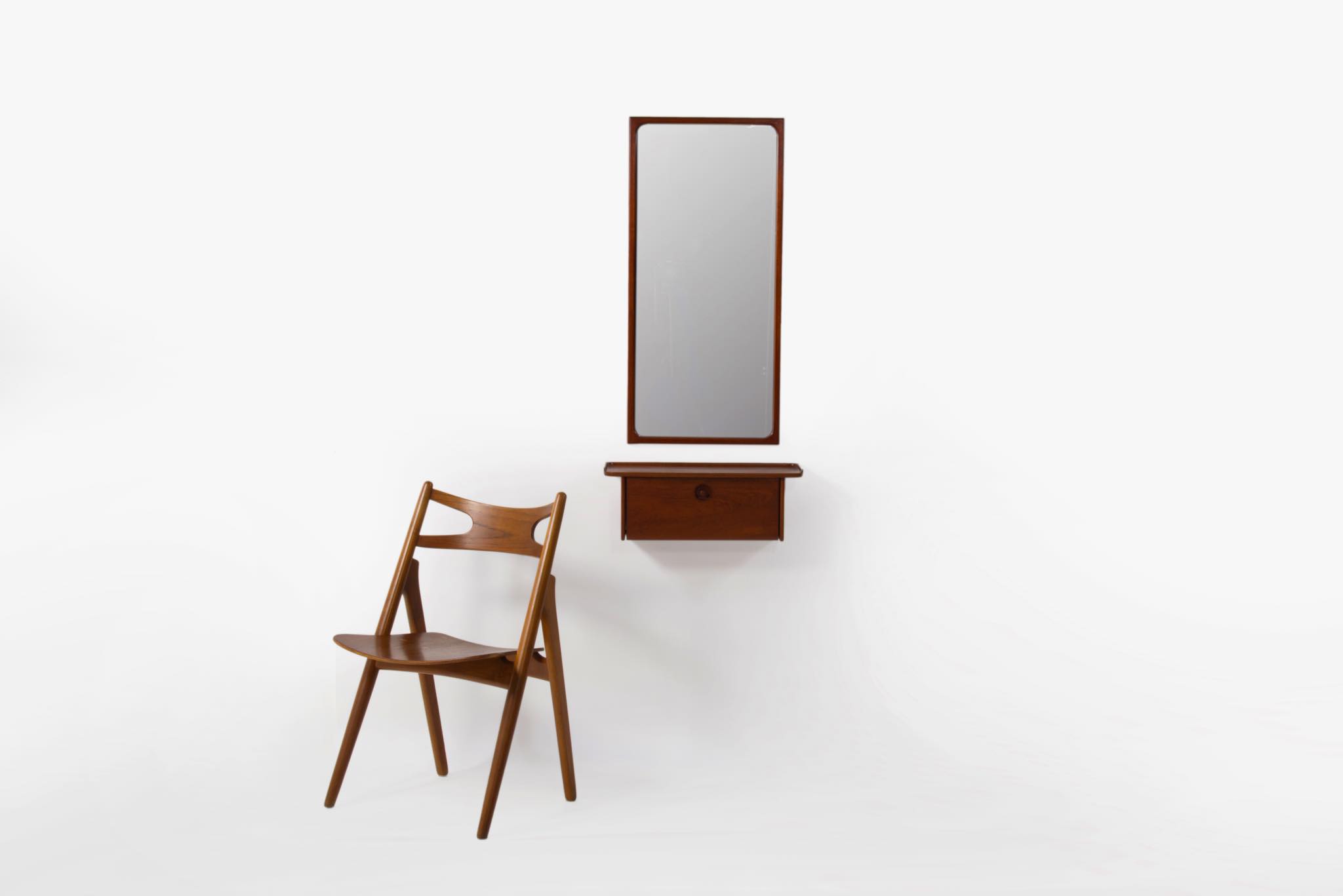 上質な家具を手がける工房として知られる、ポントピダンによるコンソールボックスと鏡のセットです。1950年代頃に作られたものでしょう。タイ国原産と思しき良質なチーク材が用いられています。コンソールボックスは玄関に設え、衣類ブラシや家の鍵などを収納したものでしょう。鏡は新たに整えました。