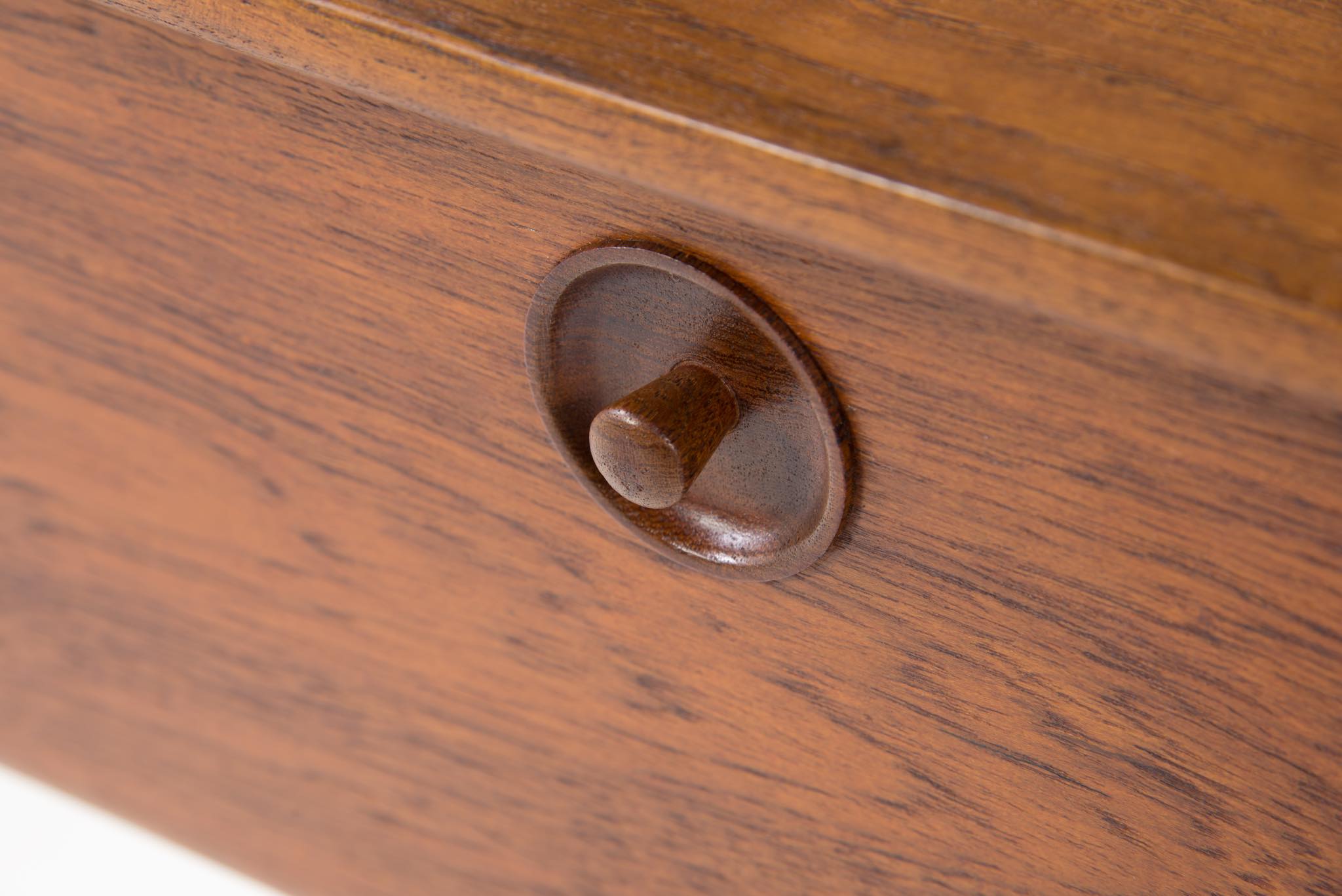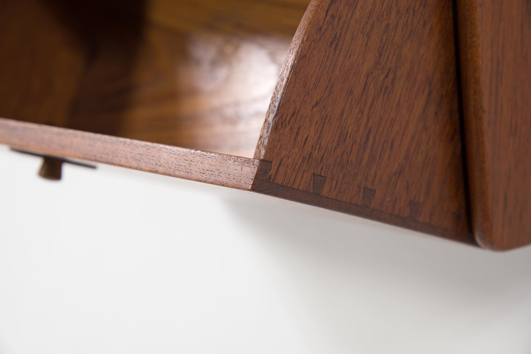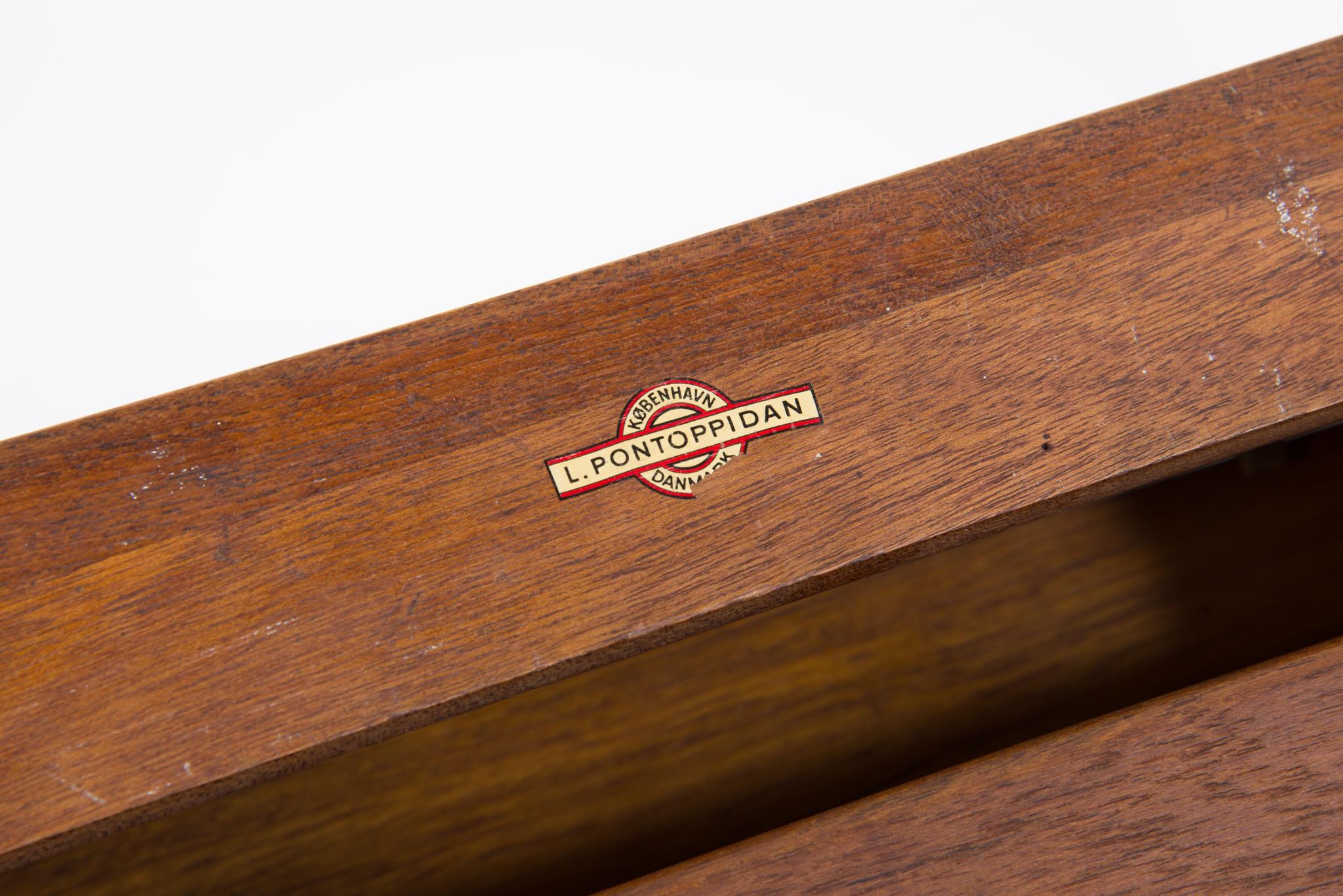 ポントピダン工房は、1961年、フィン・ユールによるカラフルな抽斗のチェスト「Handskeskab」を手がけた工房として知られています。特にテーブルや箱物を得意とするメーカーですが、木工芸としての精度が極めて高く、木材の持つ特性を十分に引き出しながら家具製作を行ったことで知られています。
