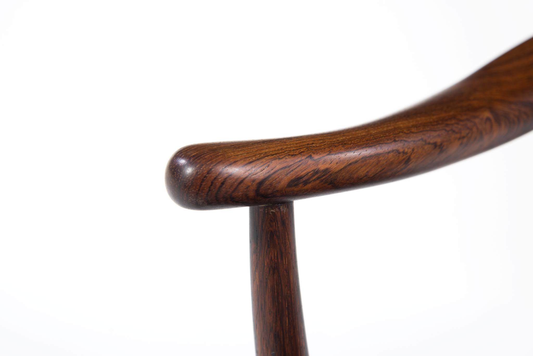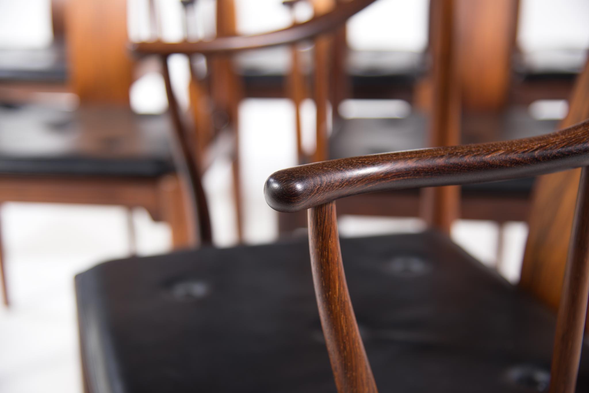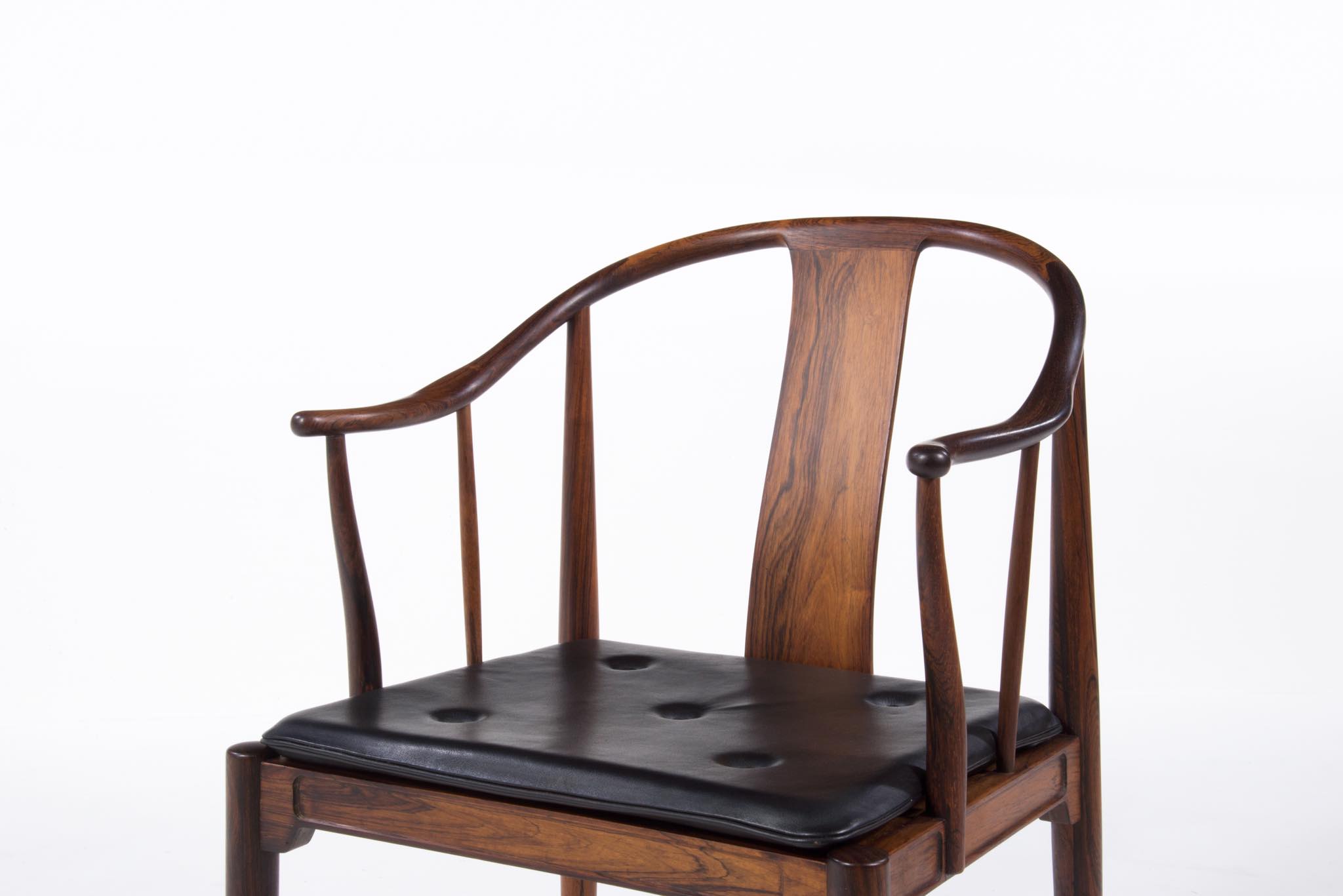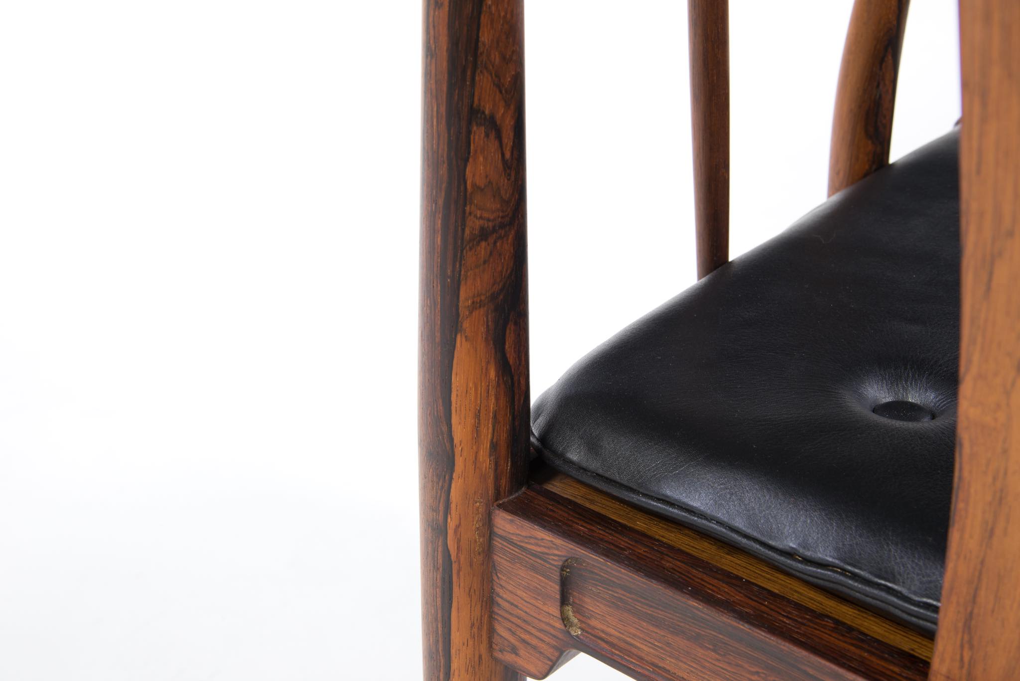 デンマークの家具デザイナー、Hans J. Wegner/ハンス・ウェグナーによる代表作のひとつ ”チャイナチェア” のブラジリアンローズウッド仕様、6脚セットです。1960代頃に作られたものでしょう。ブラジル原産と思しきローズウッド材を用いたモデルは大変希少なようで、こちらは製造時に同ロットで作られた6脚揃いとなります。黒色皮革のシートは当時のオリジナルのようです。コンディションにつきましてはお問い合わせください。