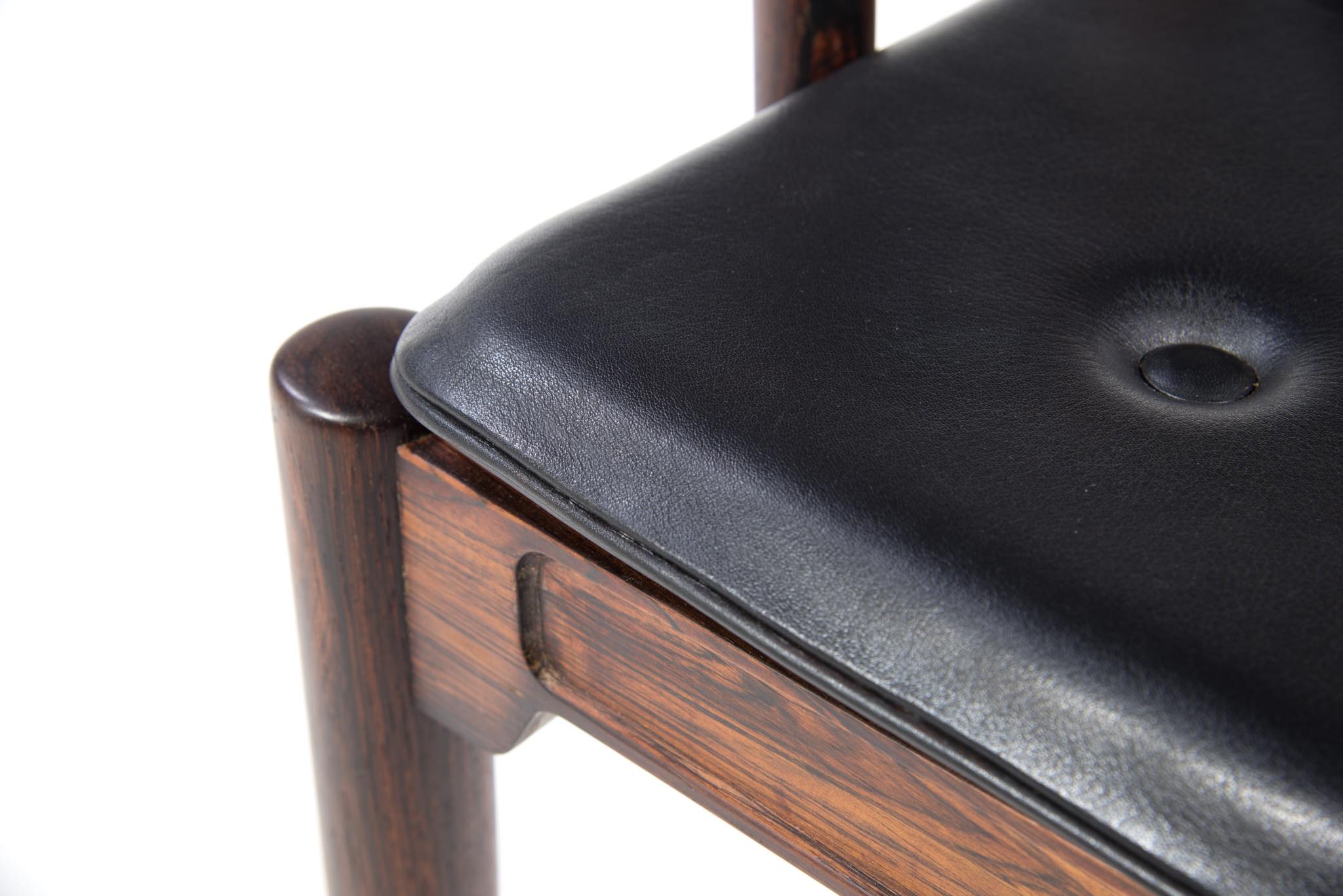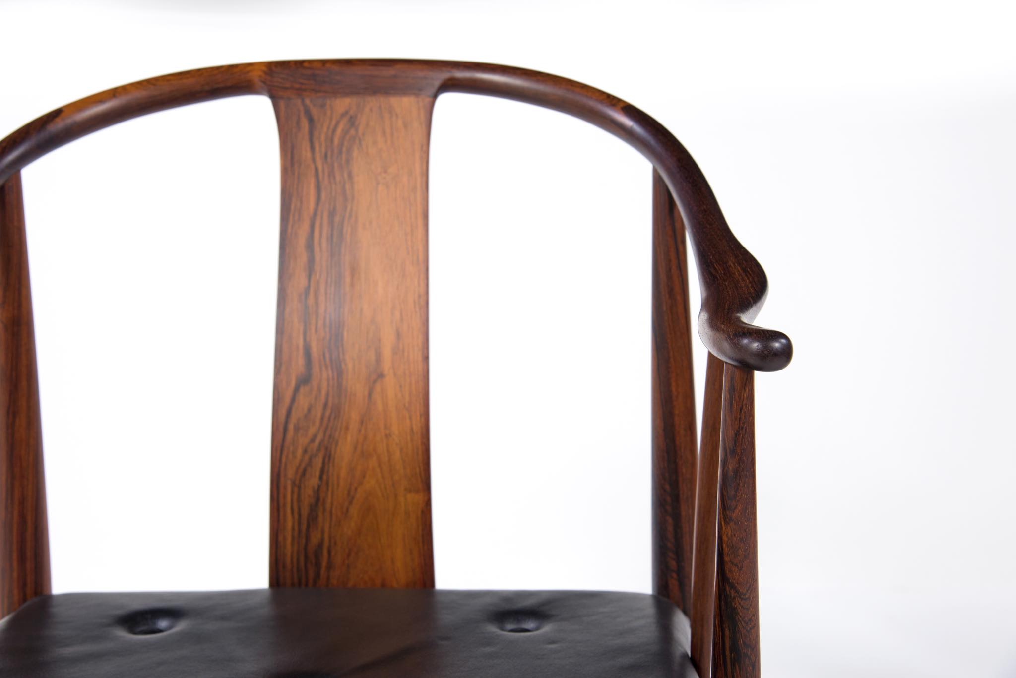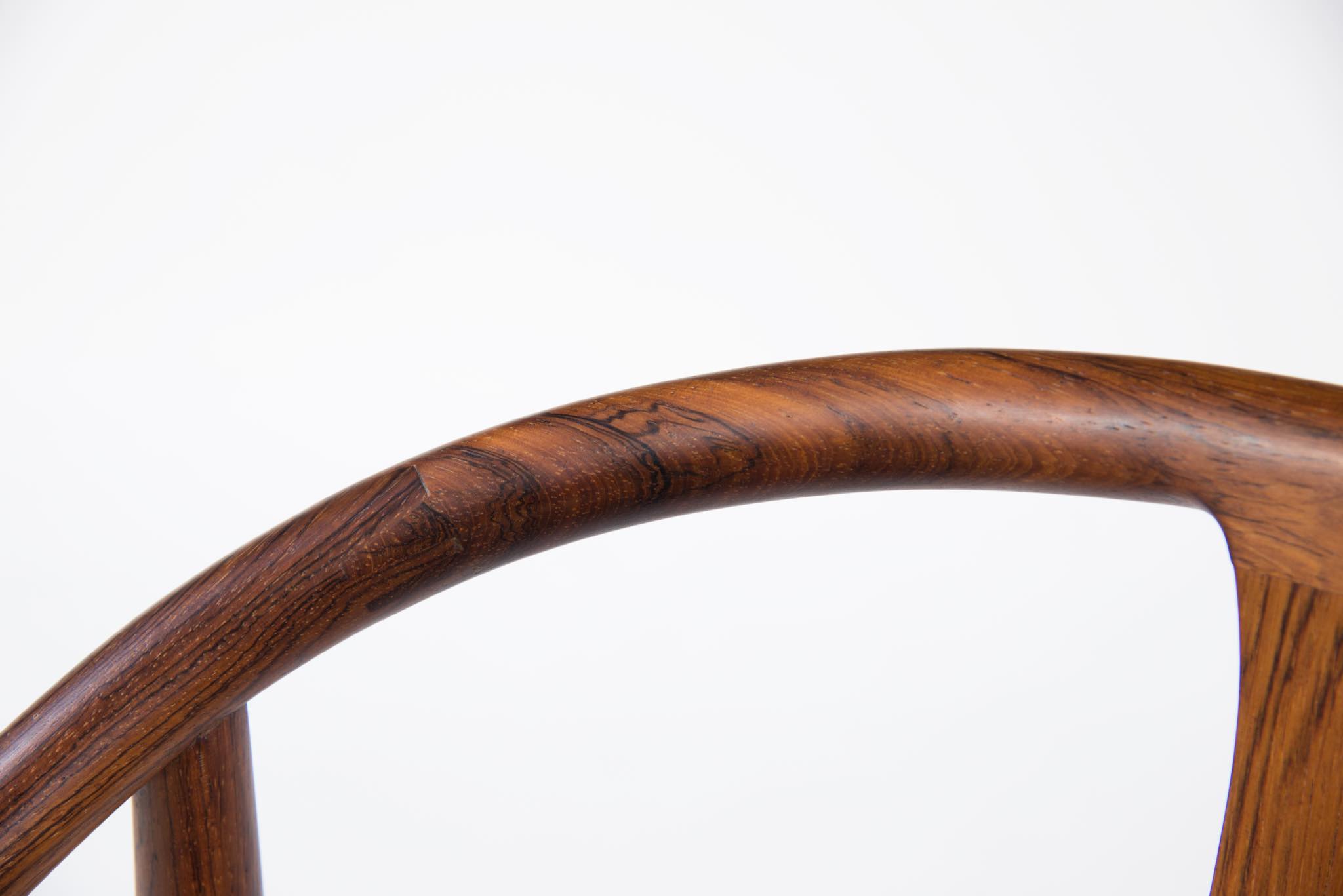 デンマークの家具デザイナー、Hans J. Wegner/ハンス・ウェグナーによる代表作のひとつ ”チャイナチェア” のブラジリアンローズウッド仕様、6脚セットです。1960代頃に作られたものでしょう。ブラジル原産と思しきローズウッド材を用いたモデルは大変希少なようで、こちらは製造時に同ロットで作られた6脚揃いとなります。黒色皮革のシートは当時のオリジナルのようです。コンディションにつきましてはお問い合わせください。