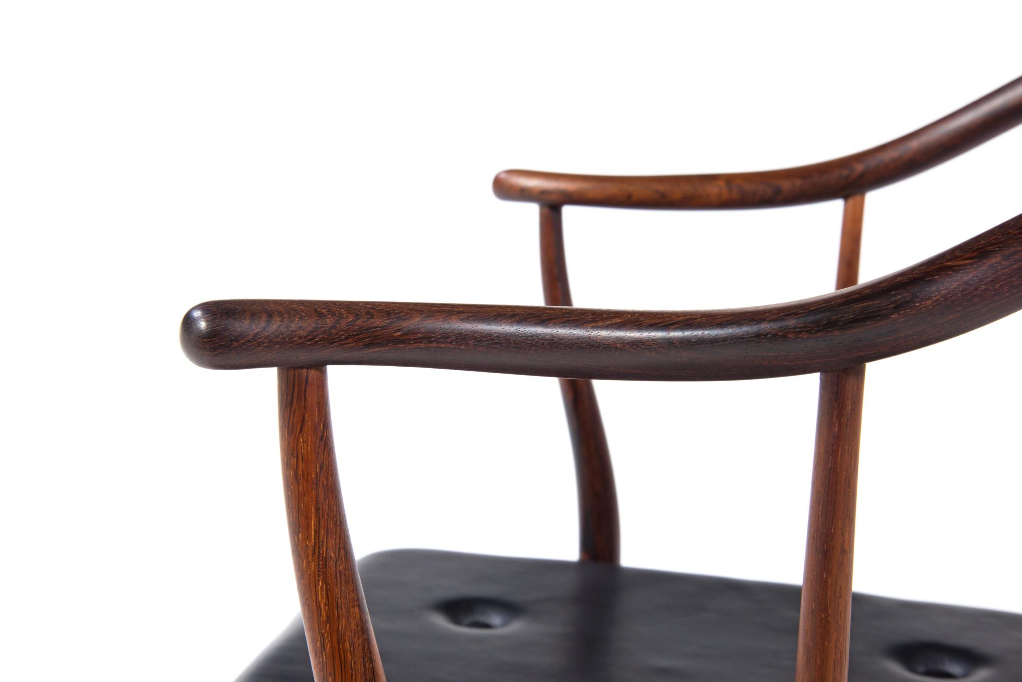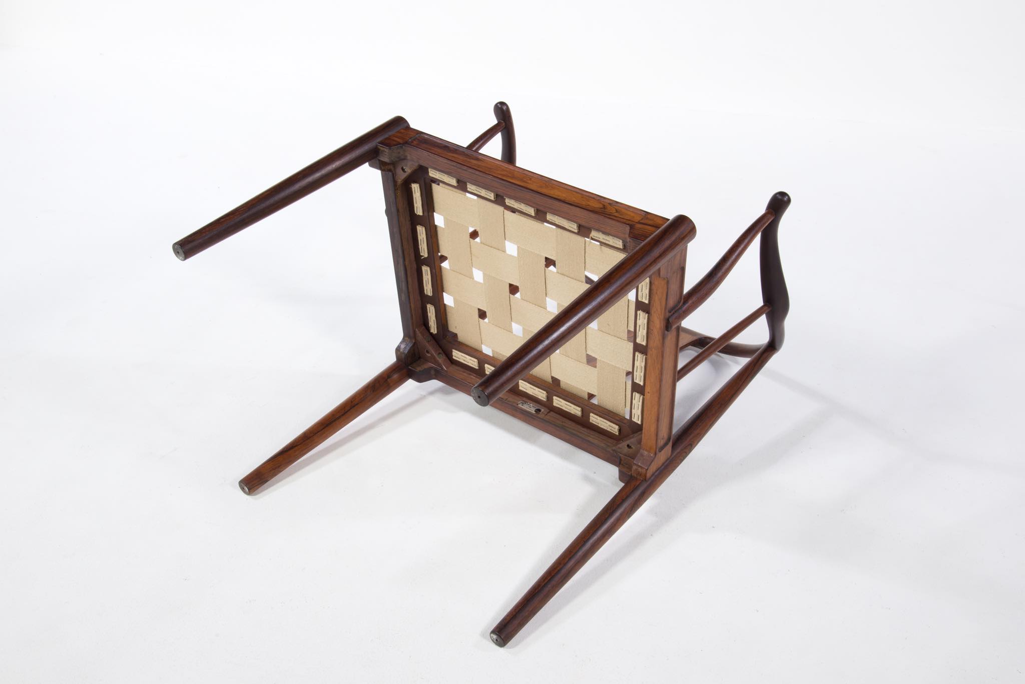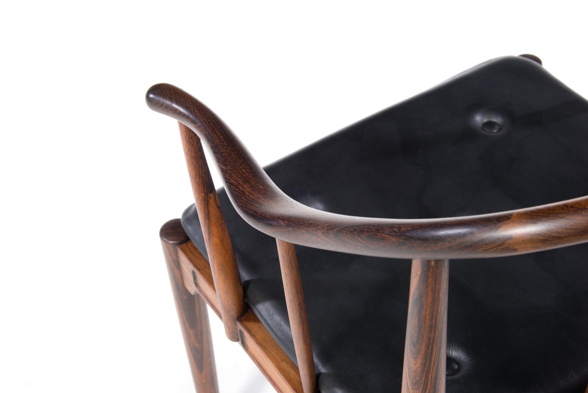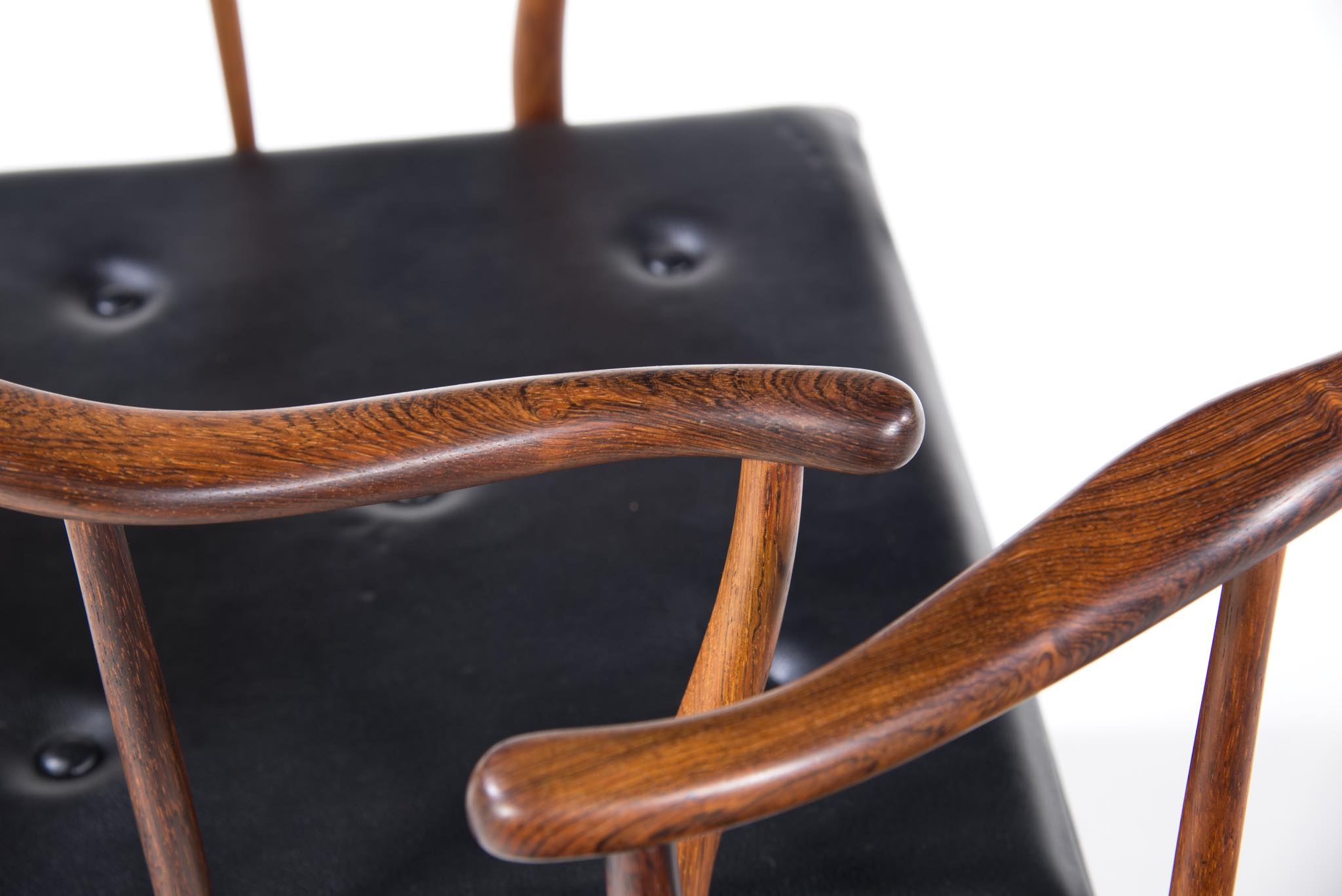 デンマークの家具デザイナー、Hans J. Wegner/ハンス・ウェグナーによる代表作のひとつ ”チャイナチェア” のブラジリアンローズウッド仕様、6脚セットです。1960代頃に作られたものでしょう。ブラジル原産と思しきローズウッド材を用いたモデルは大変希少なようで、こちらは製造時に同ロットで作られた6脚揃いとなります。黒色皮革のシートは当時のオリジナルのようです。コンディションにつきましてはお問い合わせください。