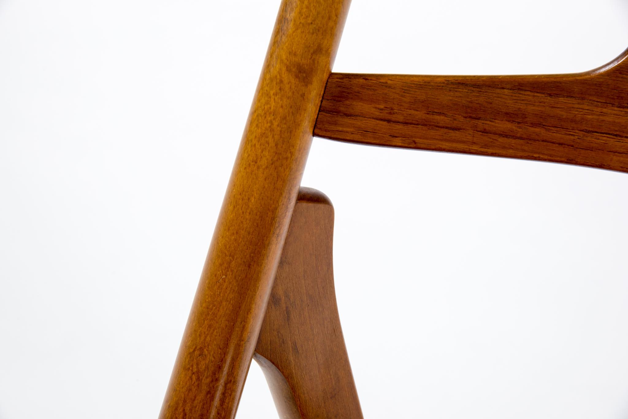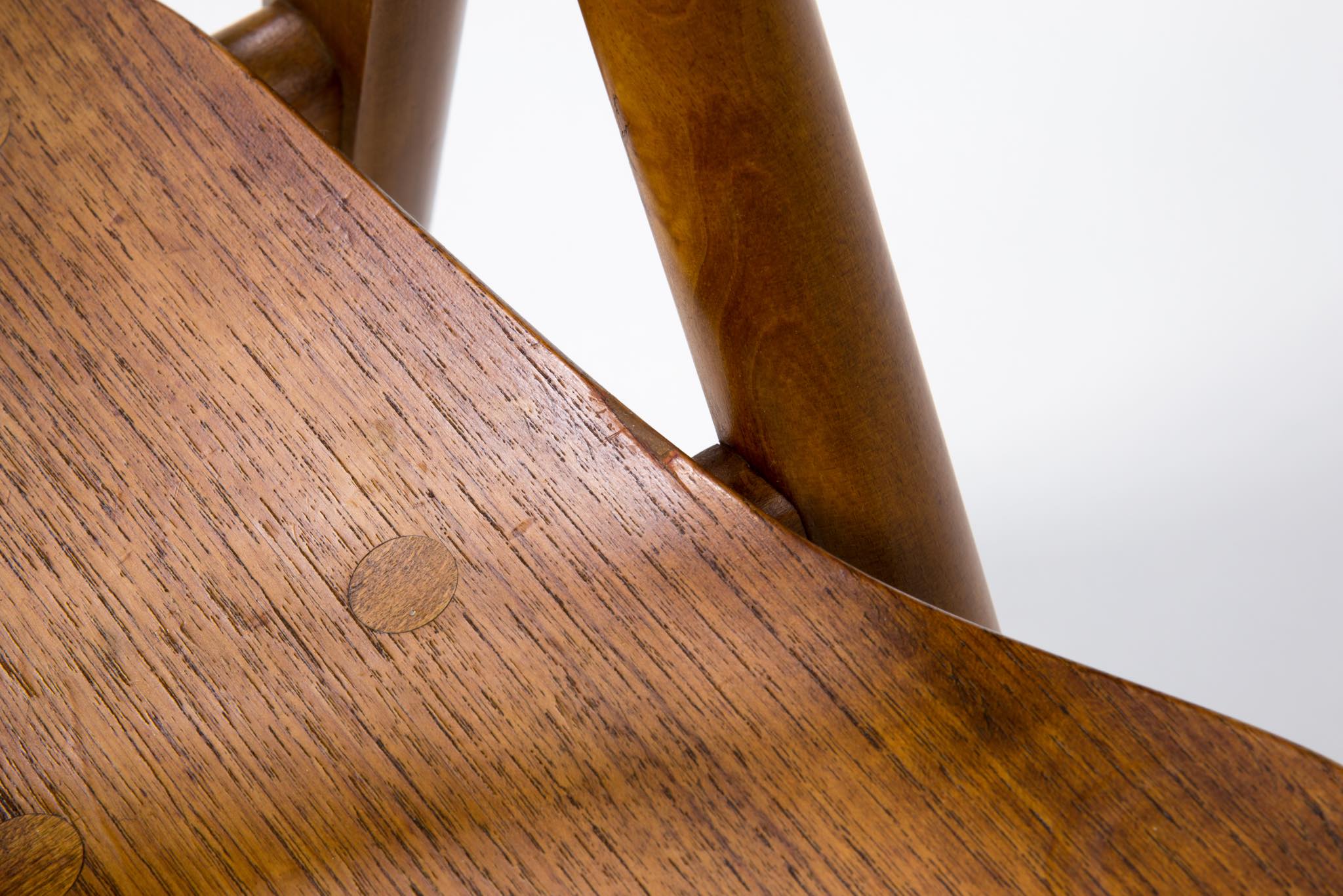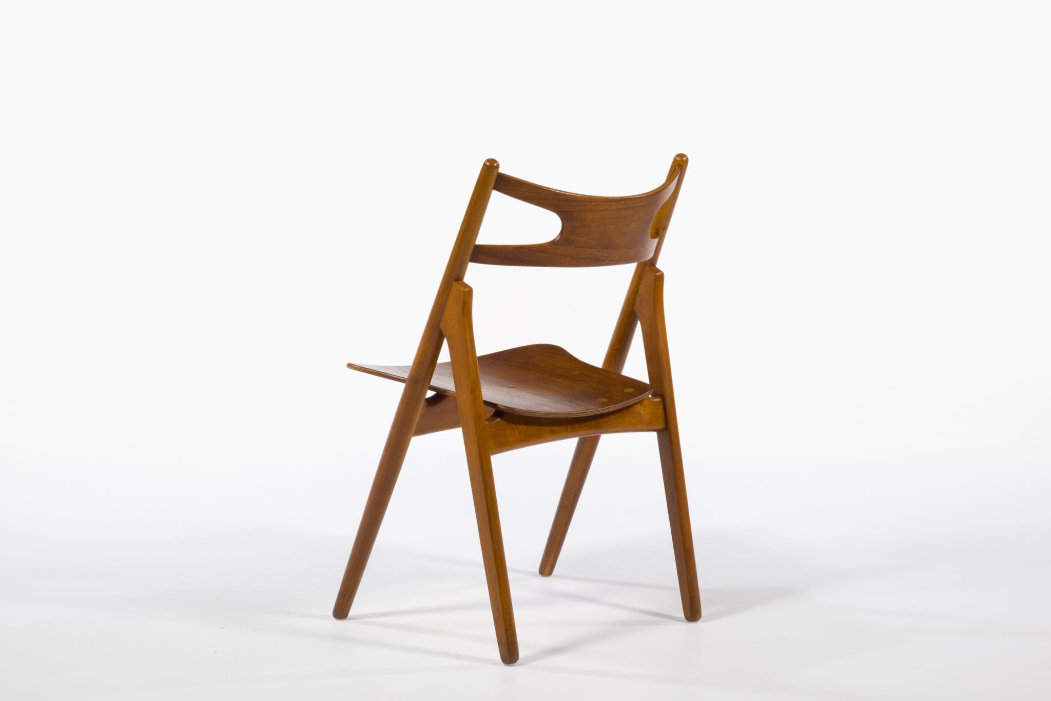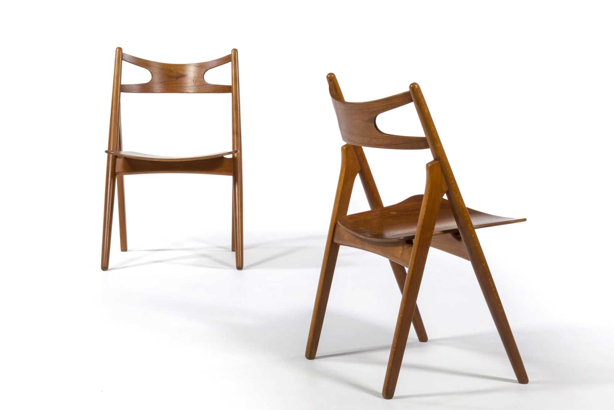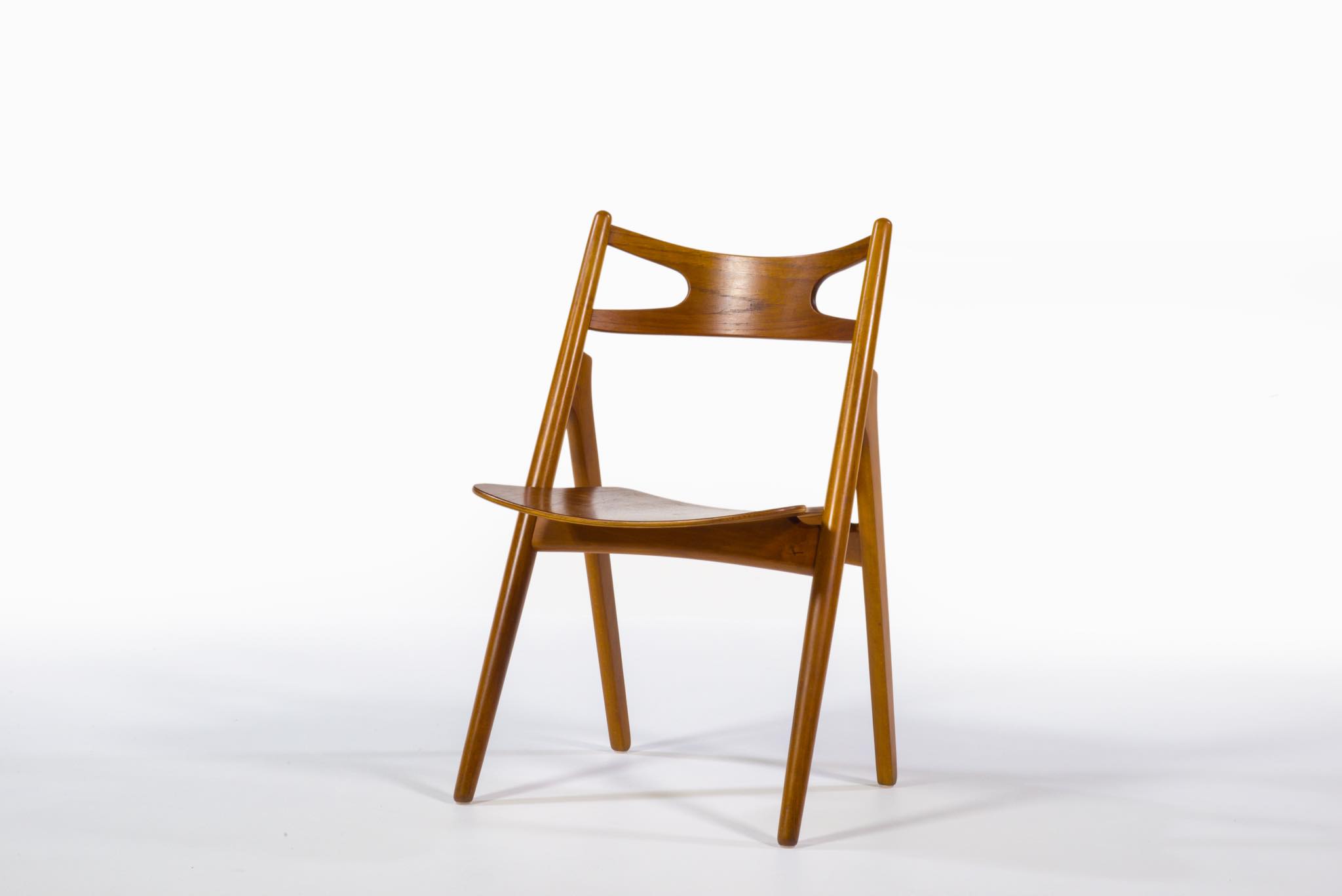 Hans J. Wegner/ハンス・ウェグナーよって1952年に発表されたダイニングチェア "CH29" 一対です。傾斜した前脚に後脚を接合させたユニークな構造の椅子で、デンマークの日常で薪を伐る際に用いる「玉切り台」に形状が似ていることからデンマーク語で "Savbukstol/ソウバックストール" と呼ばれているようです。こちらは珍しく座面に突き板を張ったタイプで、笠木と座面はチーク材のプライウッド、フレームにはビーチ材が用いられています。笠木や座面に小傷が見られますが、研磨を必要とする補修仕上げは行わず、オイル仕上げに留め、ヴィンテージ感を残しています。2脚セットでの販売となります。