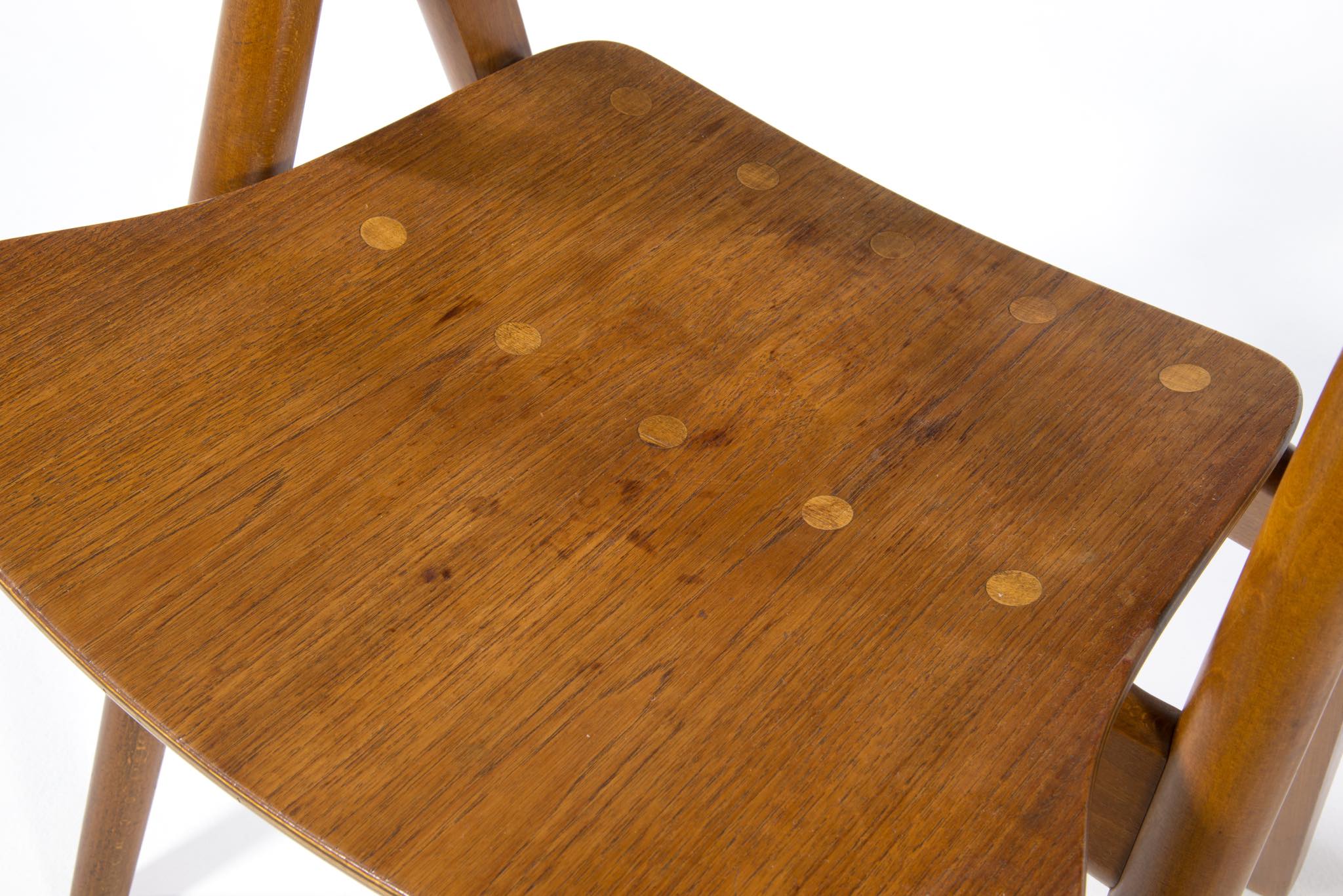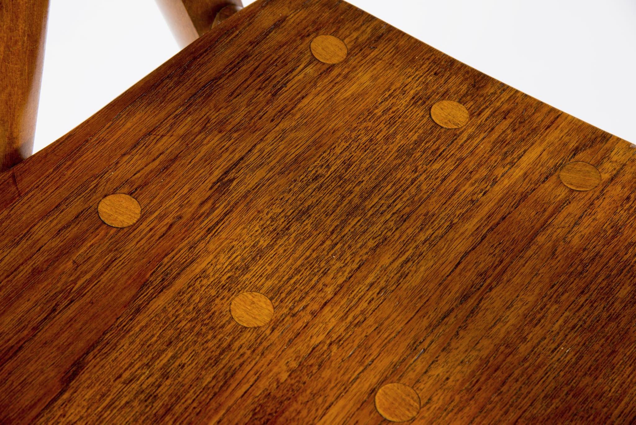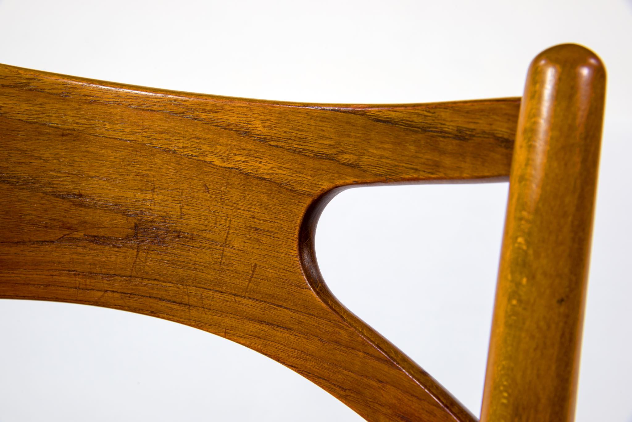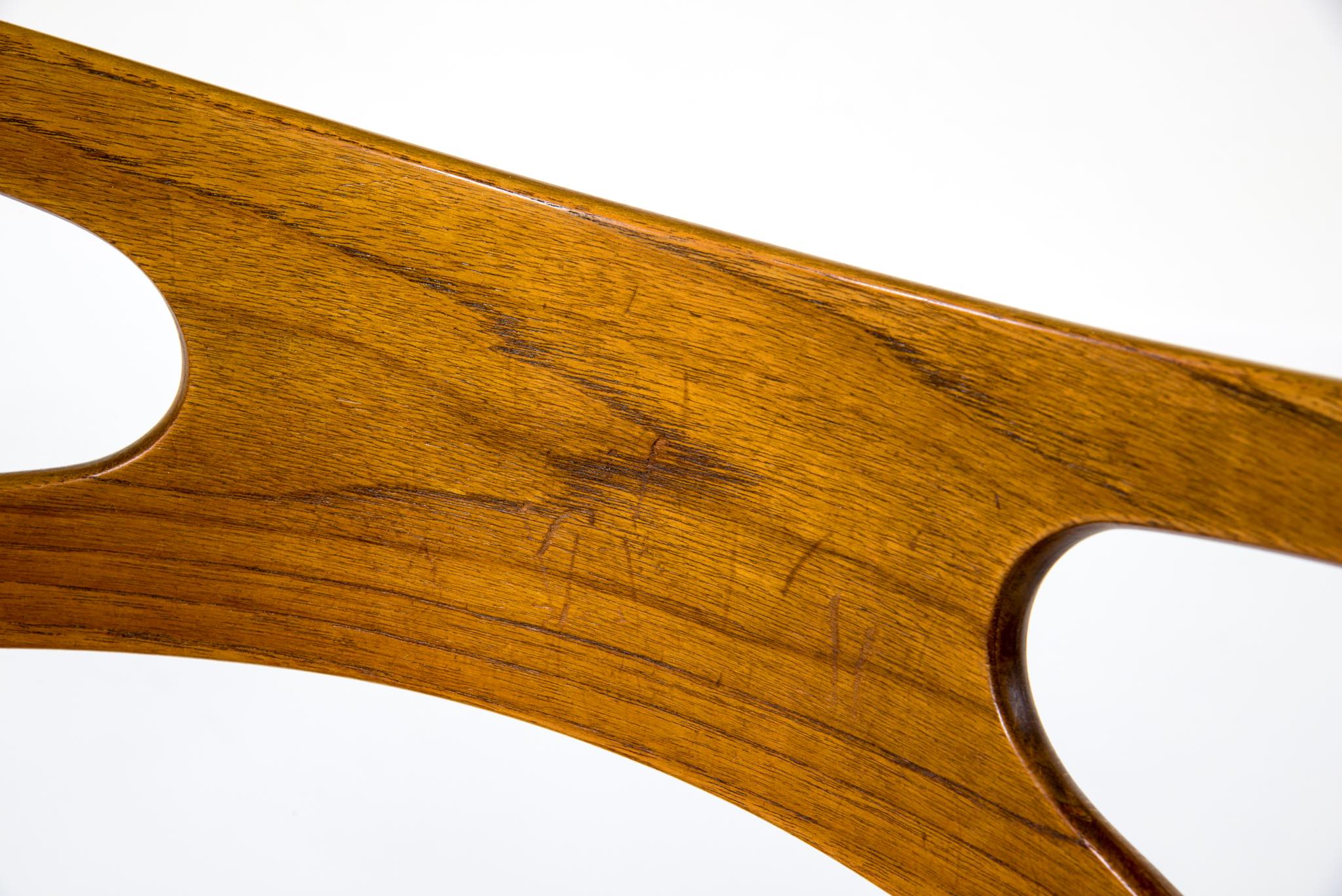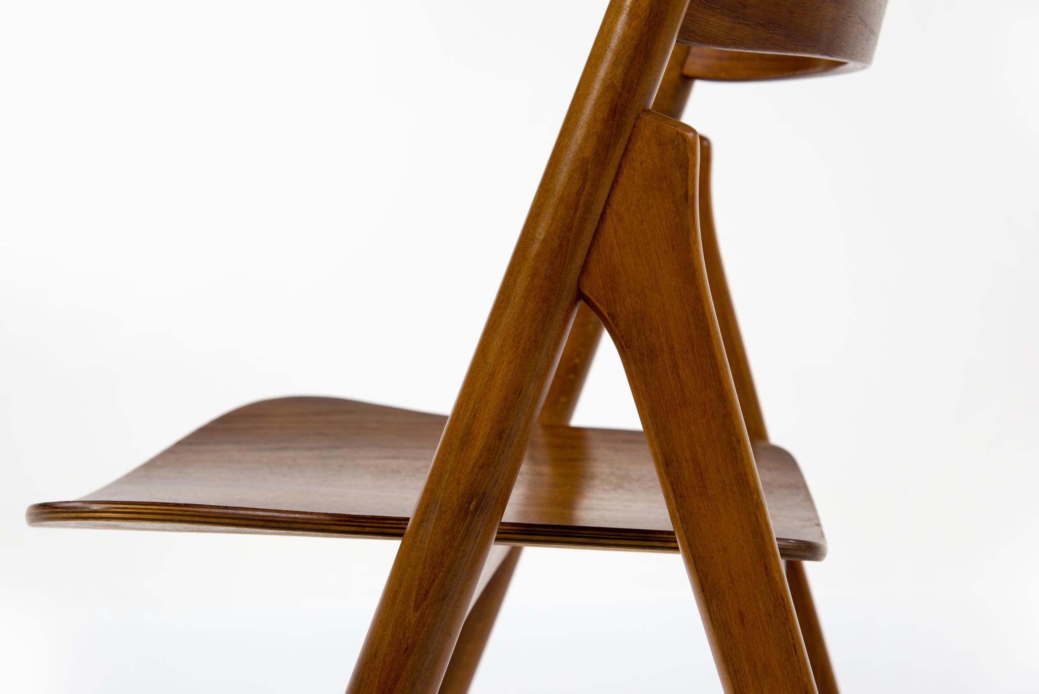 Hans J. Wegner/ハンス・ウェグナーよって1952年に発表されたダイニングチェア "CH29" 一対です。傾斜した前脚に後脚を接合させたユニークな構造の椅子で、デンマークの日常で薪を伐る際に用いる「玉切り台」に形状が似ていることからデンマーク語で "Savbukstol/ソウバックストール" と呼ばれているようです。こちらは珍しく座面に突き板を張ったタイプで、笠木と座面はチーク材のプライウッド、フレームにはビーチ材が用いられています。笠木や座面に小傷が見られますが、研磨を必要とする補修仕上げは行わず、オイル仕上げに留め、ヴィンテージ感を残しています。2脚セットでの販売となります。