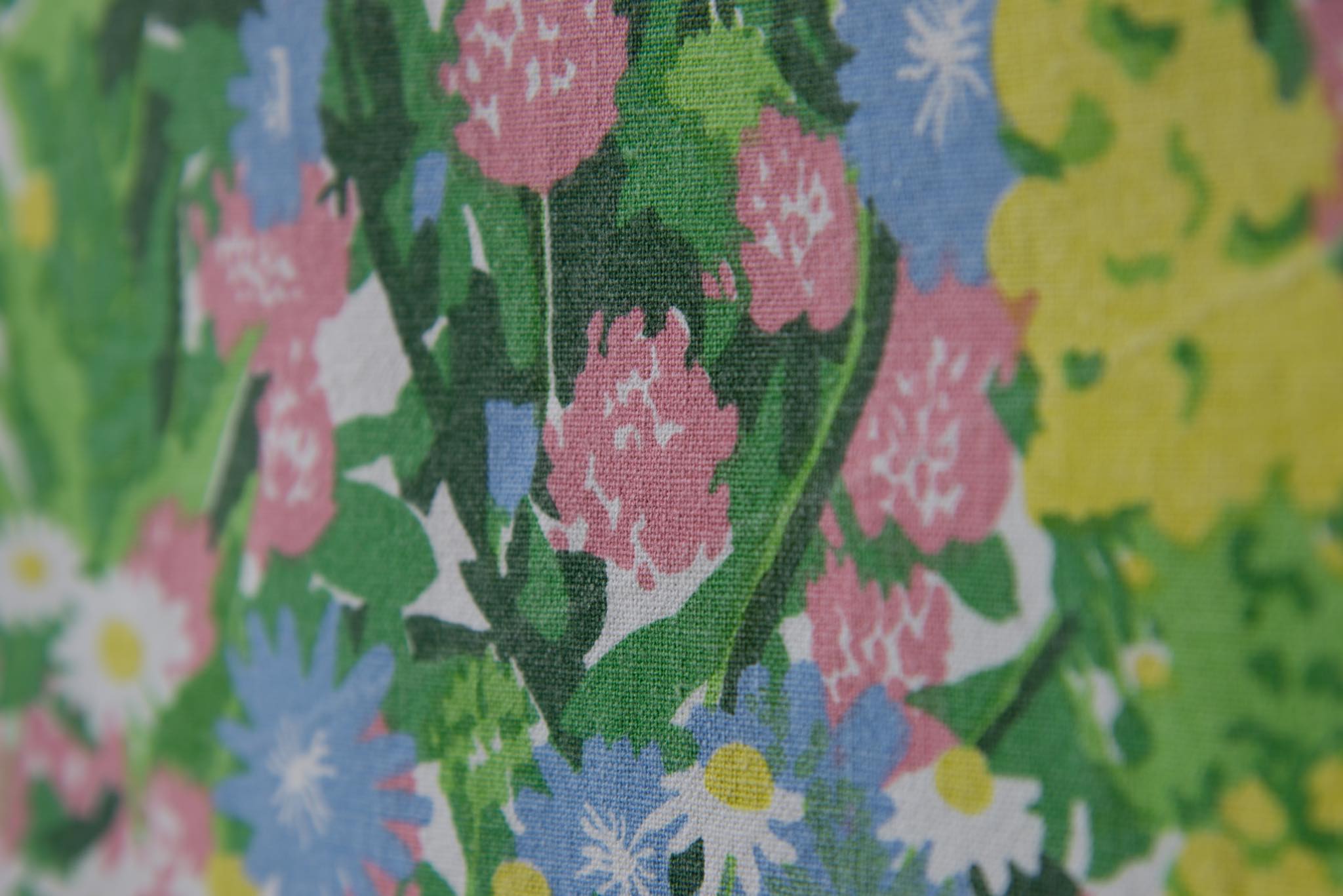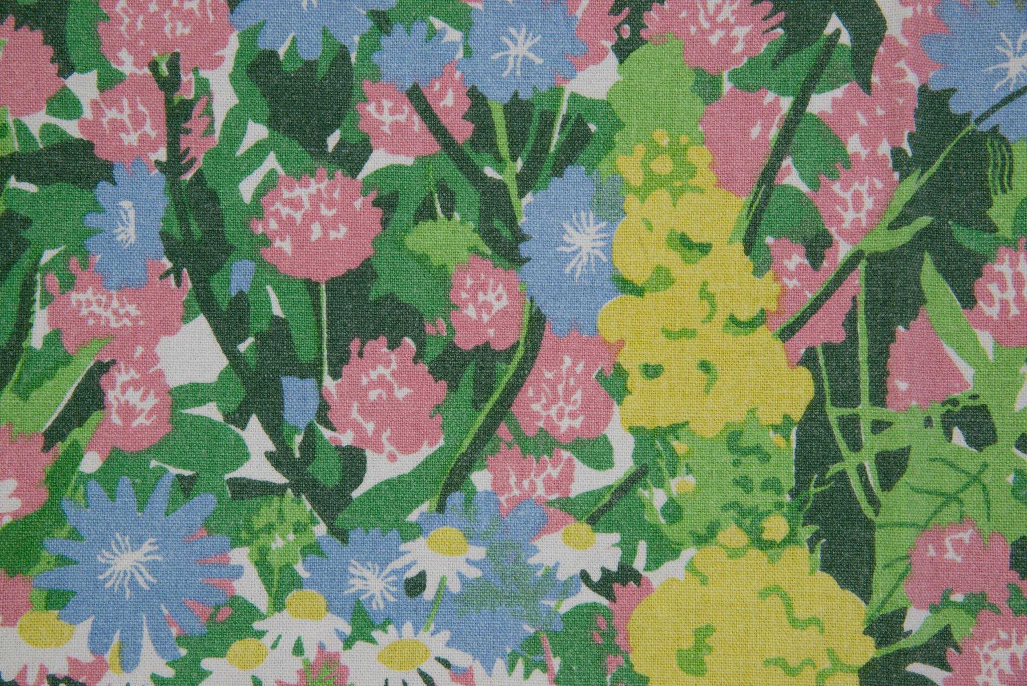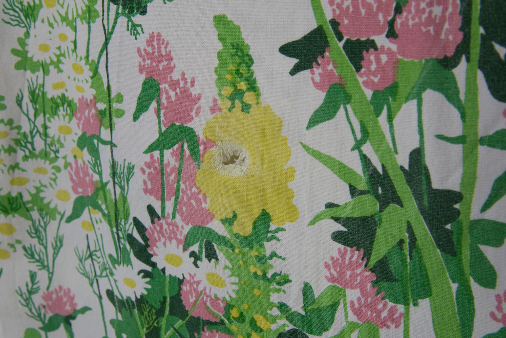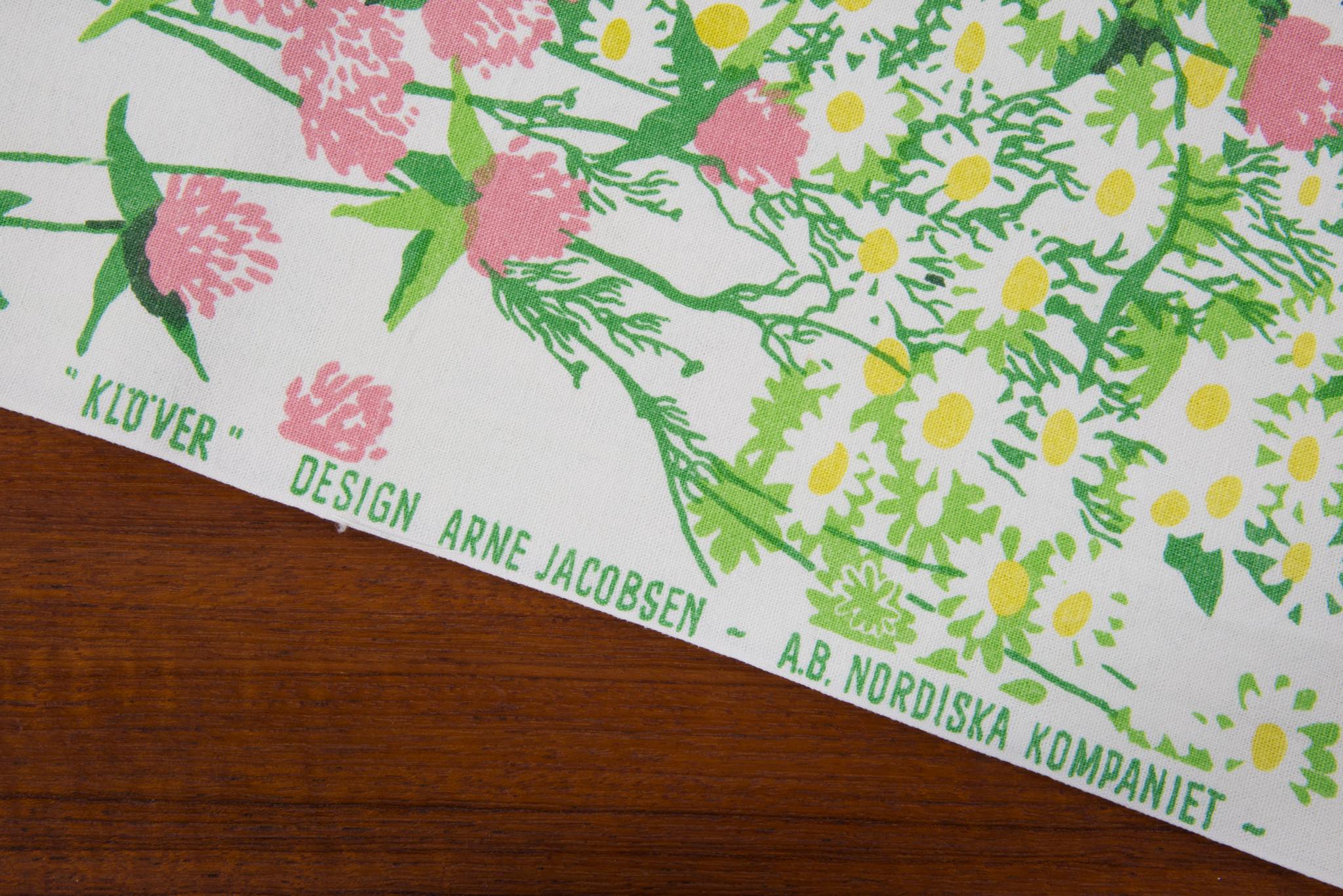 デンマークを代表する建築家、アルネ・ヤコブセンによってデザインされたテキスタイル ”KLÖVER” です。1940年頃、ユダヤ人だったヤコブセンはナチス・ドイツの迫害から逃れるため、お隣で中立国のスウェーデンへ亡命。本業の建築設計から離れ、当時の妻であったヨナ・モラーと共にストックホルムにてテキスタイルデザインを手掛けた頃の作品で、製作は1942-44年頃とされています。”KLÖVER”(アカツメクサ)をモチーフに、春の草花が爛漫と咲き乱れる様が描かれており、先の見えない暗い時代から「春」を待ち望む氏の思いが込められているのように感じられます。こちらは裾は切りっぱなしであるものの、長さのあるカーテンとして仕立てられたもので、水洗いは幾度かされているようですが、日焼け感も少なく、大ぶりなサイズ感のものです。小穴が一箇所と結露による染みがありますが、全体的にきれいな状態を保っています。こちらは2枚セットでの販売となります。