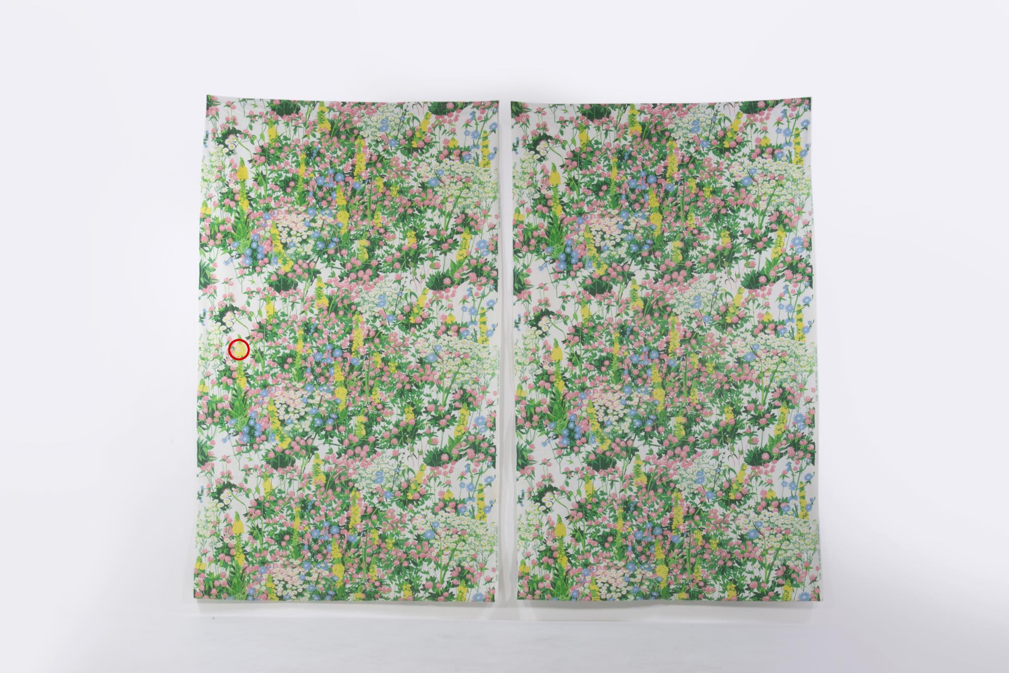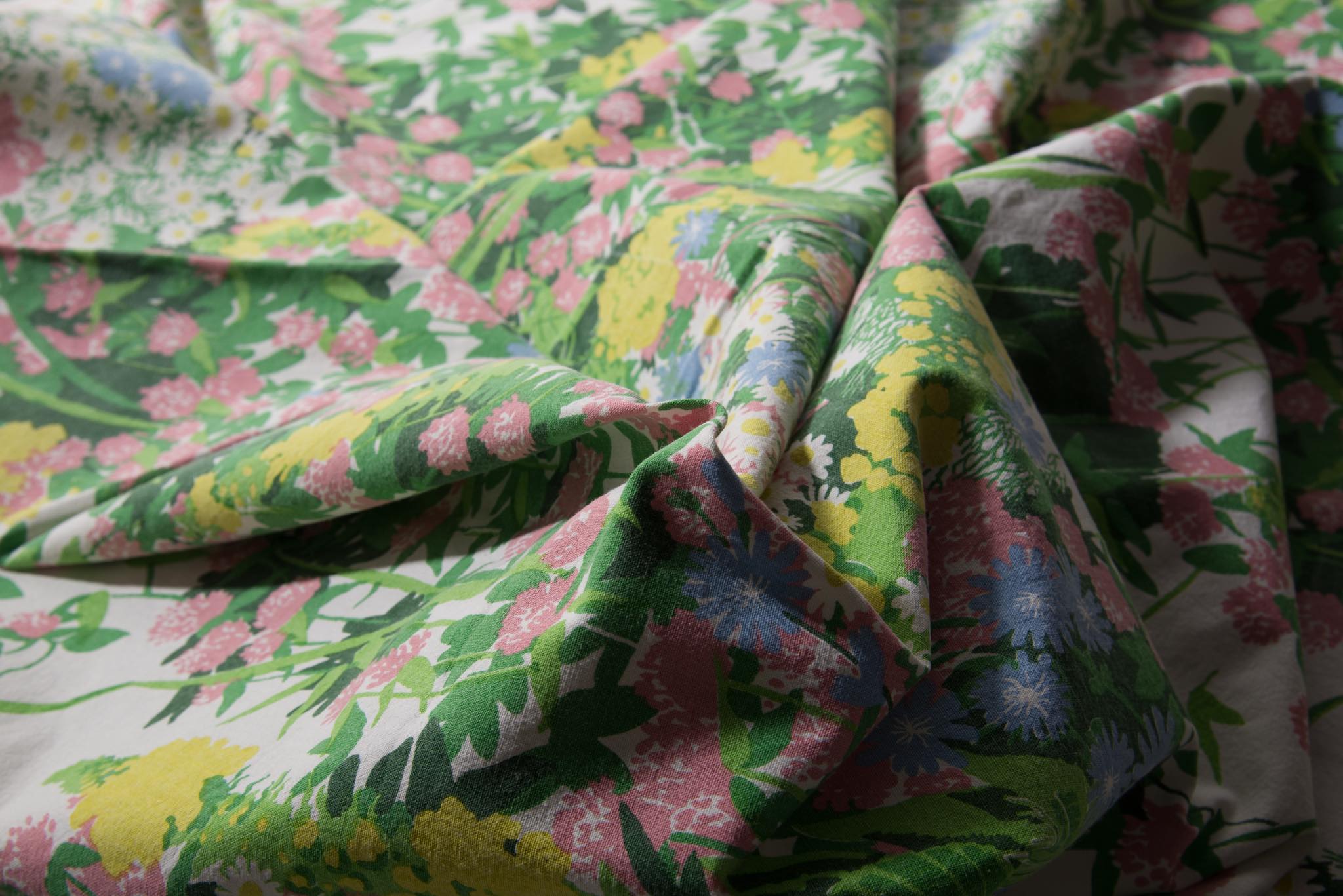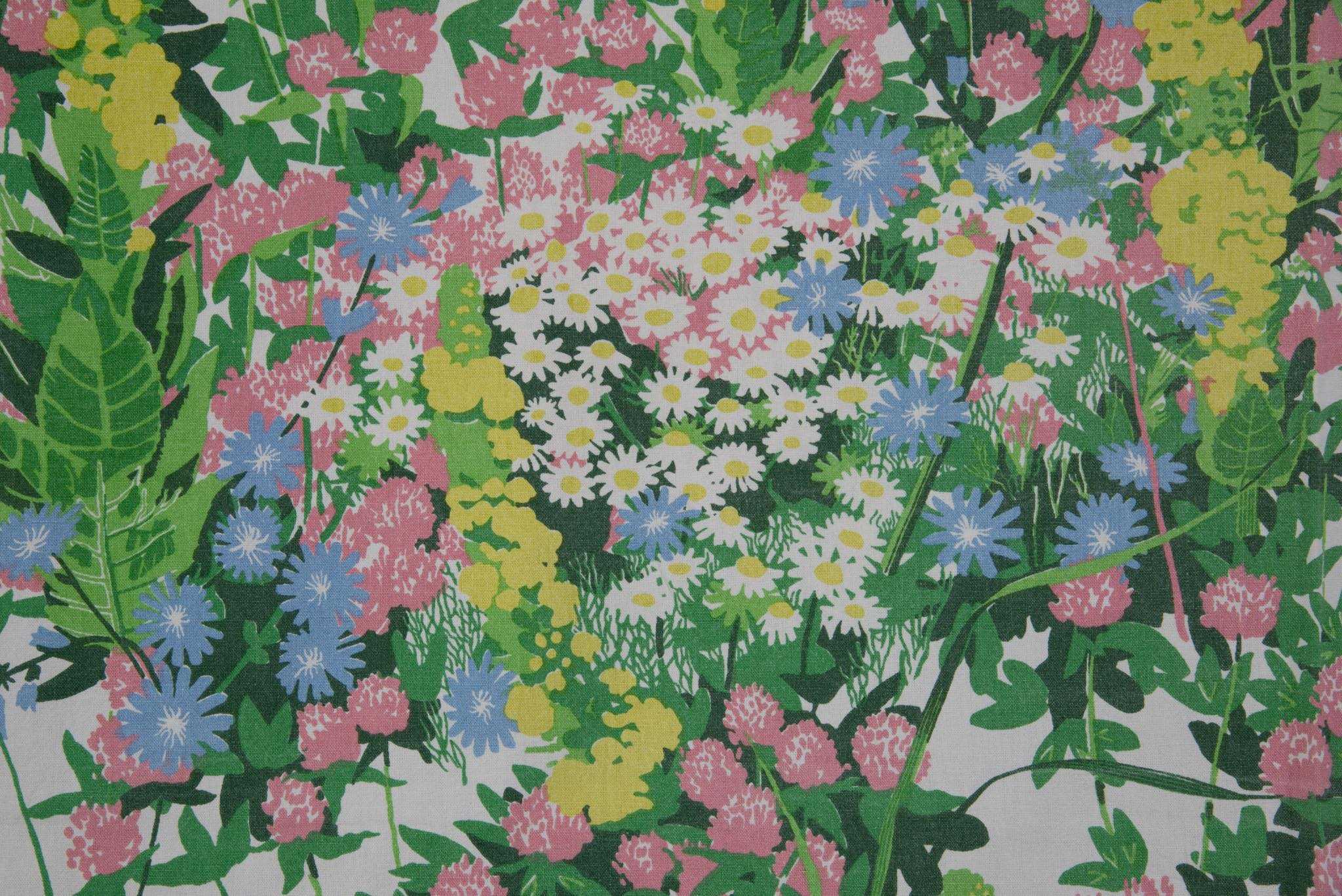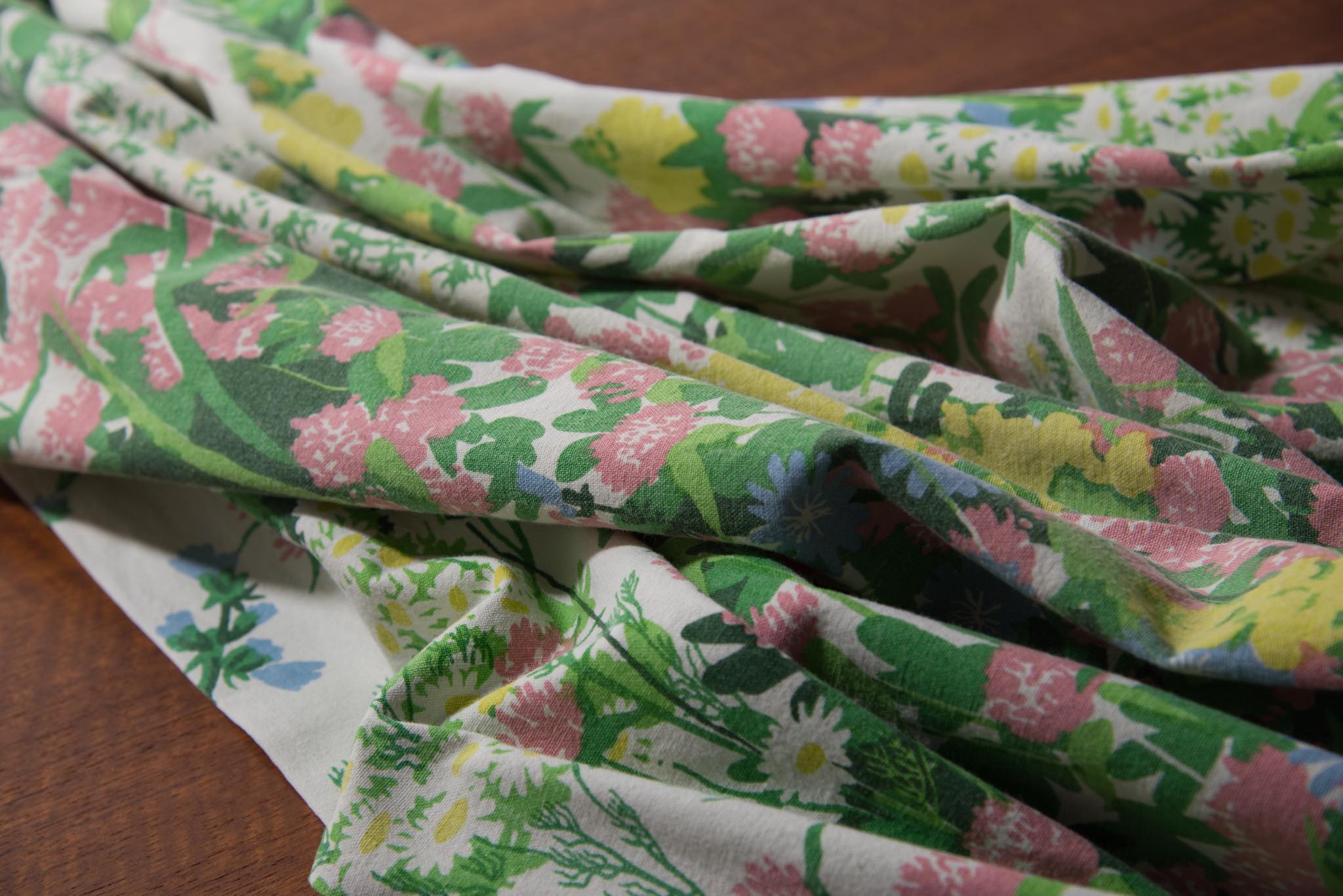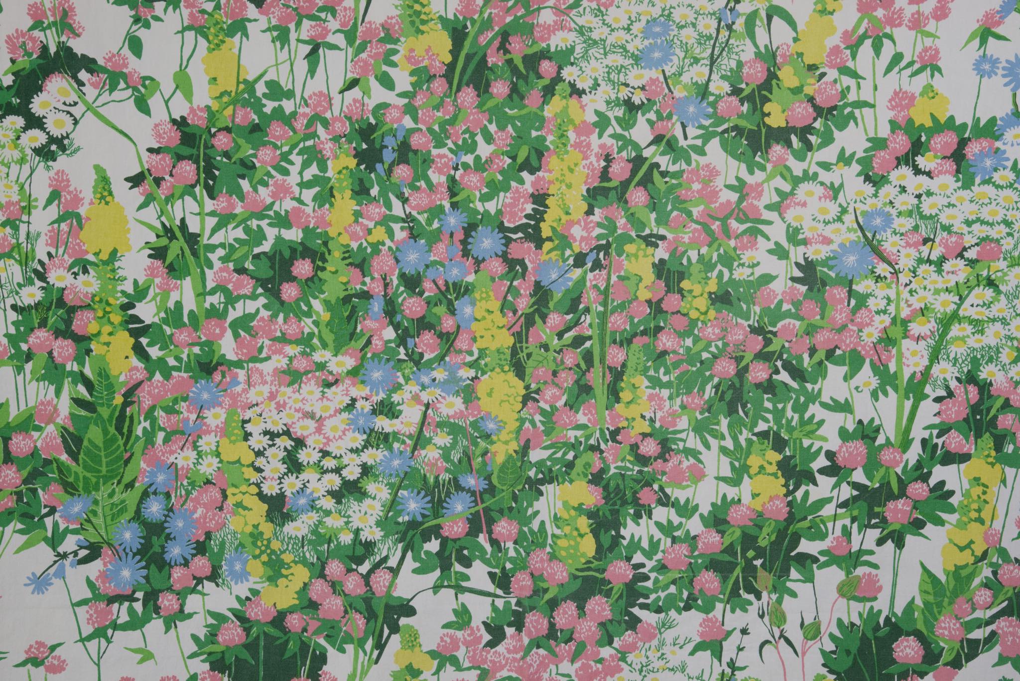 デンマークを代表する建築家、アルネ・ヤコブセンによってデザインされたテキスタイル ”KLÖVER” です。1940年頃、ユダヤ人だったヤコブセンはナチス・ドイツの迫害から逃れるため、お隣で中立国のスウェーデンへ亡命。本業の建築設計から離れ、当時の妻であったヨナ・モラーと共にストックホルムにてテキスタイルデザインを手掛けた頃の作品で、製作は1942-44年頃とされています。”KLÖVER”(アカツメクサ)をモチーフに、春の草花が爛漫と咲き乱れる様が描かれており、先の見えない暗い時代から「春」を待ち望む氏の思いが込められているのように感じられます。こちらは裾は切りっぱなしであるものの、長さのあるカーテンとして仕立てられたもので、水洗いは幾度かされているようですが、日焼け感も少なく、大ぶりなサイズ感のものです。小穴が一箇所と結露による染みがありますが、全体的にきれいな状態を保っています。こちらは2枚セットでの販売となります。