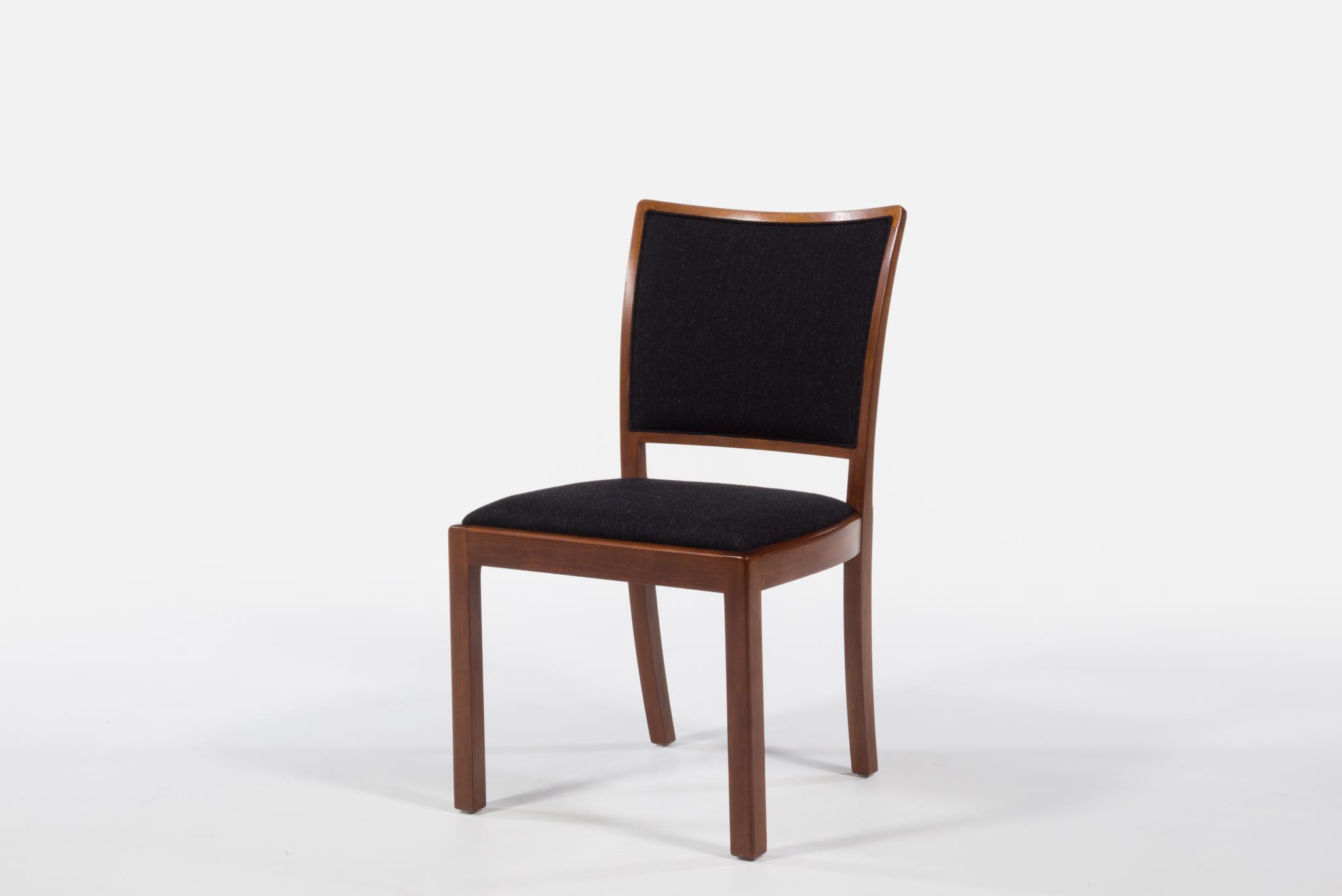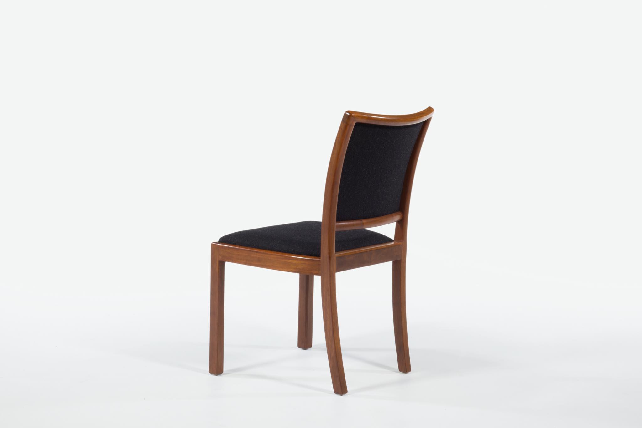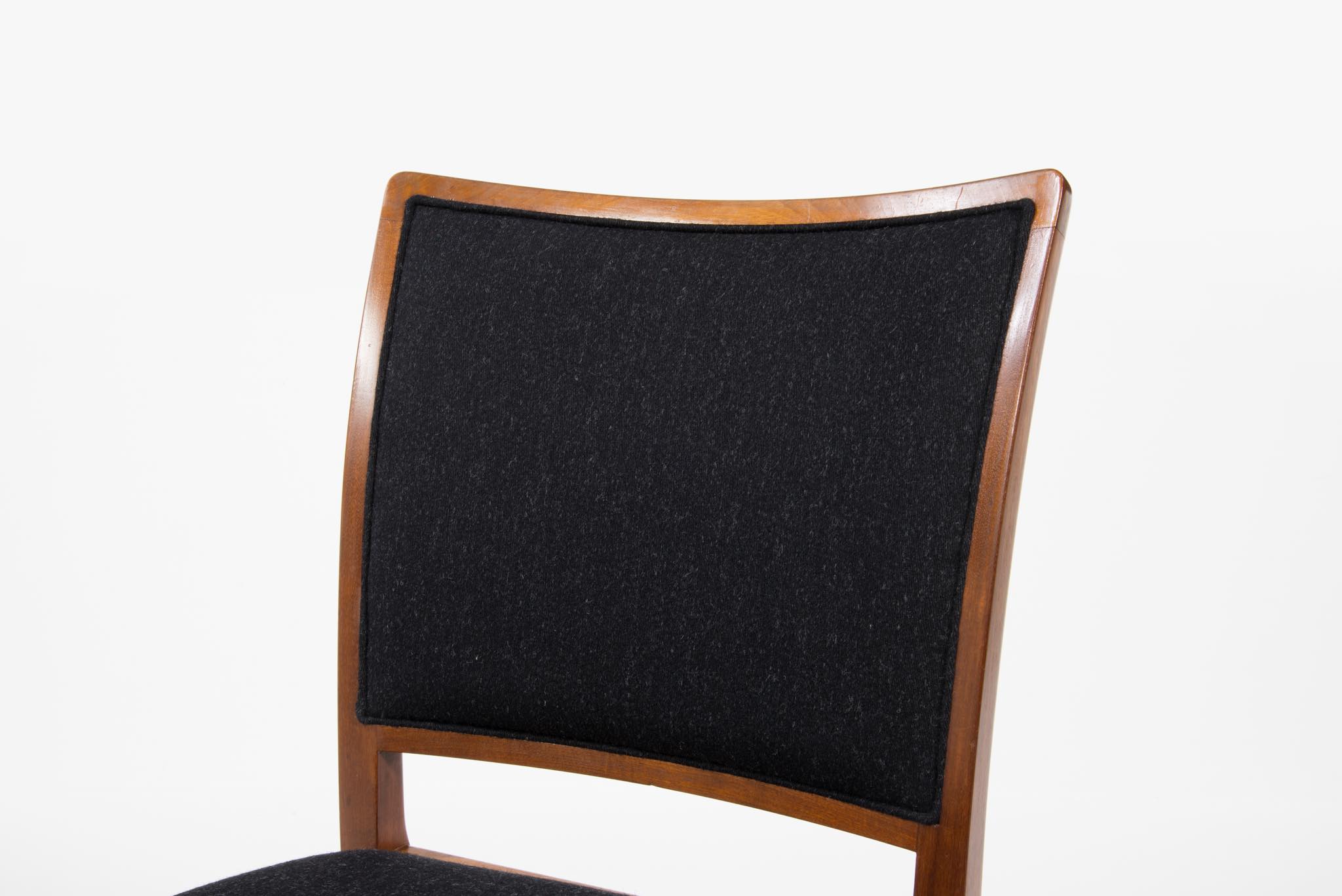 デンマークの名匠、Jacob Kjær/ヤコブ・ケアによってデザインされたダイニングチェア6脚セットです。1936年の同展示会に出品された記録があります。クラシックな趣を全体に残しつつ、モダンな要素を取り入れた、ダニッシュモダン黎明期の作品で、末尾に掲載しております当時の展示風景は、部屋の寸法やレイアウトなどヤコブ・ケア自身によるものです。素材には惜しみなくキューバンマホガニーが用いられ、天板部分に現れた流れるような独自の木目文様はとても優雅な雰囲気です。