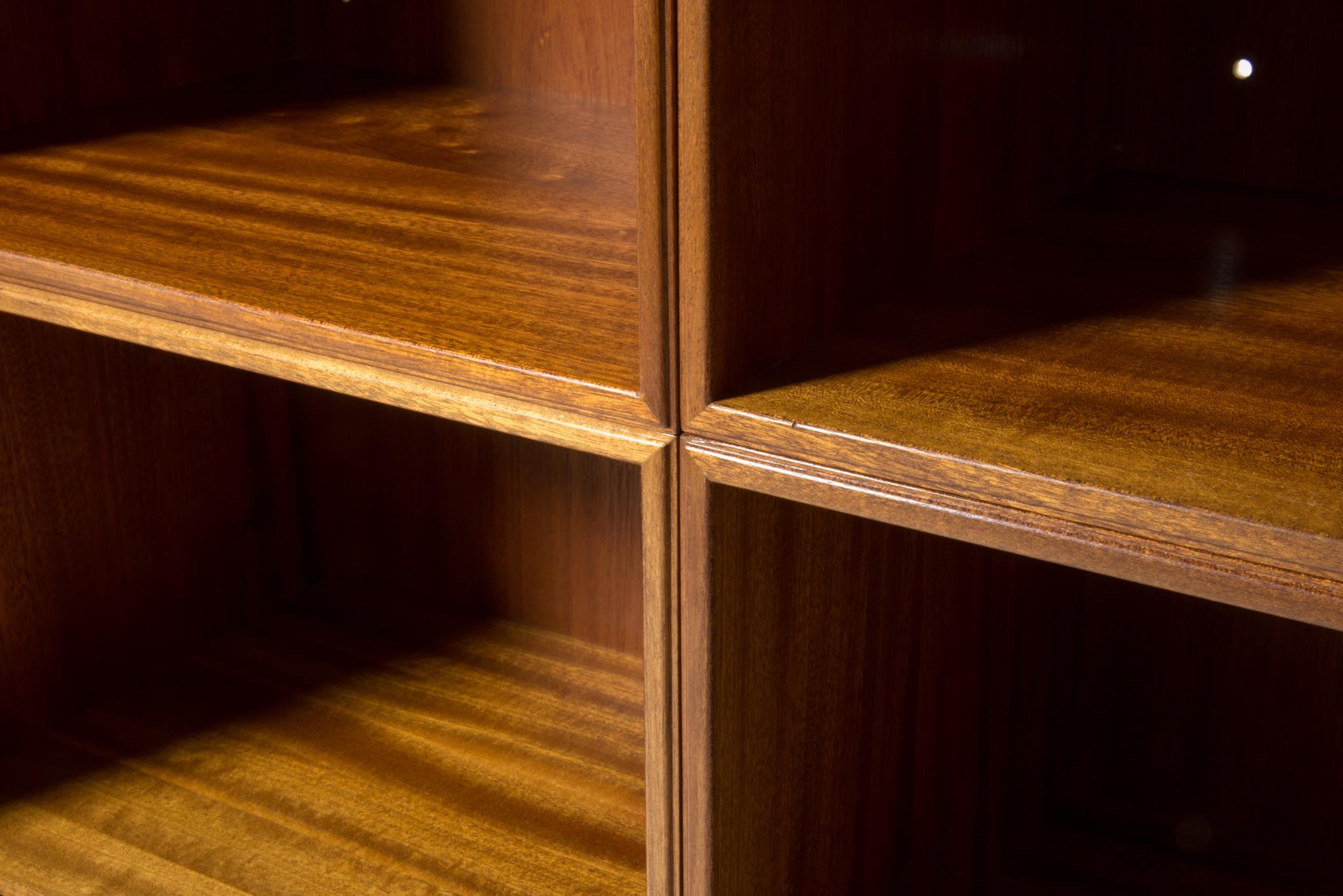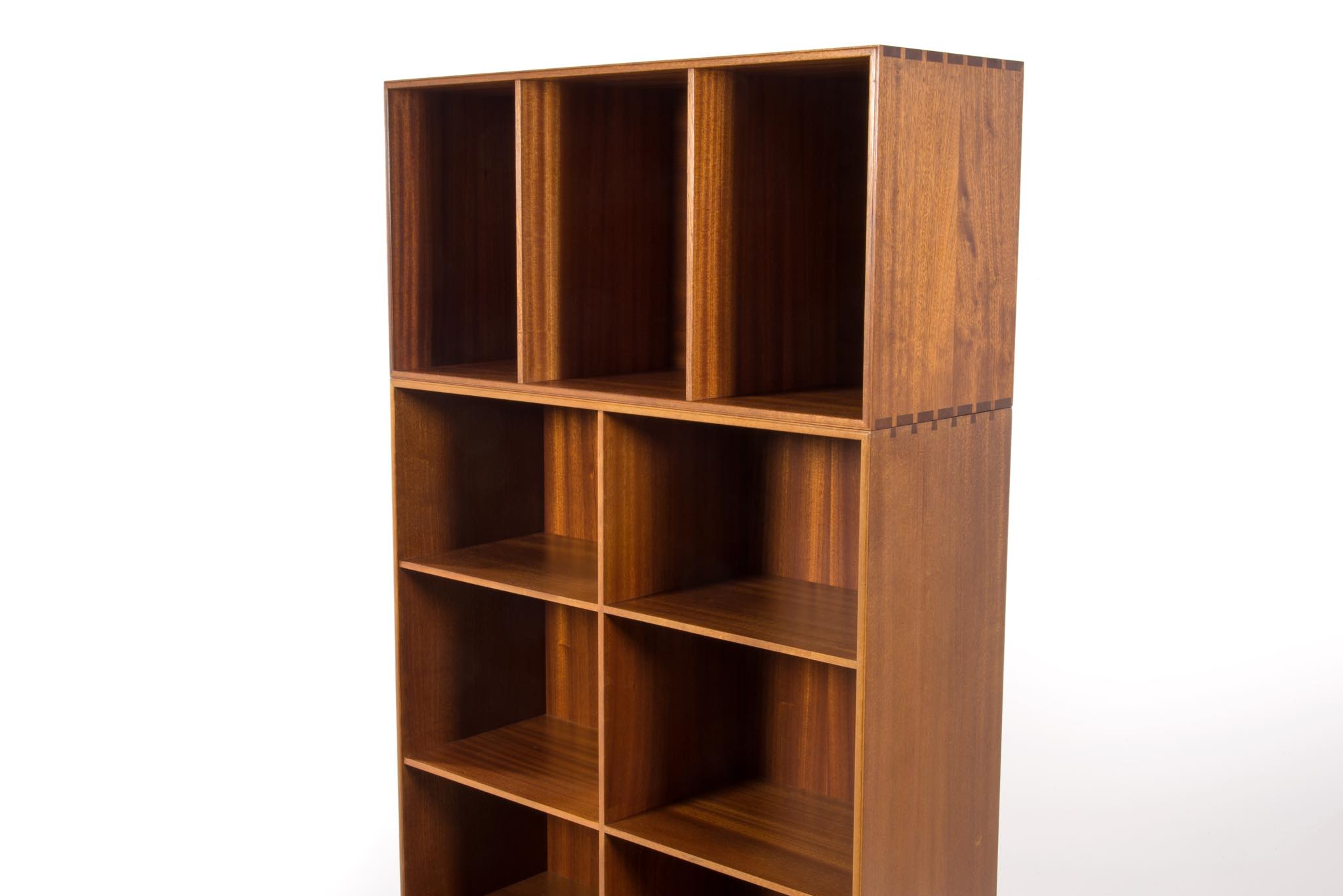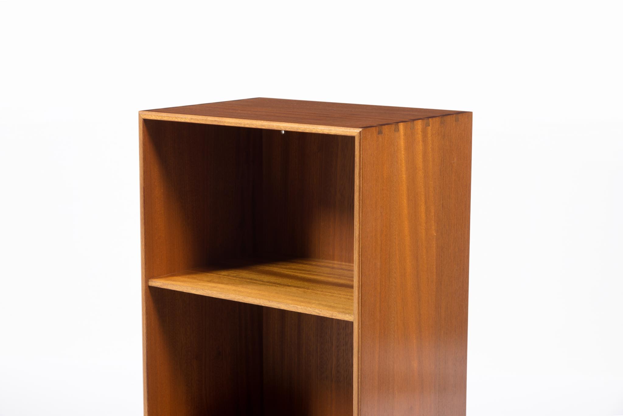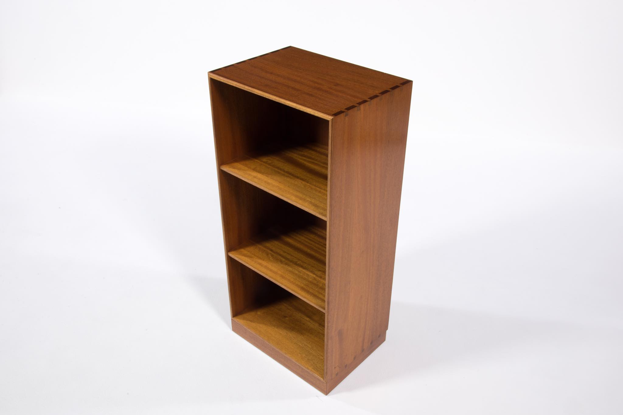 ルド・ラスムッセン工房製、Mogens Koch/モーエンス・コッホによるデザインの名作ブックケース、無垢のマホガニーを用いたモデルです。こちらのタイプは通常の半分のサイズのもので、単体で使用したり、通常のシェルフに乗せるなどアレンジの効くものとなります。単体で縦型で使用する場合は棚板の高さが低いためA4書籍を立てることはできません。横置きであればA4サイズは収納可能です。壁付けで使用するための穴が背板に開けられていますが、見栄え良く綺麗に加工されています。ベース(台輪)は職人依頼にてマホガニー材を用いて作成しました。