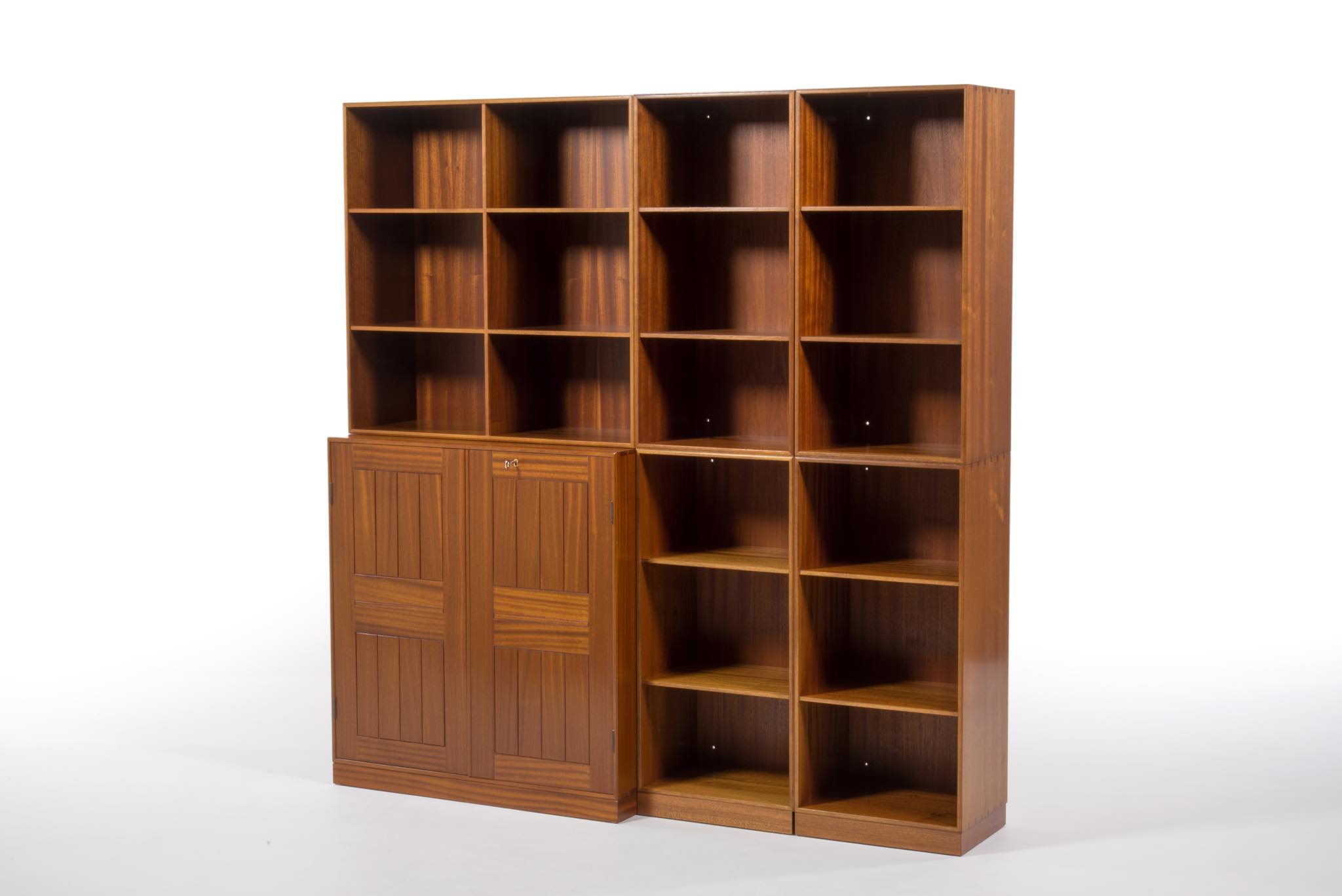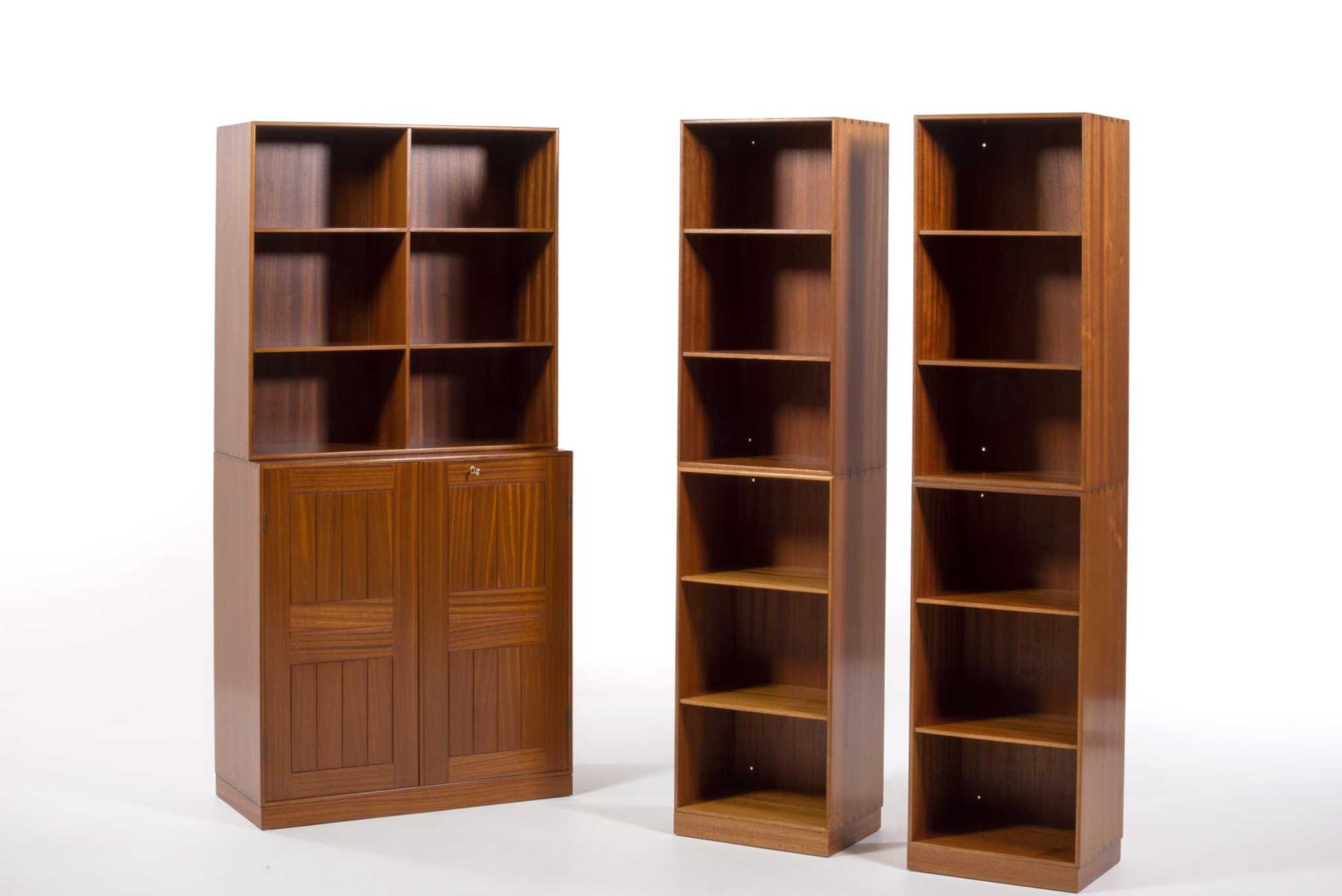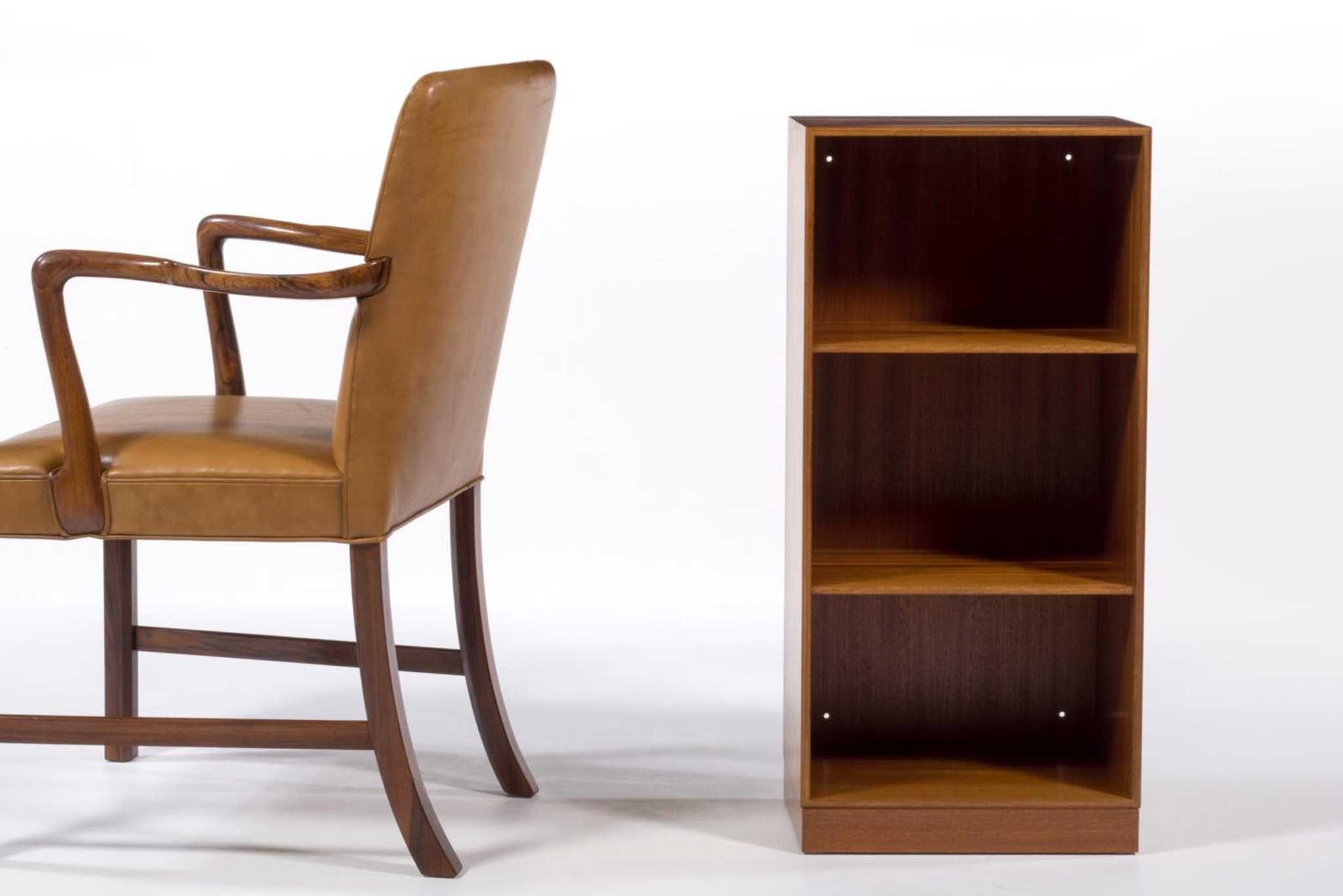 ルド・ラスムッセン工房製、Mogens Koch/モーエンス・コッホによるデザインの名作ブックケース、無垢のマホガニーを用いたモデルです。こちらのタイプは通常の半分のサイズのもので、単体で使用したり、通常のシェルフに乗せるなどアレンジの効くものとなります。単体で縦型で使用する場合は棚板の高さが低いためA4書籍を立てることはできません。横置きであればA4サイズは収納可能です。壁付けで使用するための穴が背板に開けられていますが、見栄え良く綺麗に加工されています。ベース(台輪)は職人依頼にてマホガニー材を用いて作成しました。