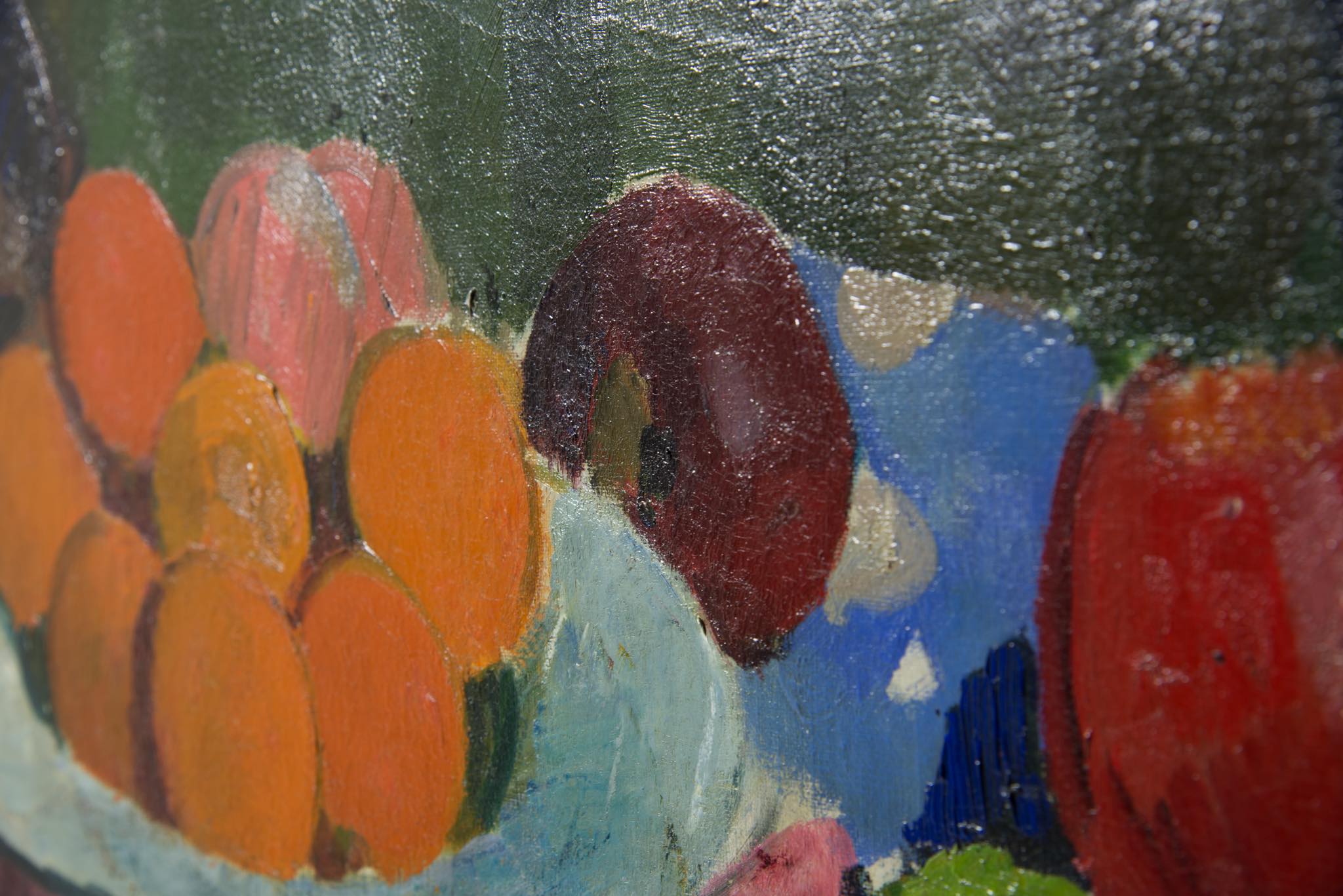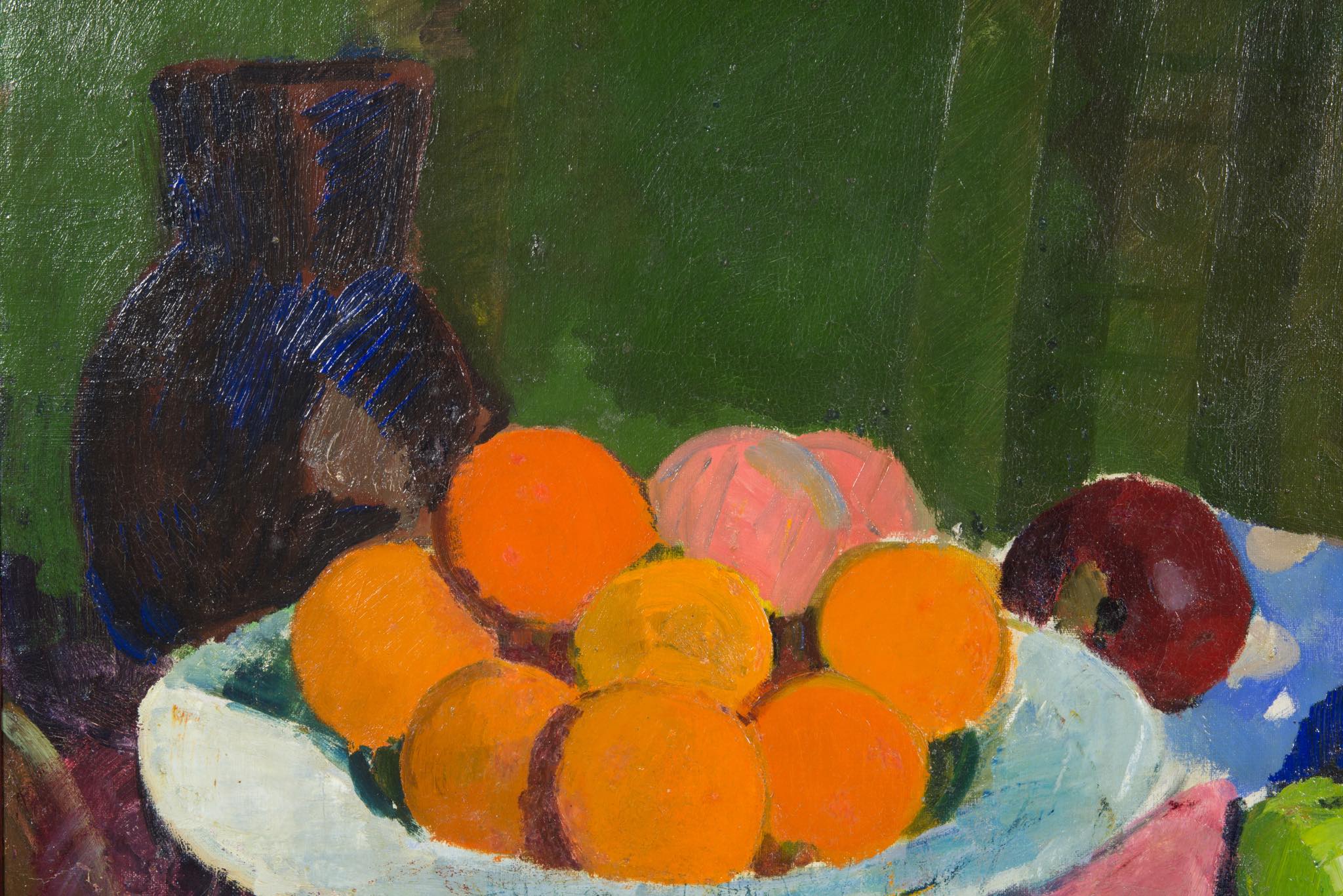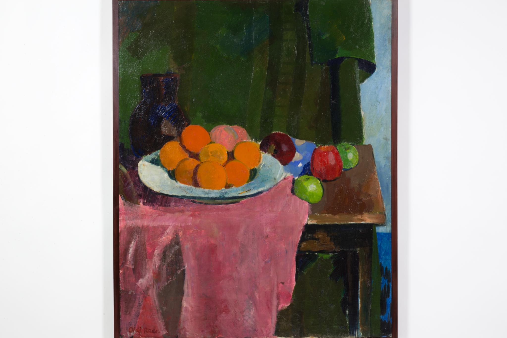 デンマークの画家、Olaf Rude/オラフ・ルードによる静物画油彩作品です。1930年代頃に描かれた作品と思われます。卓上に無造作に置かれたフルーツと、その周囲を取り巻くカーテンやテーブルクロスなどが、独自の表現で描かれています。入荷当初は金箔の重厚すぎる額装であったため、こちらで木地に塗装を施したシンプルなものへ交換しました。重量も軽くなっており、飾りやすいでしょう。