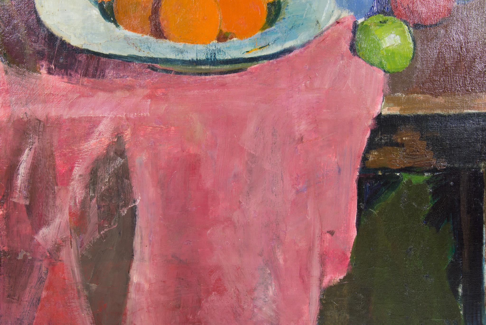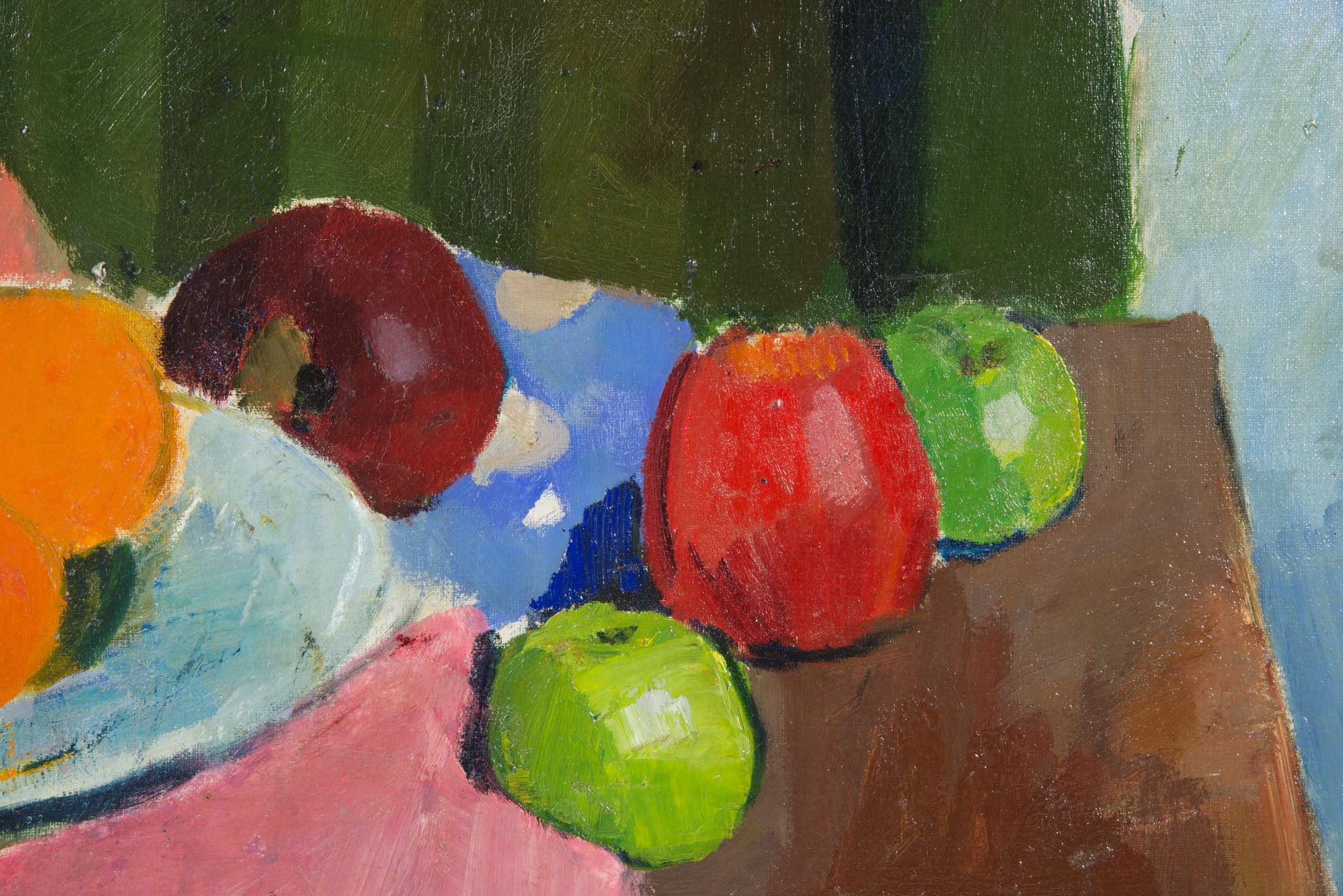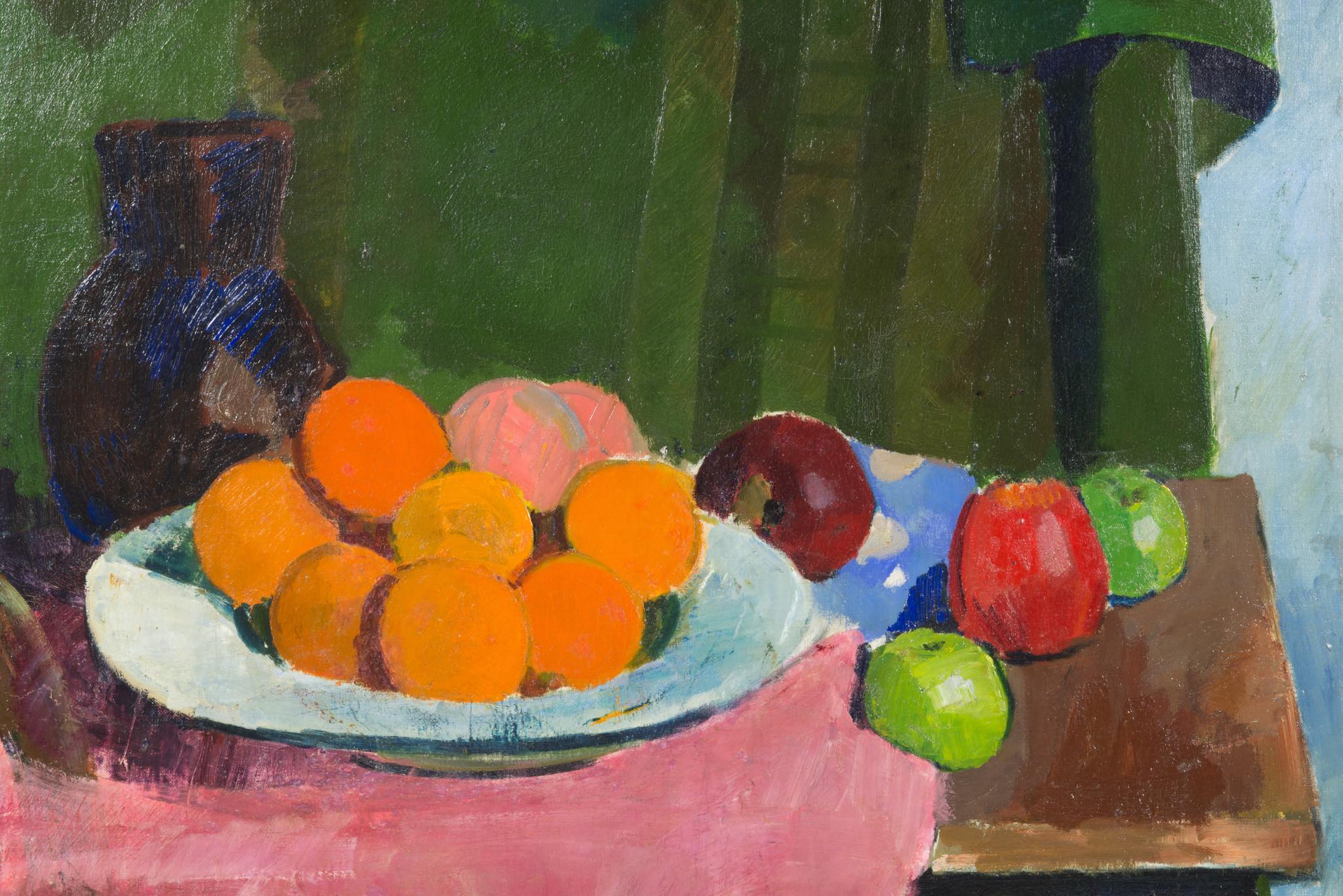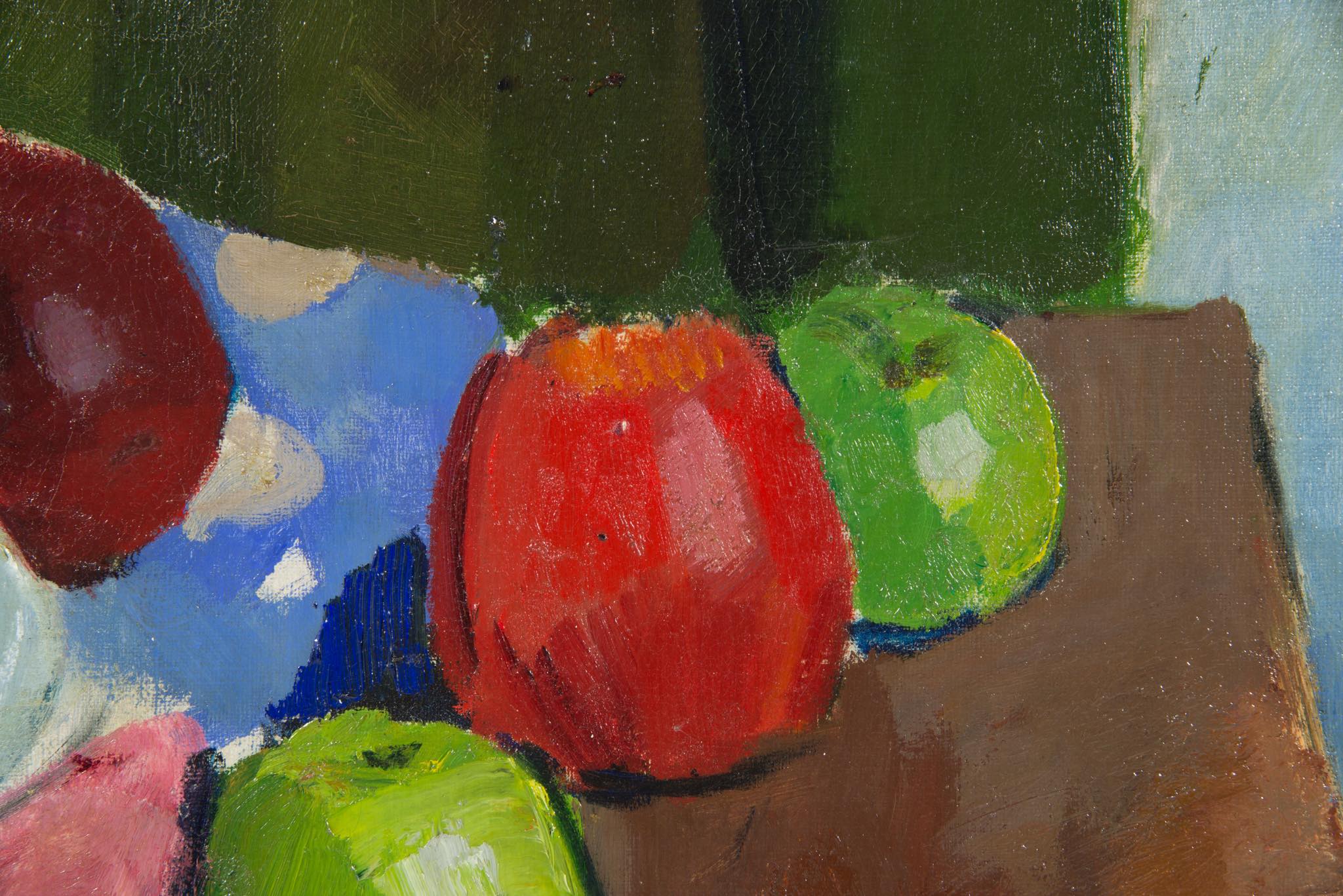 デンマークの画家、Olaf Rude/オラフ・ルードによる静物画油彩作品です。1930年代頃に描かれた作品と思われます。卓上に無造作に置かれたフルーツと、その周囲を取り巻くカーテンやテーブルクロスなどが、独自の表現で描かれています。入荷当初は金箔の重厚すぎる額装であったため、こちらで木地に塗装を施したシンプルなものへ交換しました。重量も軽くなっており、飾りやすいでしょう。