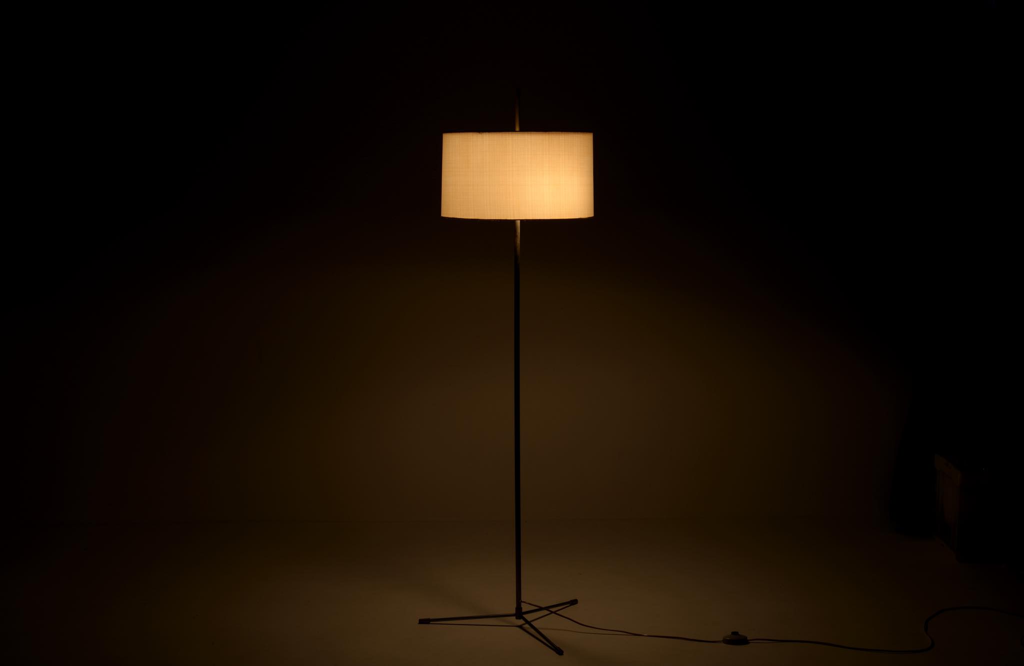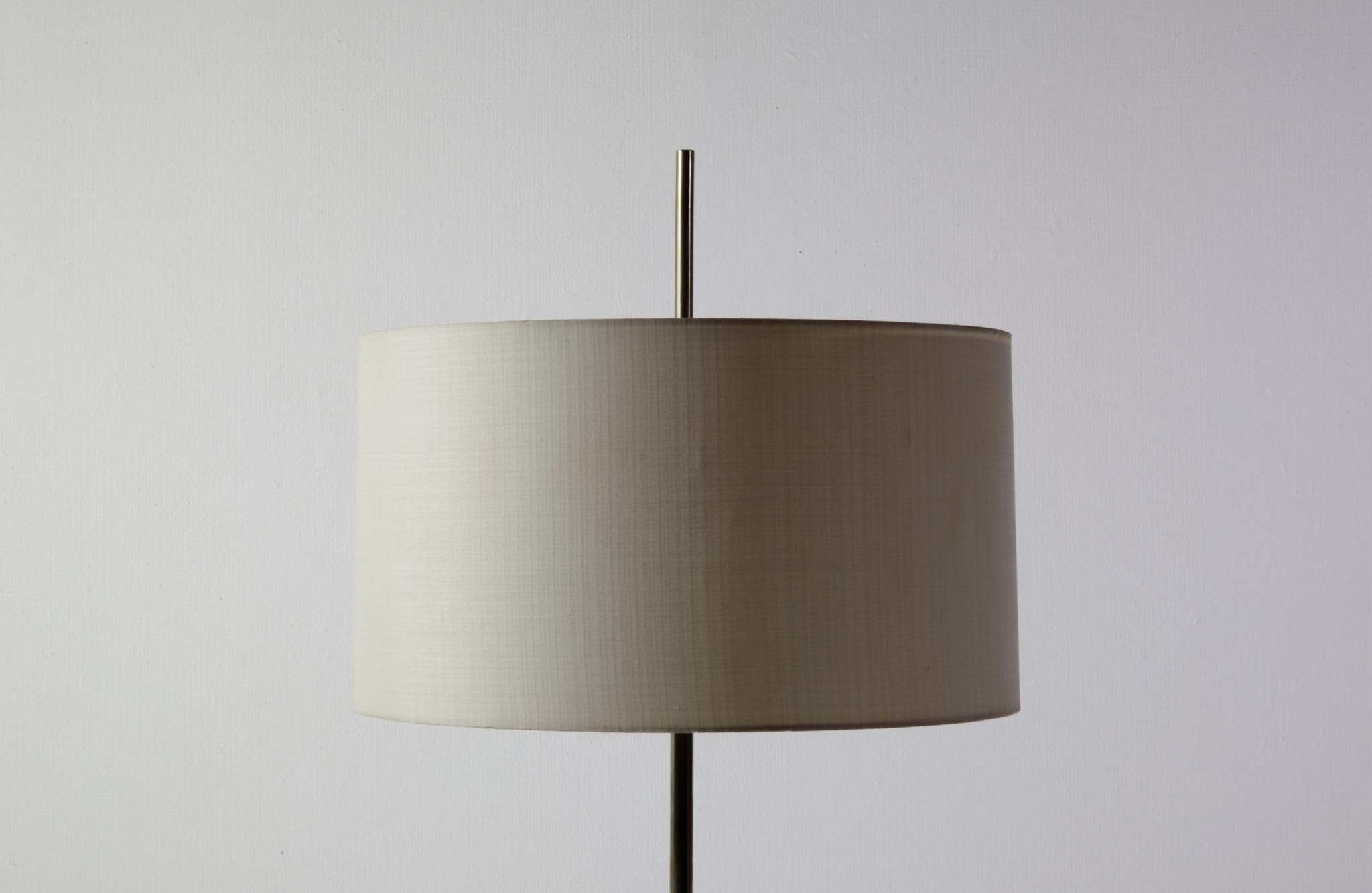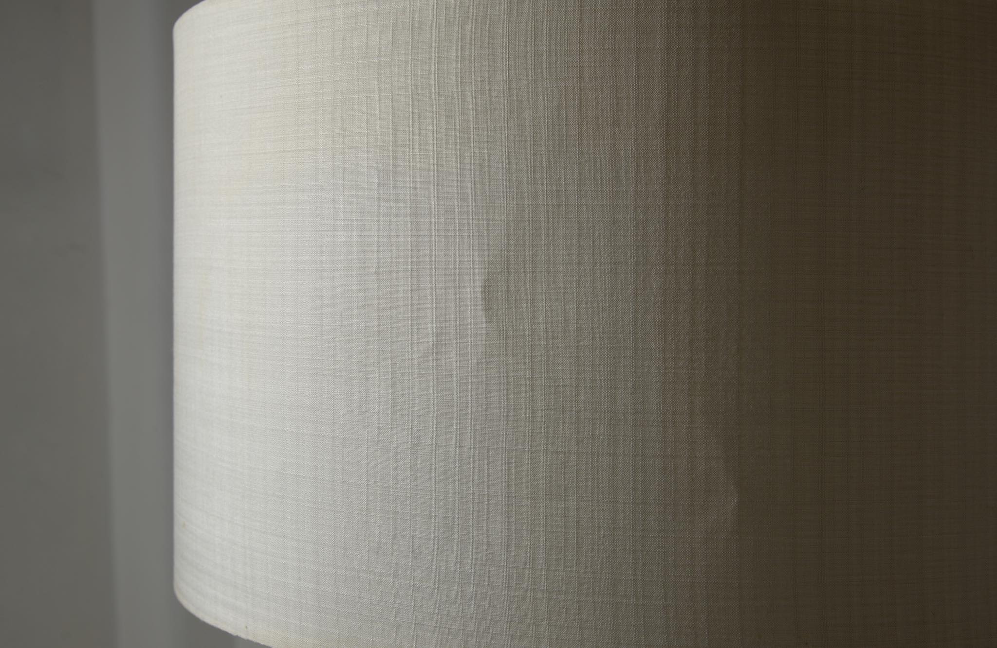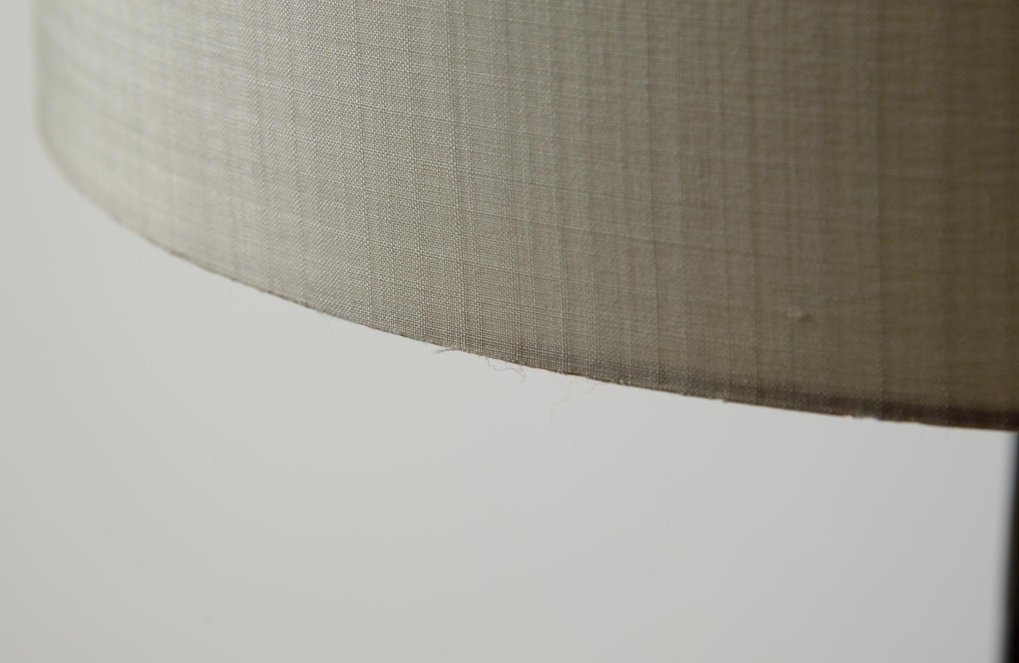 デンマークの照明デザイナー、Svend Aage Holm Sorensen/スヴェン・オーゲ・ホルム・ソーレンセンによるフロアーランプです。1950年代に作られたとされる照明で、真鍮を用いたフォルムは、その当時としてはシンプルでミニマルにデザインされています。オリジナルと思われるシェードに若干の凹みが見られます、また、支柱がごくわずかに傾いている感がありますが、ほぼ気付かない程度です。全体的に綺麗な状態です。