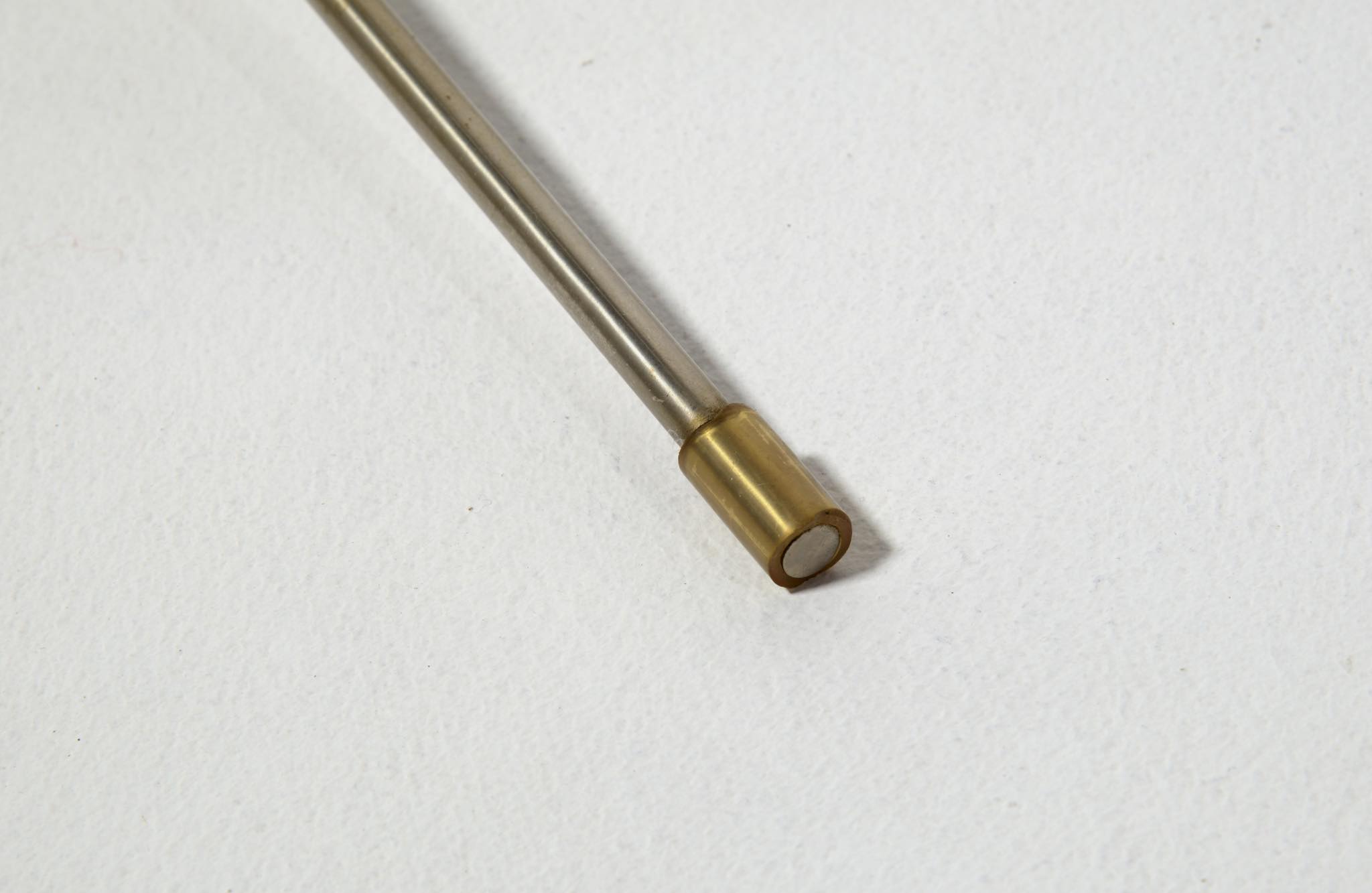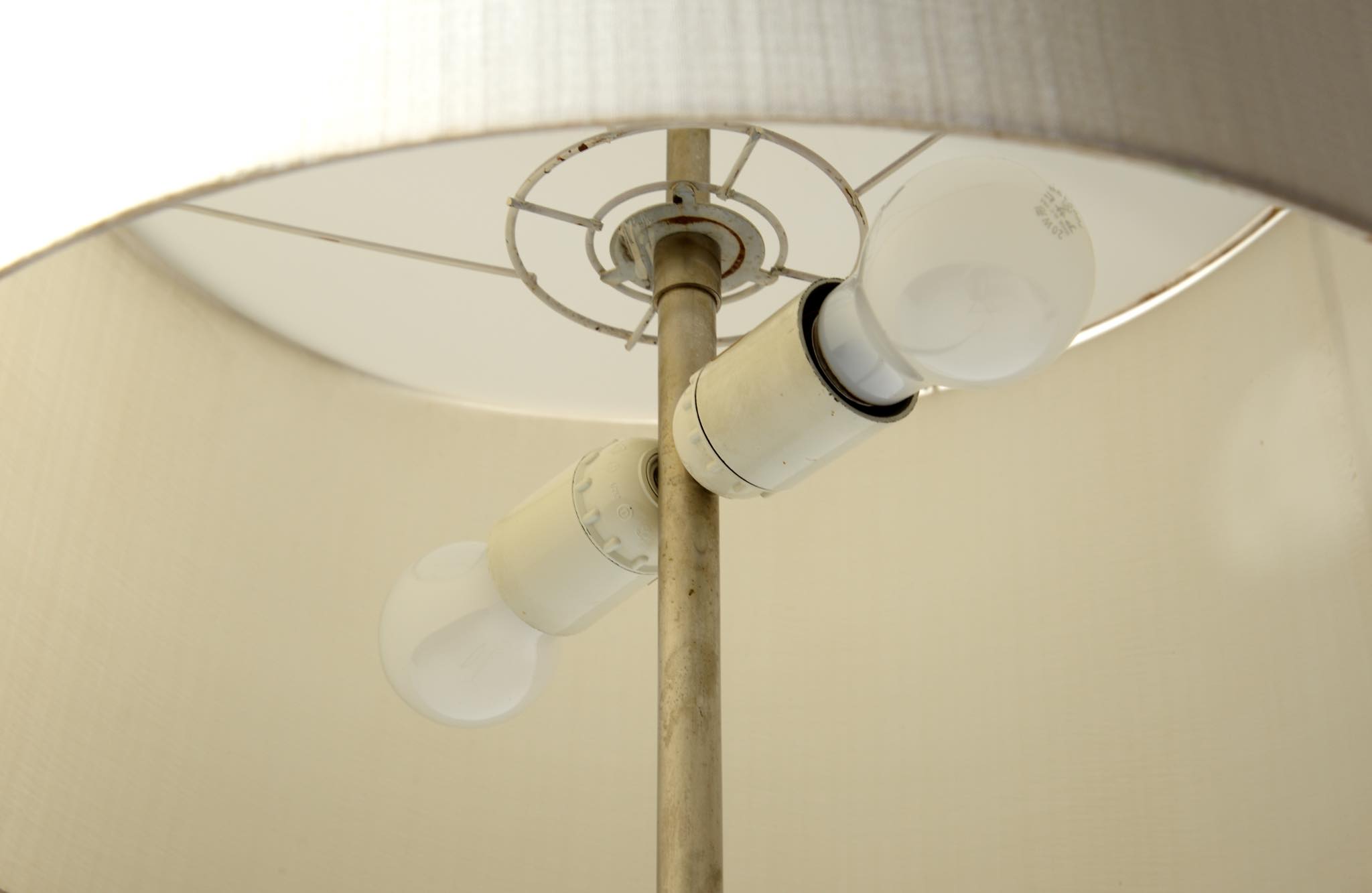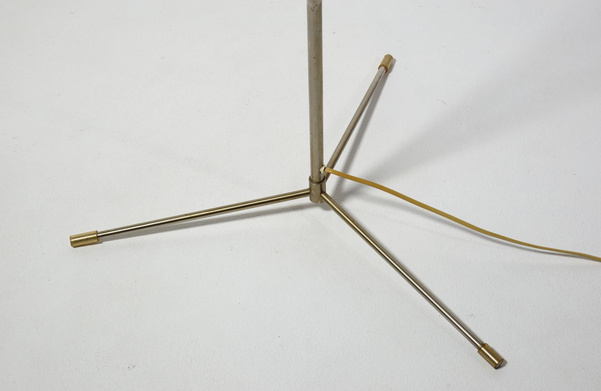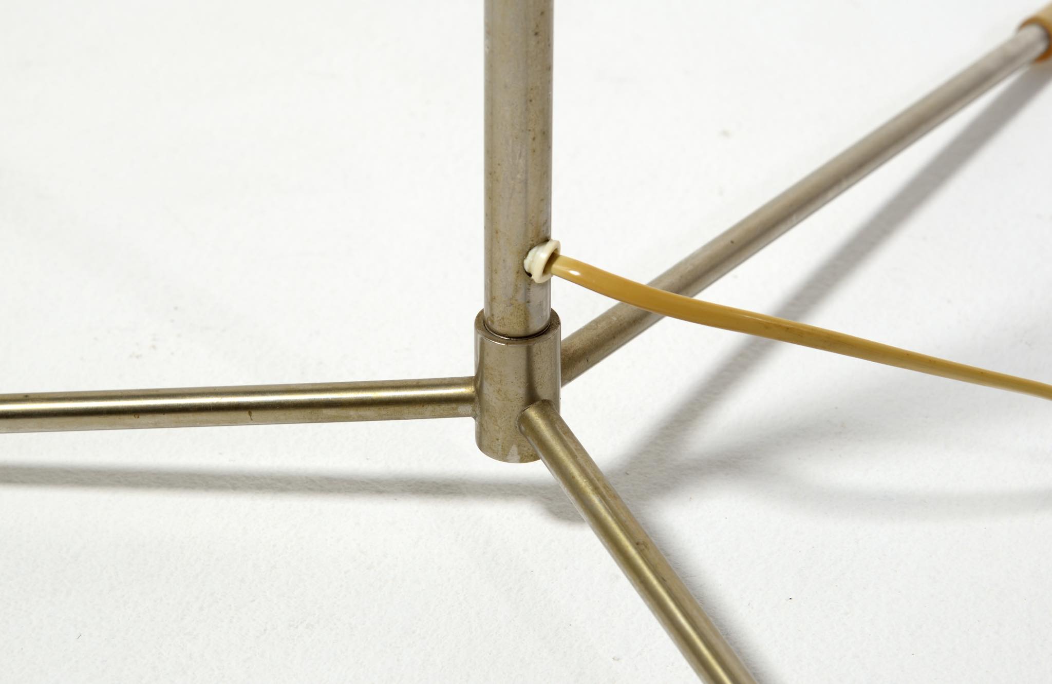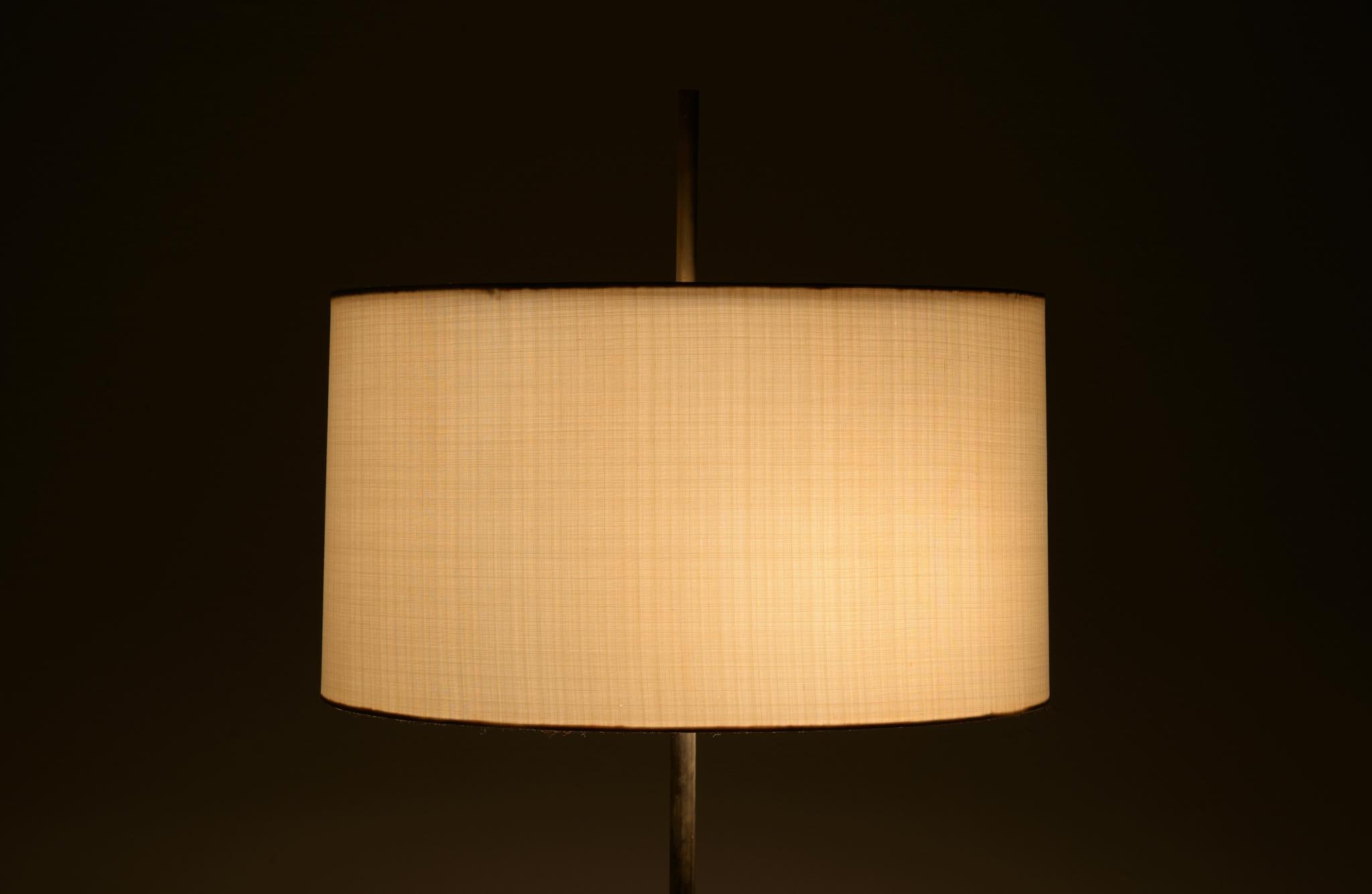 デンマークの照明デザイナー、Svend Aage Holm Sorensen/スヴェン・オーゲ・ホルム・ソーレンセンによるフロアーランプです。1950年代に作られたとされる照明で、真鍮を用いたフォルムは、その当時としてはシンプルでミニマルにデザインされています。オリジナルと思われるシェードに若干の凹みが見られます、また、支柱がごくわずかに傾いている感がありますが、ほぼ気付かない程度です。全体的に綺麗な状態です。