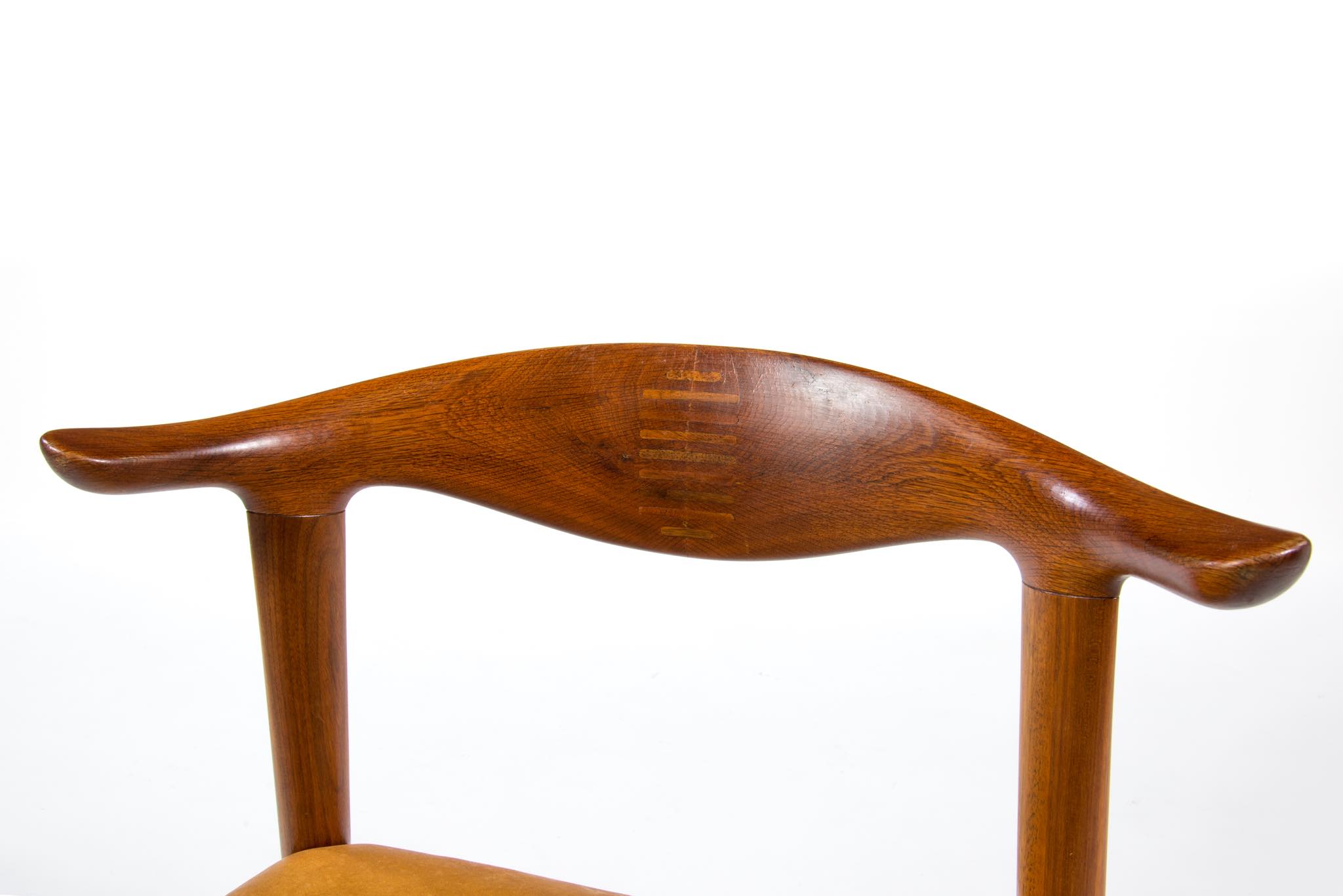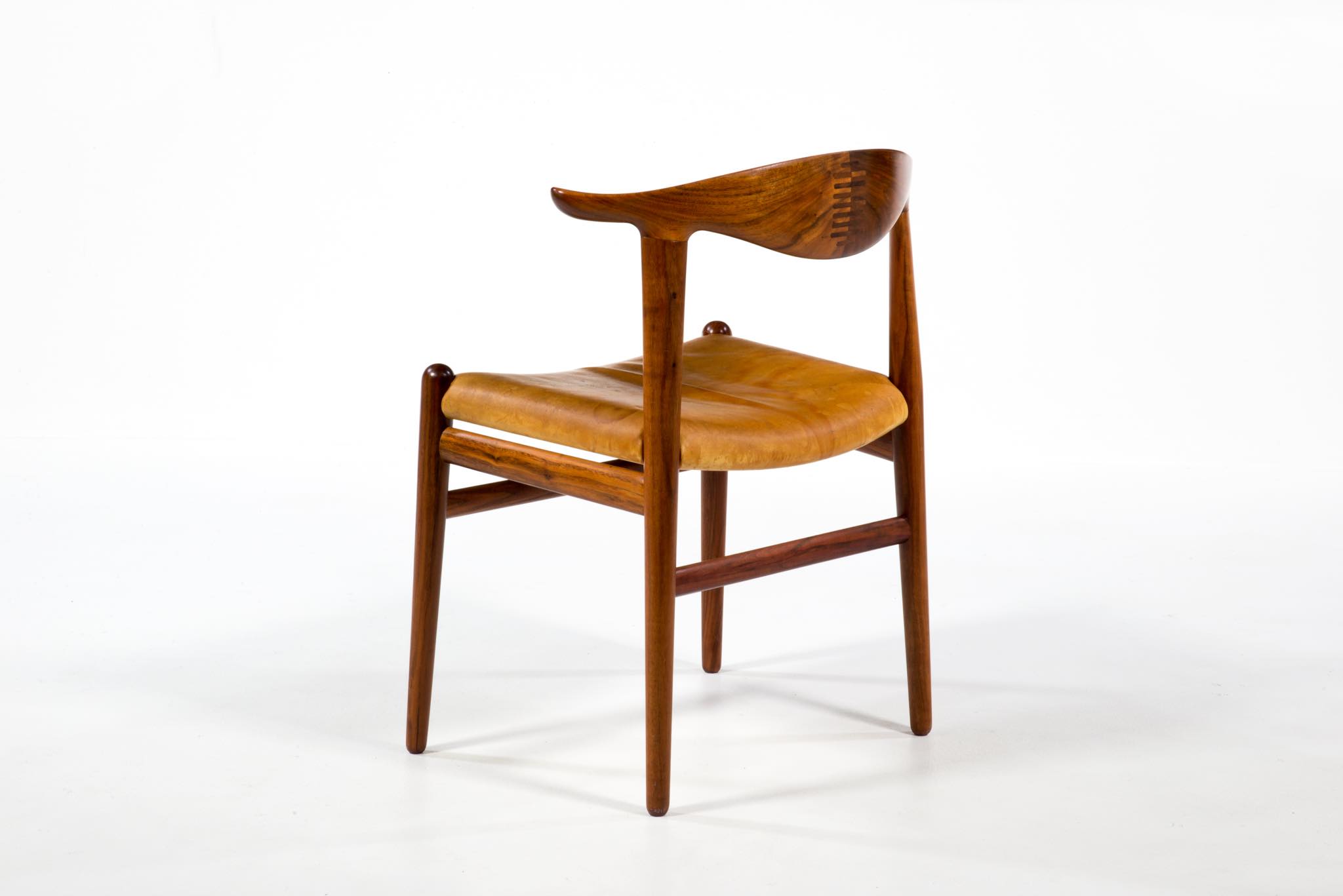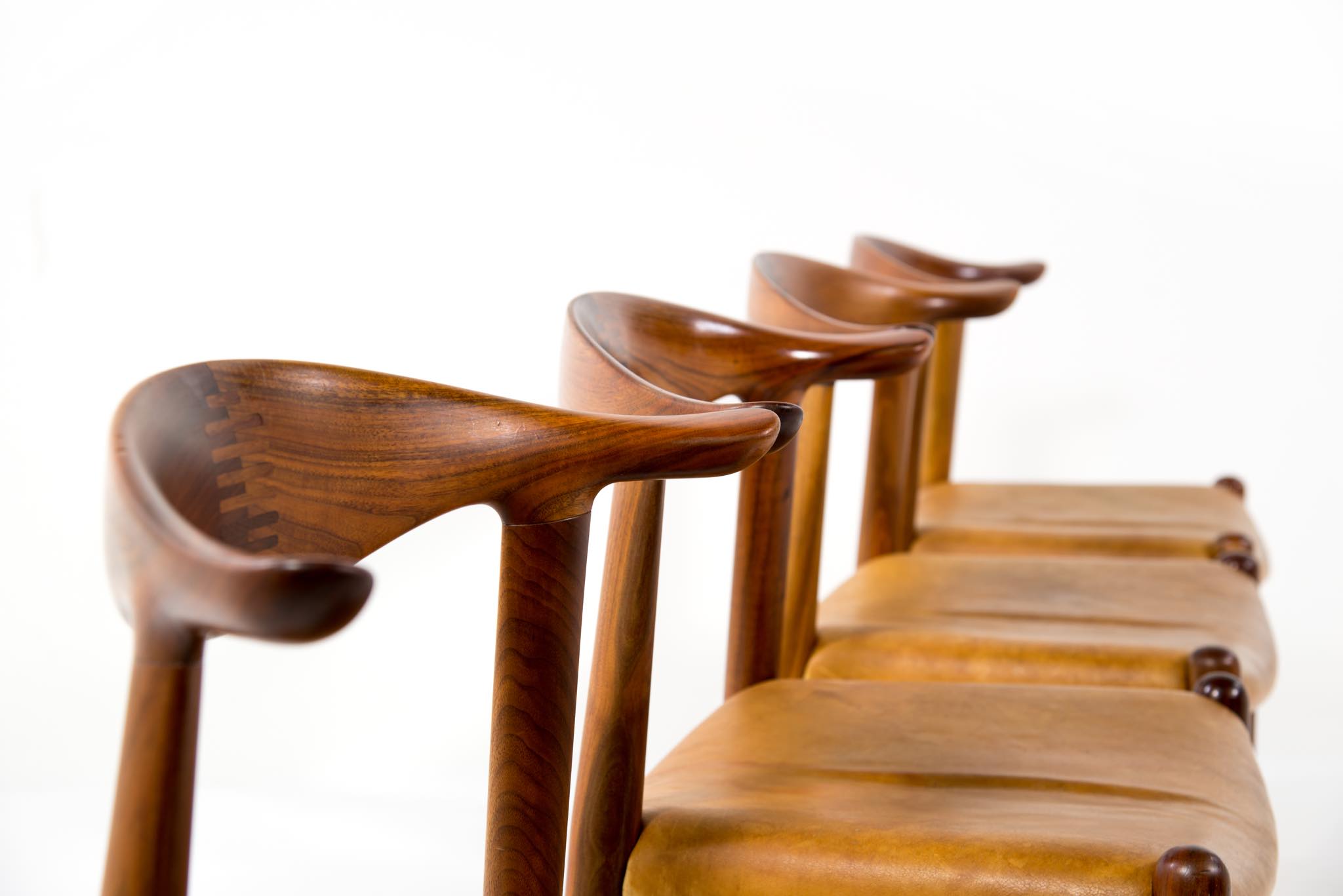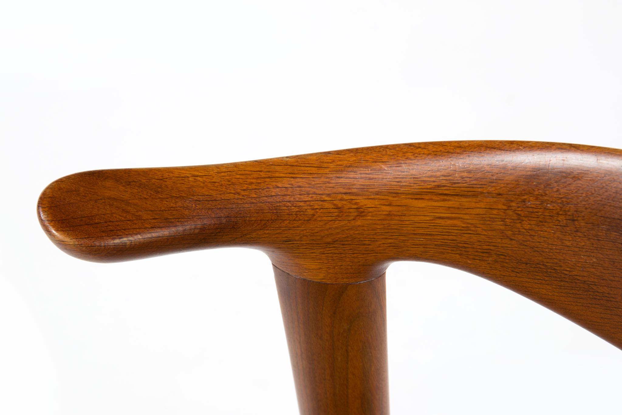 デンマークを代表する家具デザイナーのHans J. Wegner/ハンス・ウェグナーによる名作椅子”カウホーン”チェア、4脚セットです。 こちらは、この椅子を手がけた工房、Johannes Hansen/ヨハネス・ハンセンの技術者で工場長を務めた、Niels Aage Henriksen氏によって、自身のために特別に製造し、長年自邸で使用されていたセットとなります。カウホーンチェアは通常、オーク材、チーク材、マホガニー材で作られていますが、あまり使用しないコーカサス産と思しき、縞模様の現れたウォールナット材を4脚、チーク材を1脚、オーク材1脚の、計6脚セットで製作されました。工房長は自邸のためにこのそれぞれの椅子を製作し、50年代から60年代にかけて木材の流通や供給に変化があることを踏まえ、あえて異素材でセットを揃え、それぞれの色調が均一化するよう作られたものと伝えられており、近年、氏の子孫らによって売り立てられたものを所有された方より6脚中4脚がセットとして売り立てられることとなりました。内訳はウォールナット材3脚とオーク材1脚の、計4脚セットとなります。コンディションにつきまして、基本的にオリジナルの状態を維持しており、使い込まれた皮革は柔らかさや潤いが保たれています。木部はオイルでリフィニッシュされており、使いやすく仕上げられています。4脚とも目立ったダメージはなく、とてもきれいな状態です。
