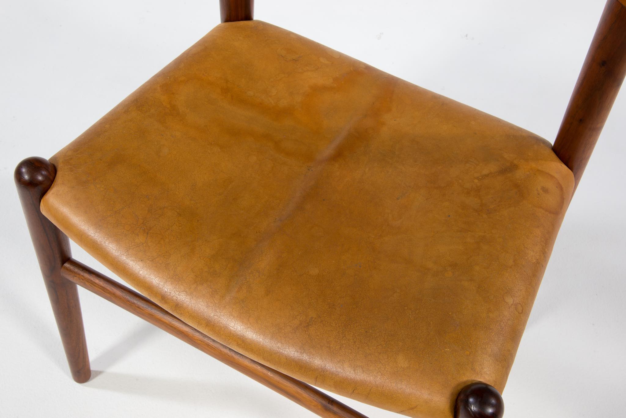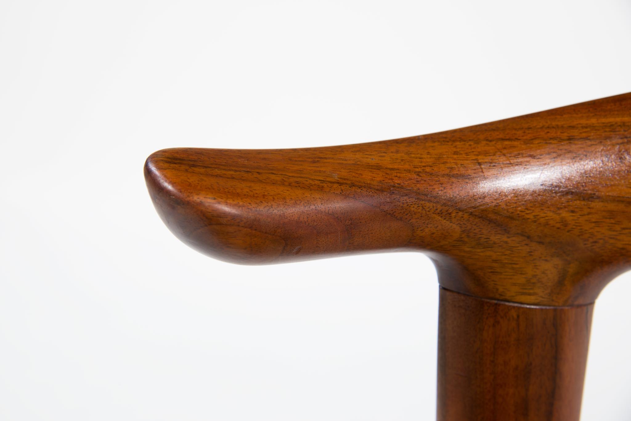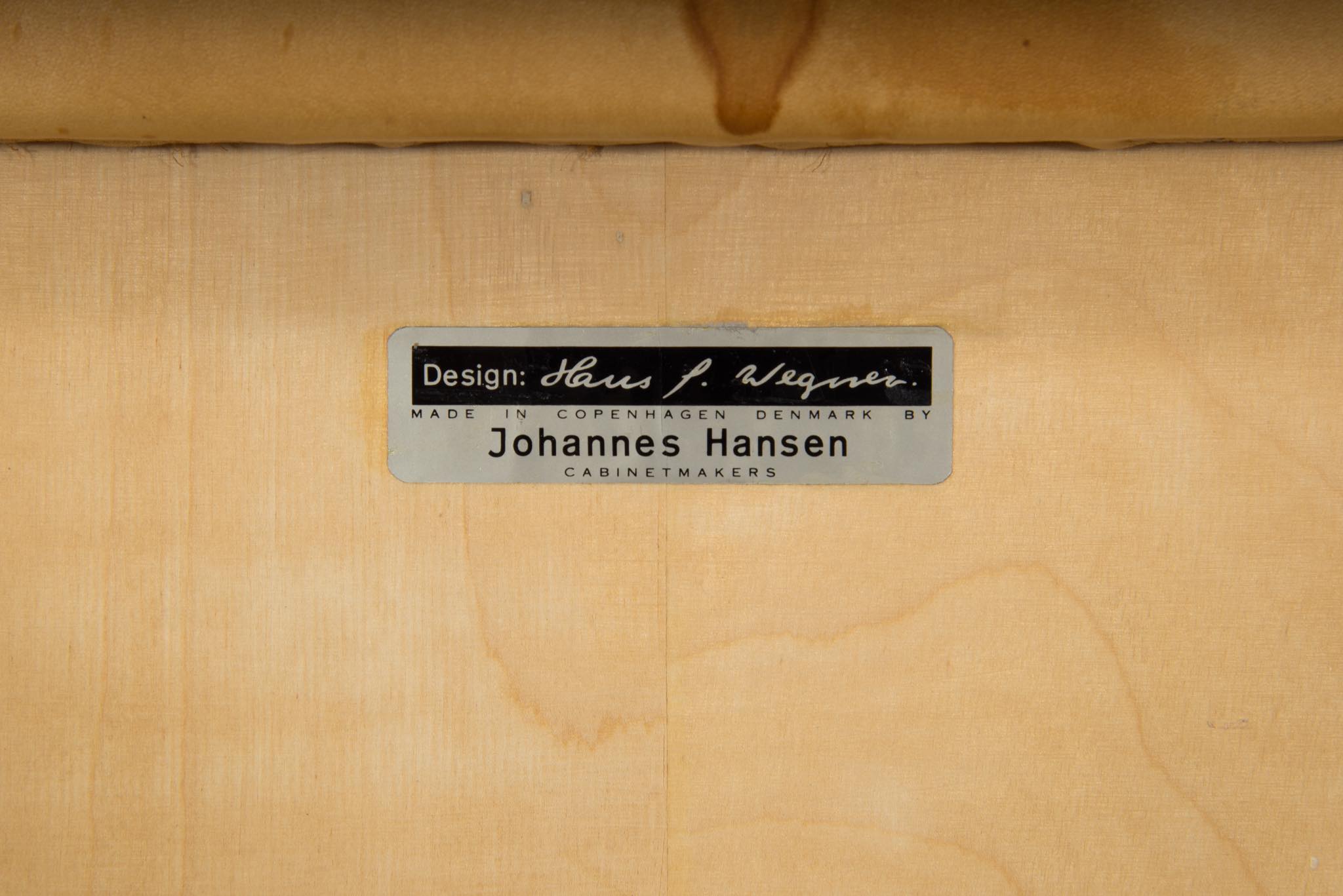 デンマークを代表する家具デザイナーのHans J. Wegner/ハンス・ウェグナーによる名作椅子”カウホーン”チェア、4脚セットです。 こちらは、この椅子を手がけた工房、Johannes Hansen/ヨハネス・ハンセンの技術者で工場長を務めた、Niels Aage Henriksen氏によって、自身のために特別に製造し、長年自邸で使用されていたセットとなります。カウホーンチェアは通常、オーク材、チーク材、マホガニー材で作られていますが、あまり使用しないコーカサス産と思しき、縞模様の現れたウォールナット材を4脚、チーク材を1脚、オーク材1脚の、計6脚セットで製作されました。工房長は自邸のためにこのそれぞれの椅子を製作し、50年代から60年代にかけて木材の流通や供給に変化があることを踏まえ、あえて異素材でセットを揃え、それぞれの色調が均一化するよう作られたものと伝えられており、近年、氏の子孫らによって売り立てられたものを所有された方より6脚中4脚がセットとして売り立てられることとなりました。内訳はウォールナット材3脚とオーク材1脚の、計4脚セットとなります。コンディションにつきまして、基本的にオリジナルの状態を維持しており、使い込まれた皮革は柔らかさや潤いが保たれています。木部はオイルでリフィニッシュされており、使いやすく仕上げられています。4脚とも目立ったダメージはなく、とてもきれいな状態です。