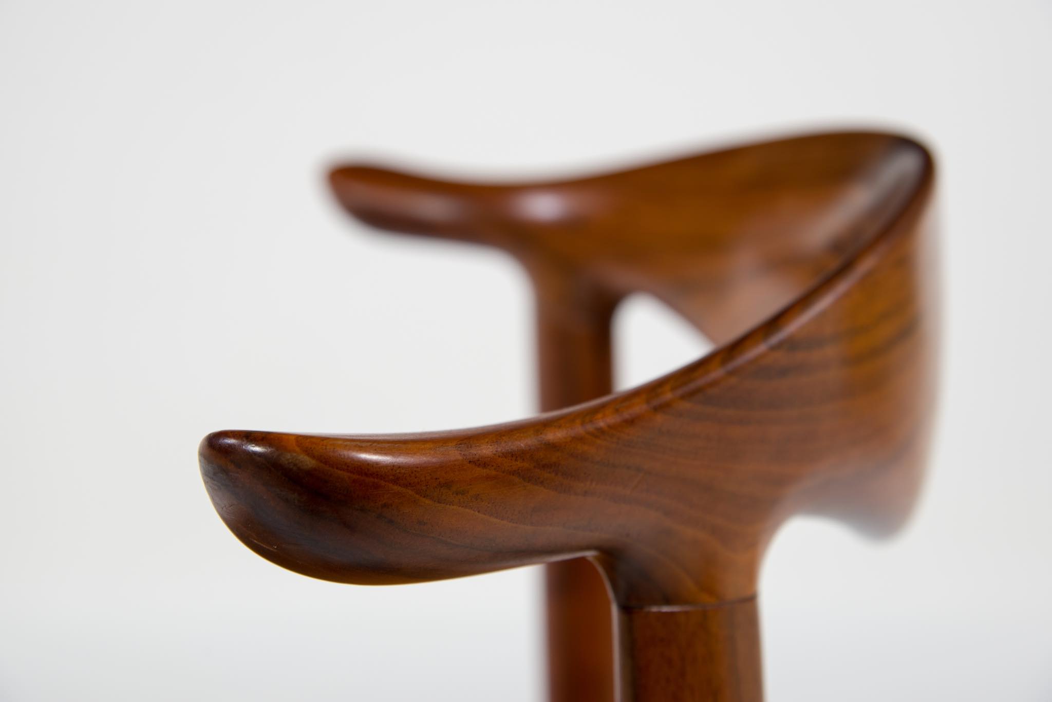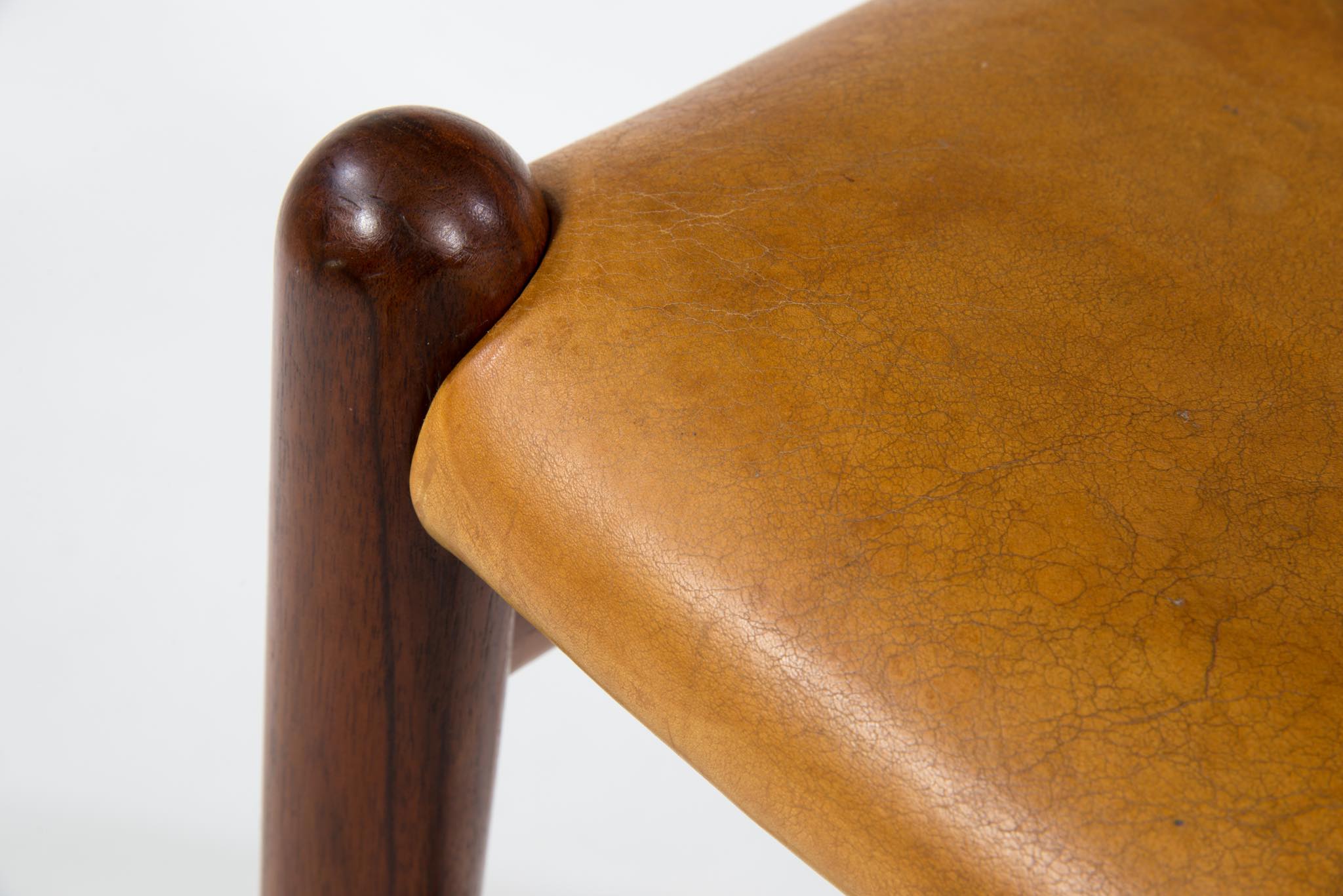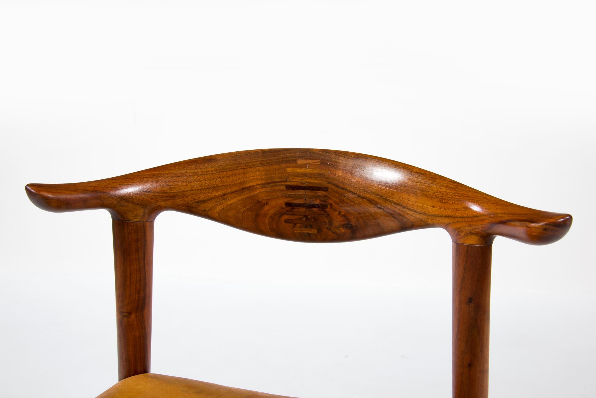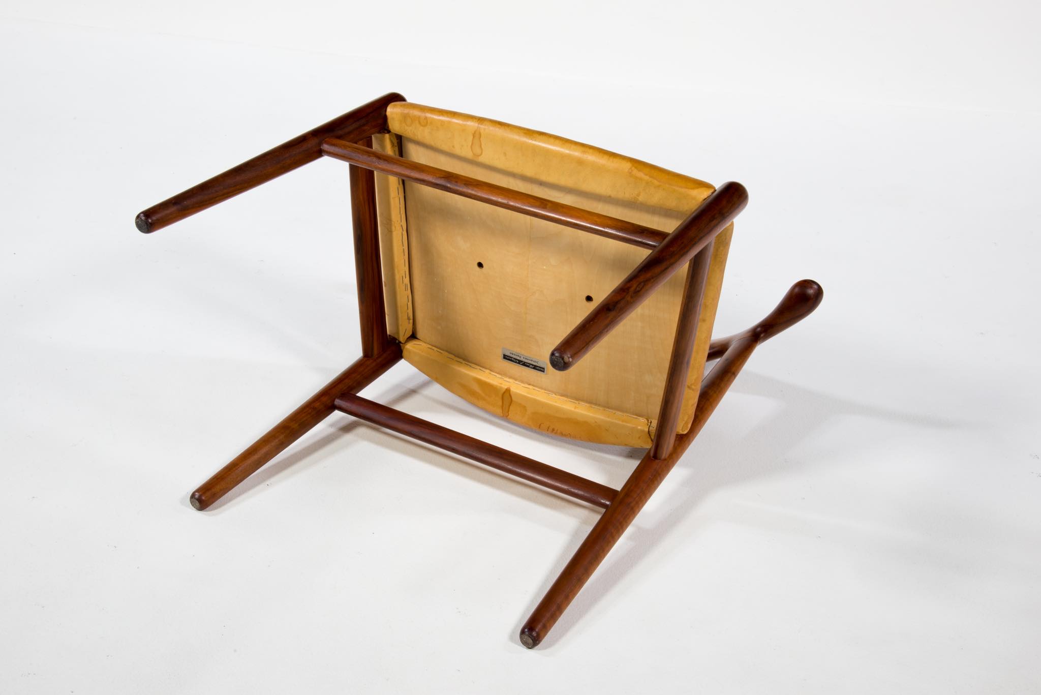 デンマークを代表する家具デザイナーのHans J. Wegner/ハンス・ウェグナーによる名作椅子”カウホーン”チェア、4脚セットです。 こちらは、この椅子を手がけた工房、Johannes Hansen/ヨハネス・ハンセンの技術者で工場長を務めた、Niels Aage Henriksen氏によって、自身のために特別に製造し、長年自邸で使用されていたセットとなります。カウホーンチェアは通常、オーク材、チーク材、マホガニー材で作られていますが、あまり使用しないコーカサス産と思しき、縞模様の現れたウォールナット材を4脚、チーク材を1脚、オーク材1脚の、計6脚セットで製作されました。工房長は自邸のためにこのそれぞれの椅子を製作し、50年代から60年代にかけて木材の流通や供給に変化があることを踏まえ、あえて異素材でセットを揃え、それぞれの色調が均一化するよう作られたものと伝えられており、近年、氏の子孫らによって売り立てられたものを所有された方より6脚中4脚がセットとして売り立てられることとなりました。内訳はウォールナット材3脚とオーク材1脚の、計4脚セットとなります。コンディションにつきまして、基本的にオリジナルの状態を維持しており、使い込まれた皮革は柔らかさや潤いが保たれています。木部はオイルでリフィニッシュされており、使いやすく仕上げられています。4脚とも目立ったダメージはなく、とてもきれいな状態です。