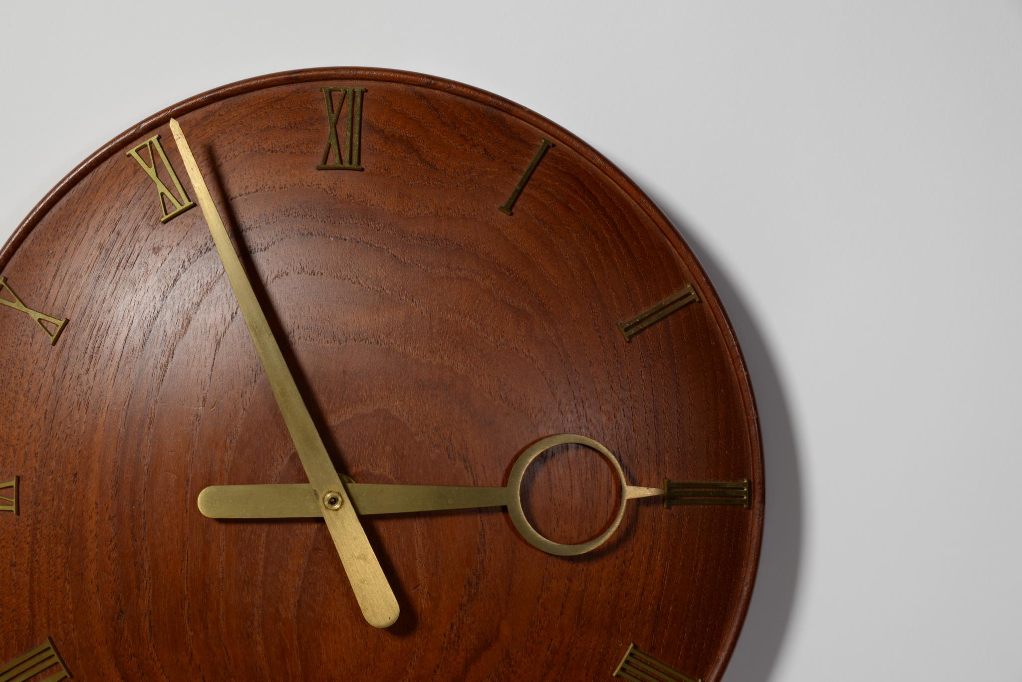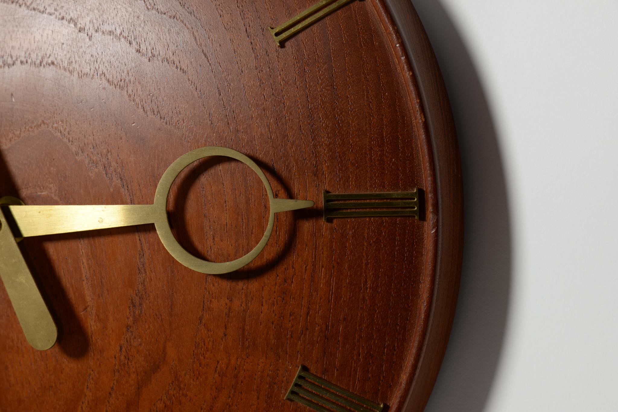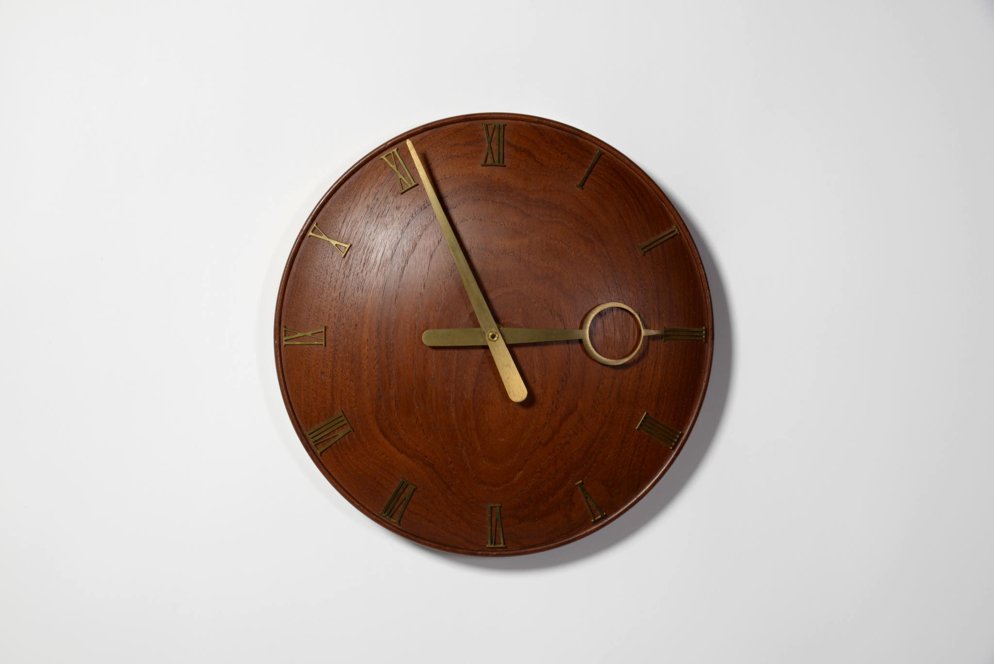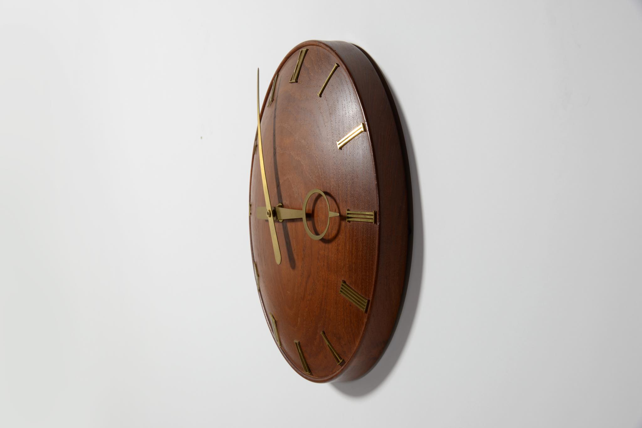 20世紀初頭に活躍したデンマークを代表する建築家、Kaj Gottlob/カイ・ゴットロブによるデザインとされている掛時計です。当方資料に乏しく確認が取れておりませんが、手の込んだ丁寧な仕事で作られています。材は無垢のチークと思われ、時分針と文字は真鍮で作られています。ムーブメントはオリジナルの電気式が既に故障していたため、電池式クォーツに差し替えました。故に正確に時を刻んでいます。小傷等見られますが、とてもきれいな状態です。
