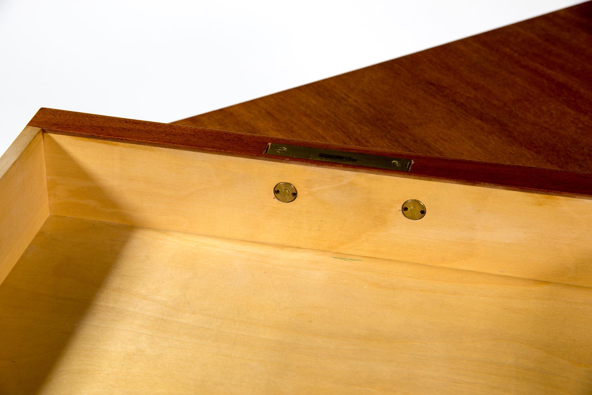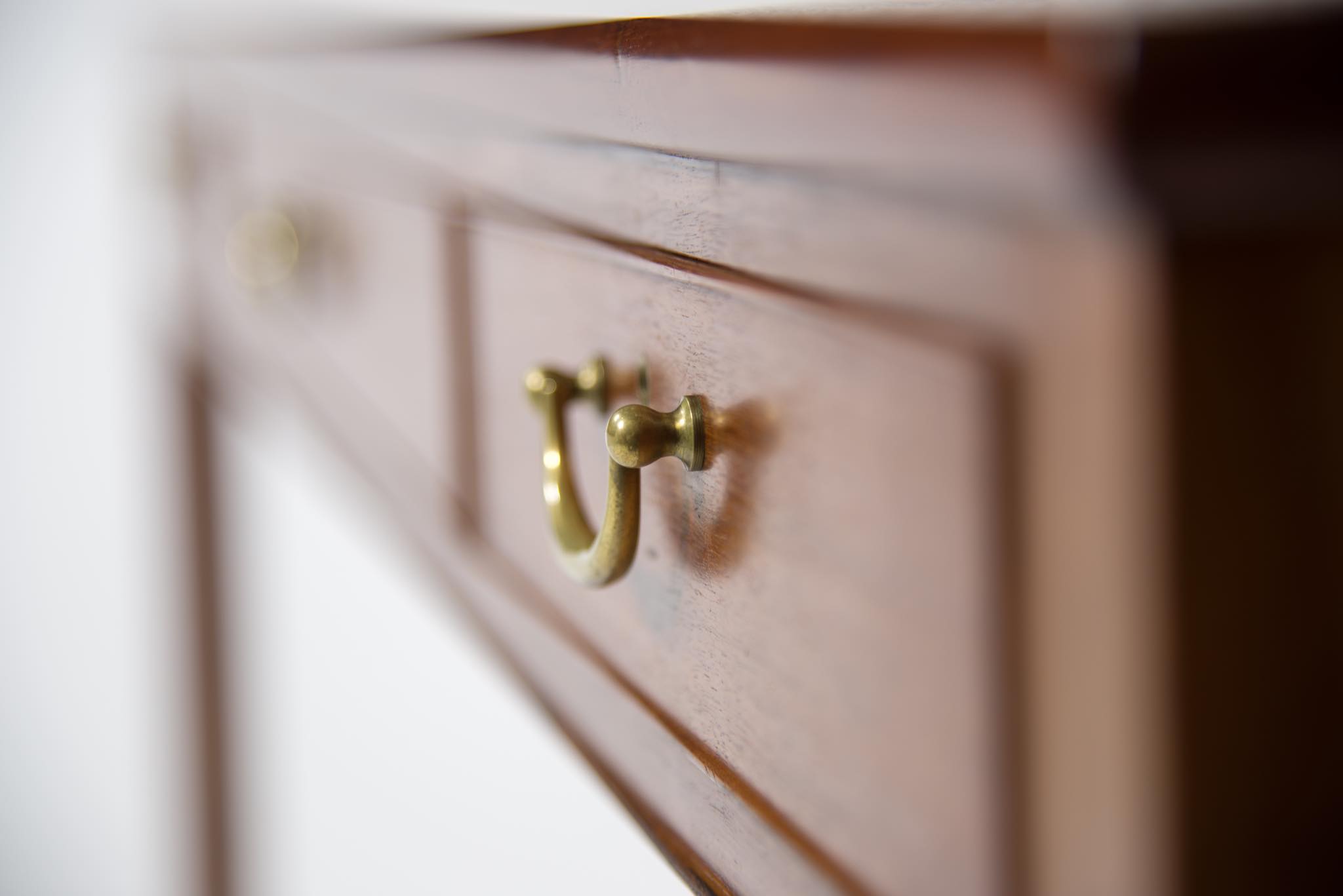 20世紀のデンマークを代表する家具デザイナーで、王立アカデミー家具科の教授を務めた Ole wansher/オーレ・ヴァンシャーによるライティングデスクです。工房は、ヴァンシャーの良質な作品を数多く手がけた A.J. Iversen/ A.J イヴァーセンによるもので、マホガニー材が用いられており、真鍮のハンドルが備わります。経年によって天板がわずかに反っていますが、構造的な問題はなく、傷も少なくとてもきれいな状態です。