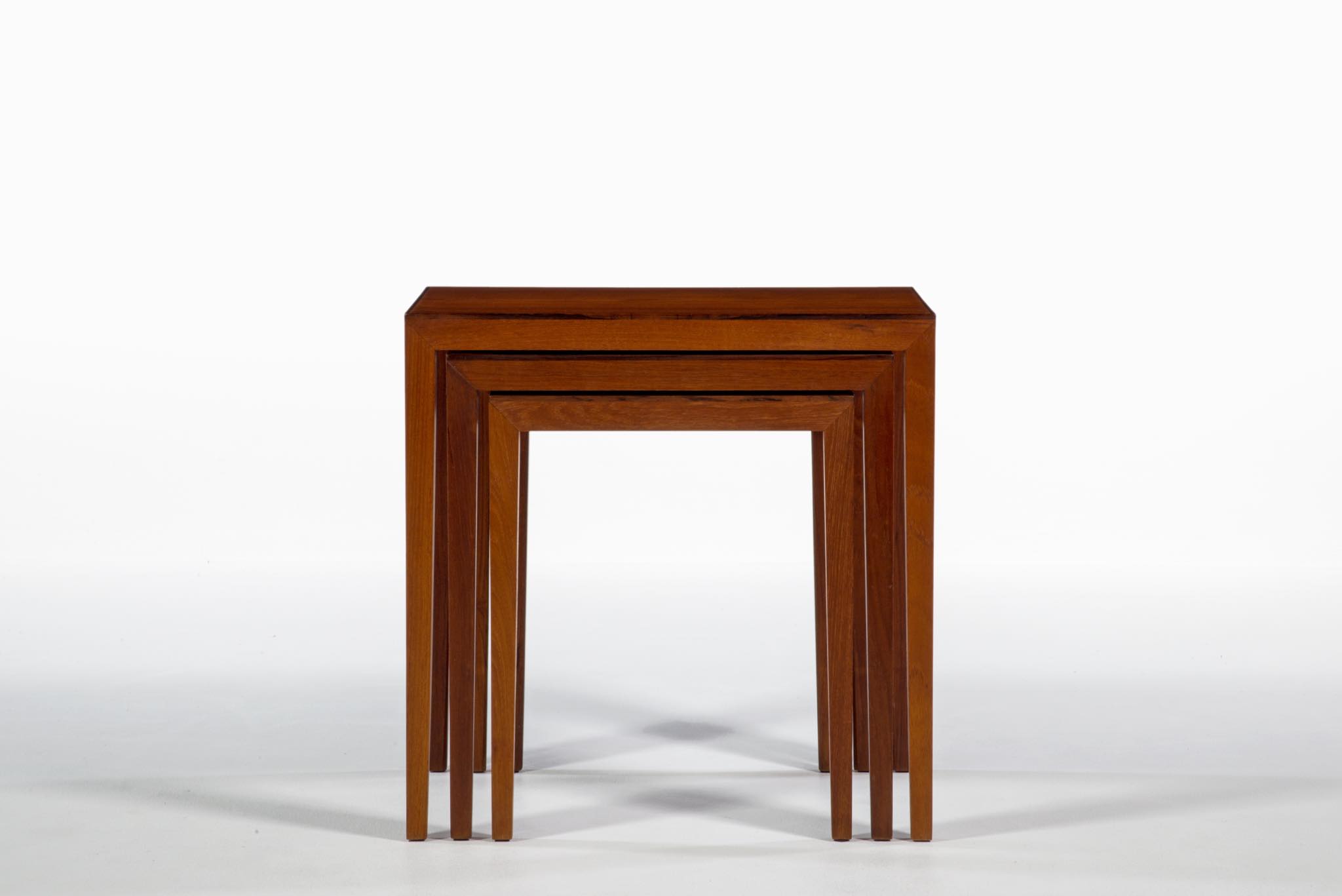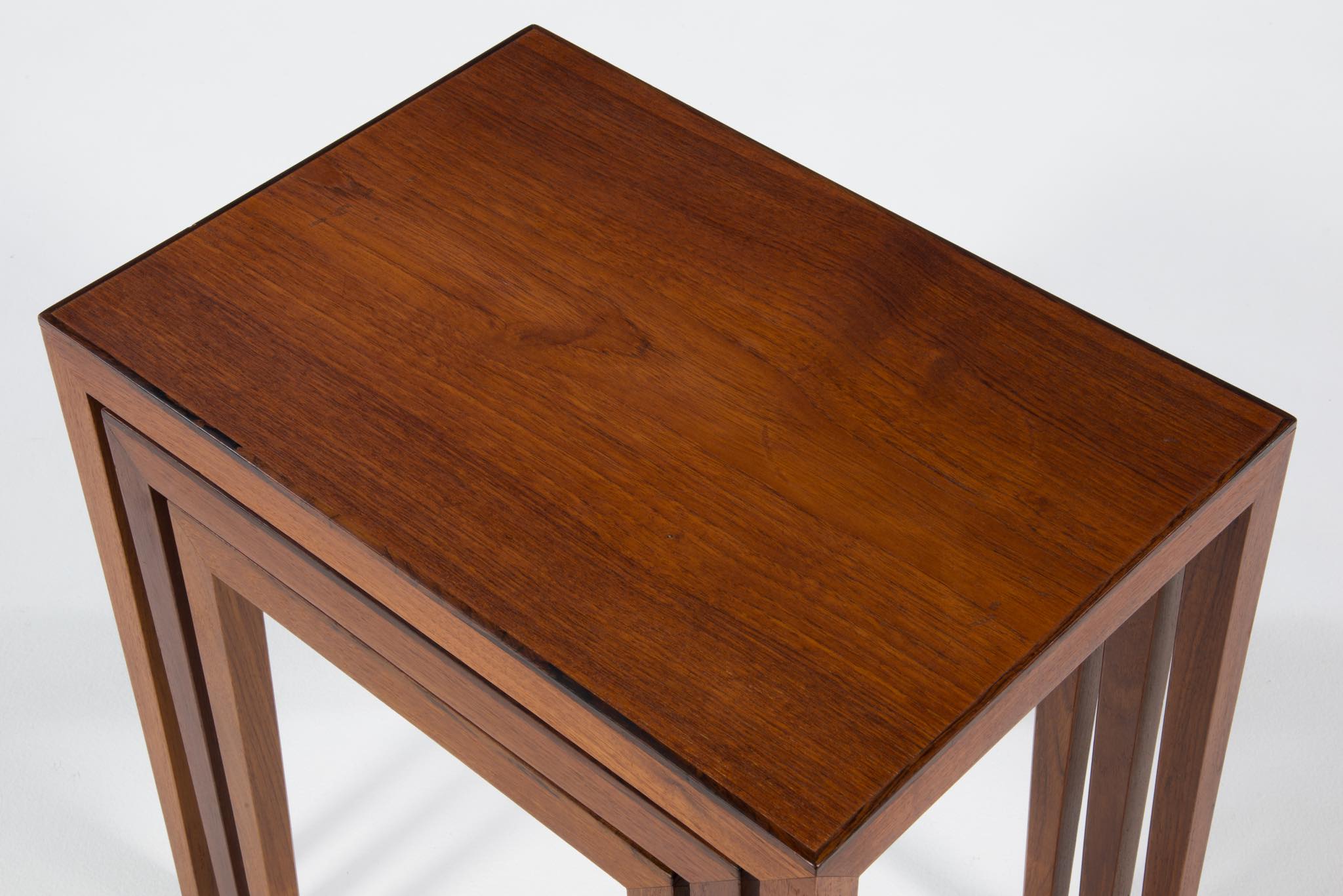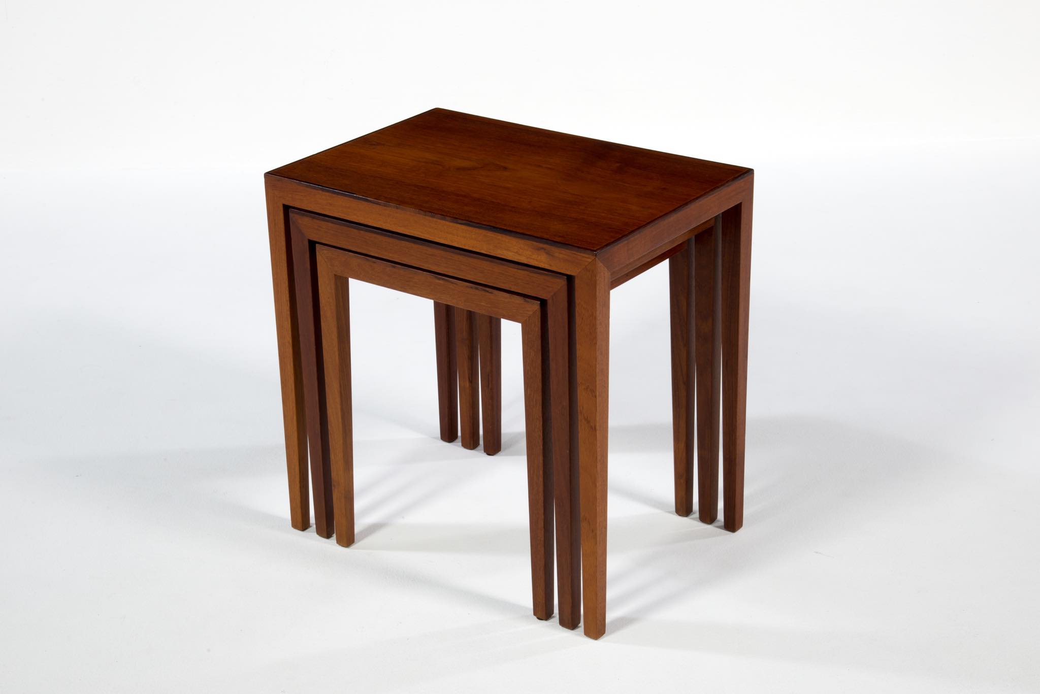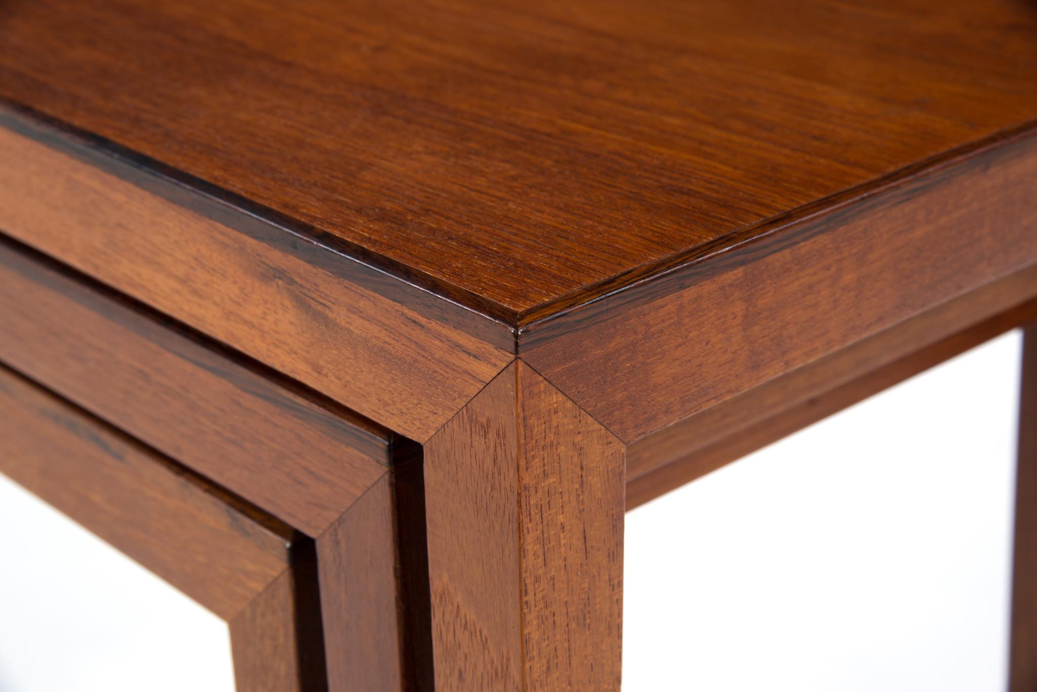デンマークのキャビネットメーカーによるネストテーブルです。デザイナーや工房など不明ですが、おそらく1950~60年代頃のもので、丁寧に作られています。本体はチーク材、天板の縁回しにごく細いローズウッド材が用いられています。