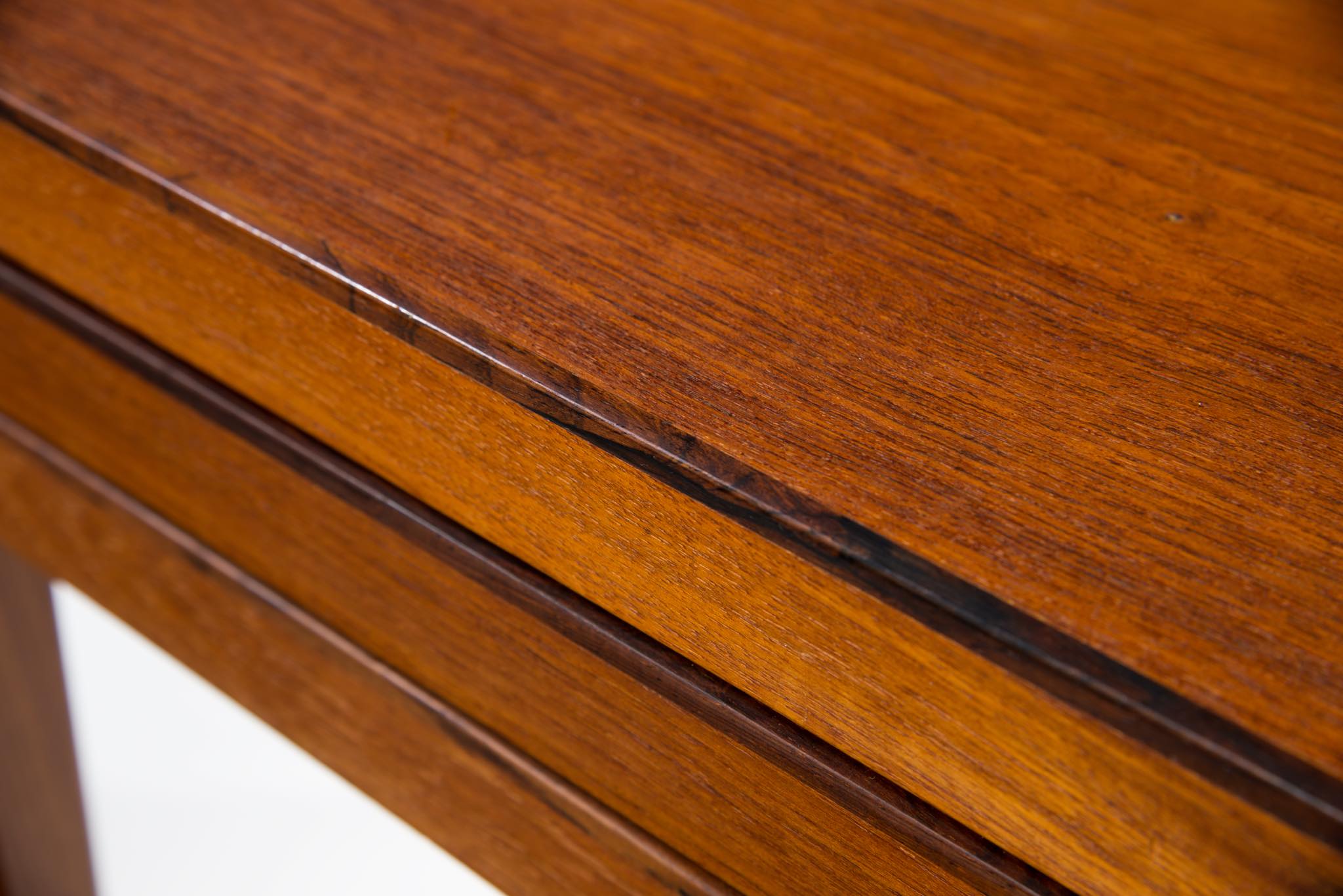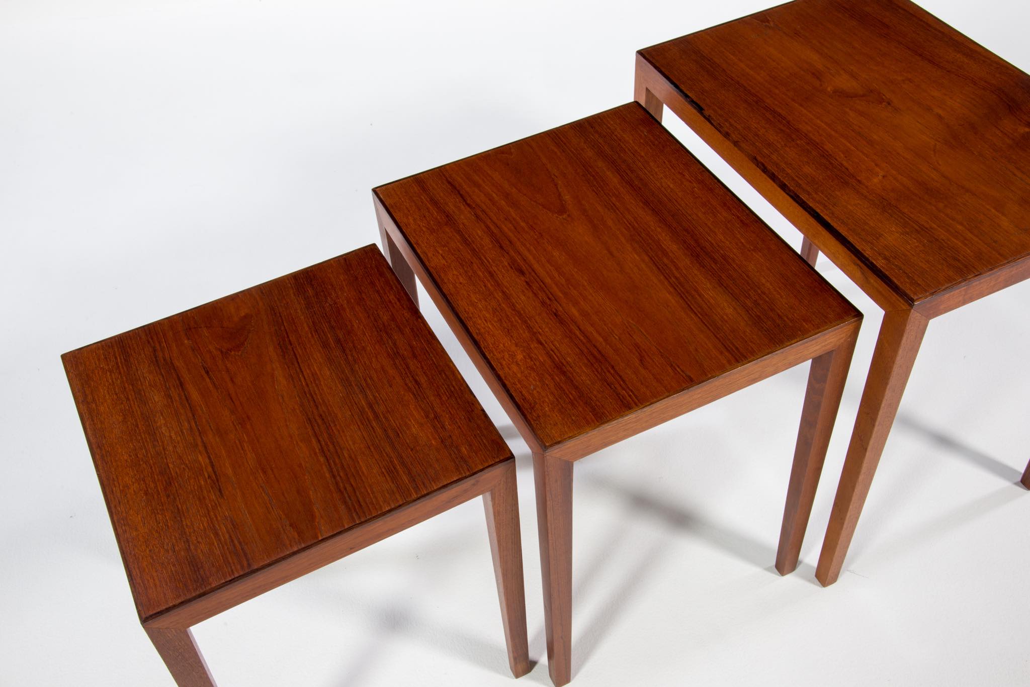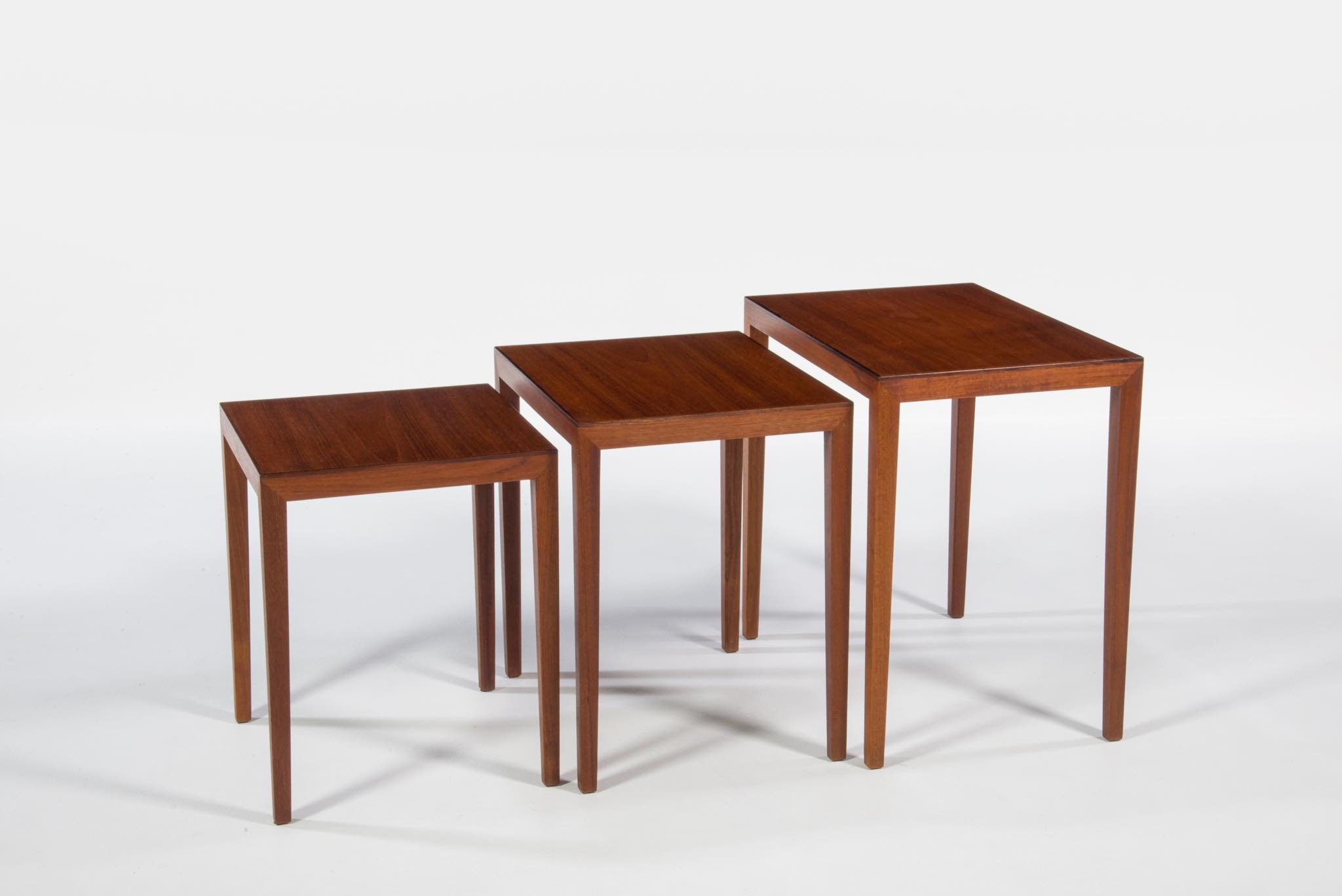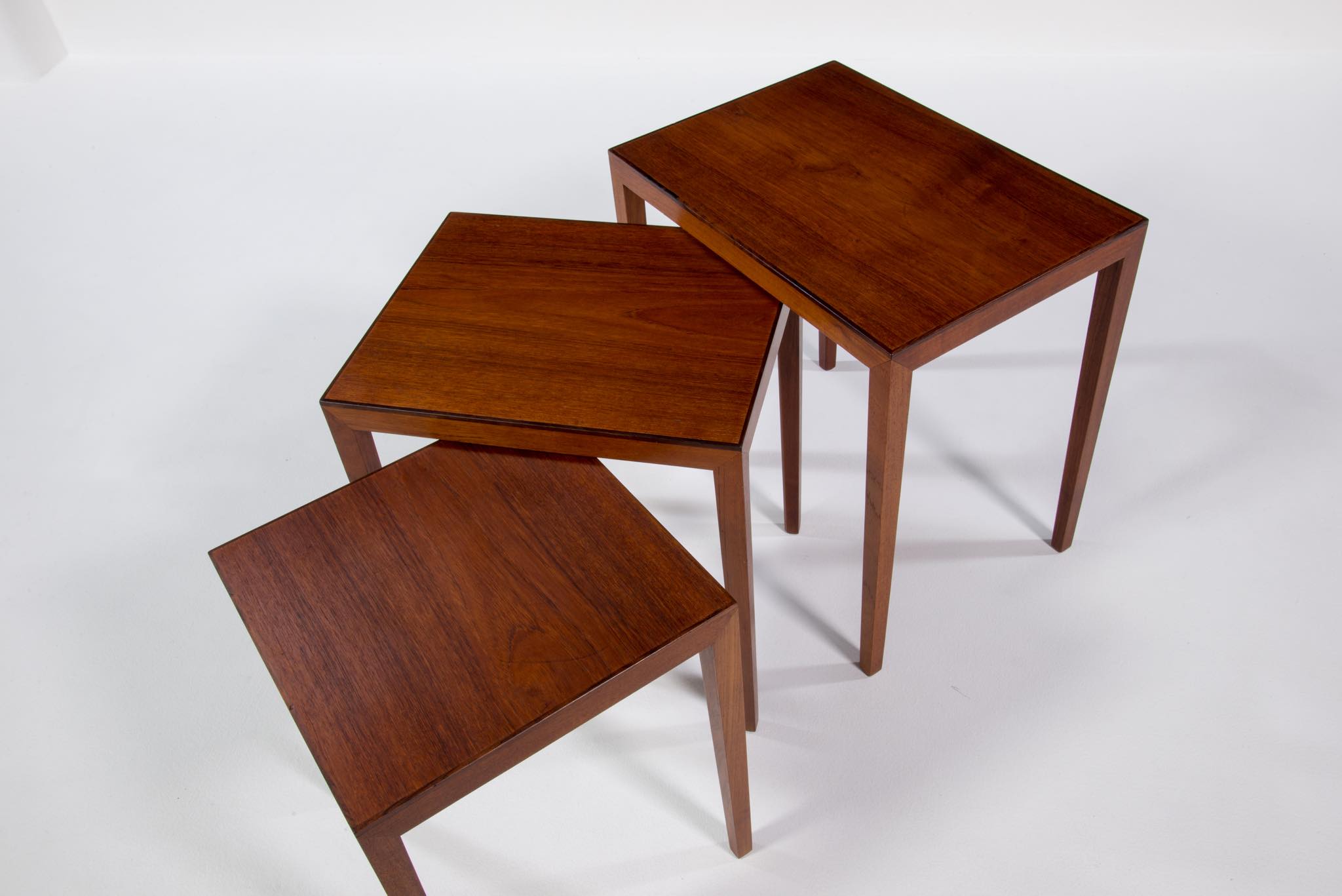 デンマークのキャビネットメーカーによるネストテーブルです。デザイナーや工房など不明ですが、おそらく1950~60年代頃のもので、丁寧に作られています。本体はチーク材、天板の縁回しにごく細いローズウッド材が用いられています。