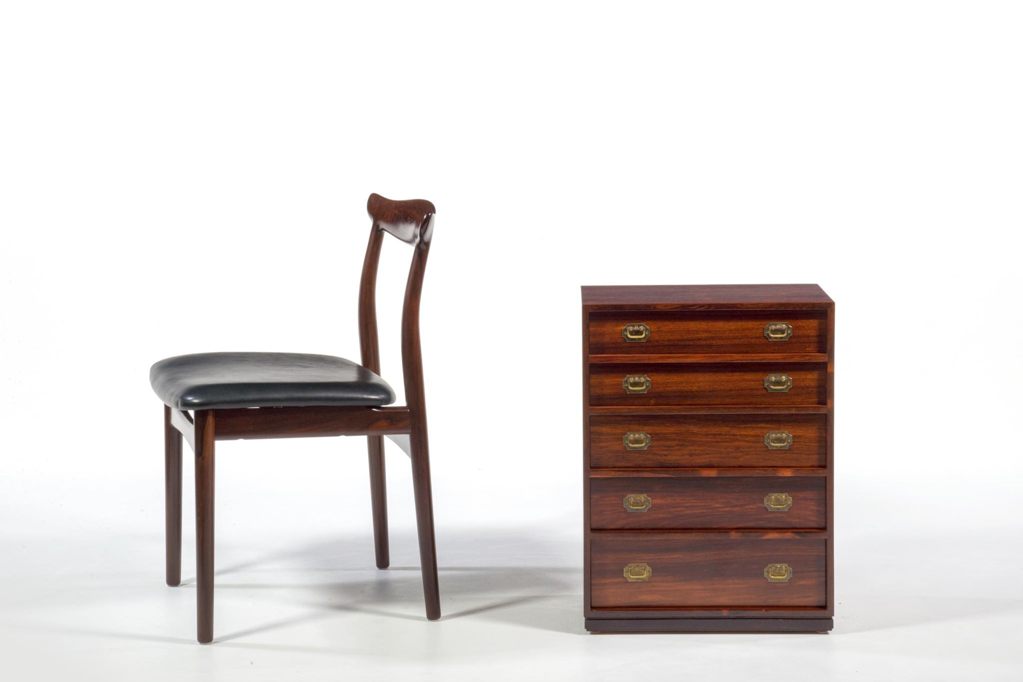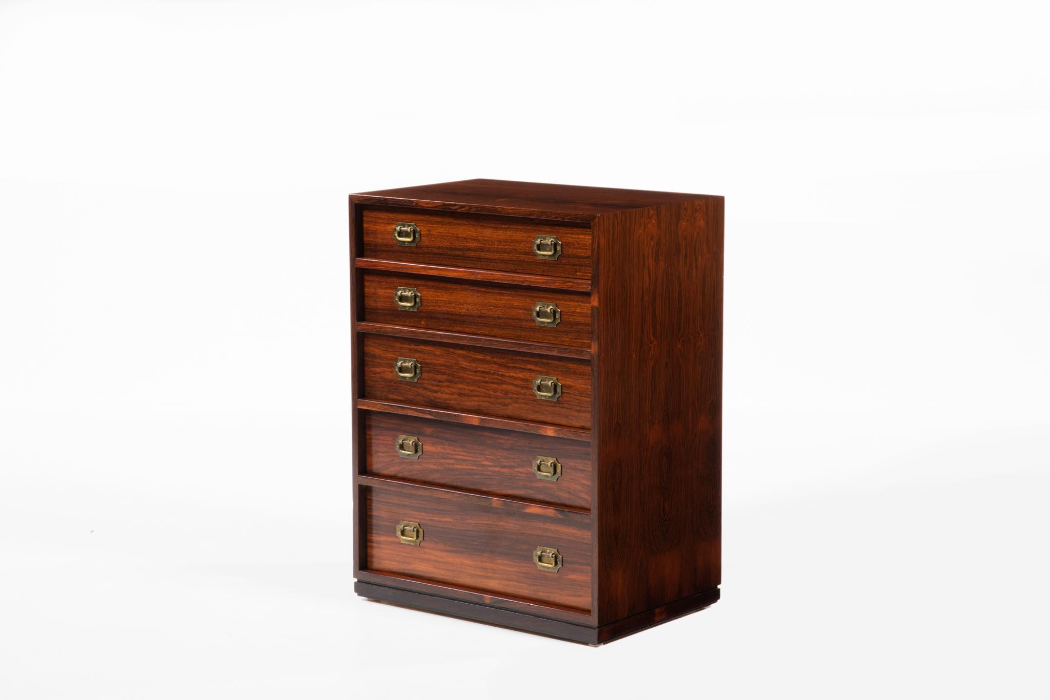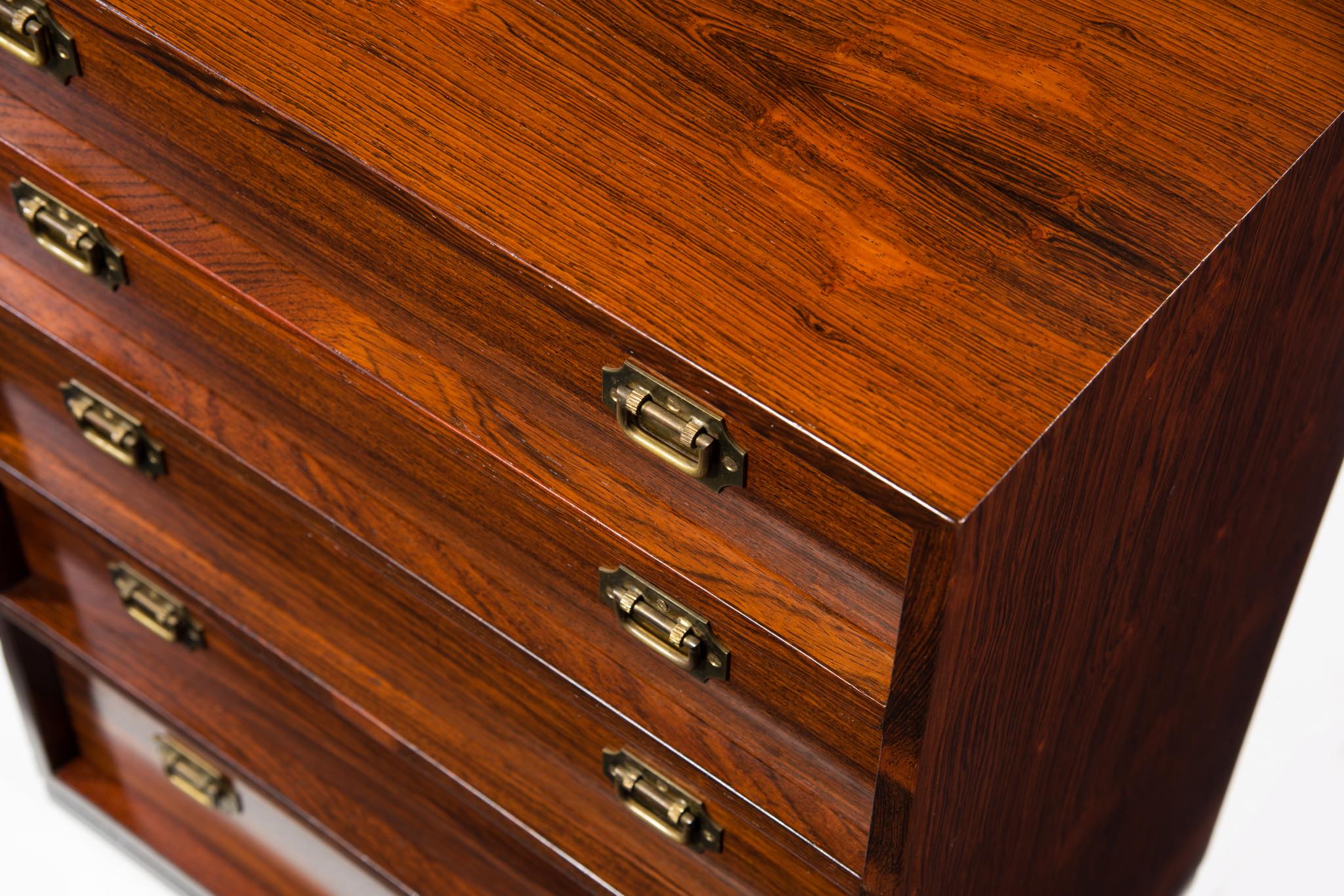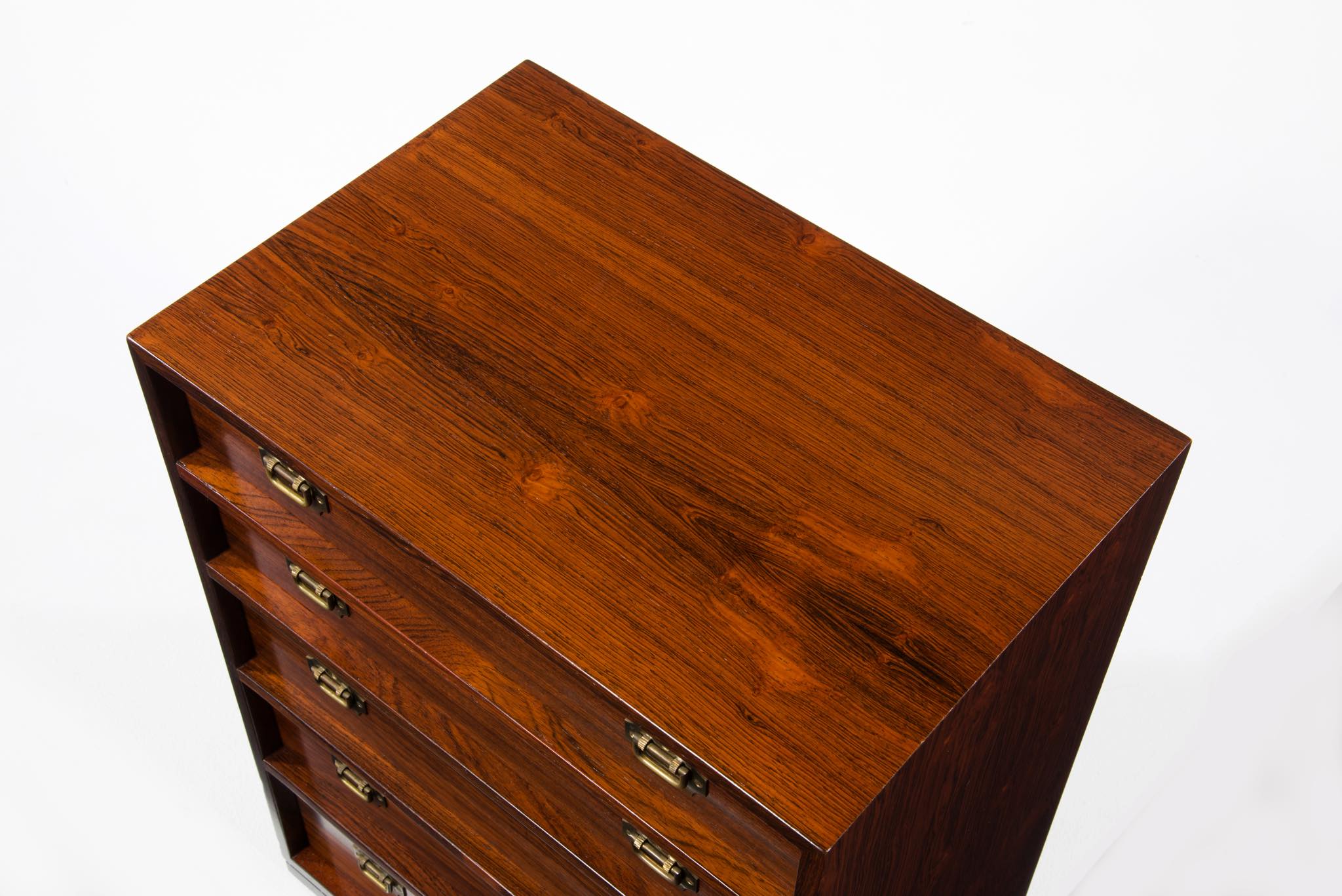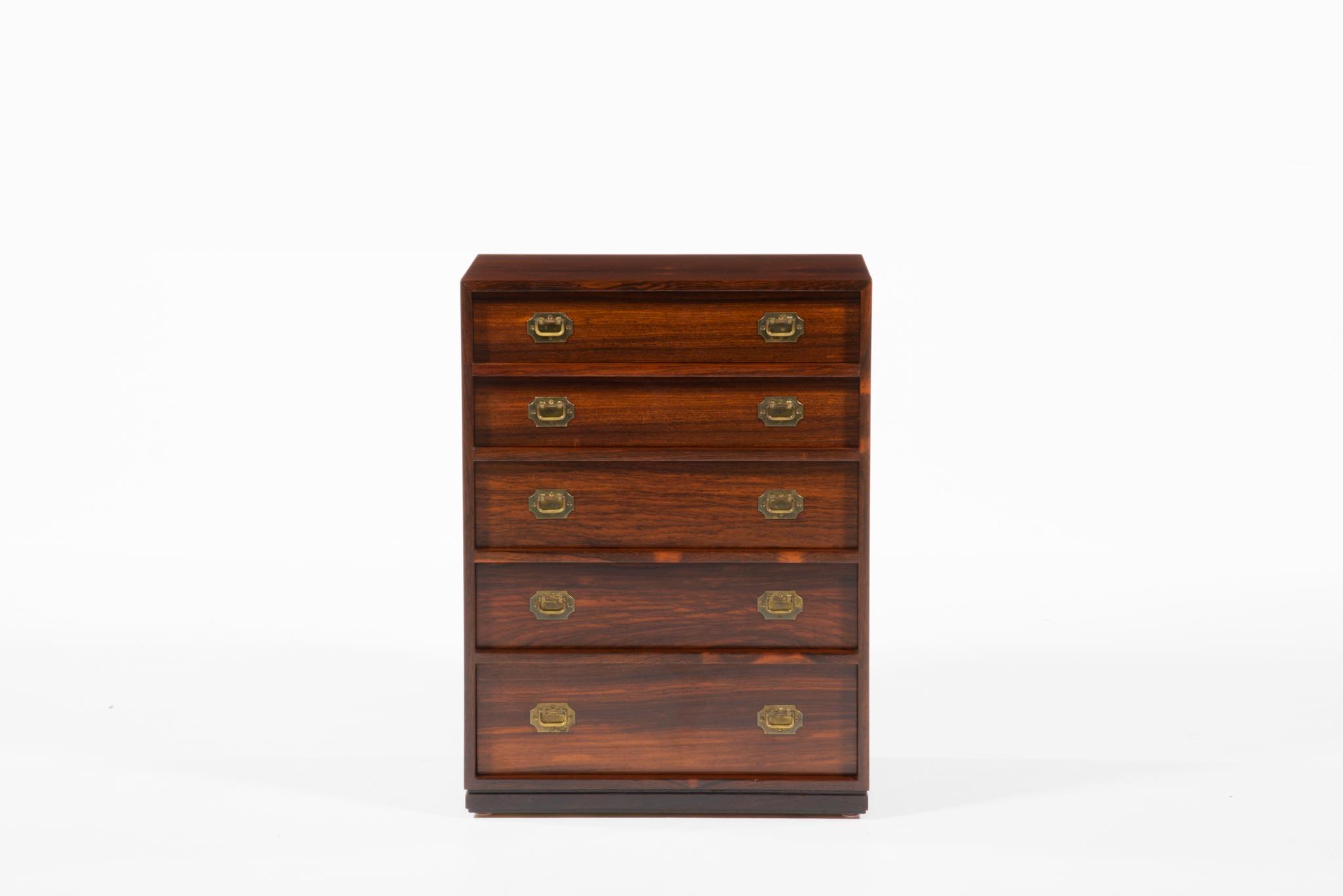 真鍮の引手や、低く設えられたベースなど、日本古来の「小抽斗」を思わせる佇まいで、座敷に設えても良いでしょう。小物入れに便利なサイズ感のもので、素材にはローズウッドを用いており、真鍮とのコンビネーションの美しいチェストです。