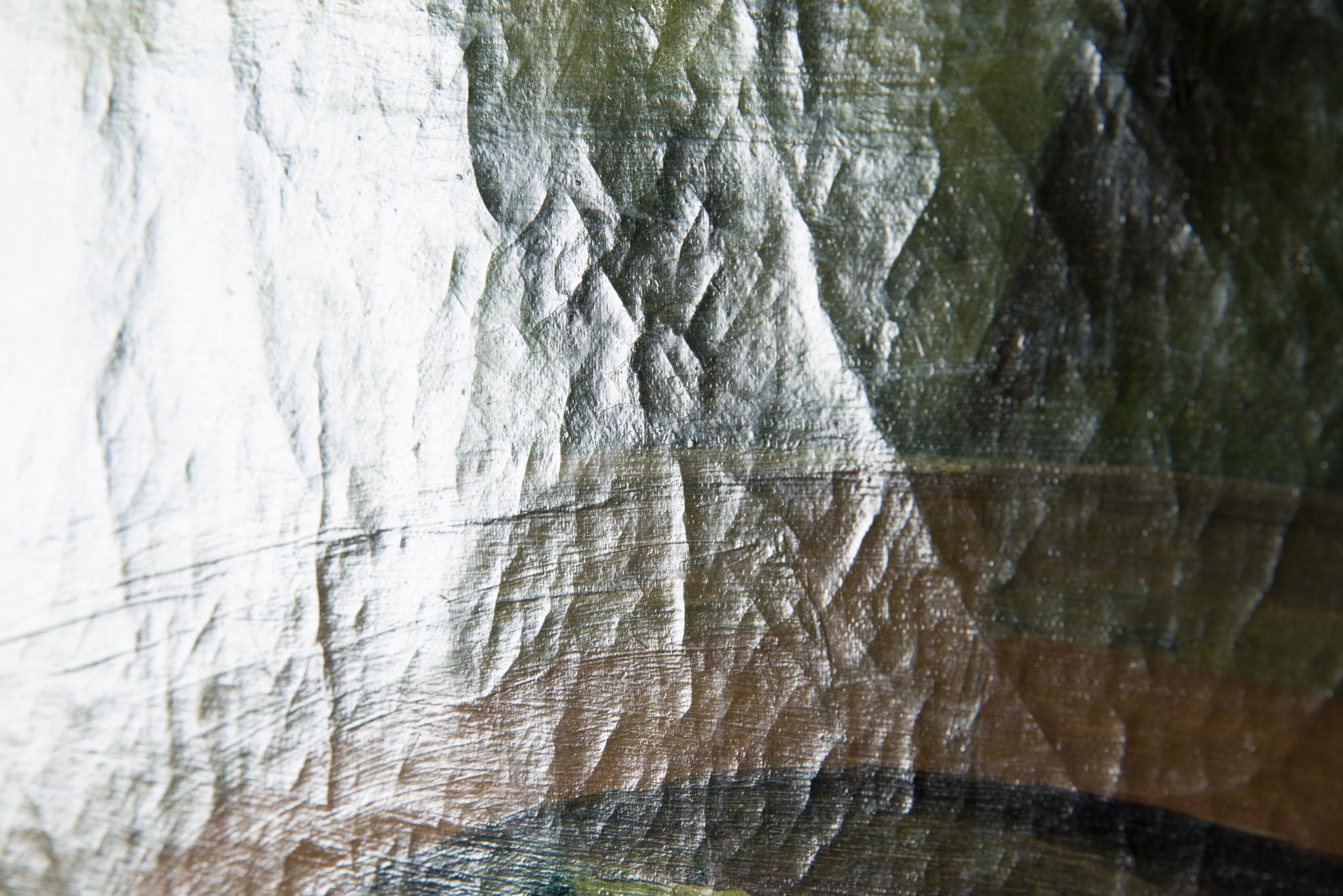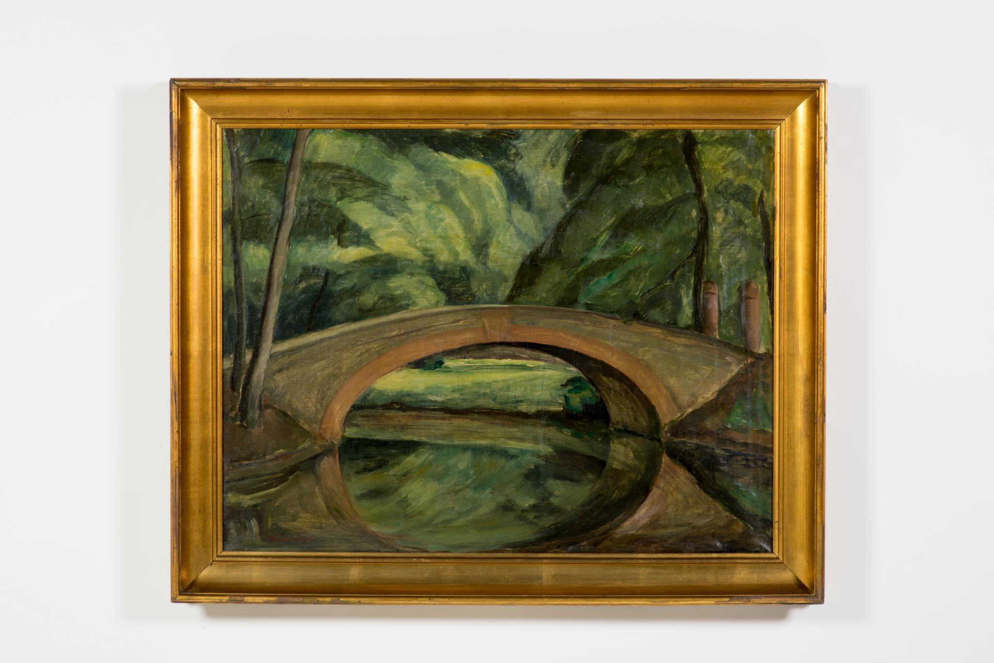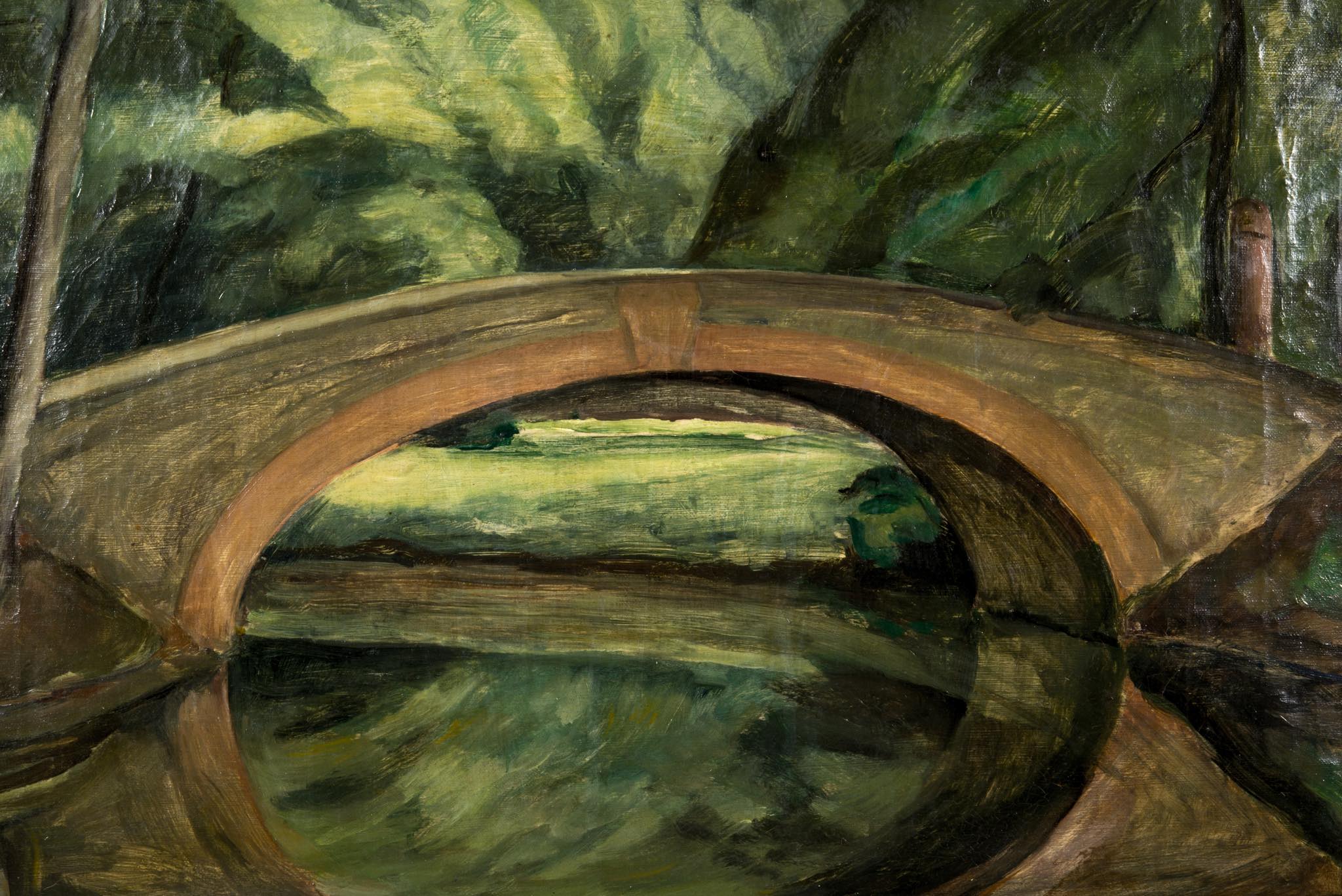 フィンランド出身の画家、William Lønnberg/ウィリアム・ロンベルクによって描かれた油彩作品です。コペンハーゲンにある公園で最も広大な緑地を有する公園、Frederiksberg Haveにある「橋」を描いた作品です。木々の茂る季節に描かれたものでしょう。どこか夢の中のような印象の作品です。フレームはオリジナルと思われ、金箔の剥落や古い傷などが見られます。壁付けの脚とキャンバスの押さえ金具、紐などを整えました。コンディションは良好です。