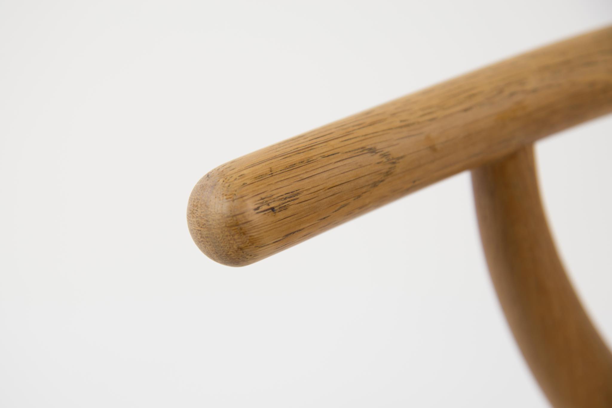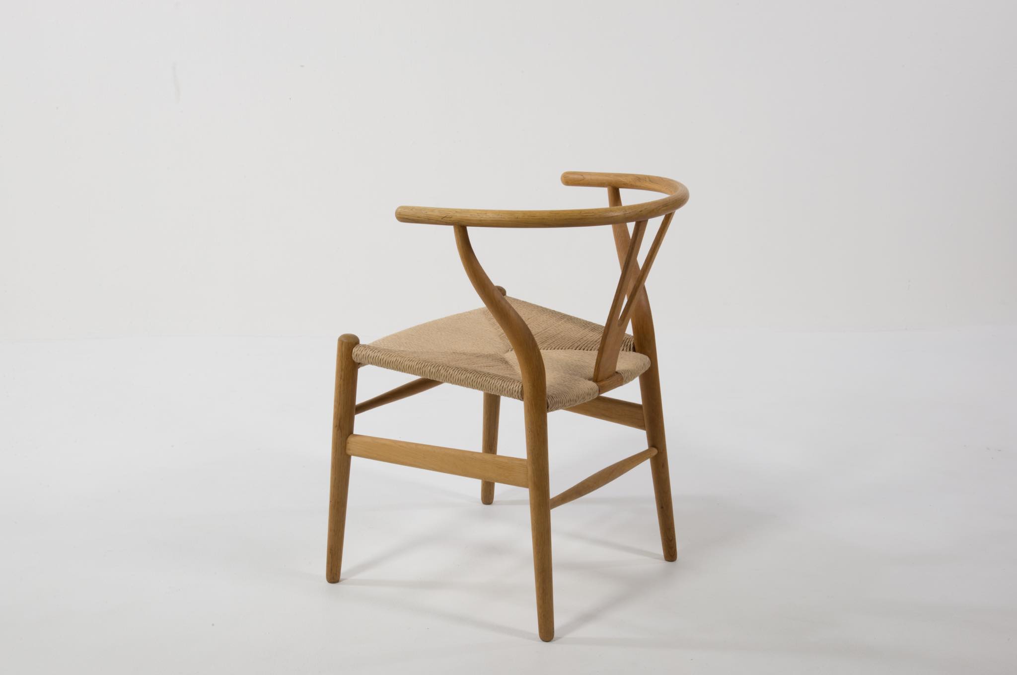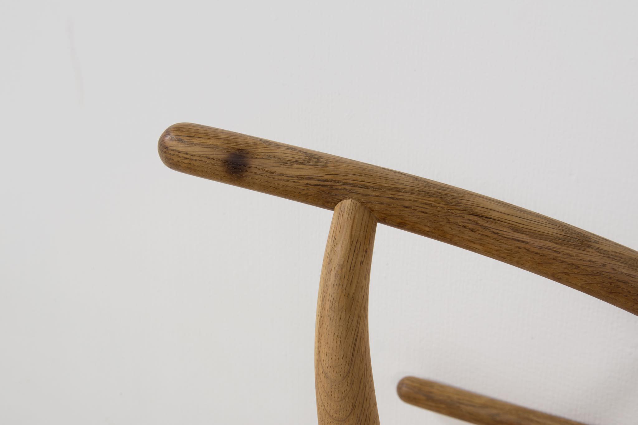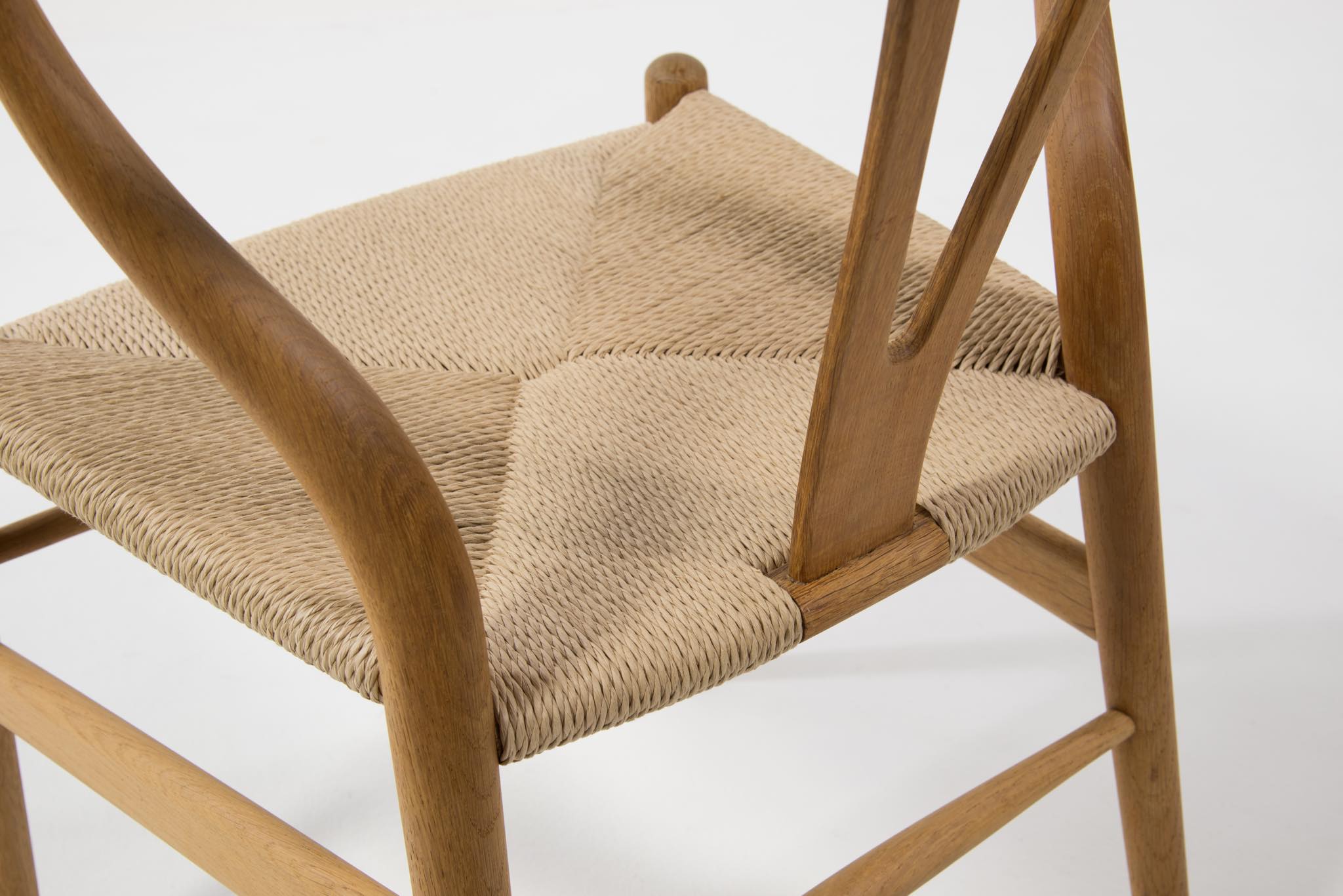 デンマークを代表するデザイナーの Hans J. Wegner/ハンス・ウェグナーによる名作椅子ウィッシュボーンチェアです。日本では”Yチェア”として長らく親しまれており、こちらはシートハイの低いタイプとなります。メーカーのラベルや焼印などは見られませんが、古い時代に作られたもののようで、天然木の木質が全面に現れています。フレームに表れたタンニン酸や経年の汚れは洗浄し、ソープにて整えました。ペーパーコードのシートも新たに張り替えました。うち一脚のアームの下側に蝋燭による焦げが見られますが、焦げ跡は痩せておらず、目立ちません。全体にとても綺麗な状態です。4脚セットでの販売となります。
