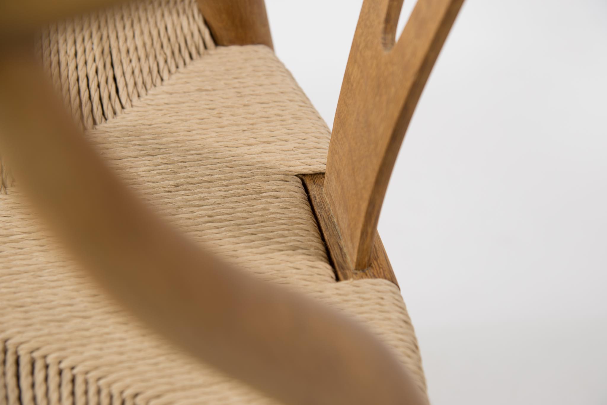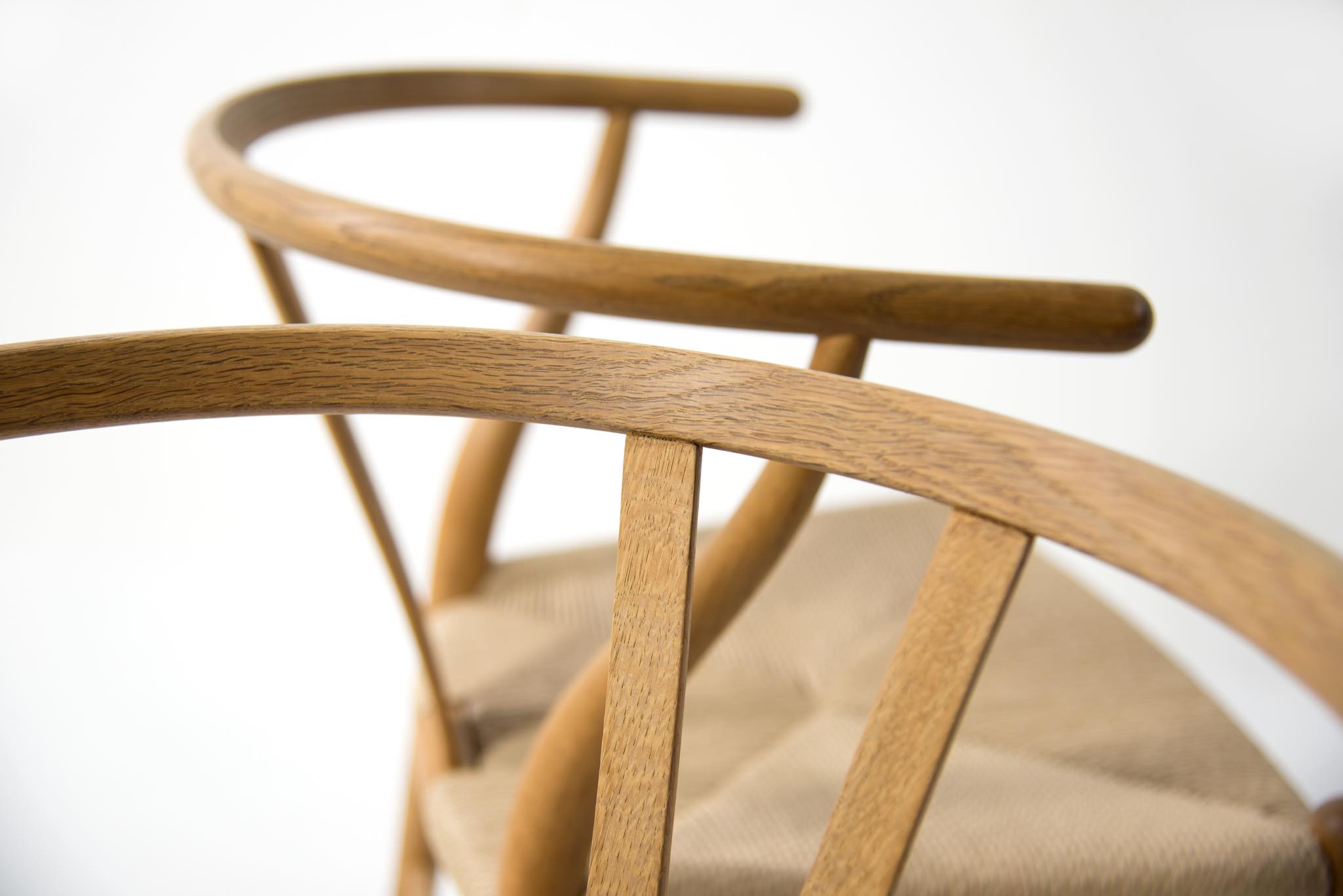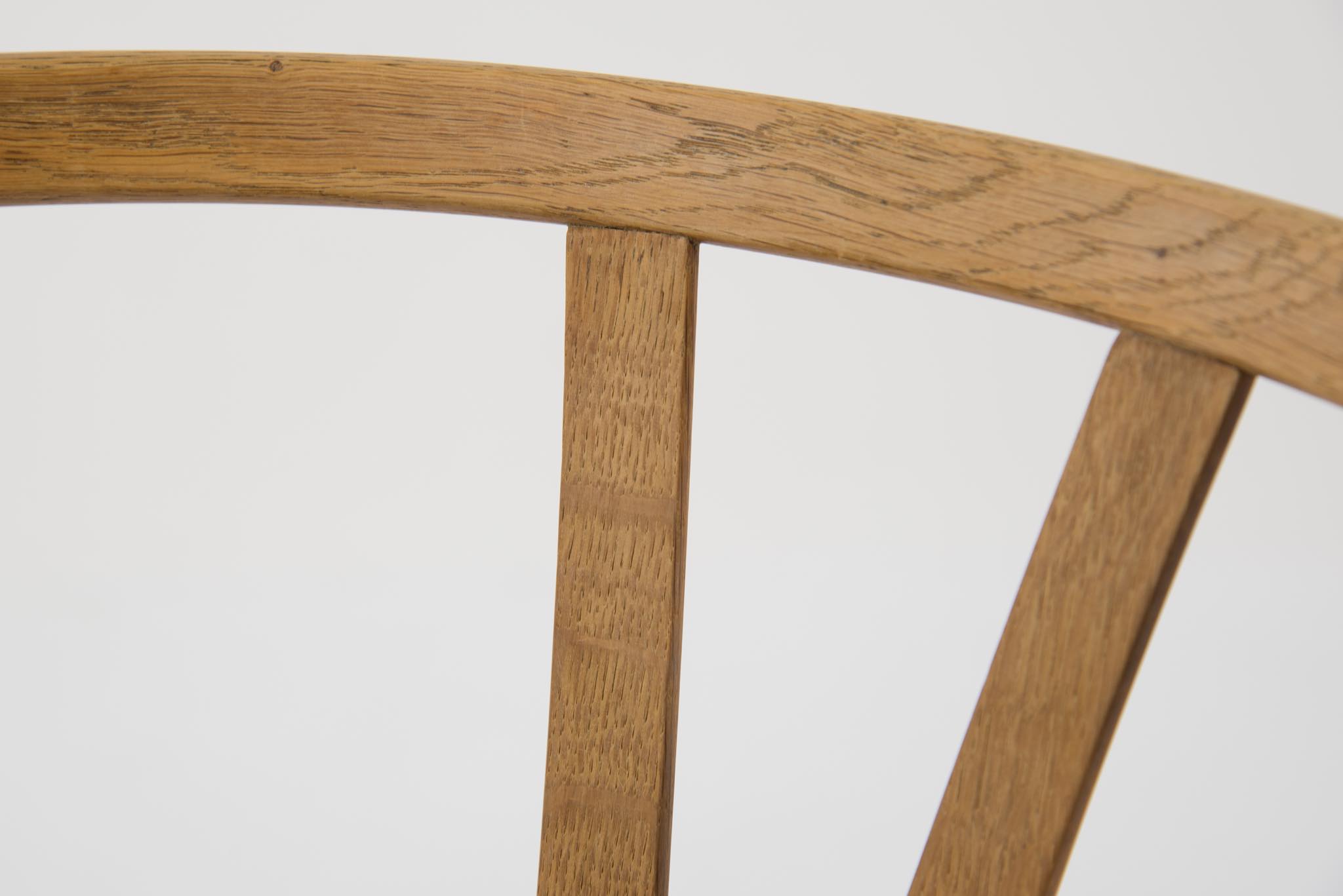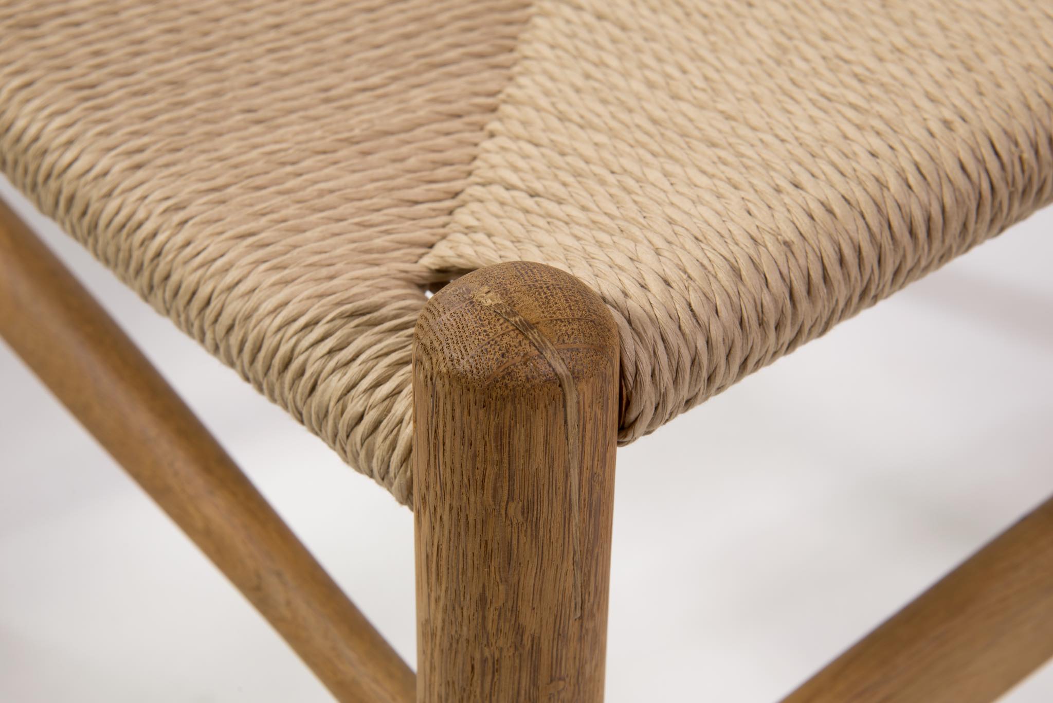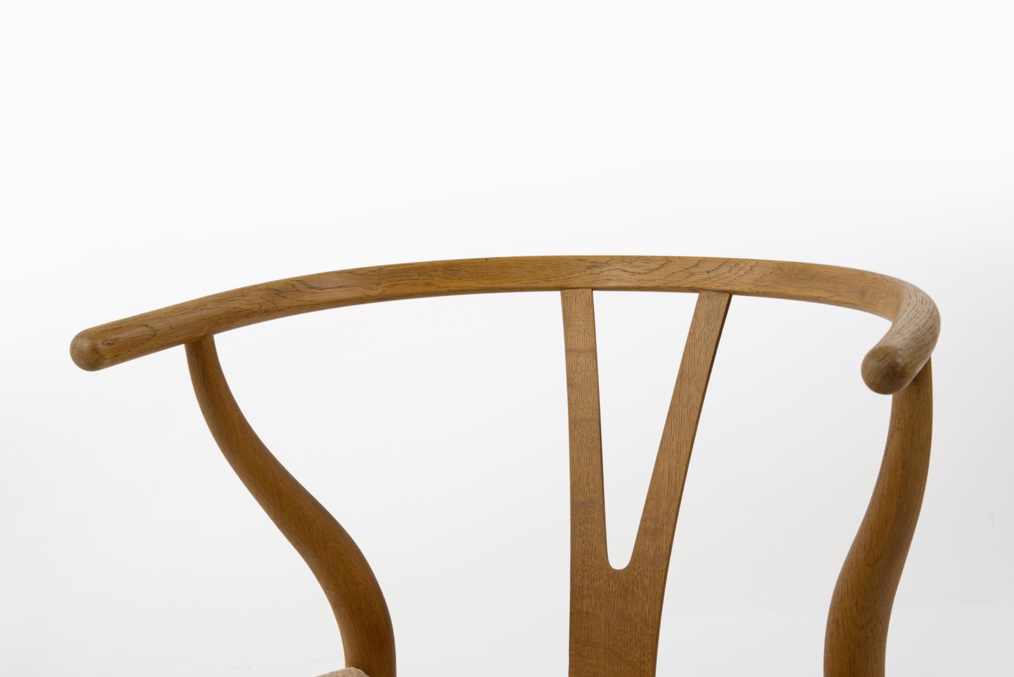 デンマークを代表するデザイナーの Hans J. Wegner/ハンス・ウェグナーによる名作椅子ウィッシュボーンチェアです。日本では”Yチェア”として長らく親しまれており、こちらはシートハイの低いタイプとなります。メーカーのラベルや焼印などは見られませんが、古い時代に作られたもののようで、天然木の木質が全面に現れています。フレームに表れたタンニン酸や経年の汚れは洗浄し、ソープにて整えました。ペーパーコードのシートも新たに張り替えました。うち一脚のアームの下側に蝋燭による焦げが見られますが、焦げ跡は痩せておらず、目立ちません。全体にとても綺麗な状態です。4脚セットでの販売となります。