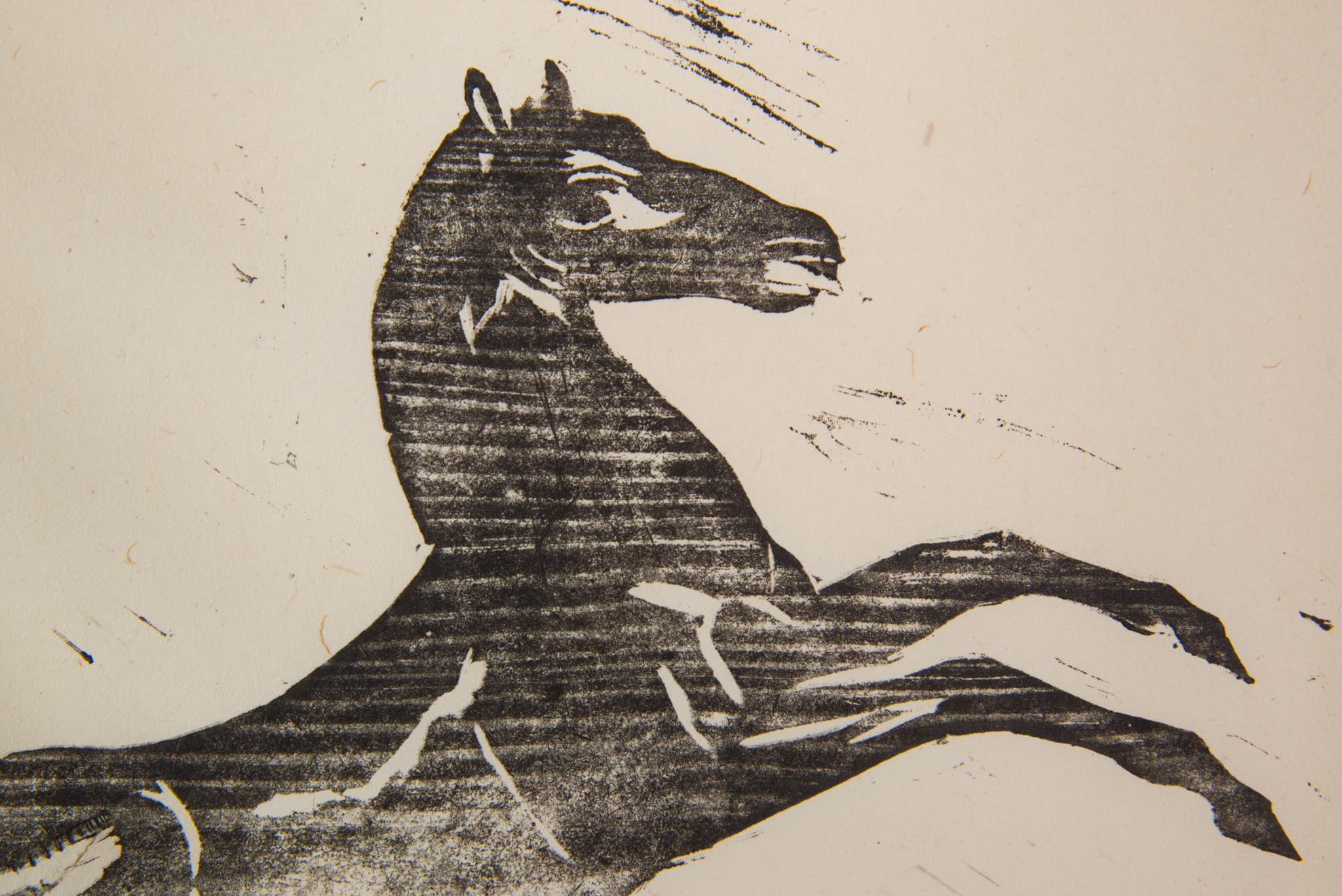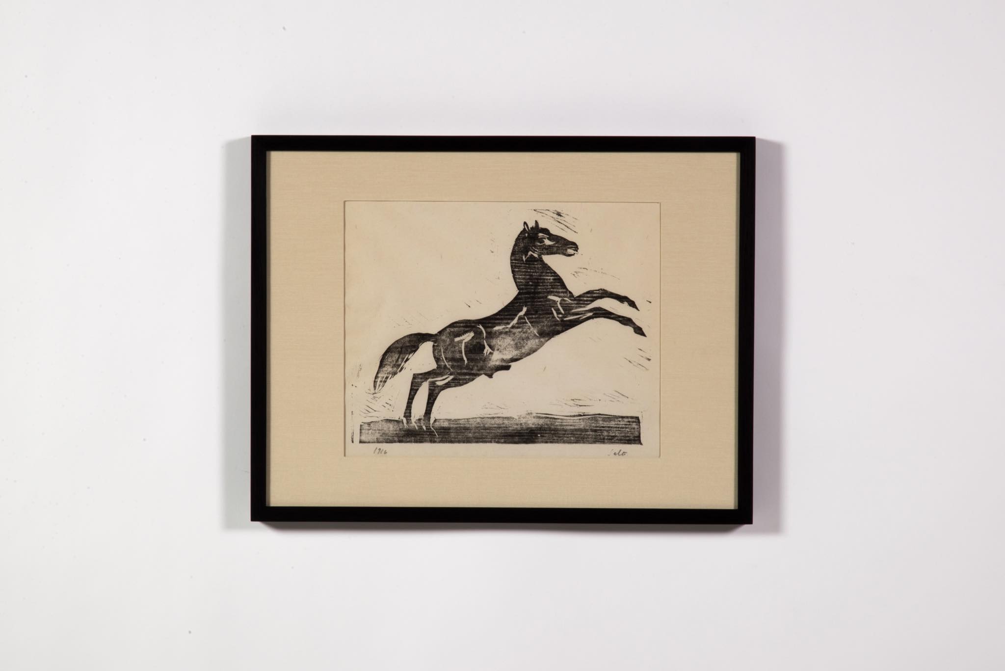 デンマークを代表する芸術家、Axel Salto/アクセル・サルトによる木版画作品です。1916年に擦られた作品で、勢いよく跳ねる馬が描かれています。サルトの作品としては初期の頃にあたり、工業デザイナー兼グラフィックデザイナーの Knud V. Engelhardt/クヌート・V・エンゲルハルトと共同で出版した作品集の一部ではないかと思われます。額装とマットは新たに設えました。