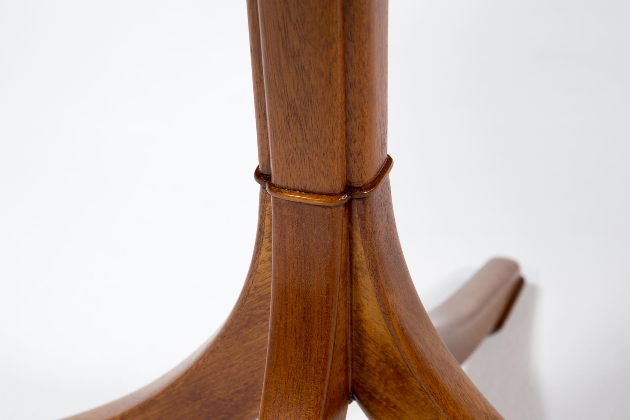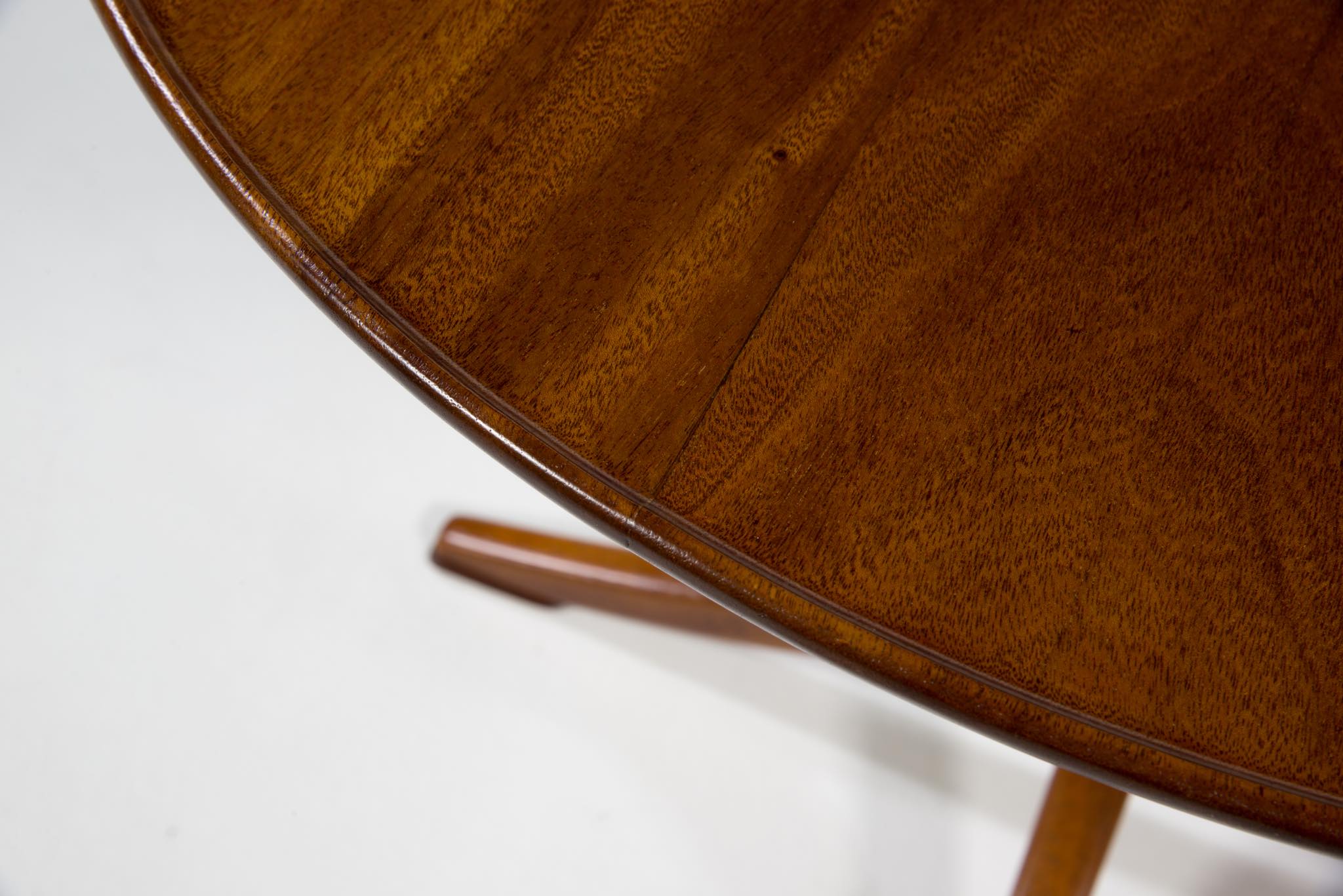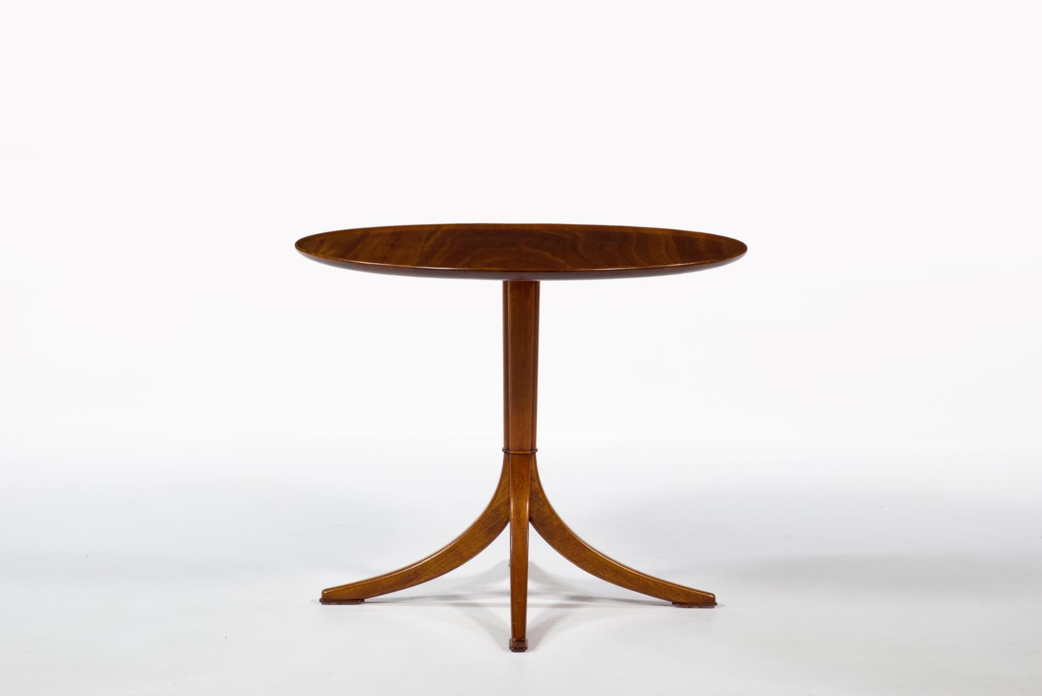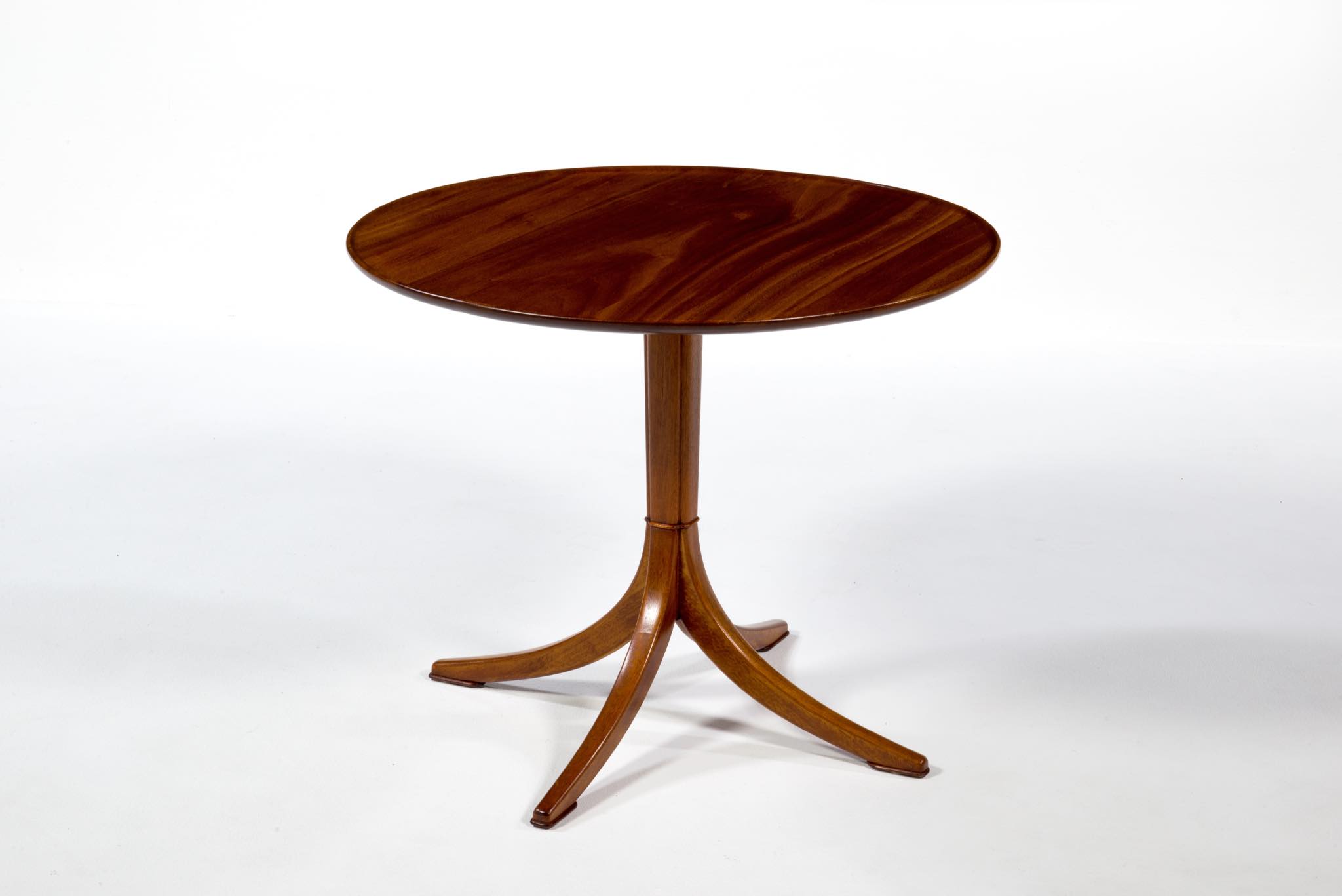 20世紀に於けるデンマーク家具デザインの礎を築いたデザイナー兼キャビネットメーカーの Frits Henningsen/フリッツ・ヘニングセンによる小振りなラウンドテーブルです。1930~40年代に作られたものでしょう。クラシックで優美なデザインが特徴的で、天板には無垢のマホガニー材が集成されています。天板は無垢材故の小さな割れが生じていたため補修しております。(末尾画像参照)全体に研磨し、塗装にて仕上げおり、とても綺麗な状態です。