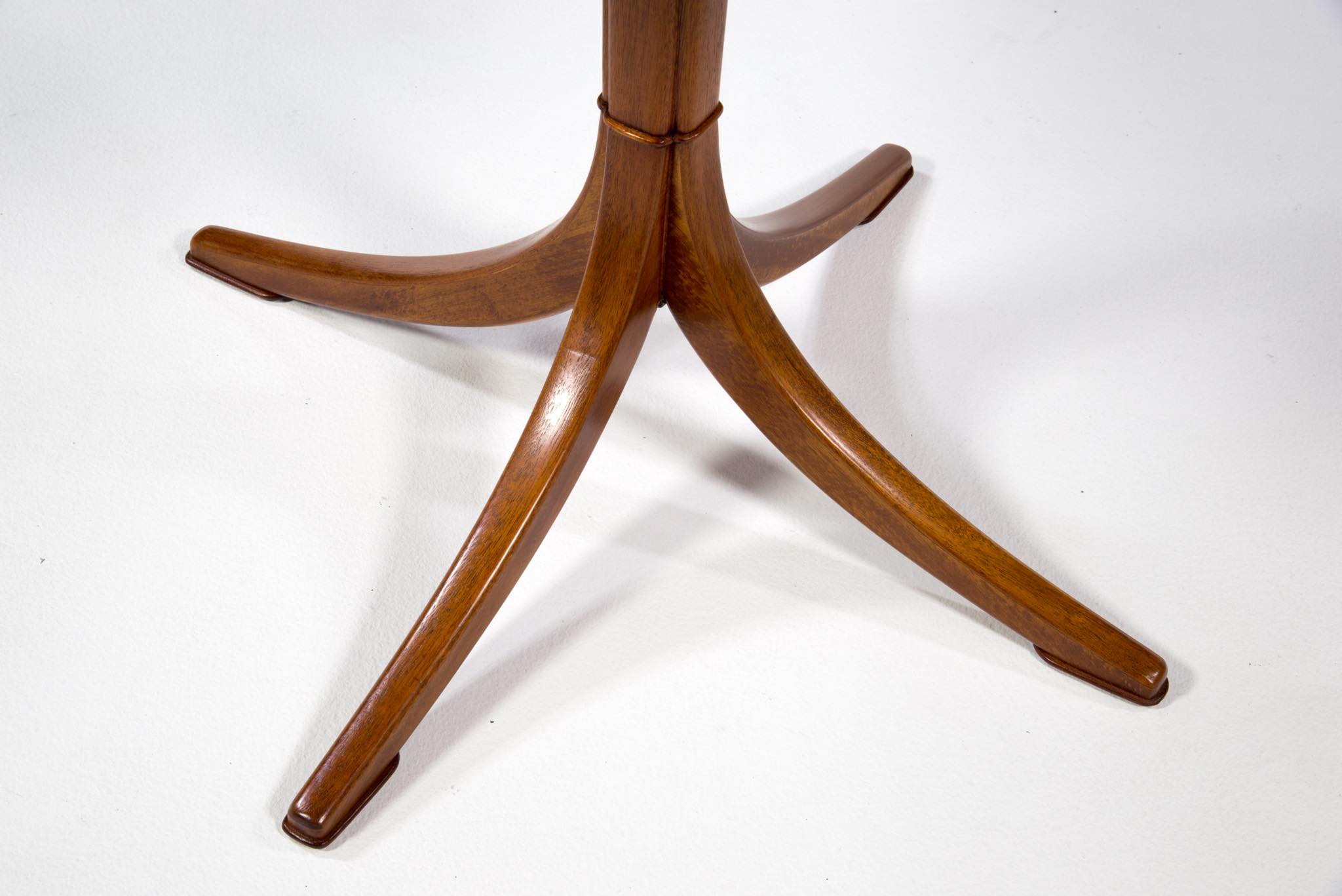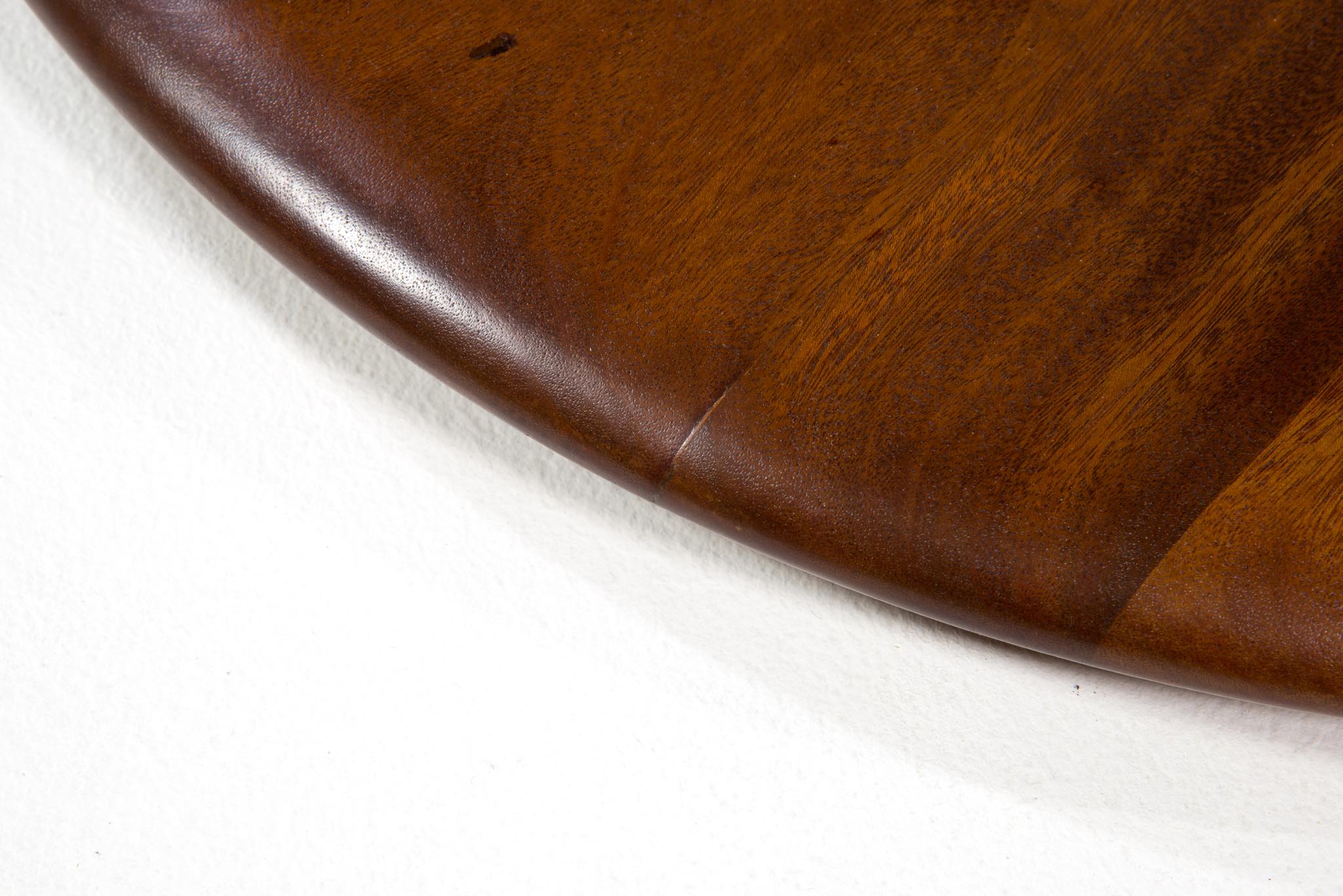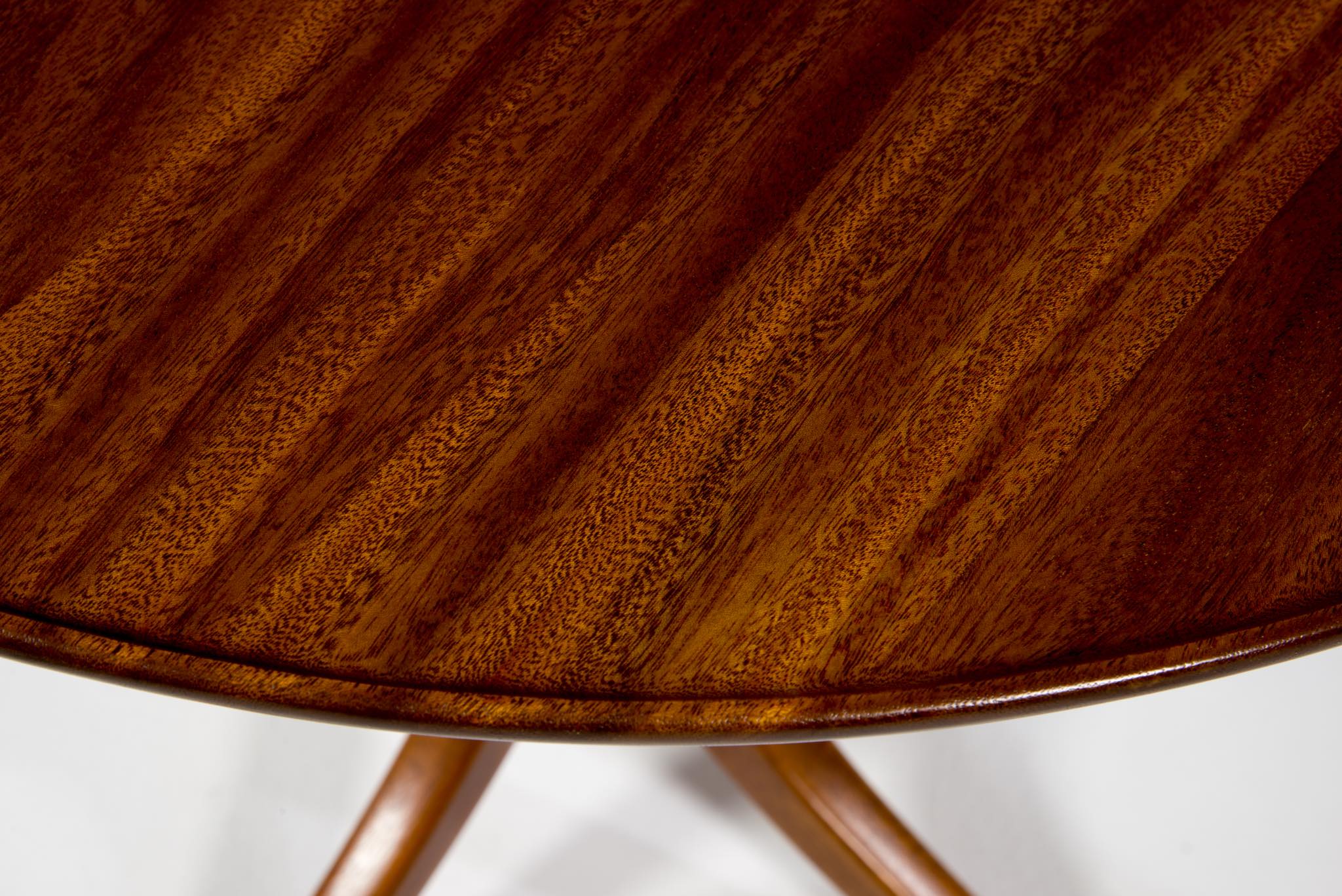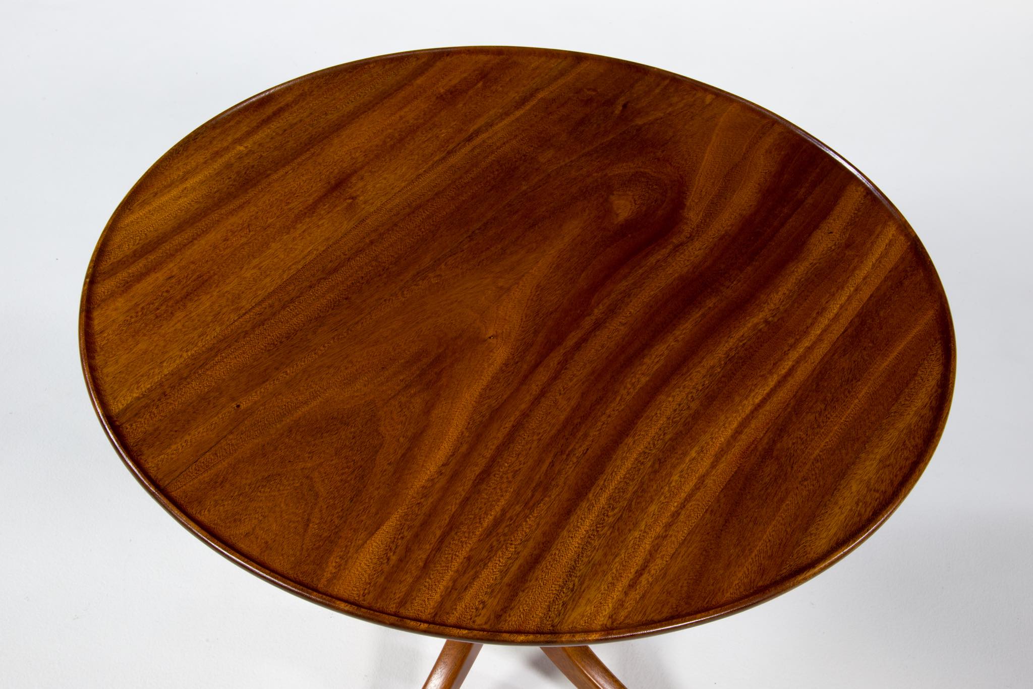20世紀に於けるデンマーク家具デザインの礎を築いたデザイナー兼キャビネットメーカーの Frits Henningsen/フリッツ・ヘニングセンによる小振りなラウンドテーブルです。1930~40年代に作られたものでしょう。クラシックで優美なデザインが特徴的で、天板には無垢のマホガニー材が集成されています。天板は無垢材故の小さな割れが生じていたため補修しております。(末尾画像参照)全体に研磨し、塗装にて仕上げおり、とても綺麗な状態です。