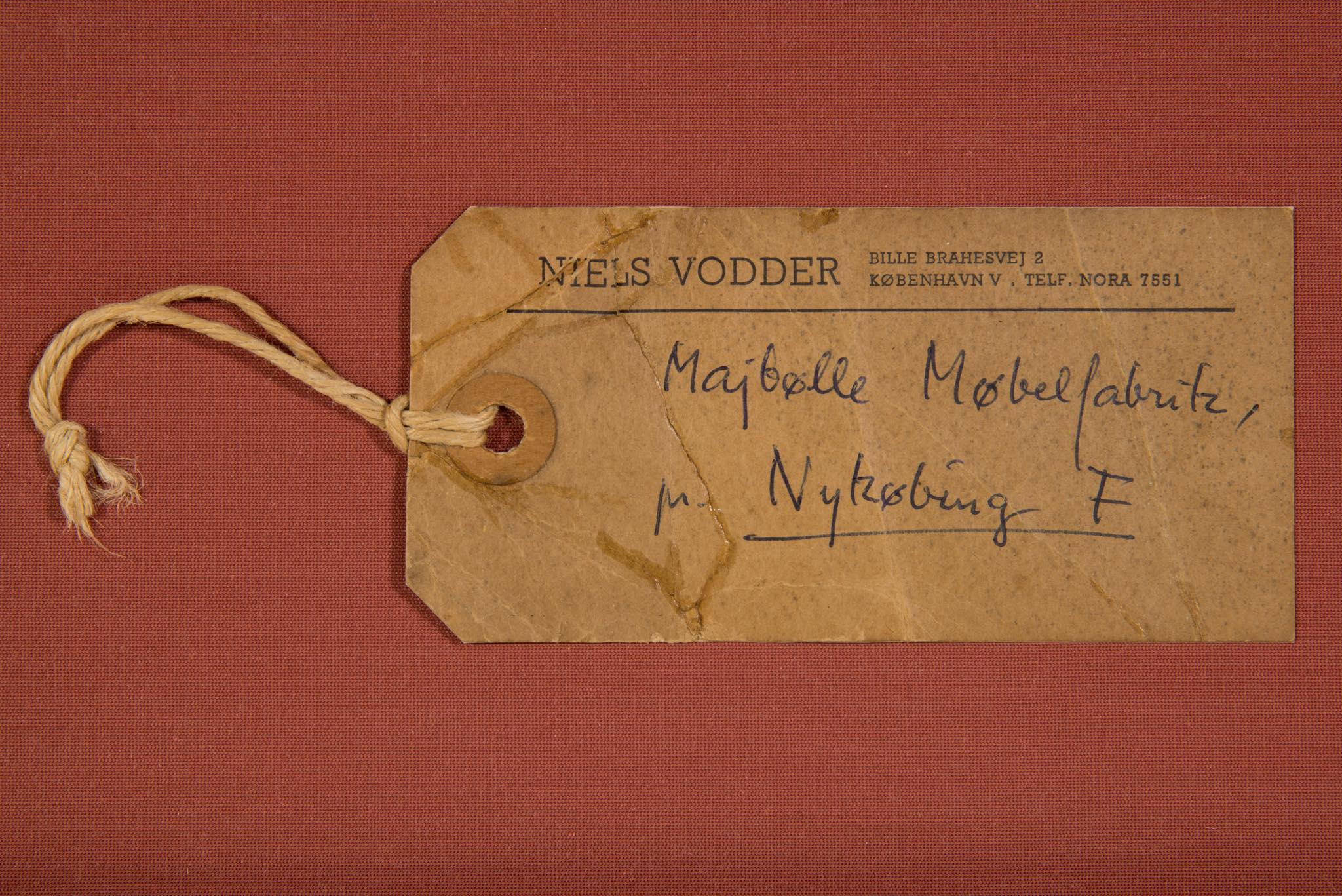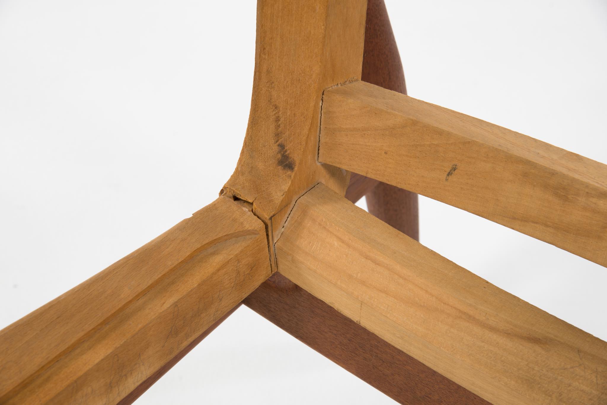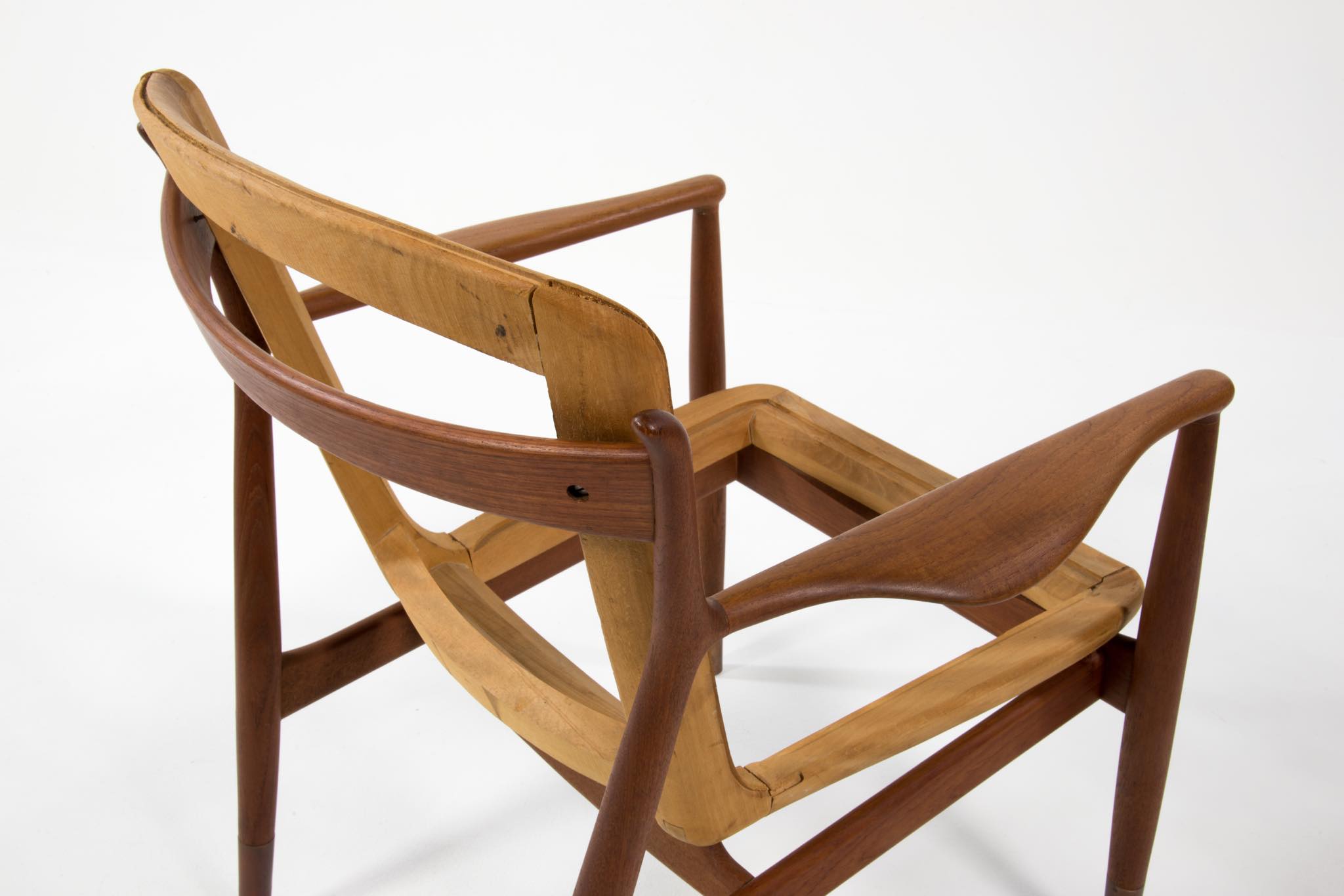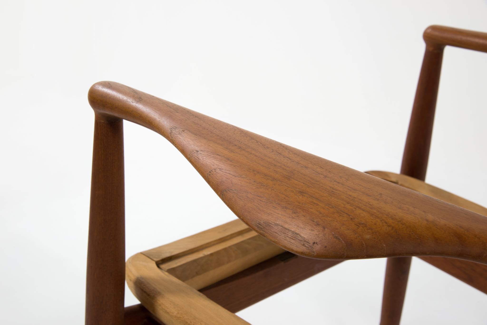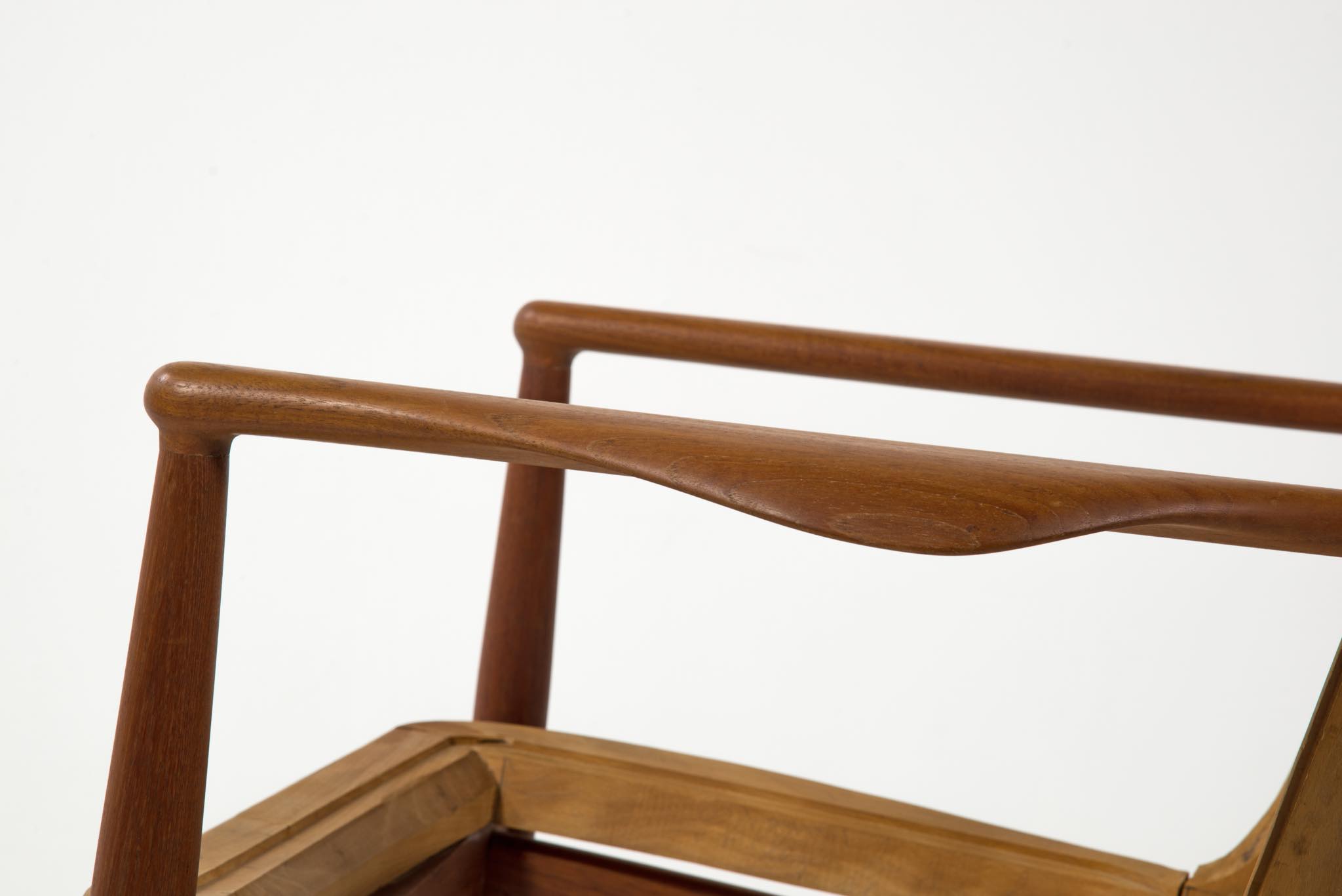 デンマークを代表する家具デザイナーのFinn Juhl/フィン・ユールによるNV51 "デリゲート" アームチェア、デッドストック品です。1951年のエキシビジョンにて発表、フィン・ユールが内装を手掛けた国連ビルの信託統治理事会会議場の理事のための椅子として採用され、実際の国連ビルへは米国ベーカー社がライセンス生産を行い納入されました。こちらはフィン・ユールの初期のデザインを具現化し多くの代表作を手がけたデンマークのニールス・ヴォッダー工房による製作品で、2000年代にフィン・ユールの親族より、まだ製品化されていない、いわゆる「デッドストック」の状態で世に出されたものです。フレームはチーク材、シートを張る骨格にはビーチ材が用いられています。この個体に付属していたとされる紙製のタグと、同親族がこの椅子とともに保管されていた原寸大の図面が付属します。タグと図面はそれぞれ額装しています。皮革やファブリックの張込み(別費用)のご相談も承ります。