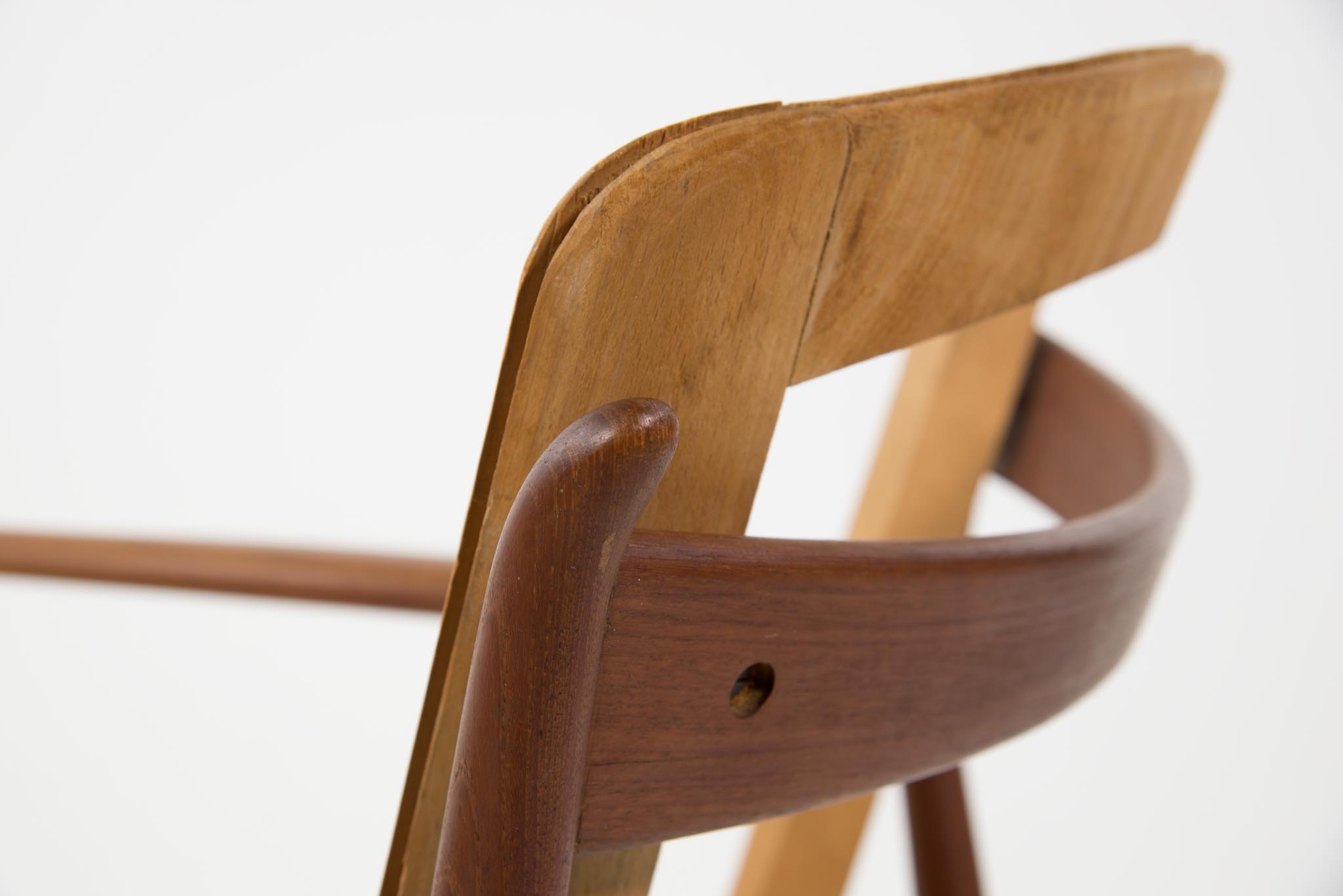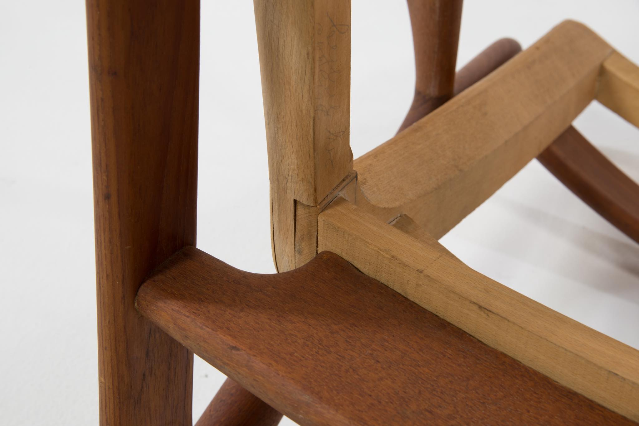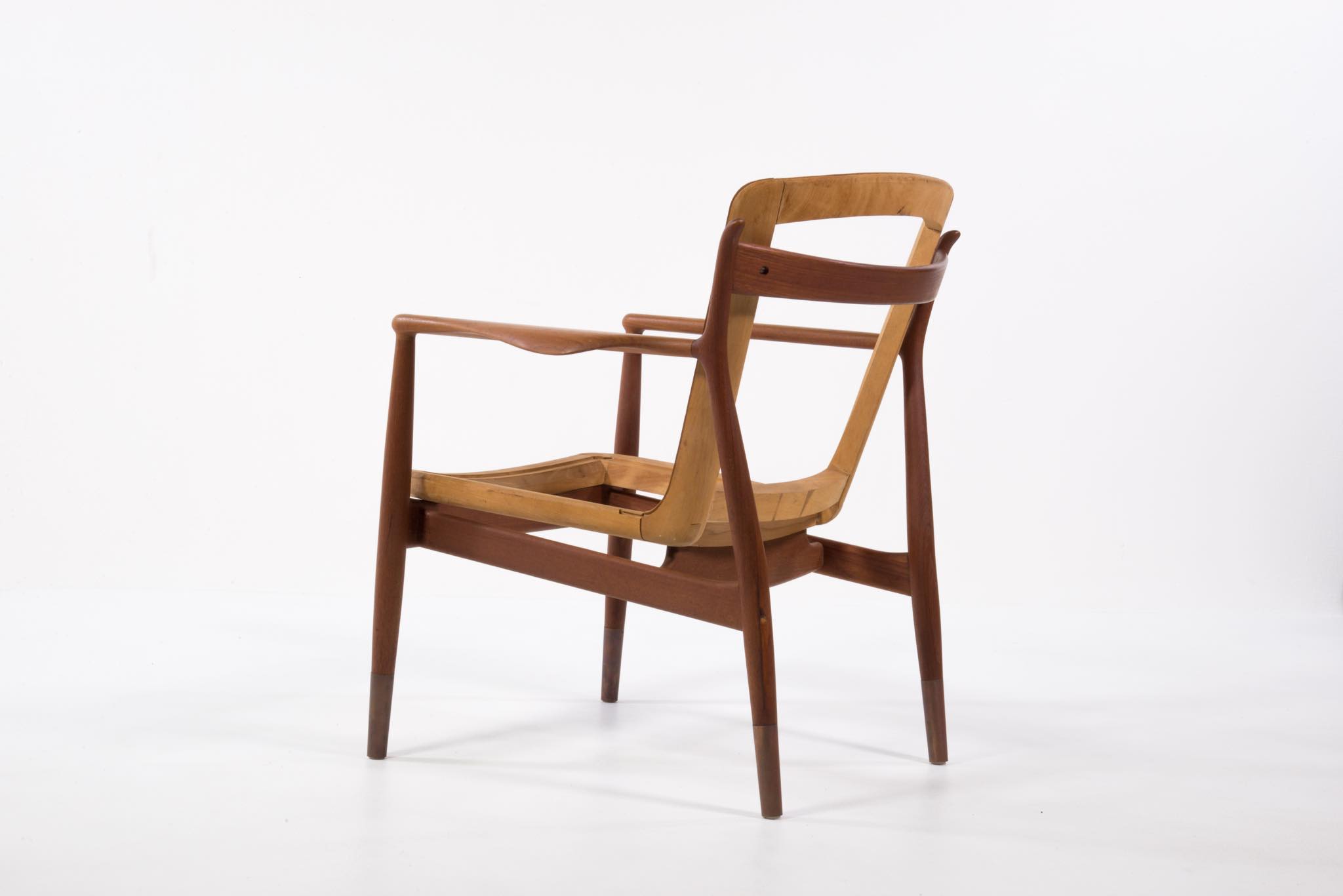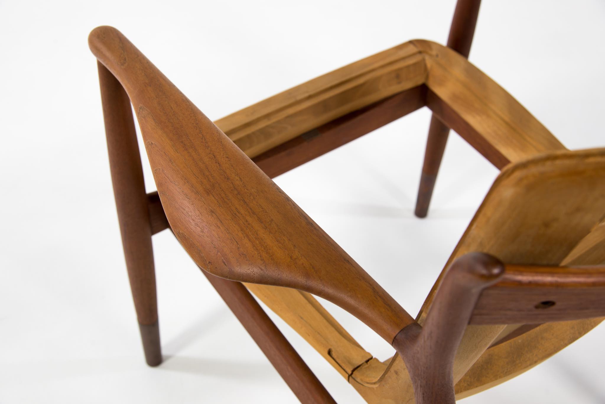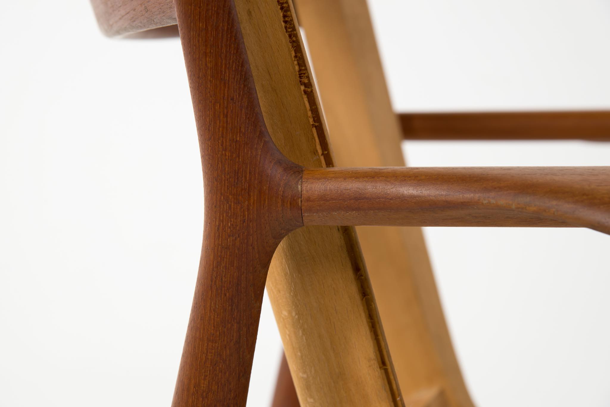 デンマークを代表する家具デザイナーのFinn Juhl/フィン・ユールによるNV51 "デリゲート" アームチェア、デッドストック品です。1951年のエキシビジョンにて発表、フィン・ユールが内装を手掛けた国連ビルの信託統治理事会会議場の理事のための椅子として採用され、実際の国連ビルへは米国ベーカー社がライセンス生産を行い納入されました。こちらはフィン・ユールの初期のデザインを具現化し多くの代表作を手がけたデンマークのニールス・ヴォッダー工房による製作品で、2000年代にフィン・ユールの親族より、まだ製品化されていない、いわゆる「デッドストック」の状態で世に出されたものです。フレームはチーク材、シートを張る骨格にはビーチ材が用いられています。この個体に付属していたとされる紙製のタグと、同親族がこの椅子とともに保管されていた原寸大の図面が付属します。タグと図面はそれぞれ額装しています。皮革やファブリックの張込み(別費用)のご相談も承ります。