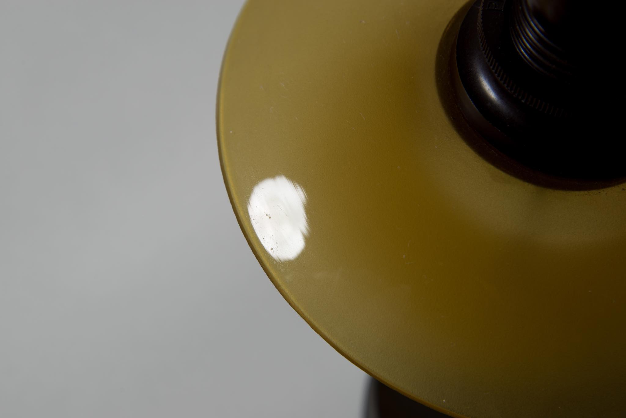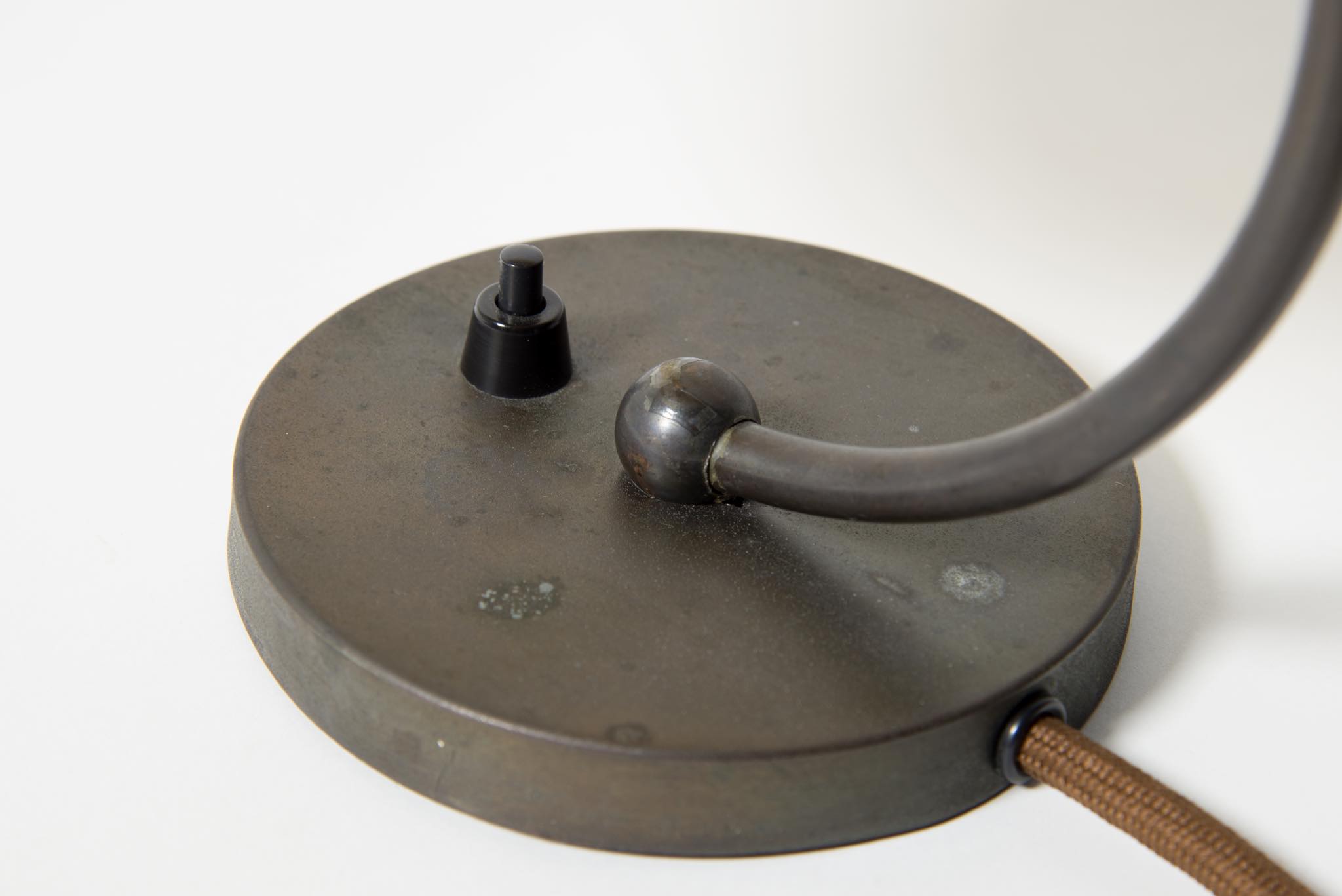 Poul Henningsen/ポール・ヘニングセンによるデザイン、Louis Poulsen/ルイス・ポールセン社による ”ベッドサイド” テーブルランプ、1930年代の製作品です。シェードはアンバーグラス、フレームはブロンズ製、ソケットホルダーはベークライト製のオリジナルコンディションです。シェードの一部にごくわずかなチップが見られますが、とてもきれいな状態です。配線は新たに交換済みです。