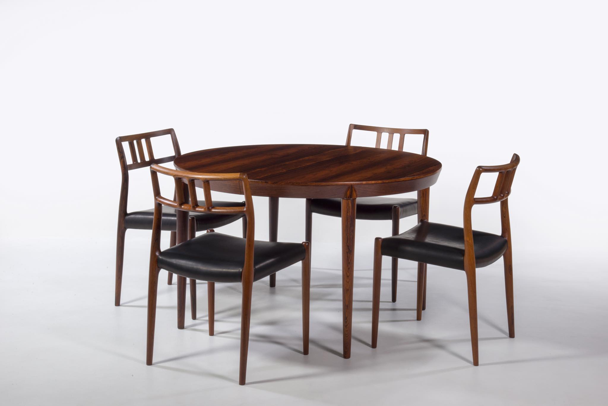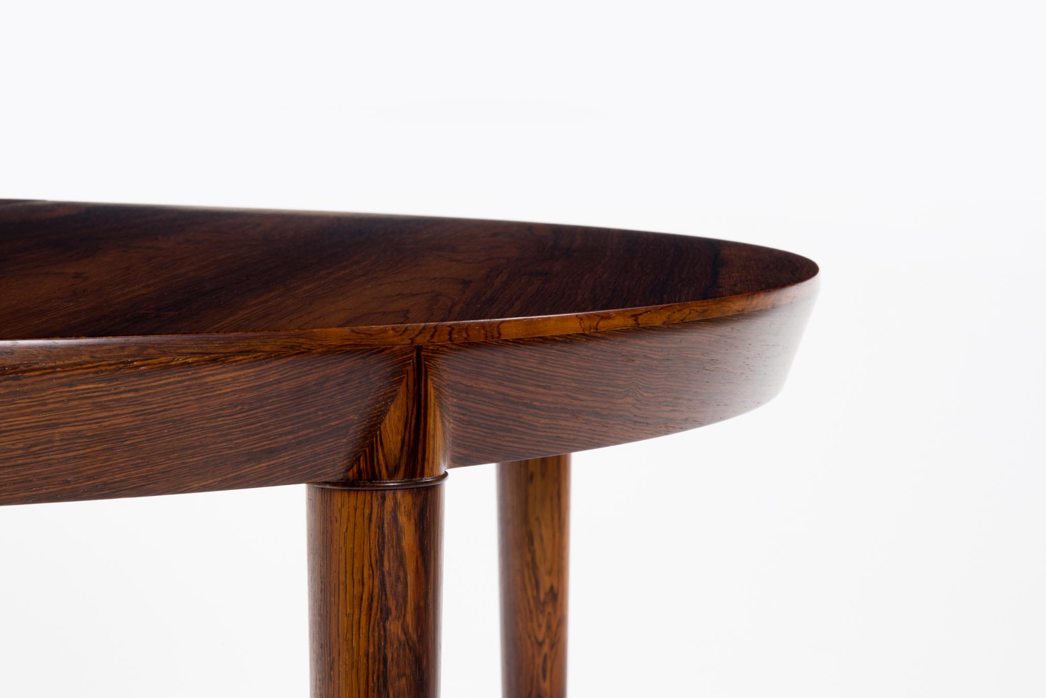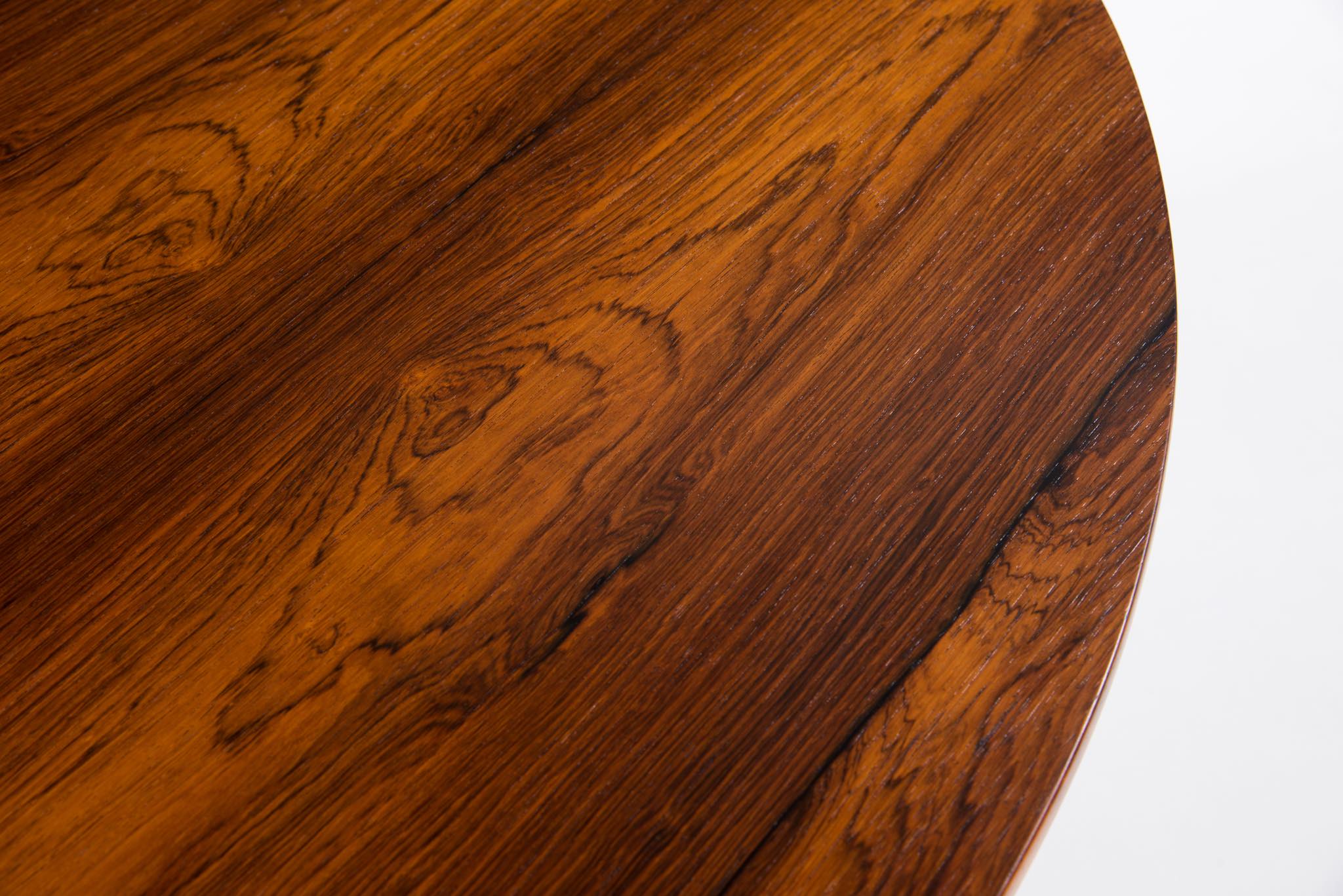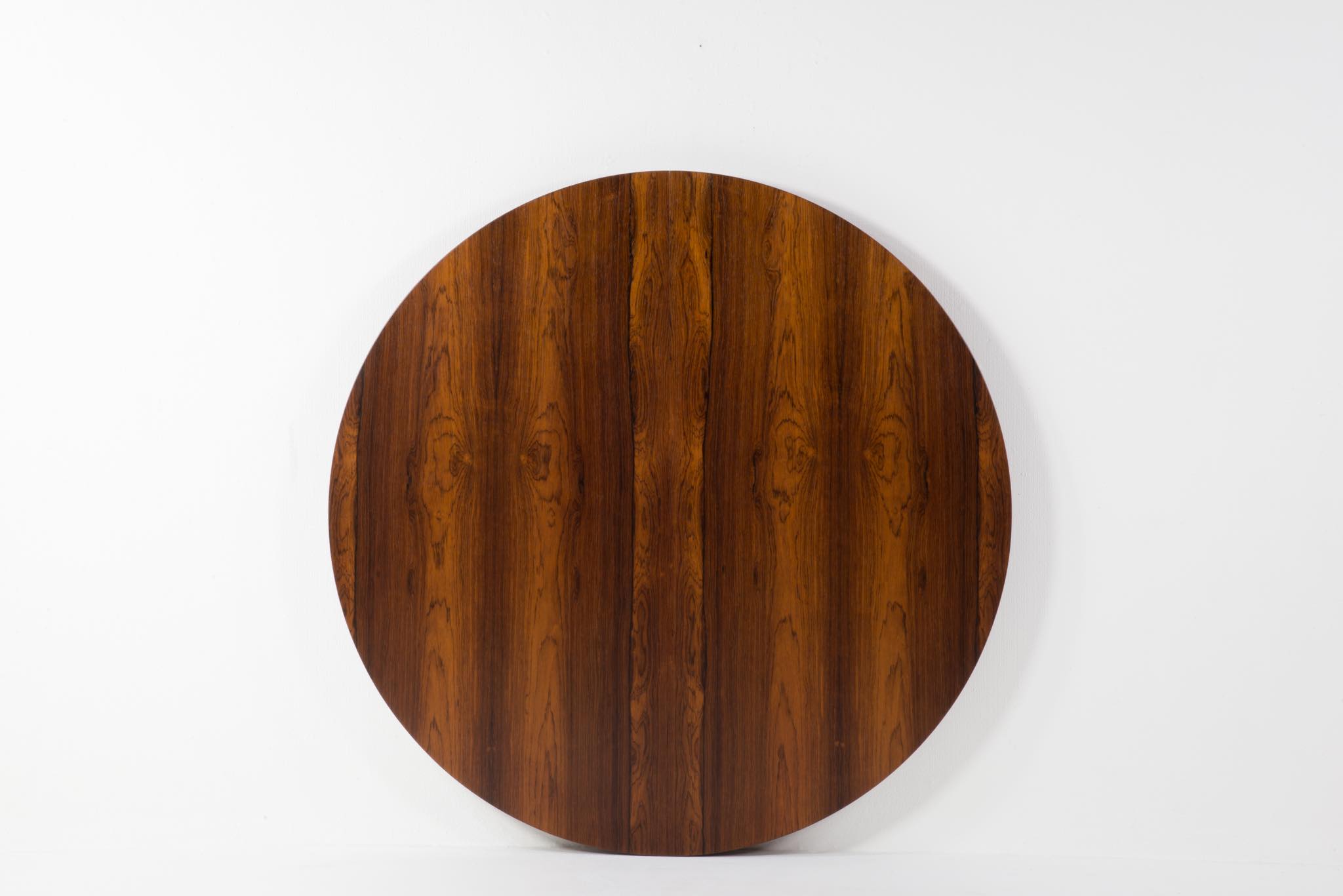 デンマークの家具デザイナー、Erik Riisager Hansen/エリック・リサガー・ハンセンによるダイニングテーブルです。素材はブラジル原産と思しきローズウッド材が用いられており、天板と脚との接合に工芸的な特徴のあるモデルで、凛とした佇まいに定評があります。こちら、全体のコンディションは良好で、天板に現れたローズウッドの杢目もとても良いのですが、エクステンションリーフが付属しておらず、天板面積の拡張を行う事ができません。正円形のみでのご使用に限定されます。