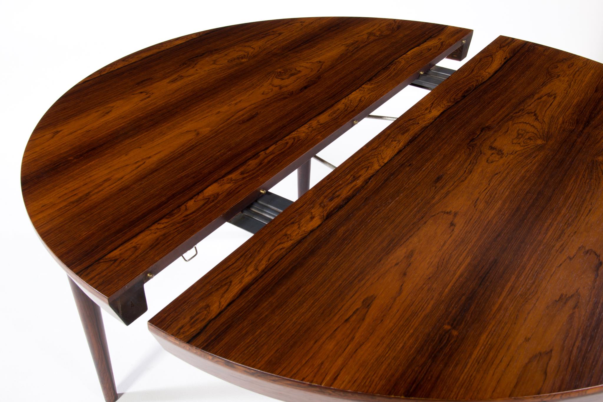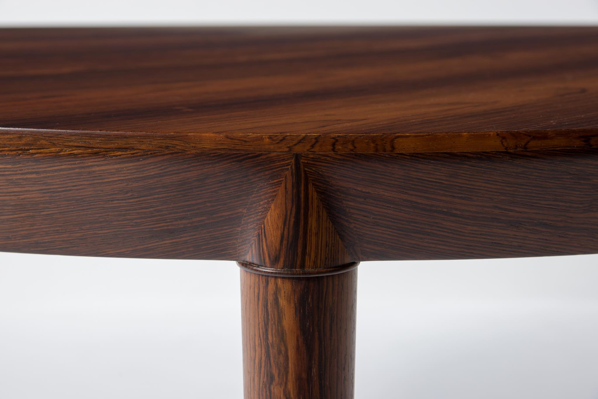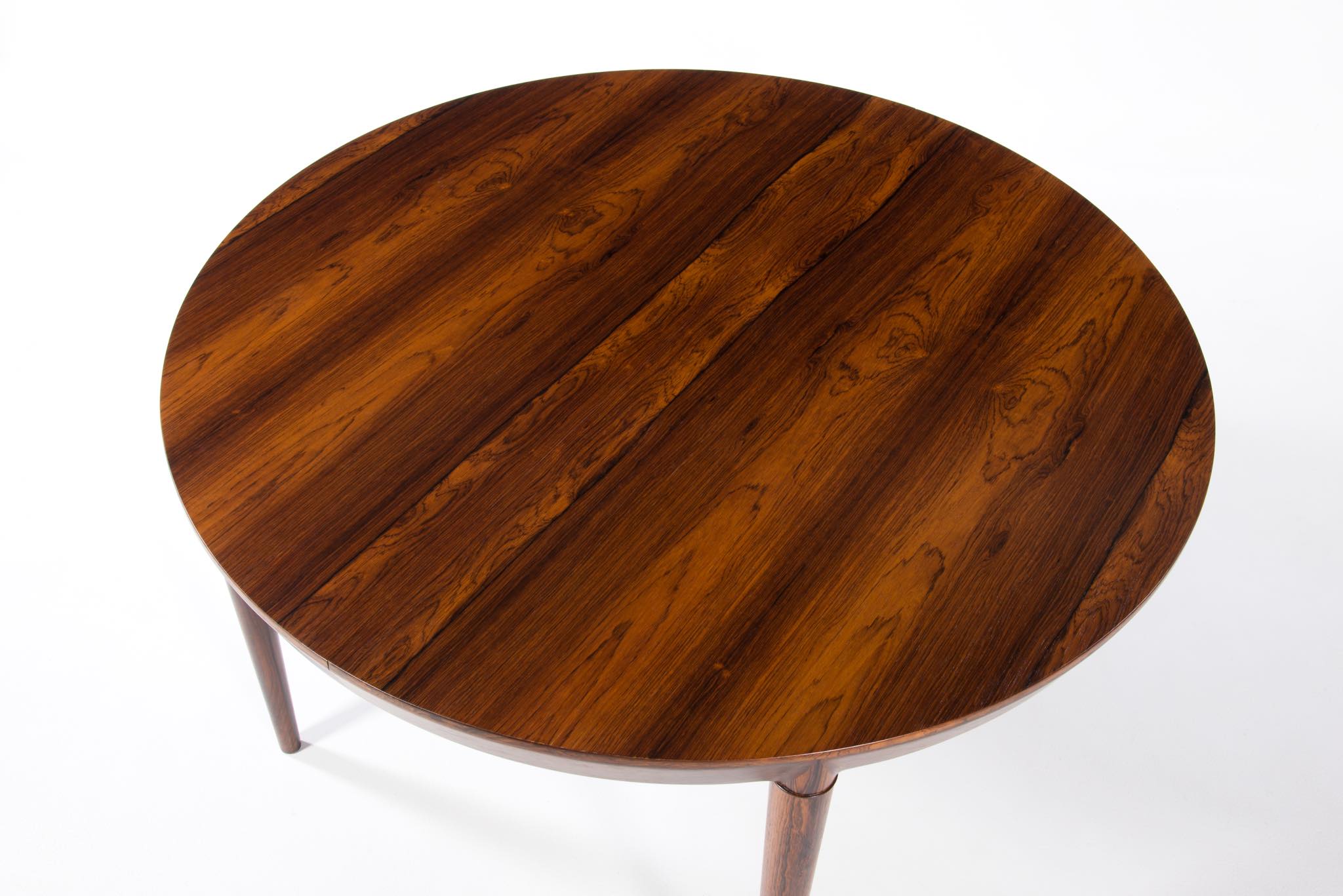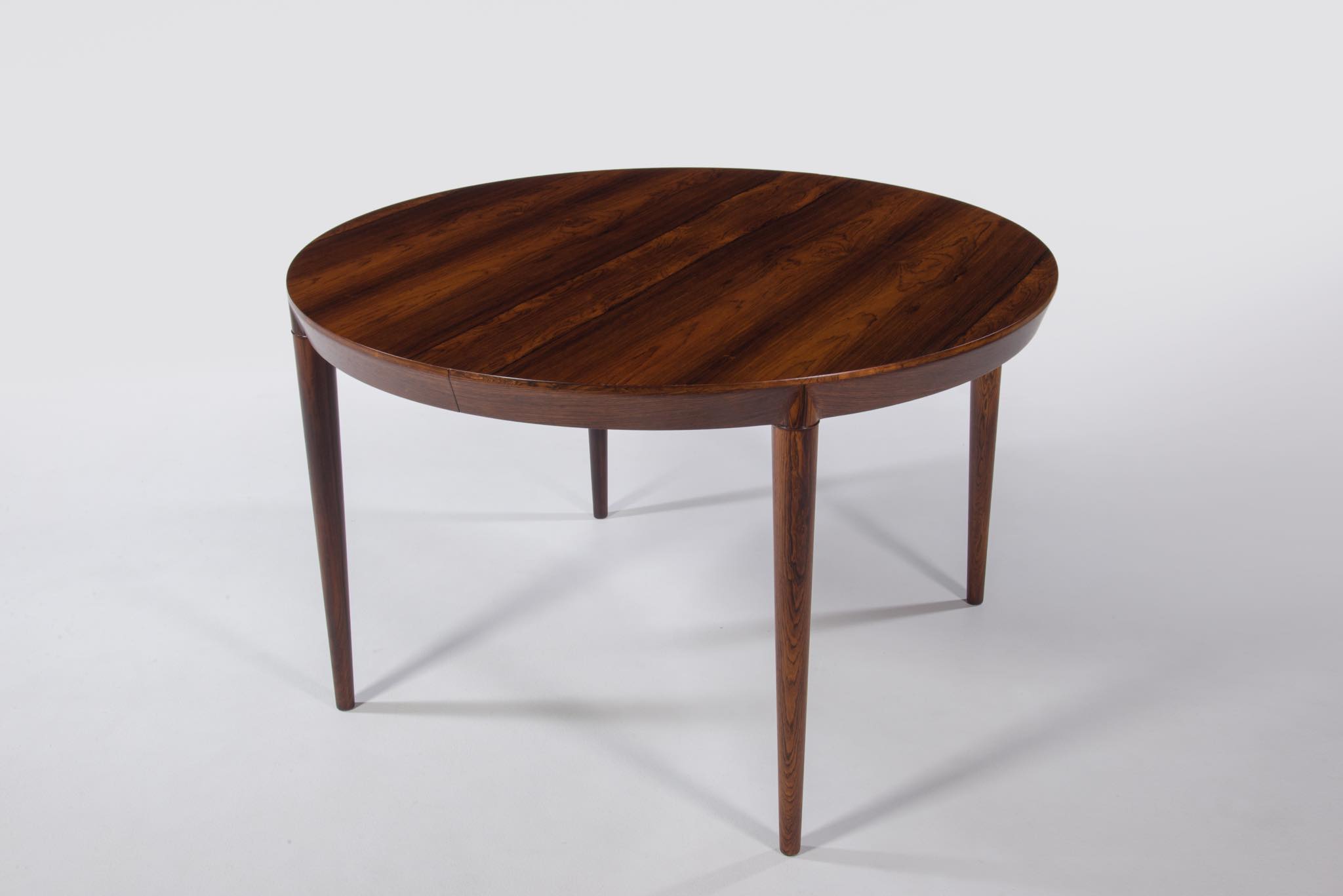 デンマークの家具デザイナー、Erik Riisager Hansen/エリック・リサガー・ハンセンによるダイニングテーブルです。素材はブラジル原産と思しきローズウッド材が用いられており、天板と脚との接合に工芸的な特徴のあるモデルで、凛とした佇まいに定評があります。こちら、全体のコンディションは良好で、天板に現れたローズウッドの杢目もとても良いのですが、エクステンションリーフが付属しておらず、天板面積の拡張を行う事ができません。正円形のみでのご使用に限定されます。
