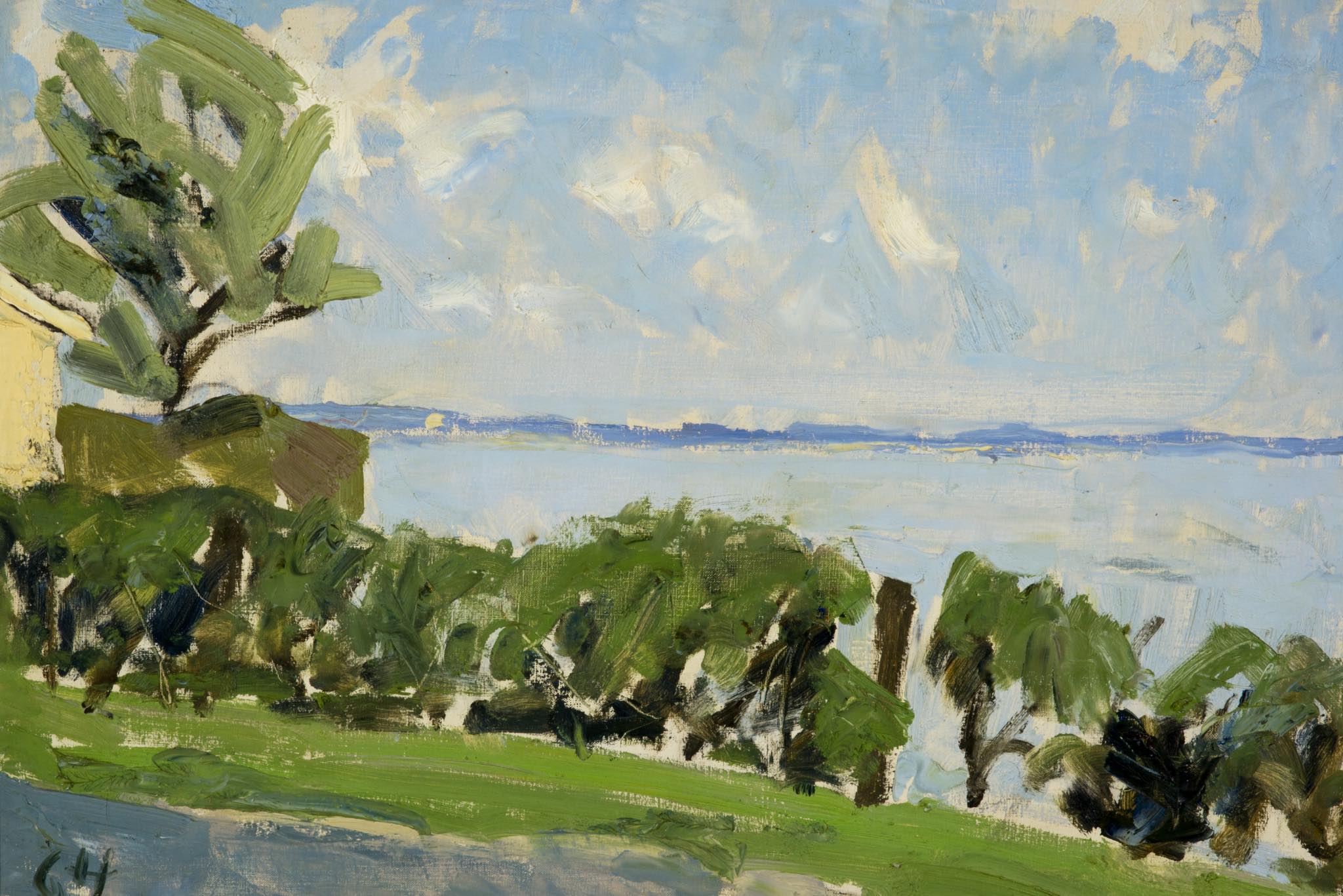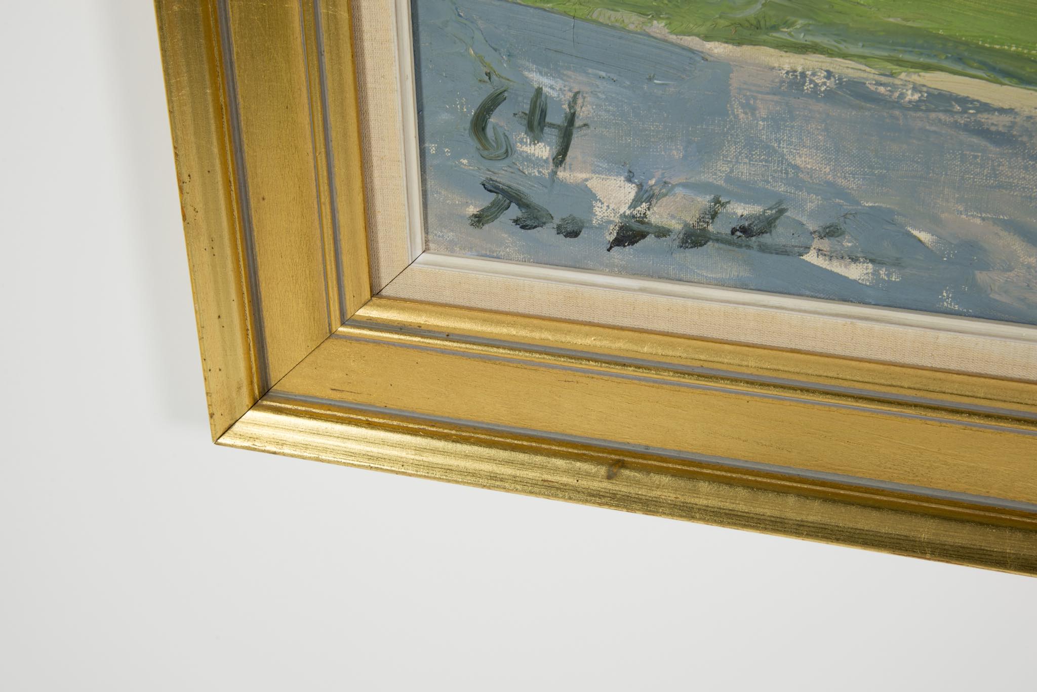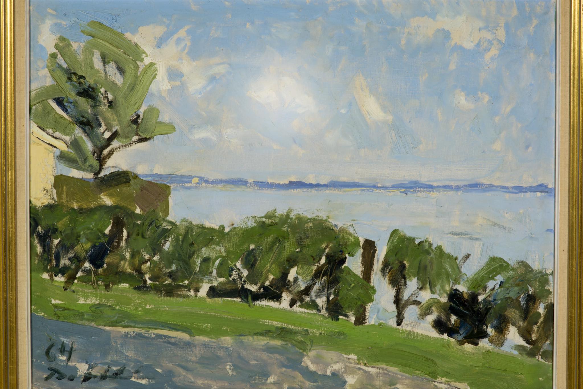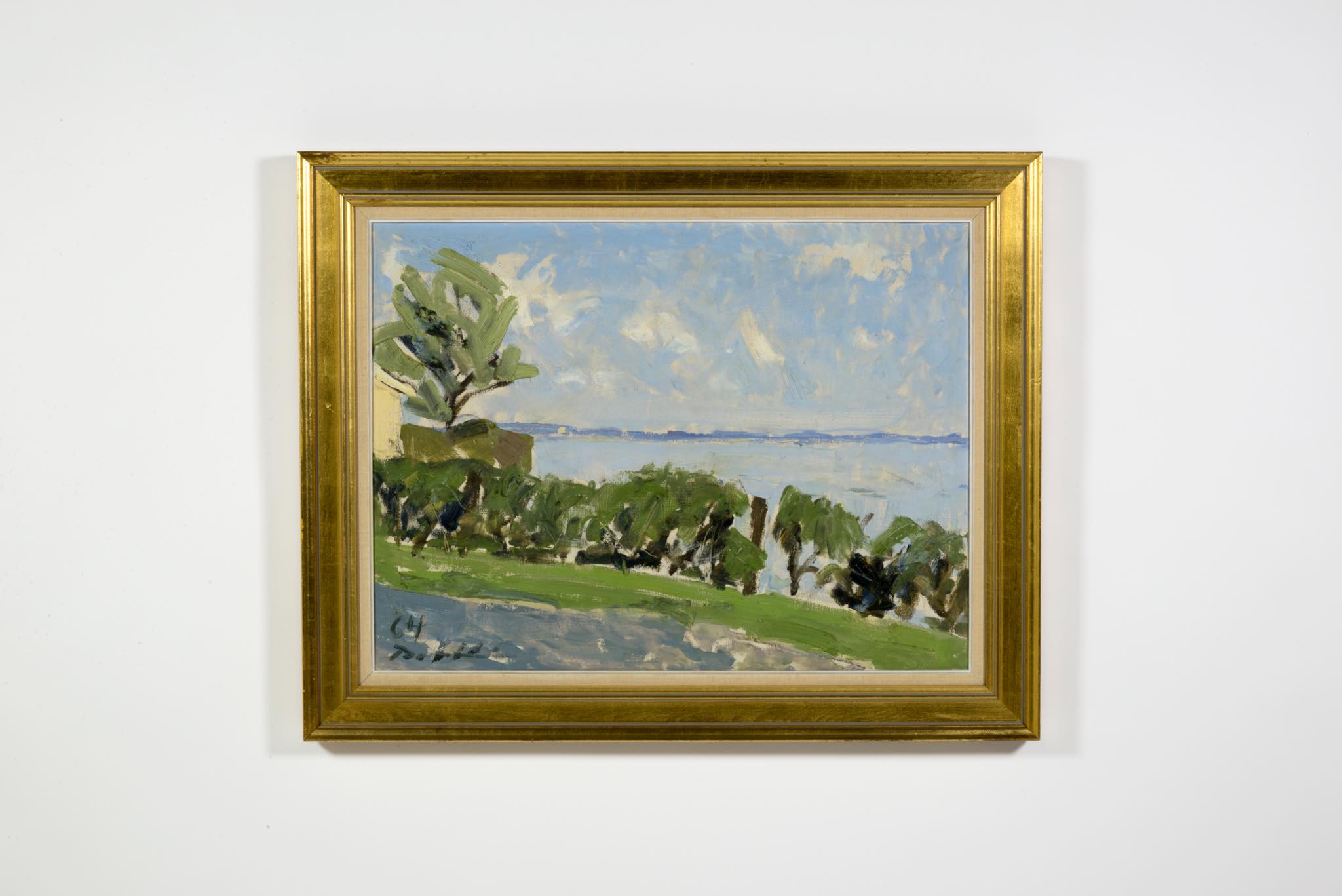 デンマークの画家、Børge Bokkenheuser/ボーエ・ボッケンホイザーによる風景画作品です。1964年の爽やかな季節に描かれたもので、遠く広がる入江の様子が独特の筆致で描かれています。オリジナルのフレームはそのままに、背面の始末を整えました。