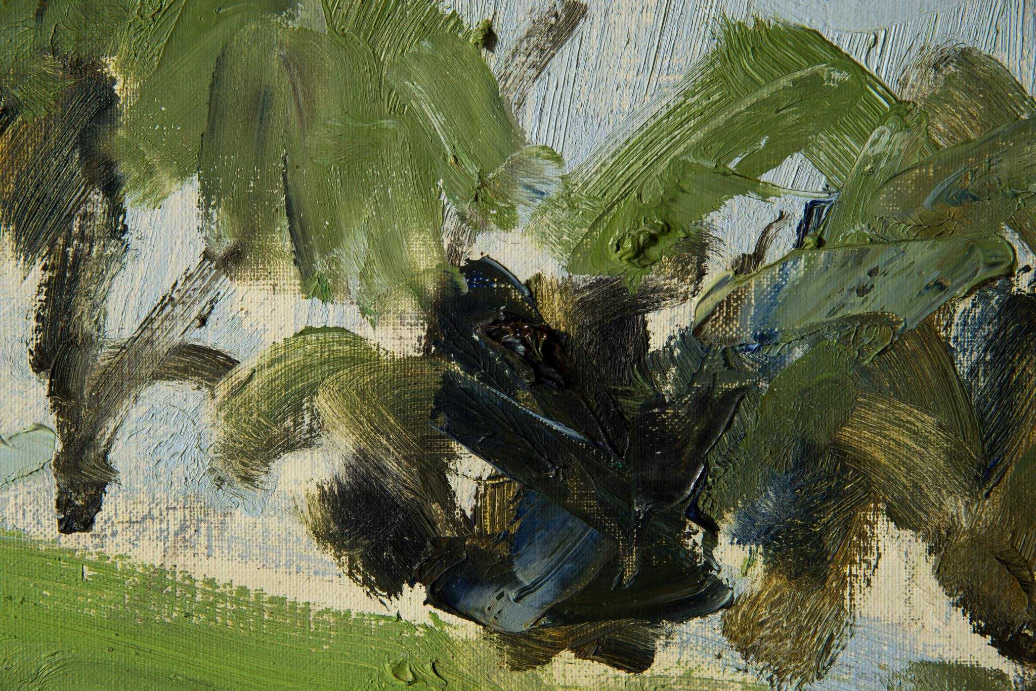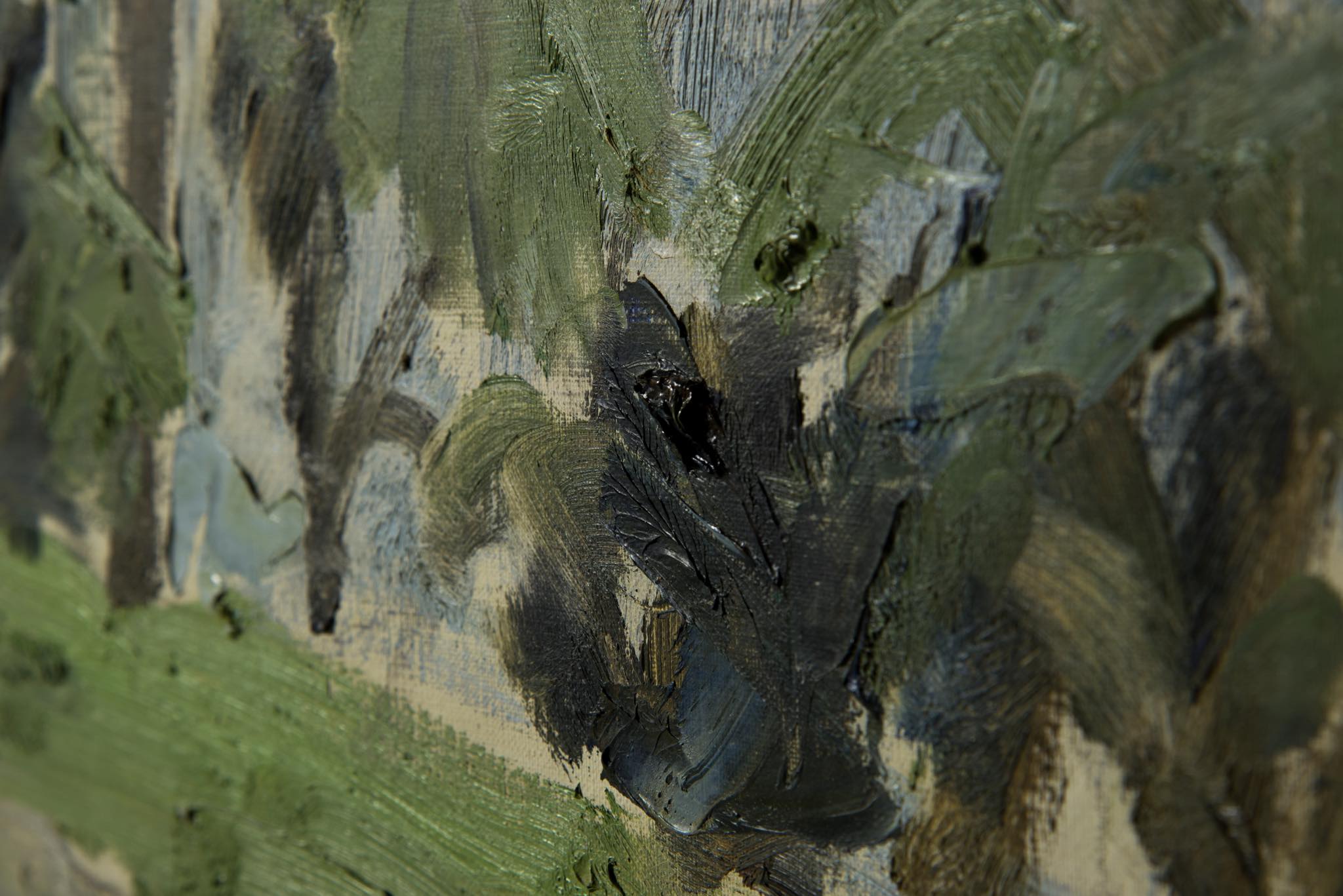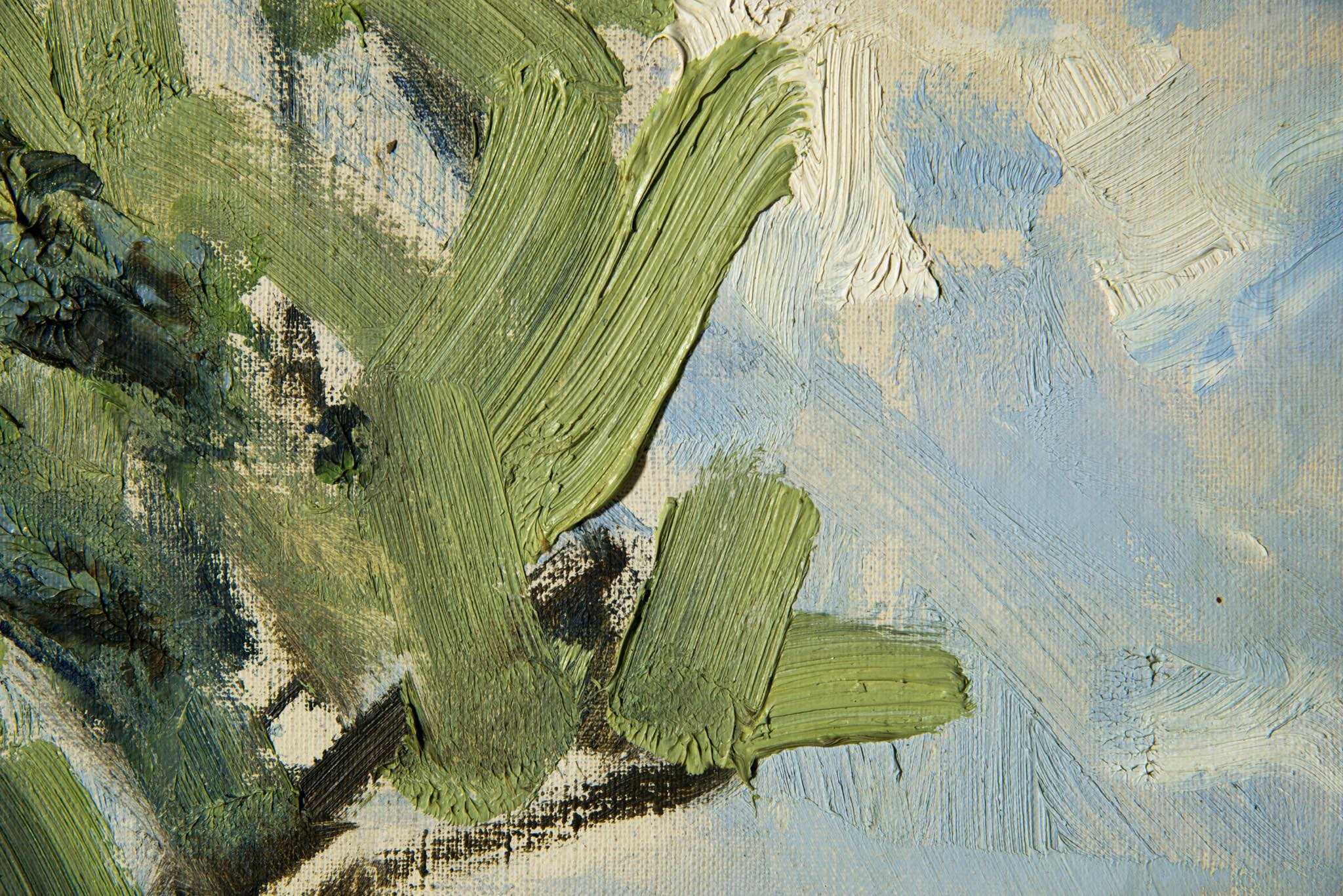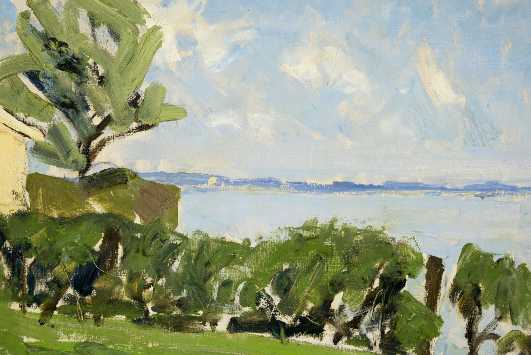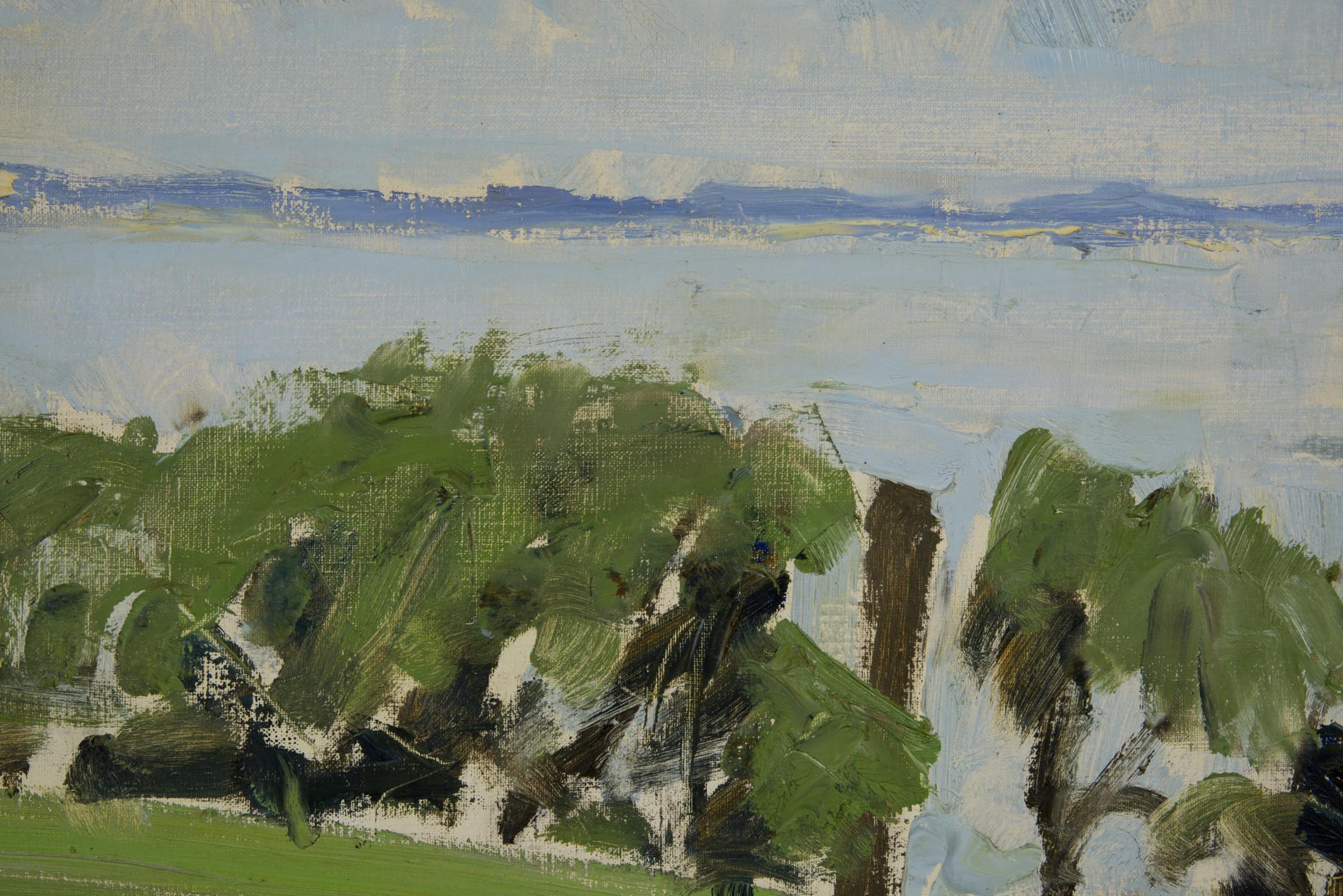 デンマークの画家、Børge Bokkenheuser/ボーエ・ボッケンホイザーによる風景画作品です。1964年の爽やかな季節に描かれたもので、遠く広がる入江の様子が独特の筆致で描かれています。オリジナルのフレームはそのままに、背面の始末を整えました。