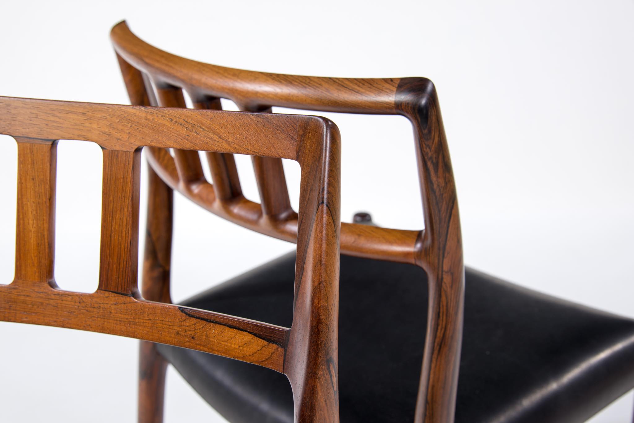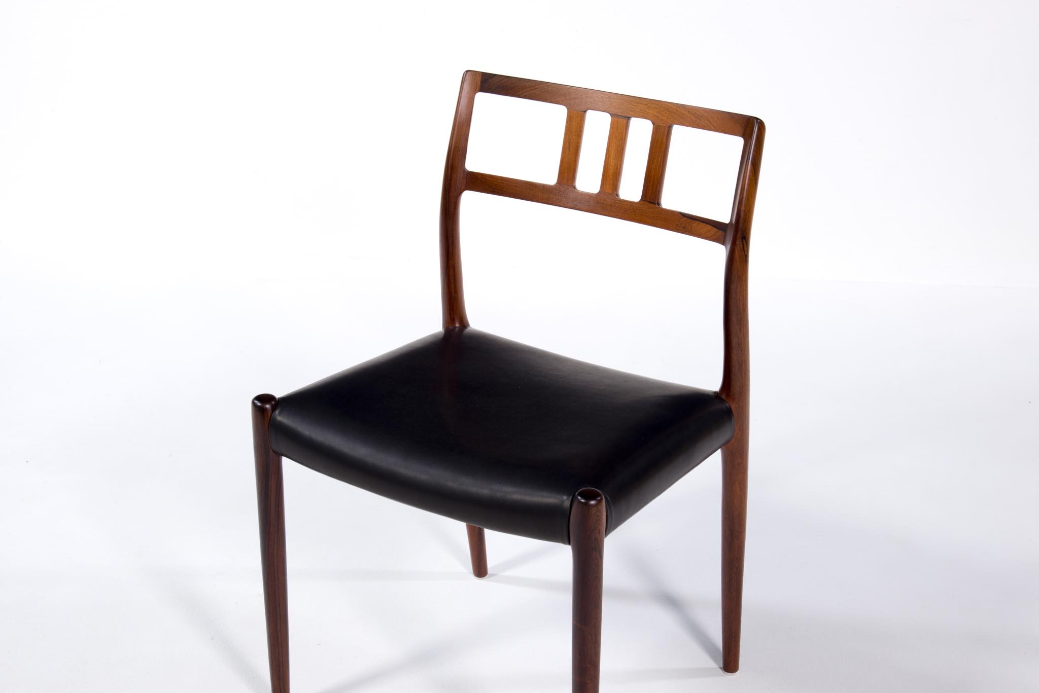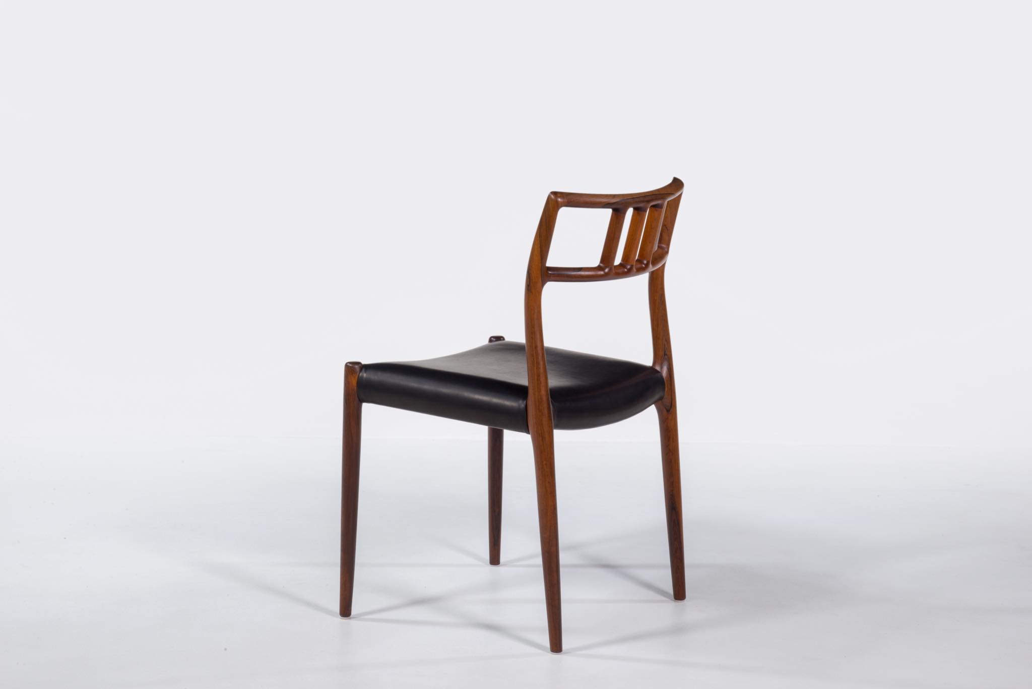 デンマークの家具工房、J.L. Møller/J.L.モラーによるダイニングチェア "Model 79" です。創業者のN.O. Moller/ニルス・オット・モラーによってデザインされ、こちらは1960年代頃に作られたヴィンテージ品となります。ブラジル原産と思しき良質なローズウッド材が用いられています。天然木が用いられていたこの当時の作品は、木材そのものに強度があったため、現行モデルに比べ細く作られているようです。座面はデンマークの皮革メーカー”CAMO leather” の黒色皮革にて張り替えました。