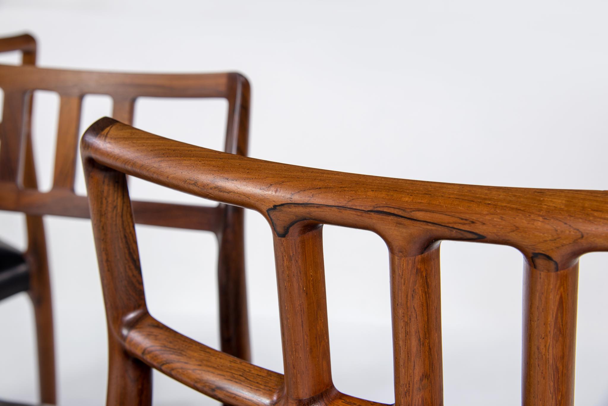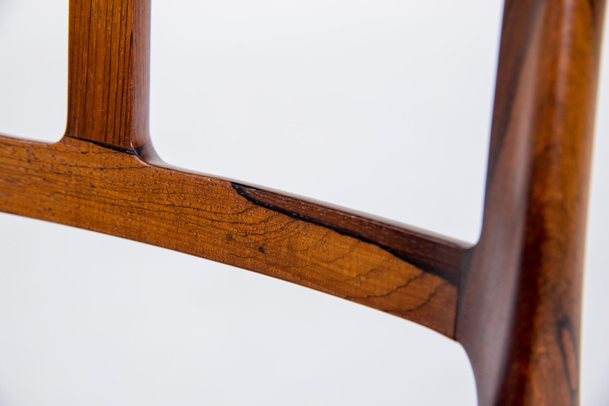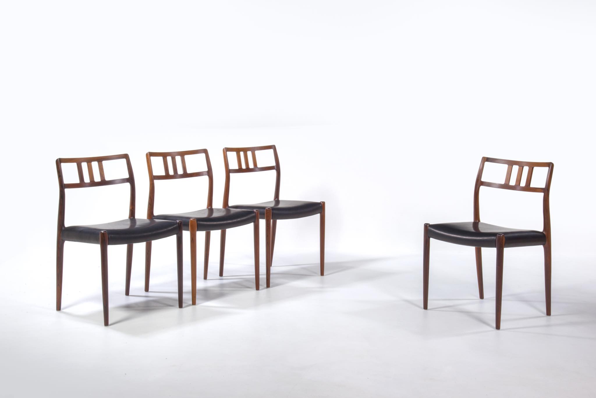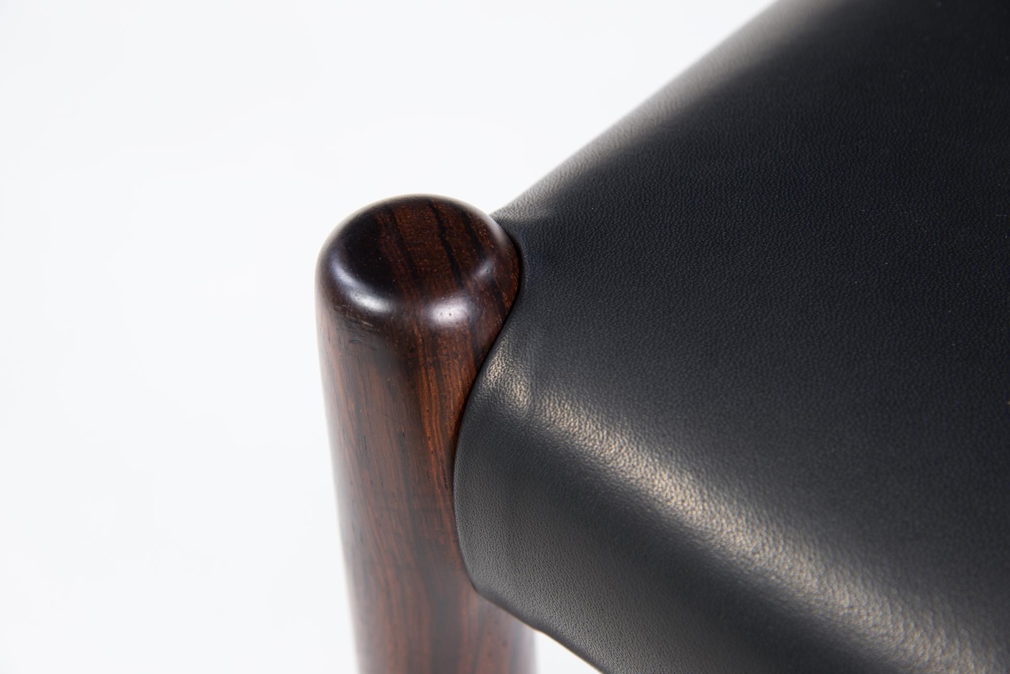 デンマークの家具工房、J.L. Møller/J.L.モラーによるダイニングチェア "Model 79" です。創業者のN.O. Moller/ニルス・オット・モラーによってデザインされ、こちらは1960年代頃に作られたヴィンテージ品となります。ブラジル原産と思しき良質なローズウッド材が用いられています。天然木が用いられていたこの当時の作品は、木材そのものに強度があったため、現行モデルに比べ細く作られているようです。座面はデンマークの皮革メーカー”CAMO leather” の黒色皮革にて張り替えました。