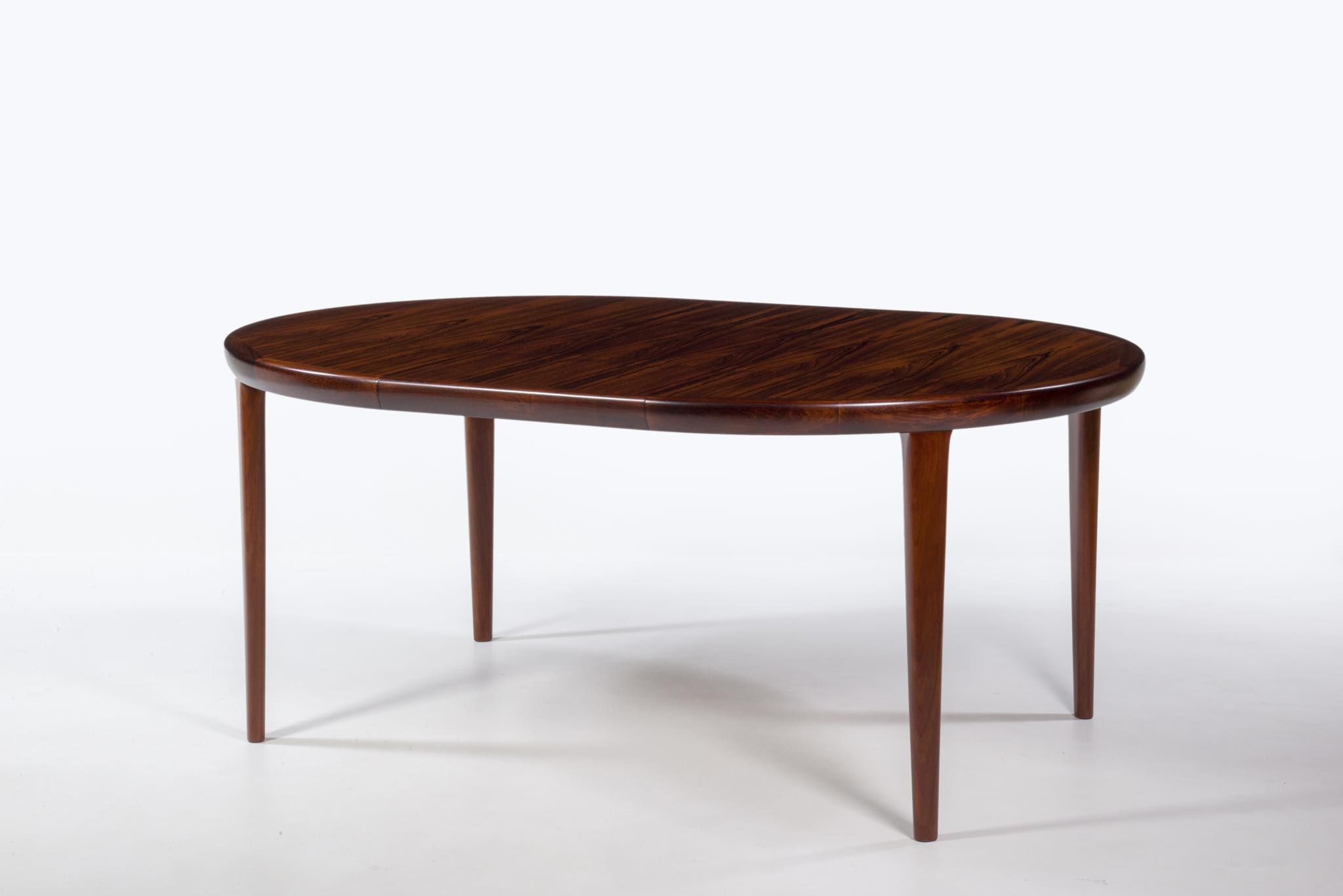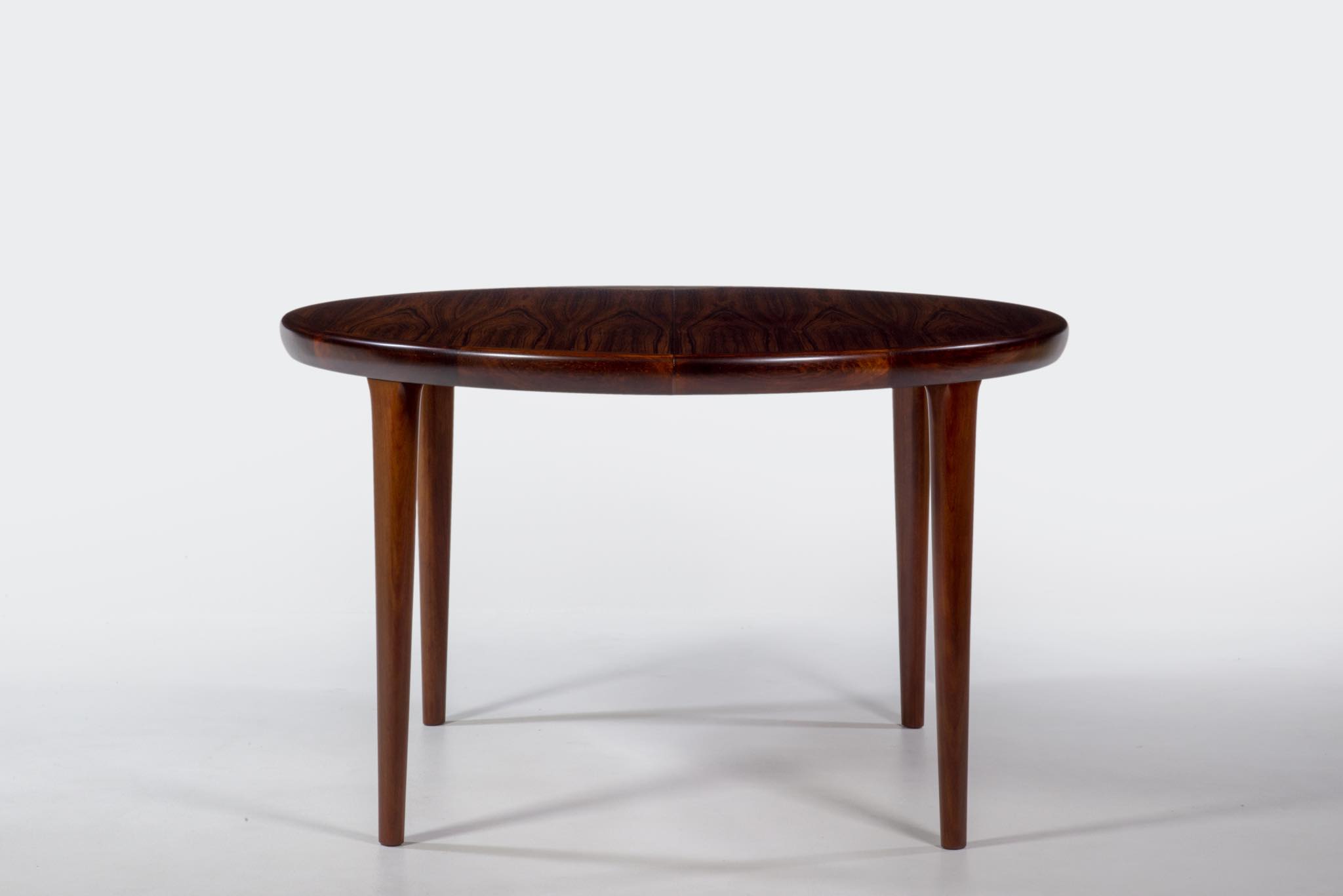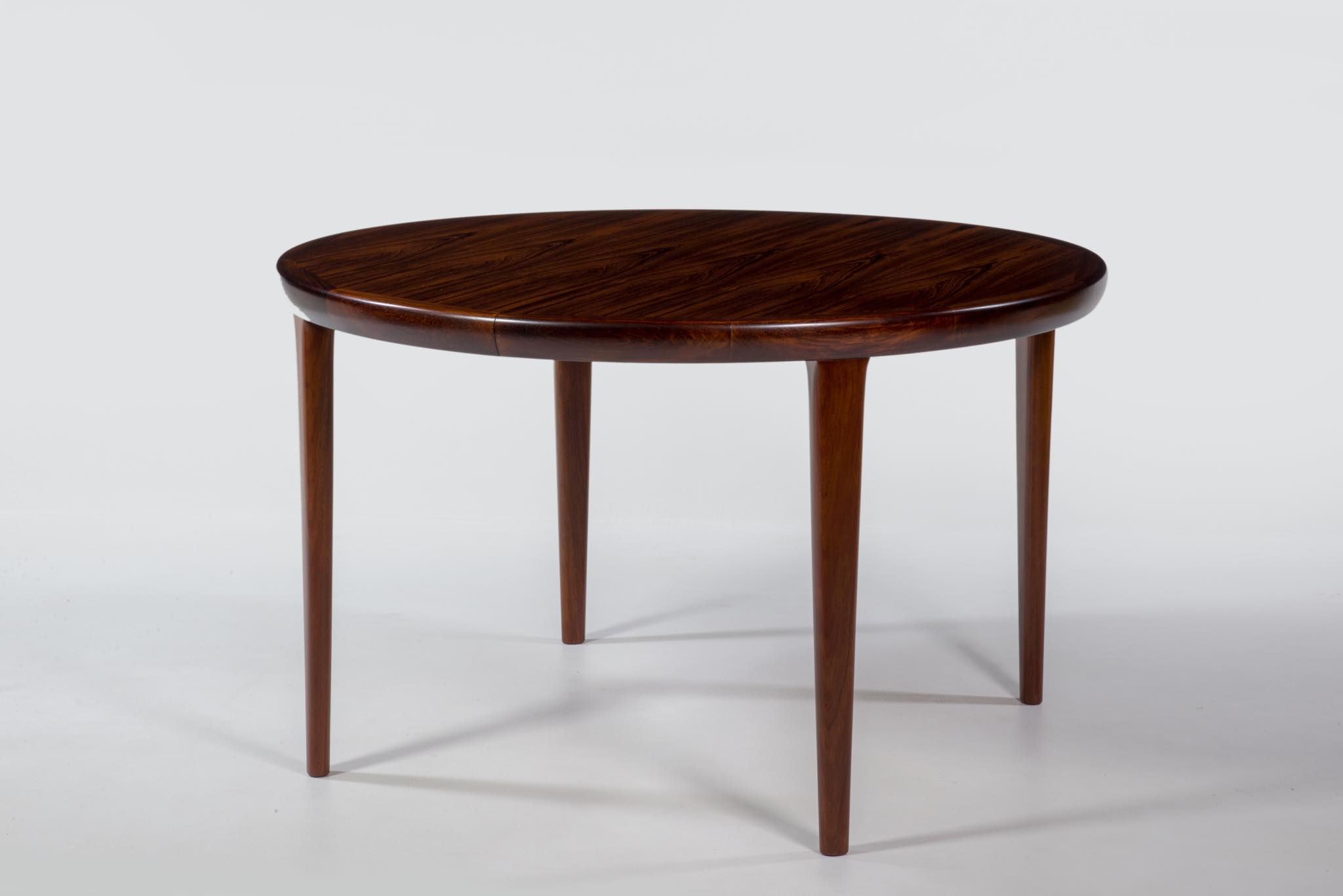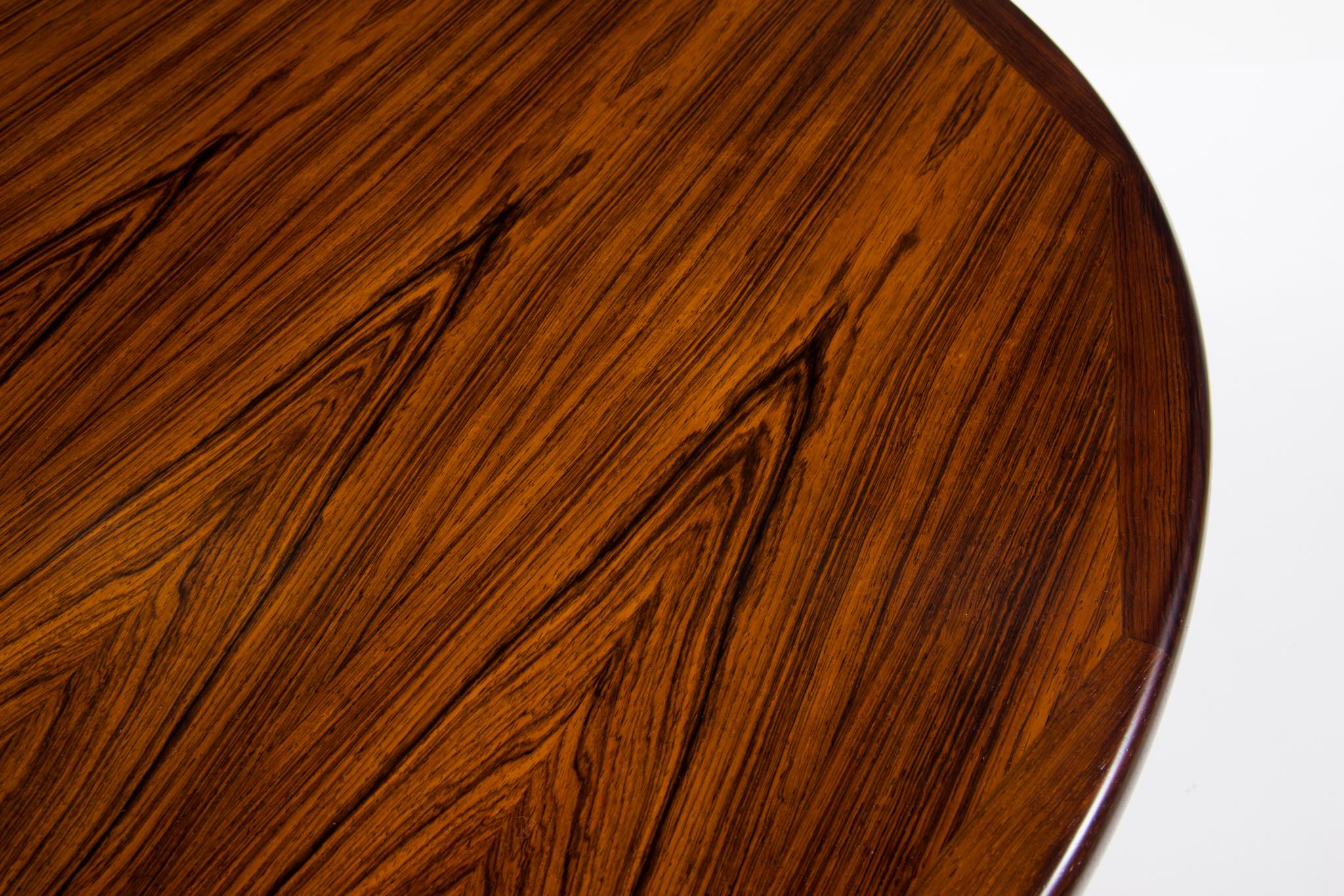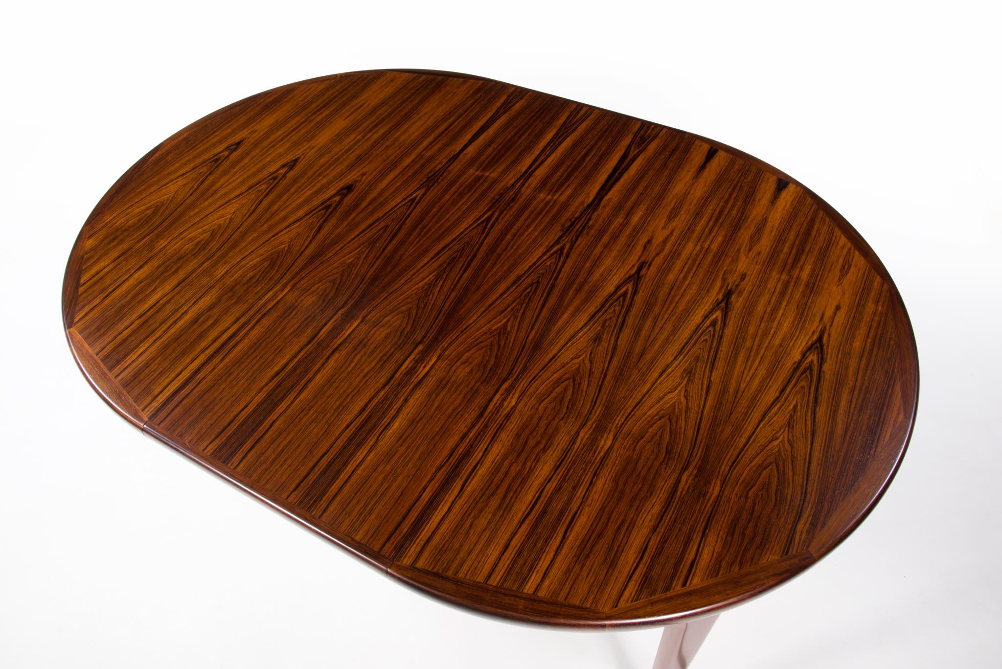 デンマークの家具工房、V.V.Moblerによって製作されたダイニングテーブルです。1960年代頃に作られたものでしょう。天板にはブラジル原産と思しき良質なローズウッド材が用いられており、整った木目に見所があります。エクステンションリーフが一枚付属し、天板を拡張することが可能です。脚はマホガニー材です。コンディションは良好です。