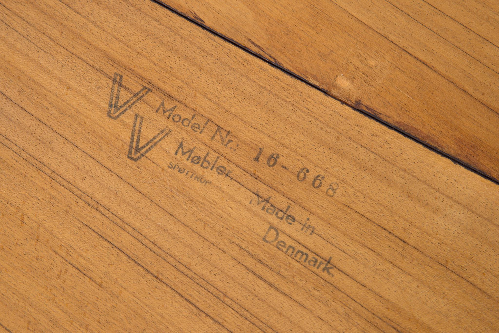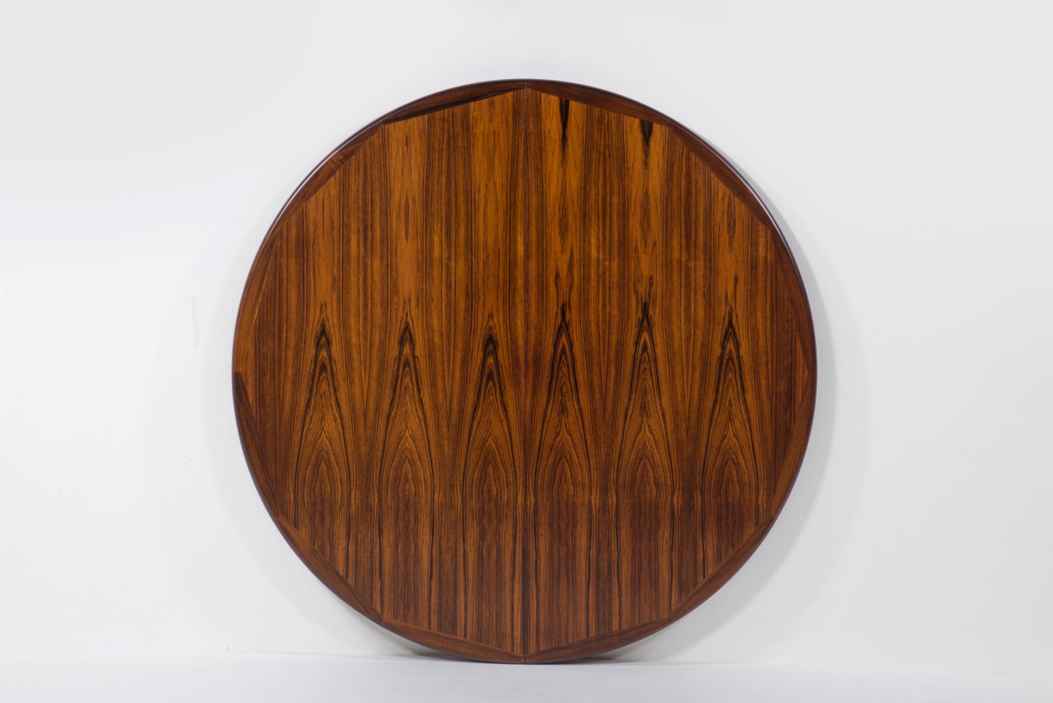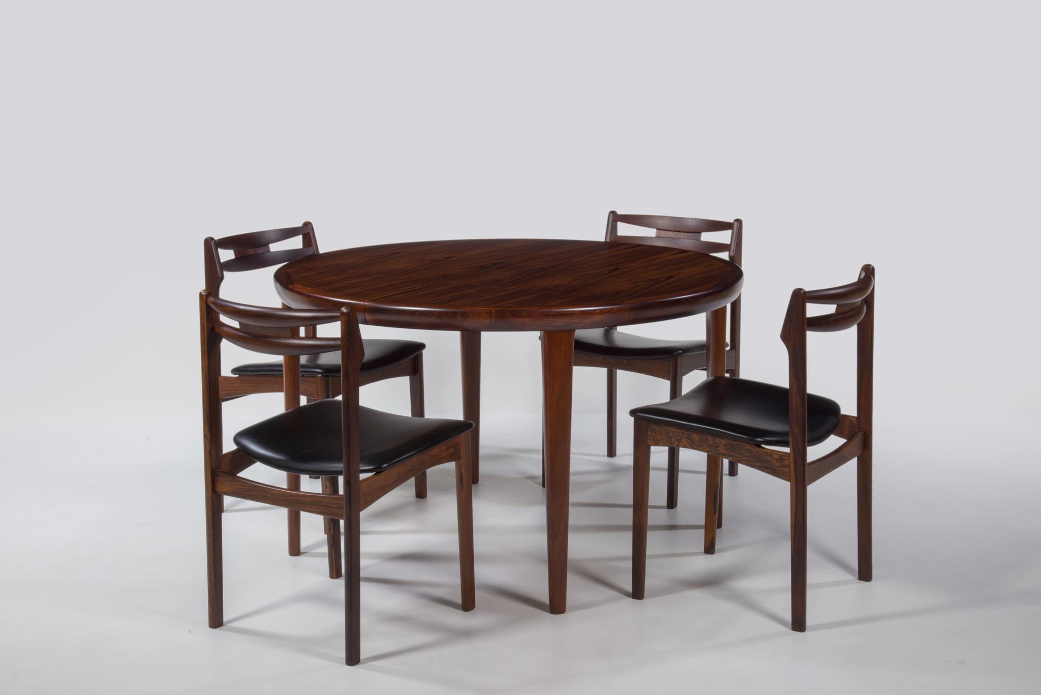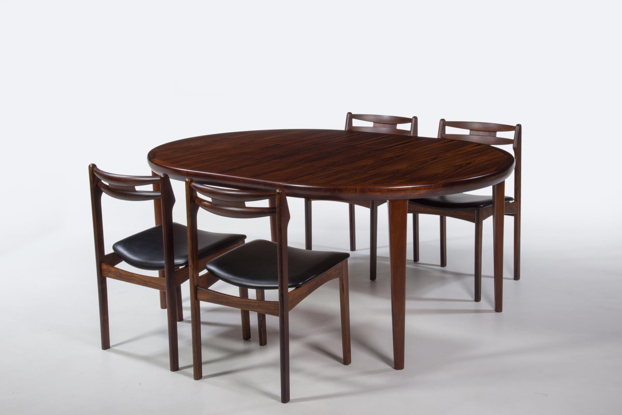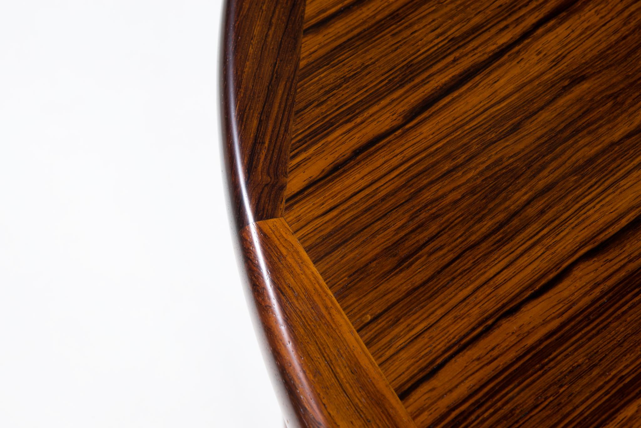 デンマークの家具工房、V.V.Moblerによって製作されたダイニングテーブルです。1960年代頃に作られたものでしょう。天板にはブラジル原産と思しき良質なローズウッド材が用いられており、整った木目に見所があります。エクステンションリーフが一枚付属し、天板を拡張することが可能です。脚はマホガニー材です。コンディションは良好です。