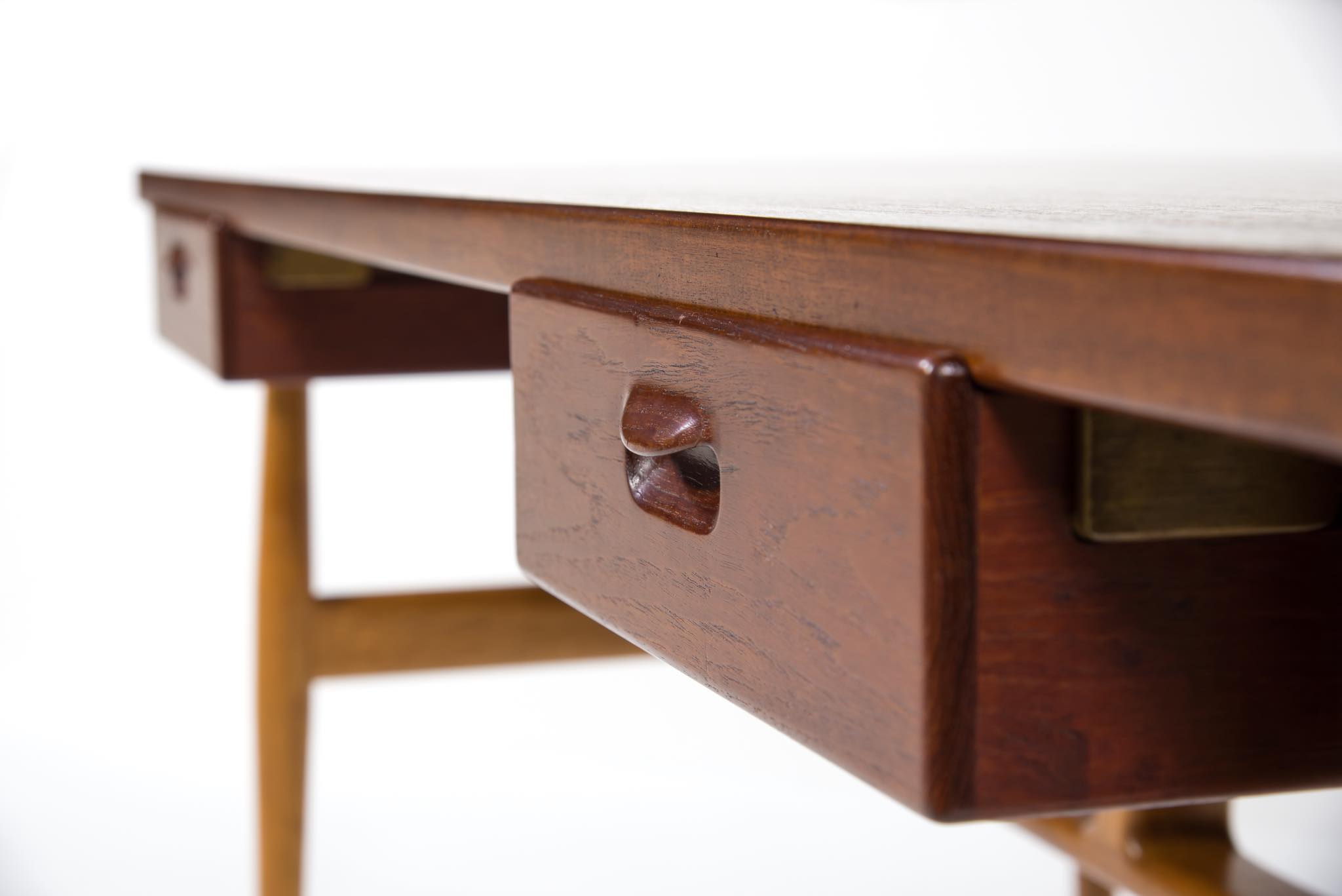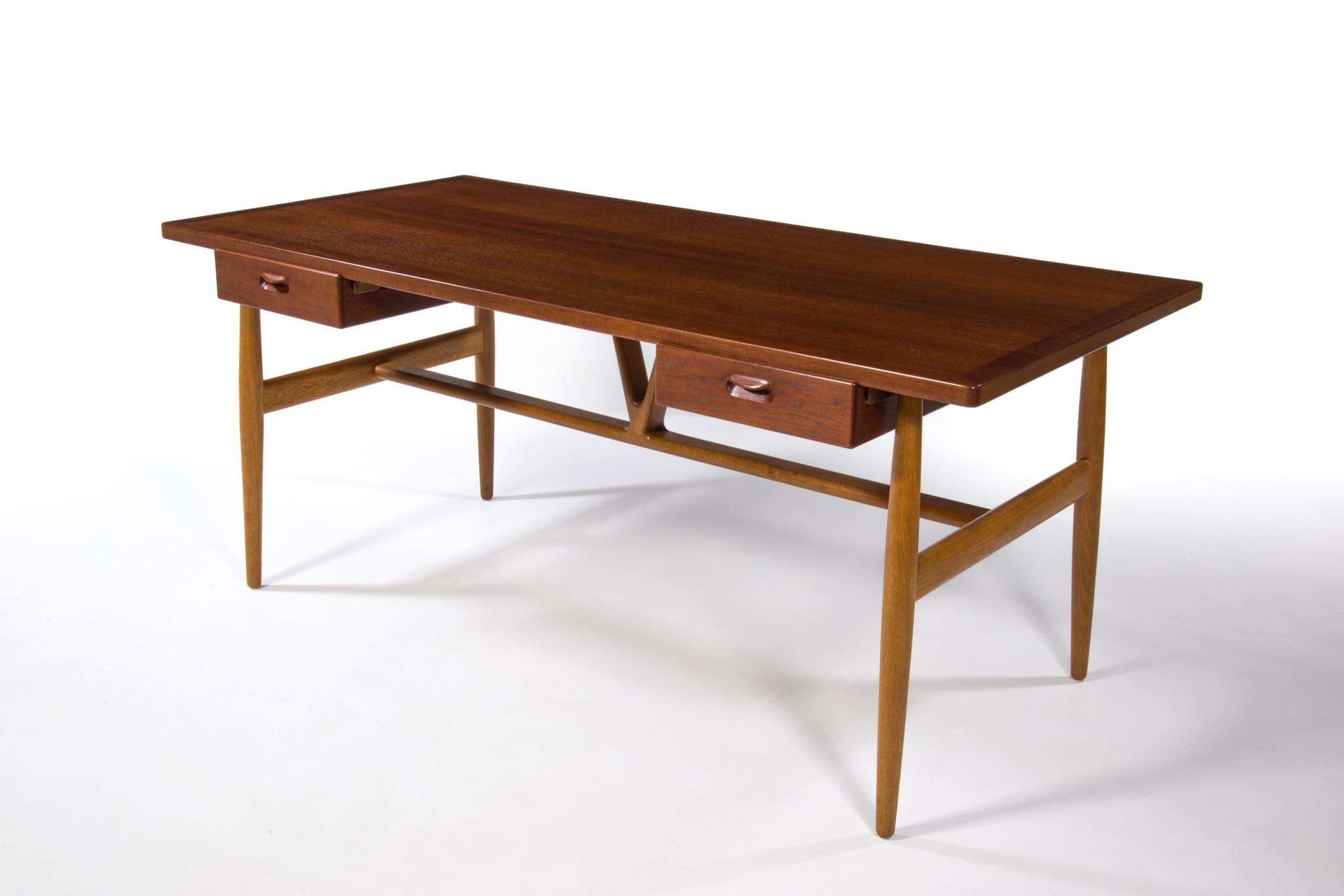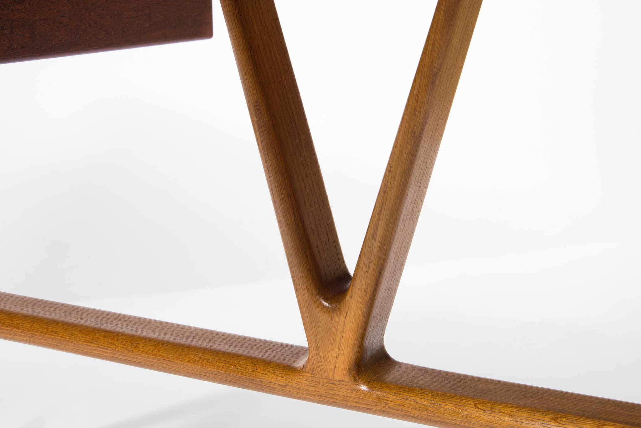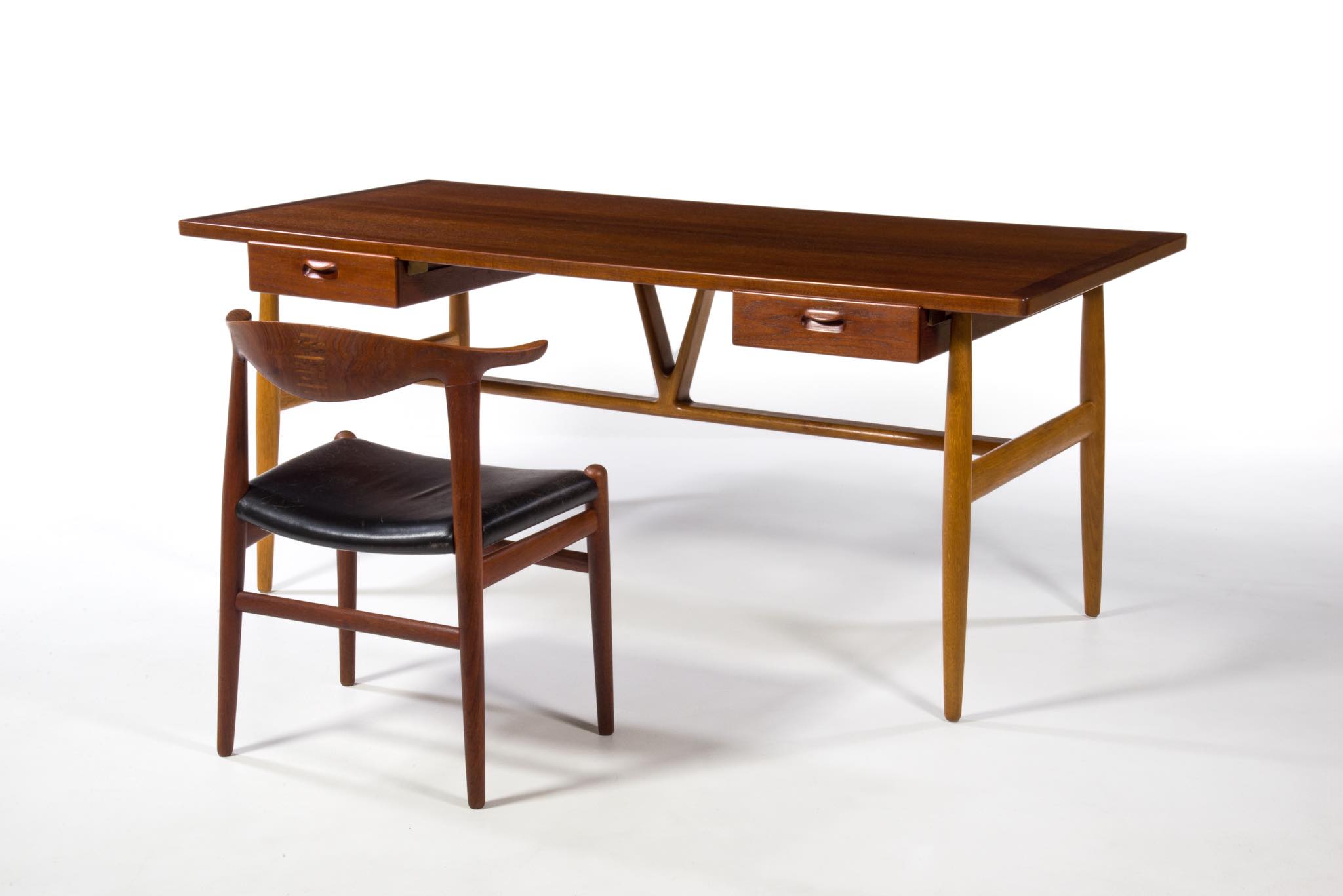 デンマークの家具デザイナー、Hans J. Wegner/ハンス・ウェグナーによる JH563 デスク、通称 ”V DESK"と呼ばれるモデルです。1950年に発表されたモデルで、文字通り、本体を貫で支えるための支柱が「V」の字を描いています。天板はチーク材、脚はオーク材の構成で、1950年代に流行した異素材を合わせたコンビネーションが軽やかな印象です。抽斗の面板は無垢からハンドルを含め削り出しており、抽斗のレールには無垢の真鍮が使われるなど、とても贅沢な作りのものです。コンディションは極めて良好です。
