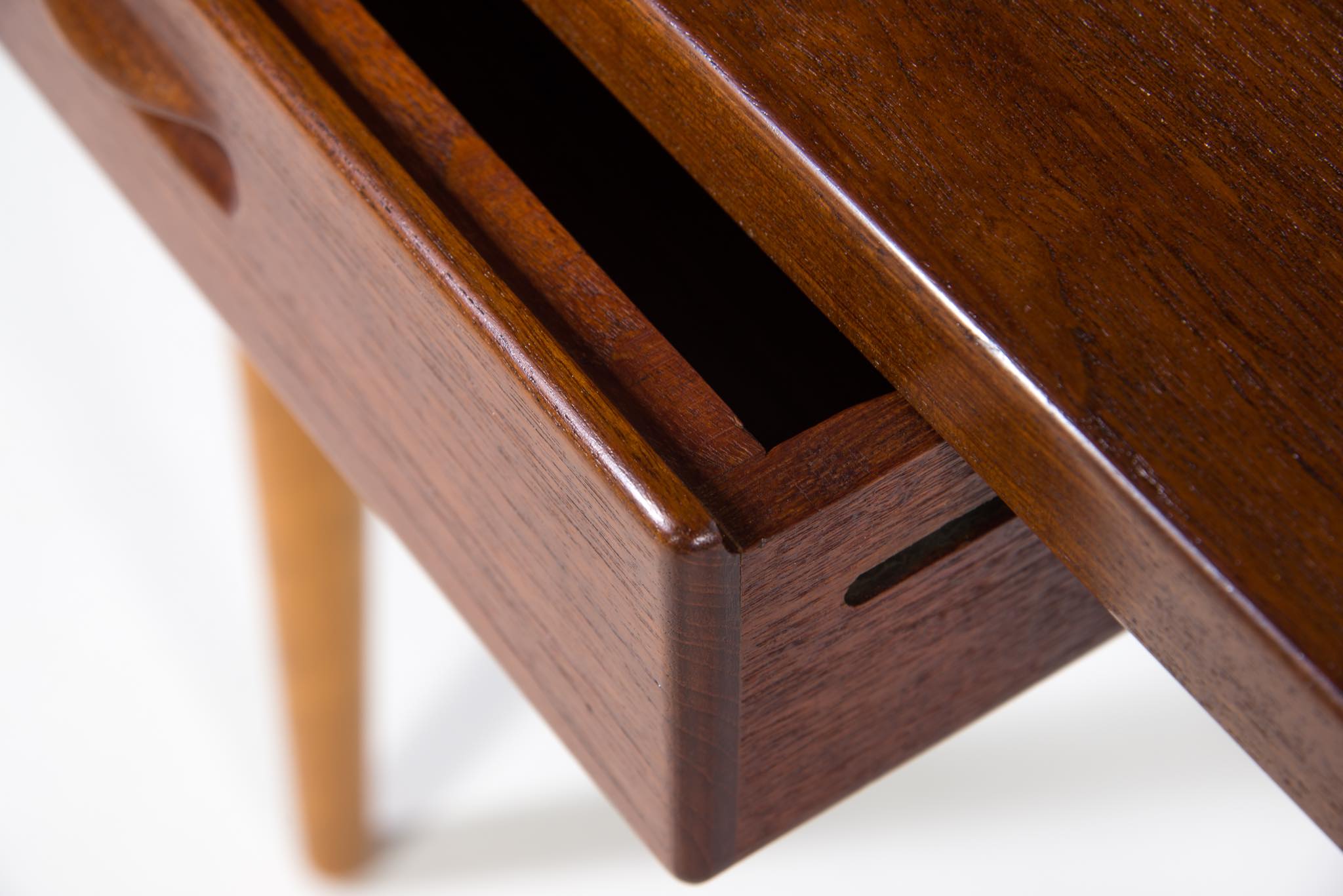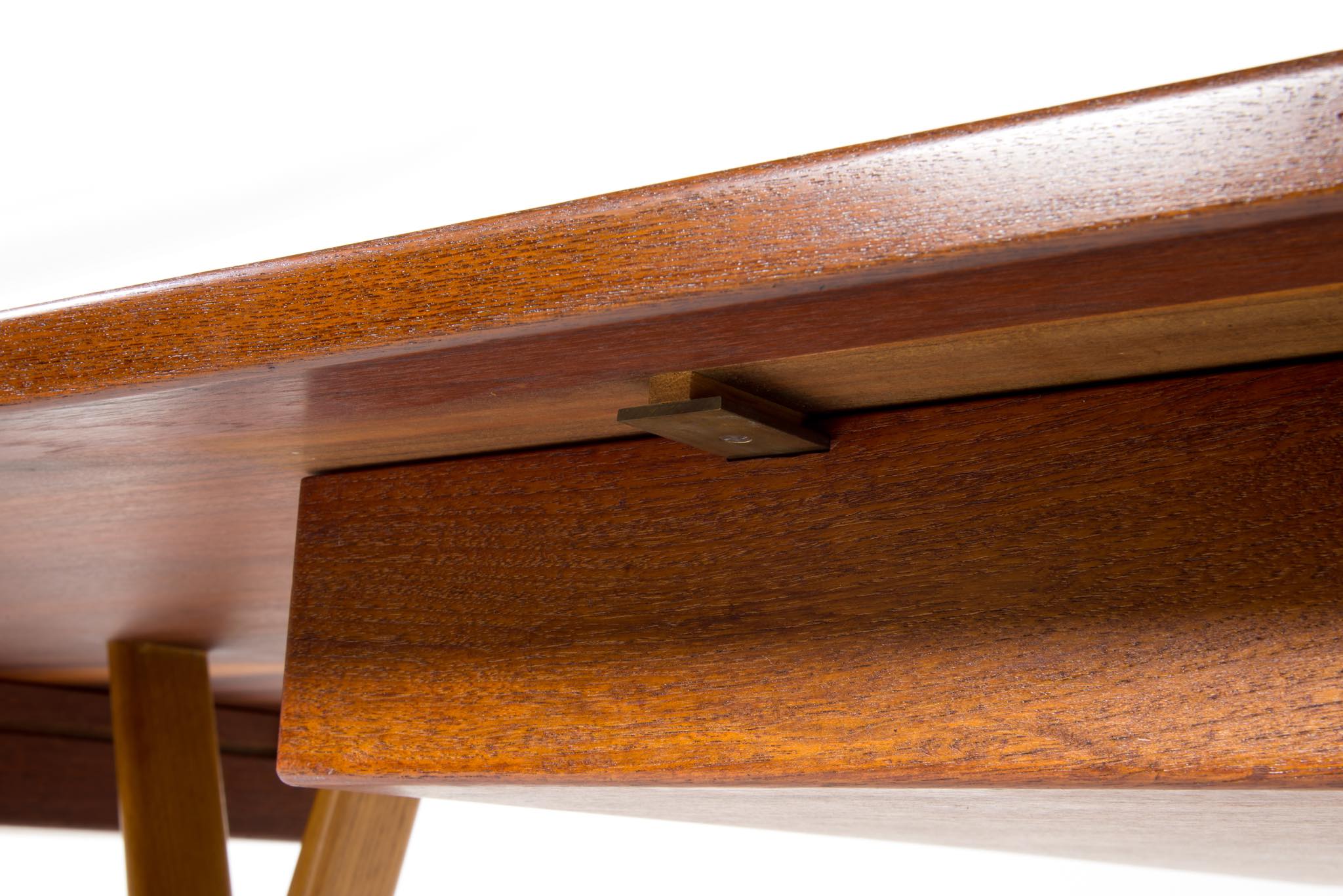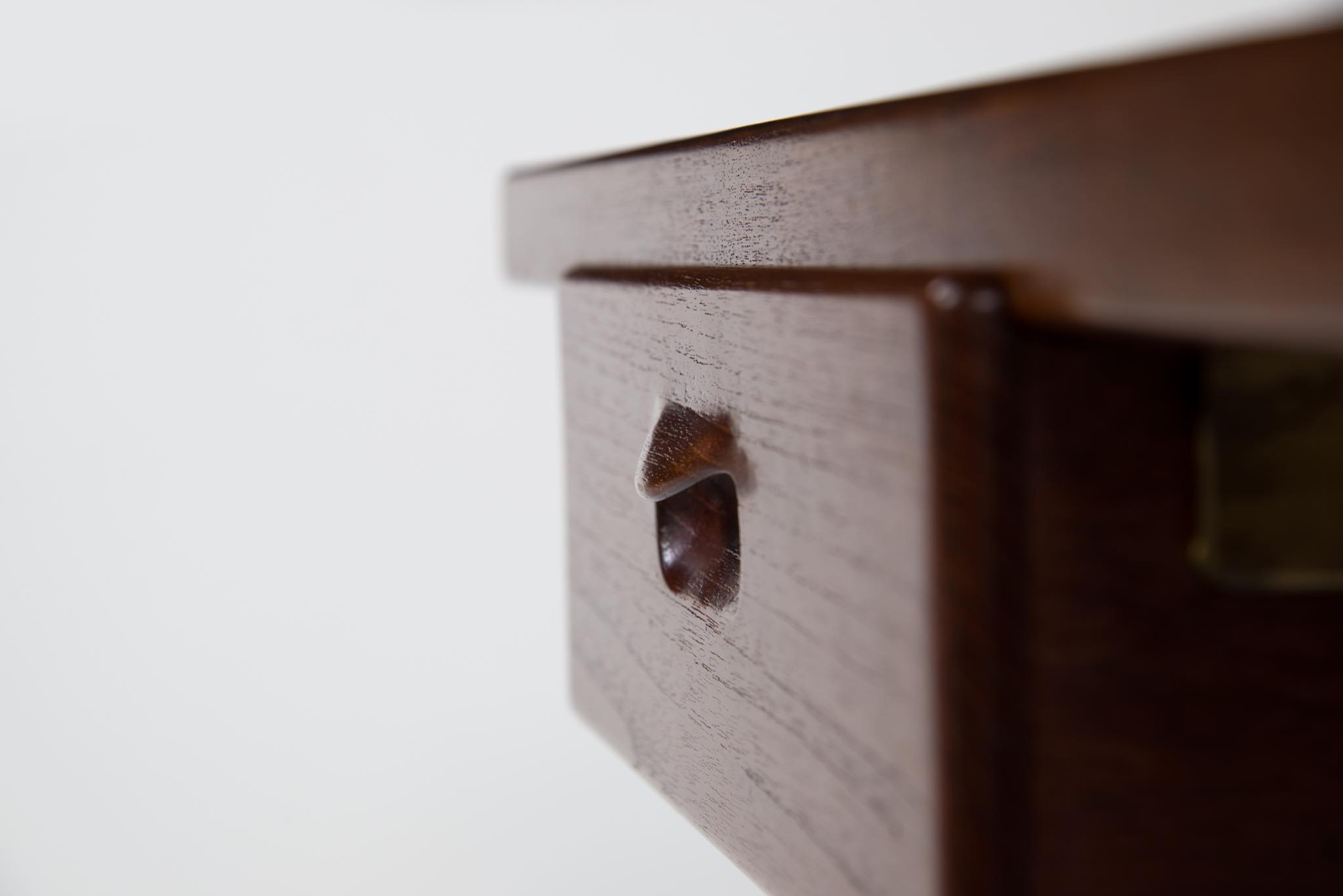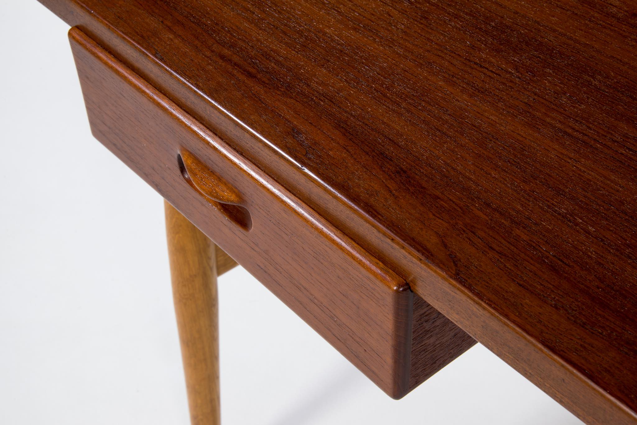 デンマークの家具デザイナー、Hans J. Wegner/ハンス・ウェグナーによる JH563 デスク、通称 ”V DESK"と呼ばれるモデルです。1950年に発表されたモデルで、文字通り、本体を貫で支えるための支柱が「V」の字を描いています。天板はチーク材、脚はオーク材の構成で、1950年代に流行した異素材を合わせたコンビネーションが軽やかな印象です。抽斗の面板は無垢からハンドルを含め削り出しており、抽斗のレールには無垢の真鍮が使われるなど、とても贅沢な作りのものです。コンディションは極めて良好です。