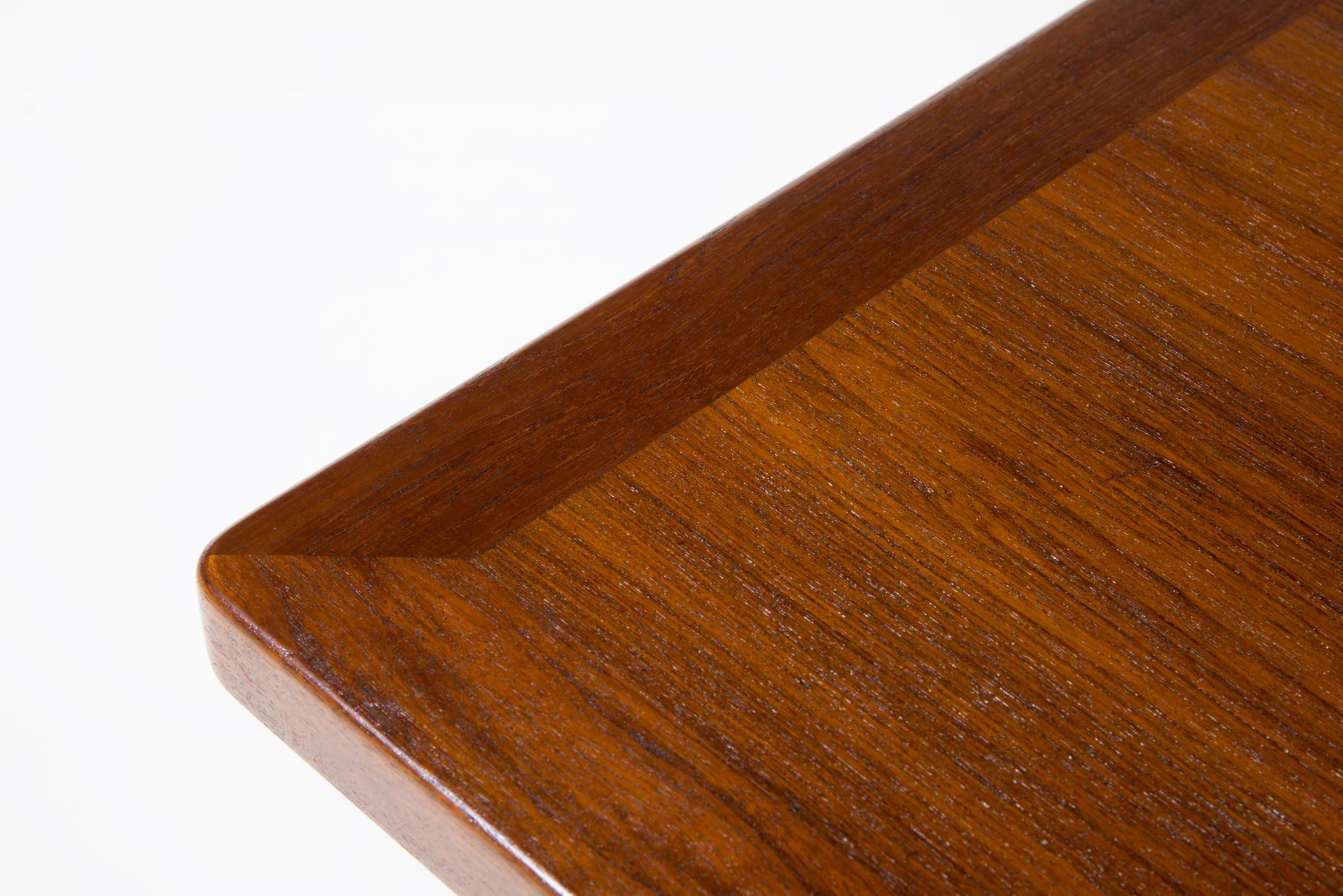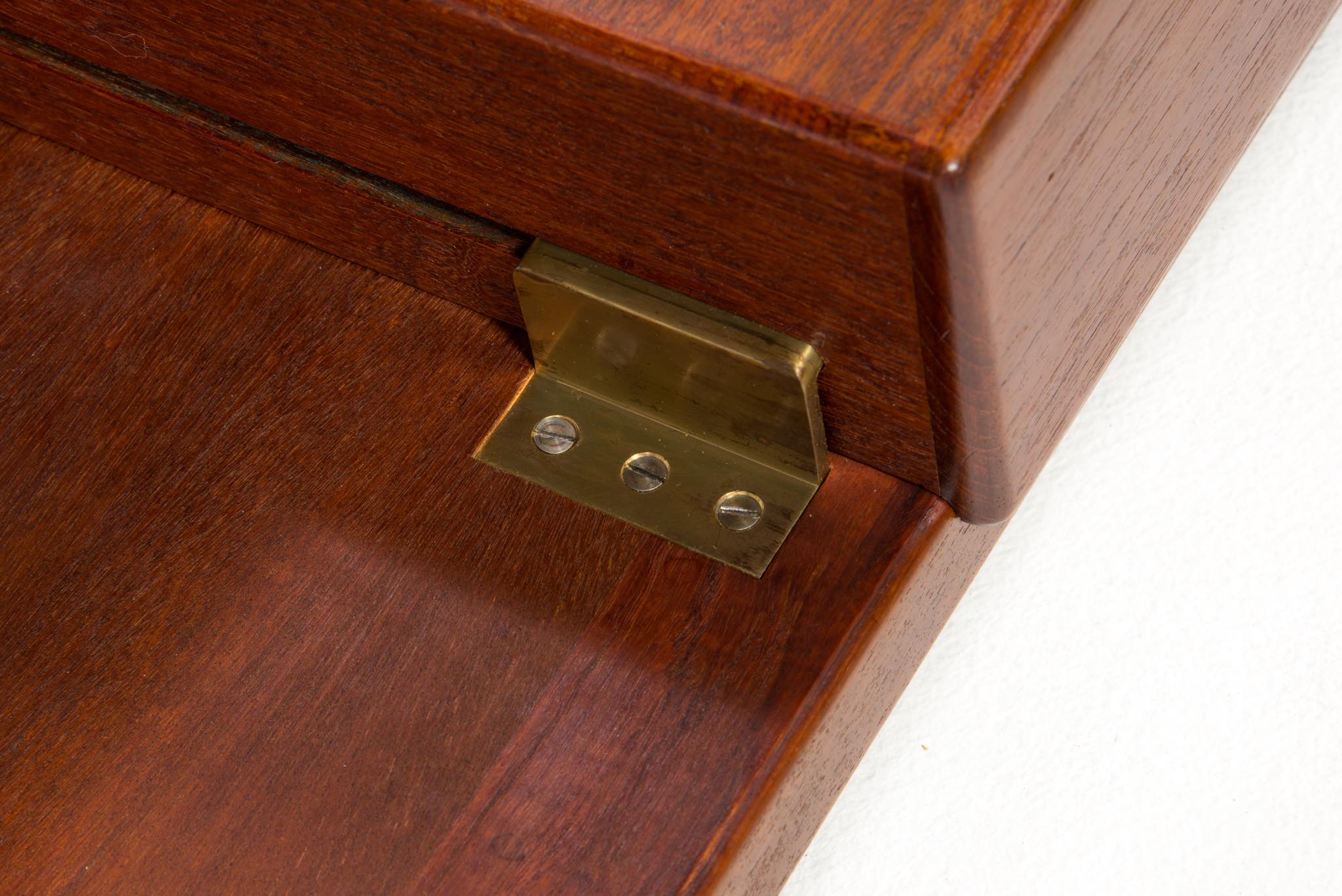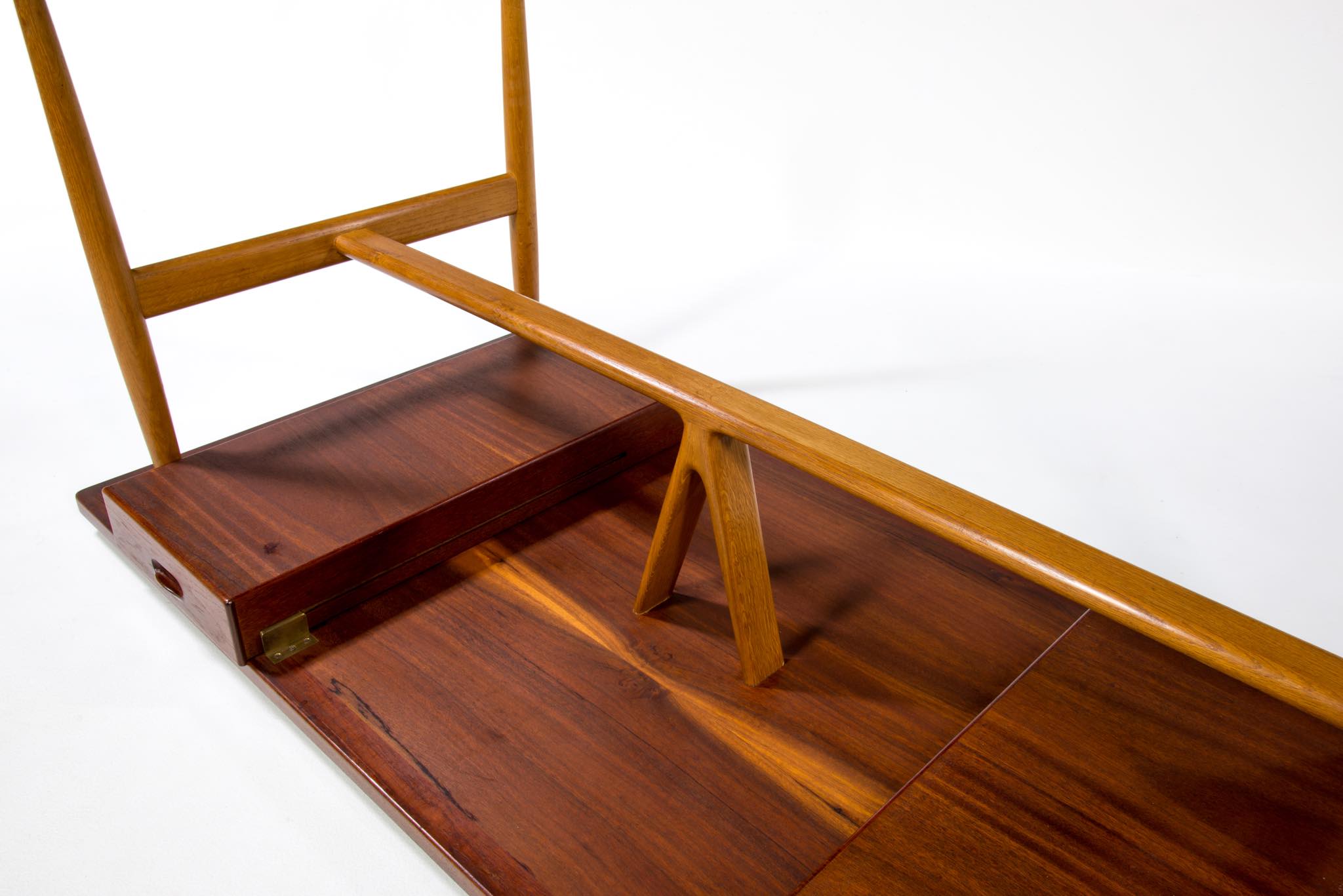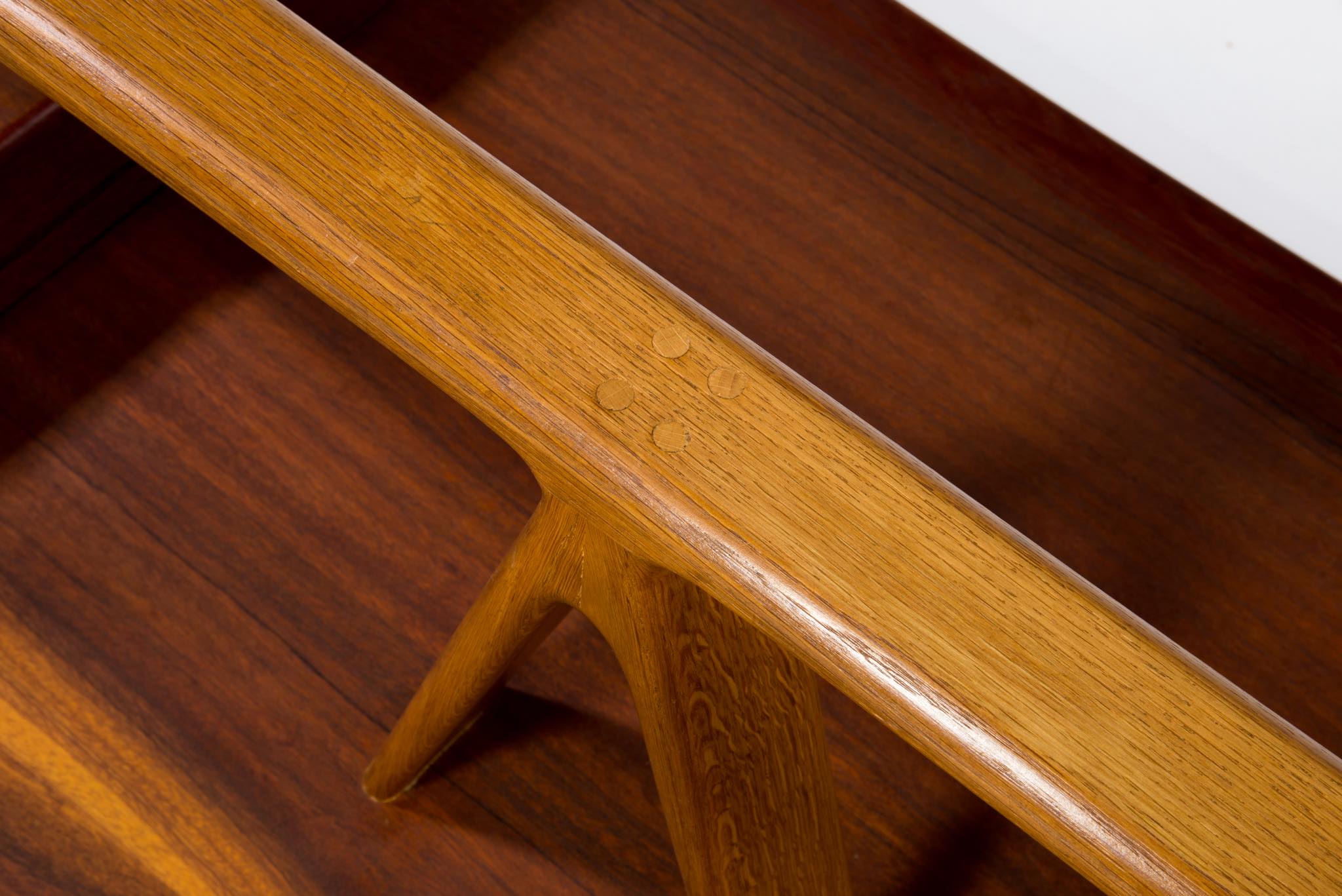 デンマークの家具デザイナー、Hans J. Wegner/ハンス・ウェグナーによる JH563 デスク、通称 ”V DESK"と呼ばれるモデルです。1950年に発表されたモデルで、文字通り、本体を貫で支えるための支柱が「V」の字を描いています。天板はチーク材、脚はオーク材の構成で、1950年代に流行した異素材を合わせたコンビネーションが軽やかな印象です。抽斗の面板は無垢からハンドルを含め削り出しており、抽斗のレールには無垢の真鍮が使われるなど、とても贅沢な作りのものです。コンディションは極めて良好です。