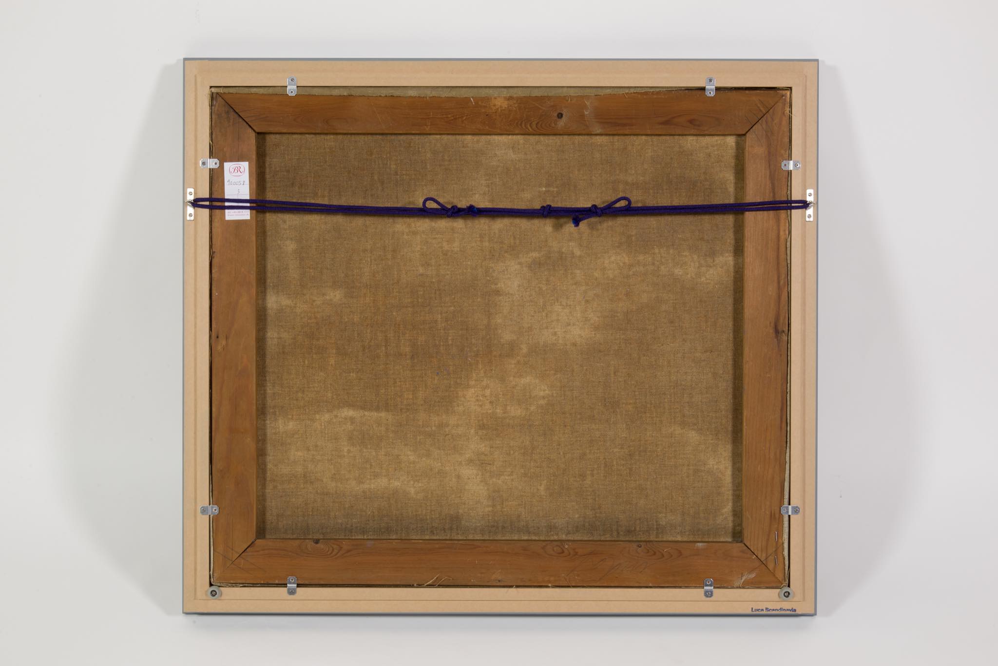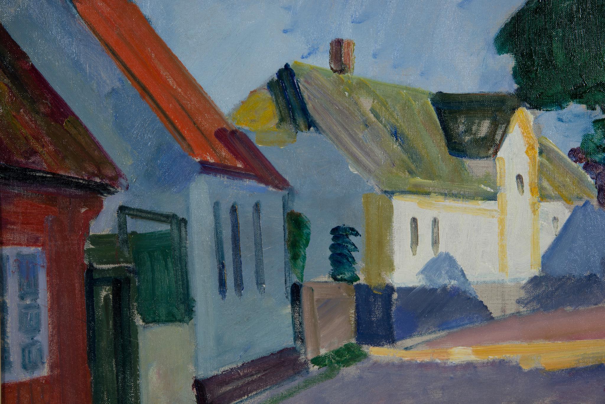 デンマークの画家、Olaf Rude/オラフ・ルードによる風景画油彩作品で、1924年に描かれたものです。バルト海に浮かぶデンマーク領の島、ボーンホルム島のAllinge地区の住宅街に朝日が射し込む情景が独自の表現で描かれています。フレームは木地に塗装を施したものを新たに誂えました。