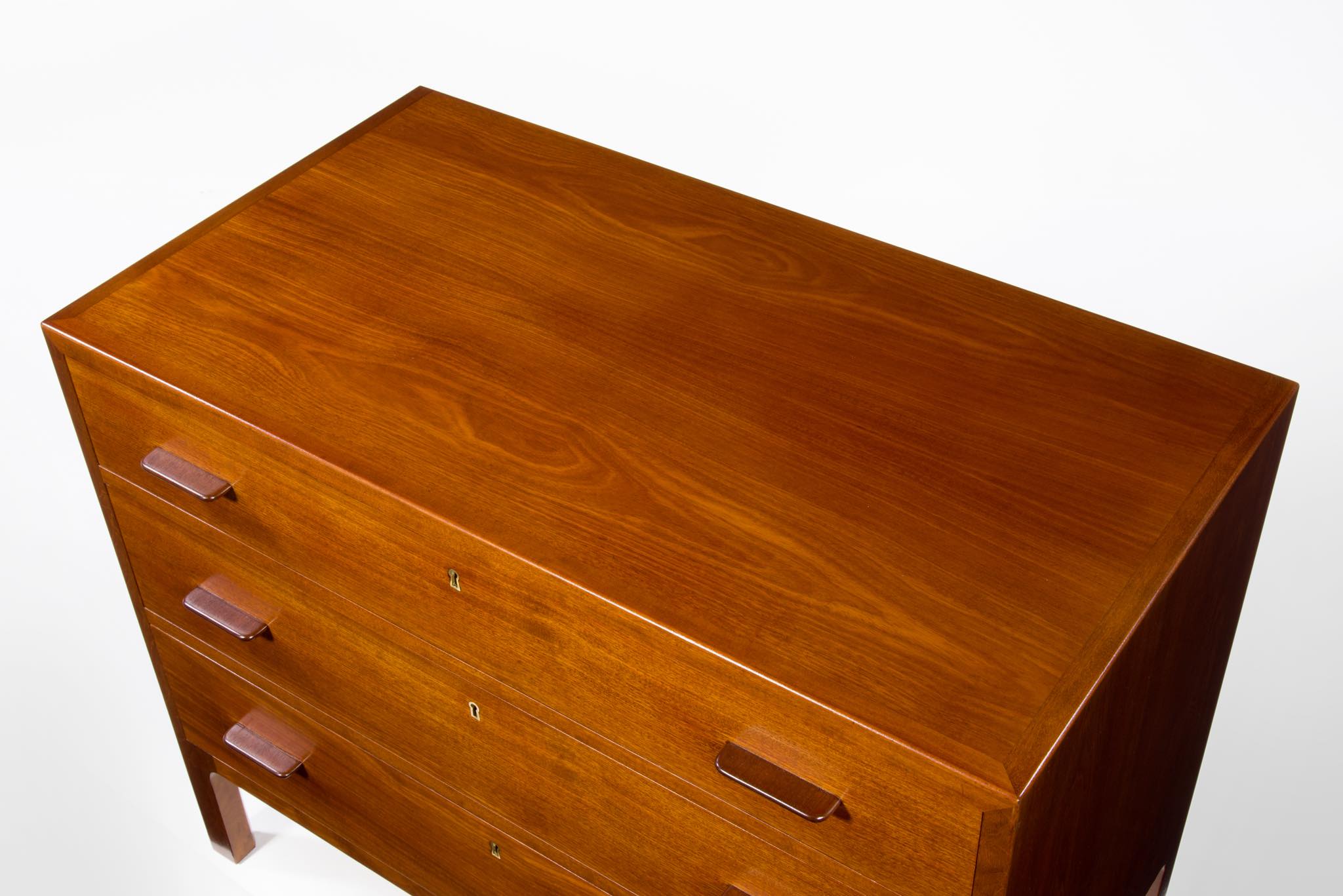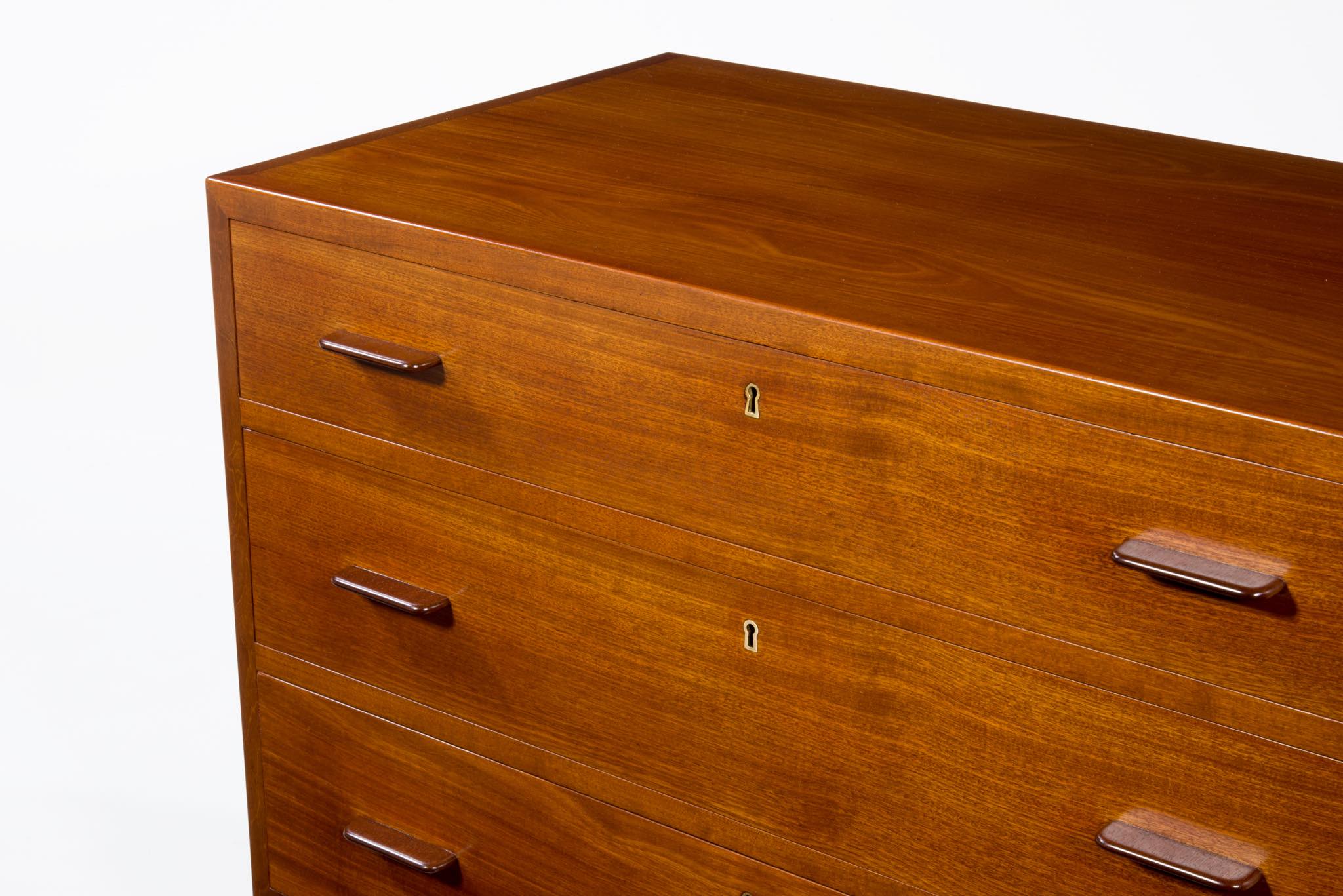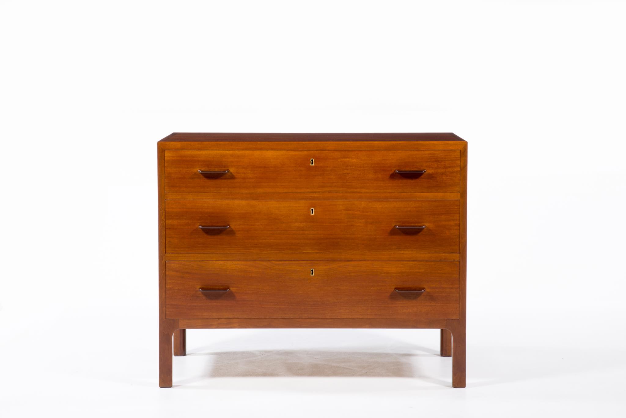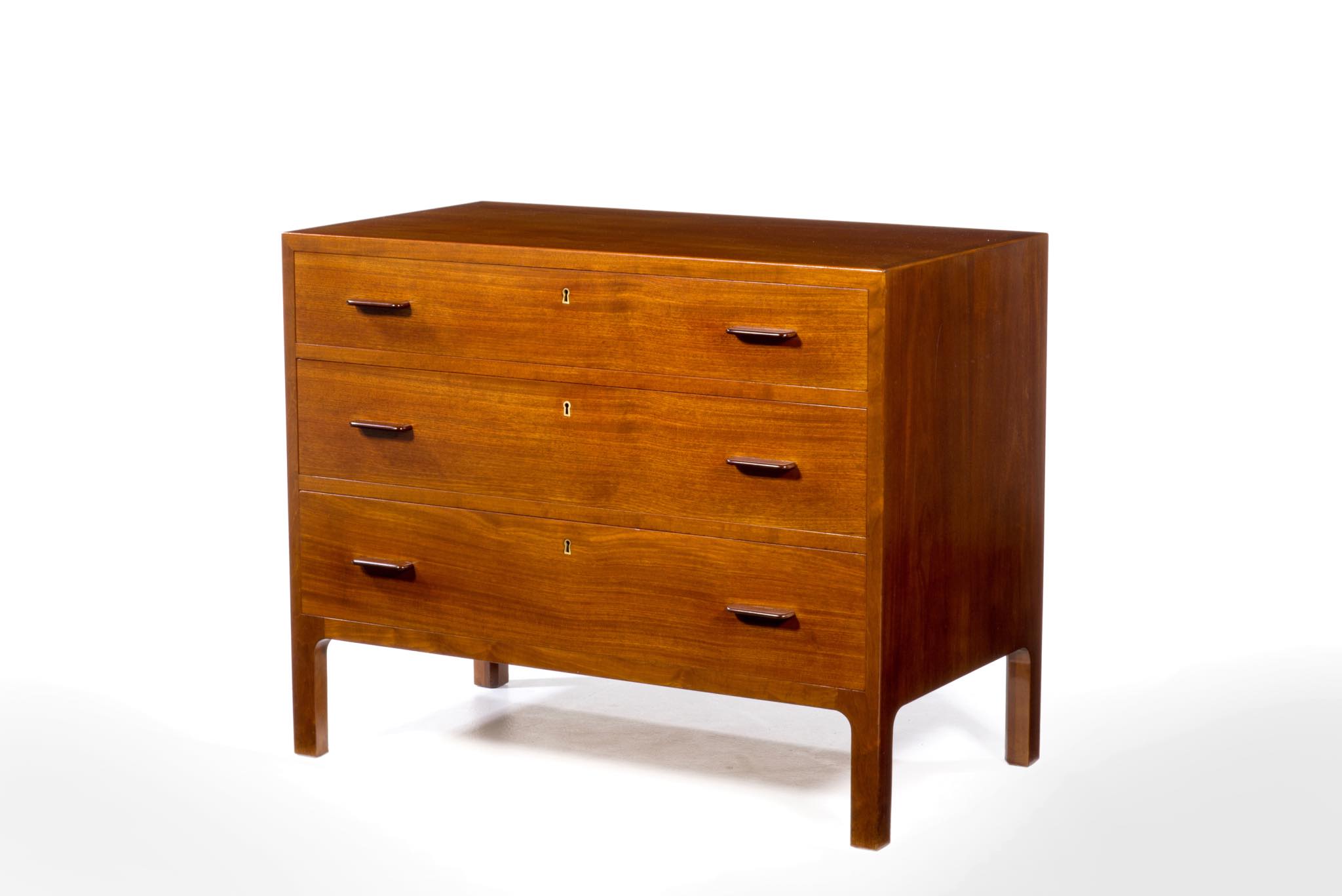 デンマークの名匠、Jacob Kjær/ヤコブ・ケアによるデザイン及び製作品としてデンマーク市場で扱われていたチェストです。資料に乏しく詳しい事は判っておりませんが、キューバンマホガニーと思しき良質な材が用いられており、側面の板は脚まで無垢の削り出しで作られています。量産品ではない、職人によってほぼ手作りで製作されたもので、1940年代頃のものでしょう。職人家具ですが、モダンなデザインによって重くなりすぎず、軽快な佇まいが特徴です。最上位の抽斗の鍵穴の縁に僅かな補修がありますが、その他とても綺麗な状態です。