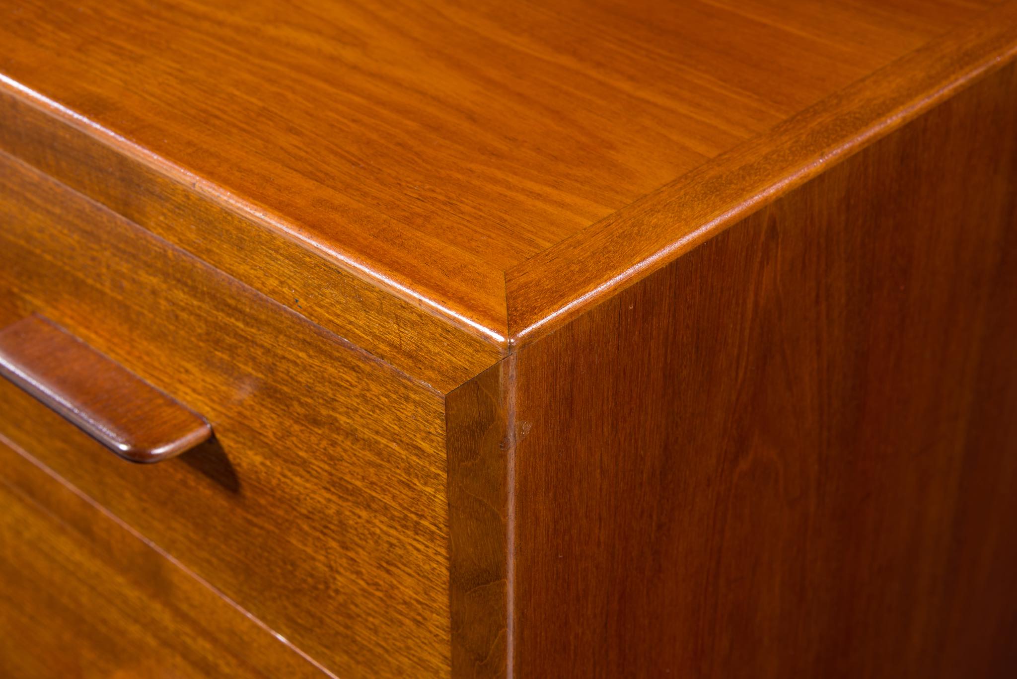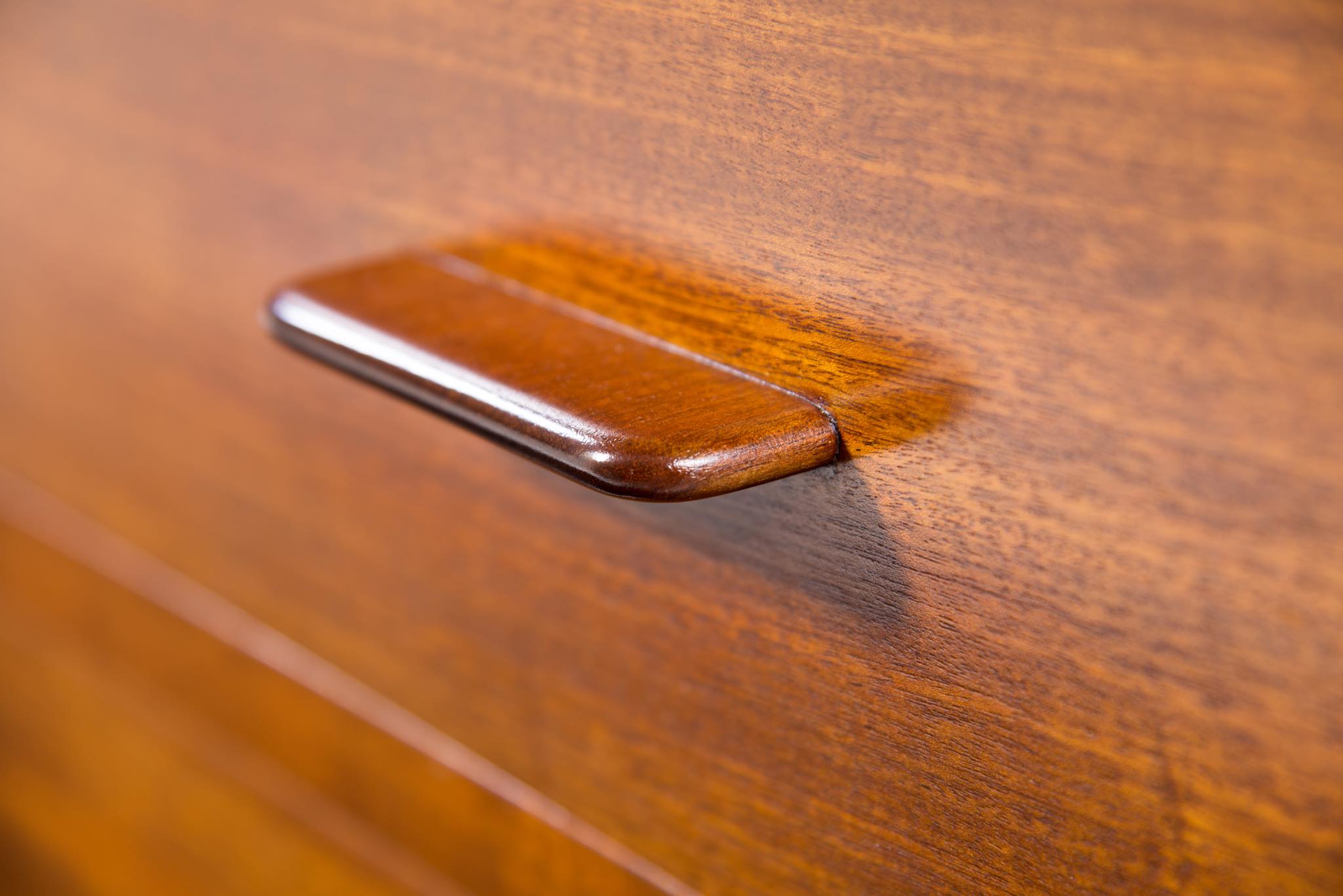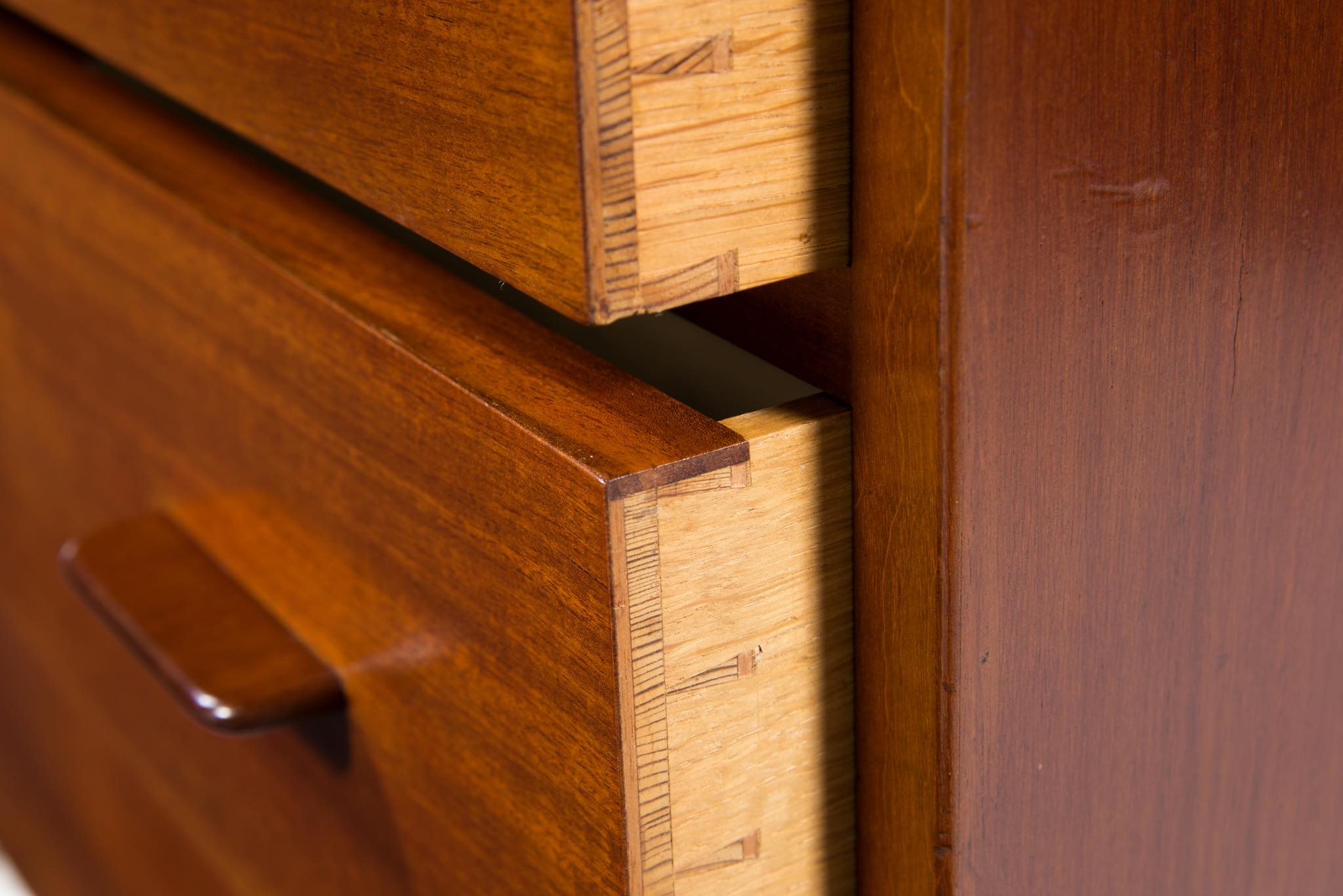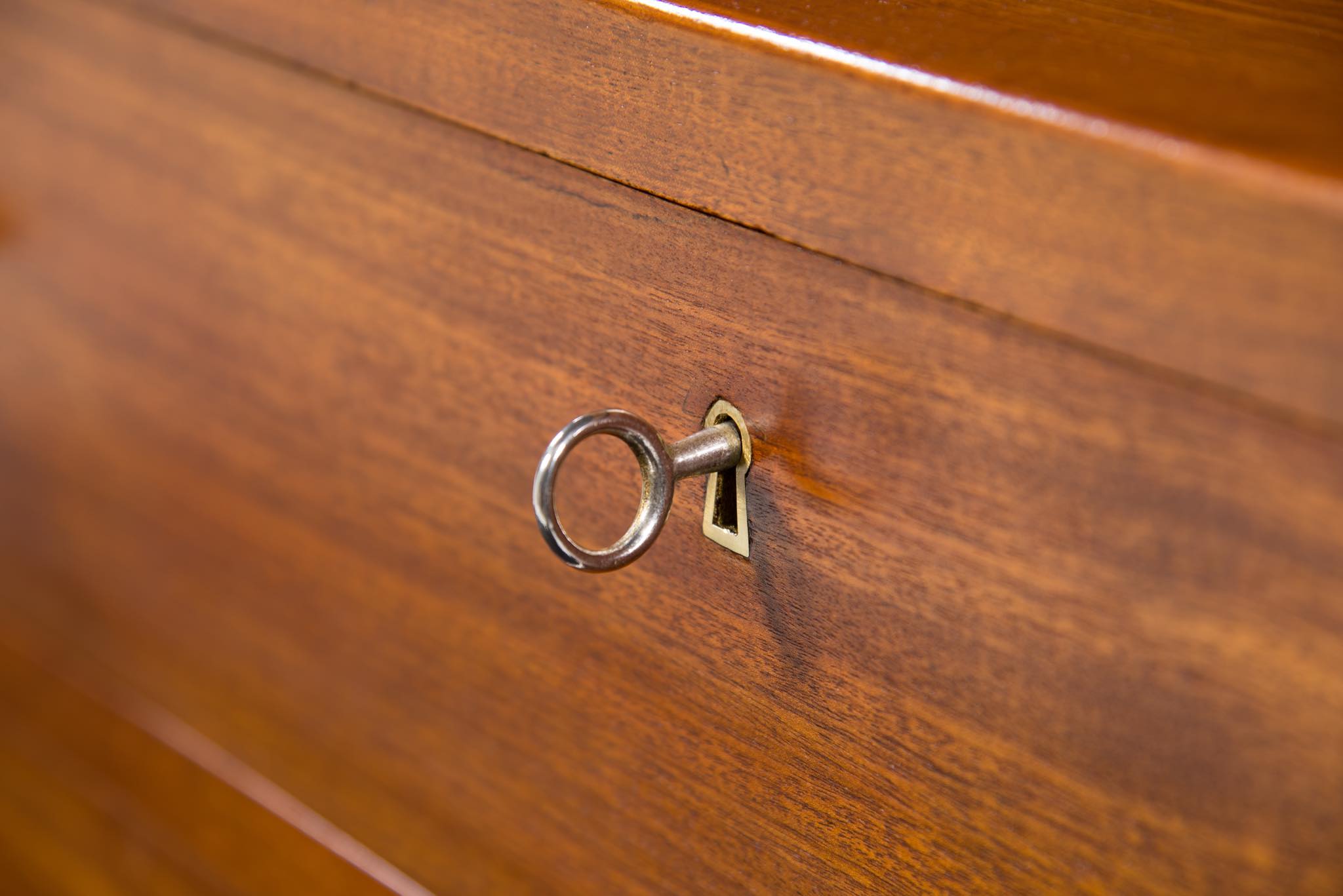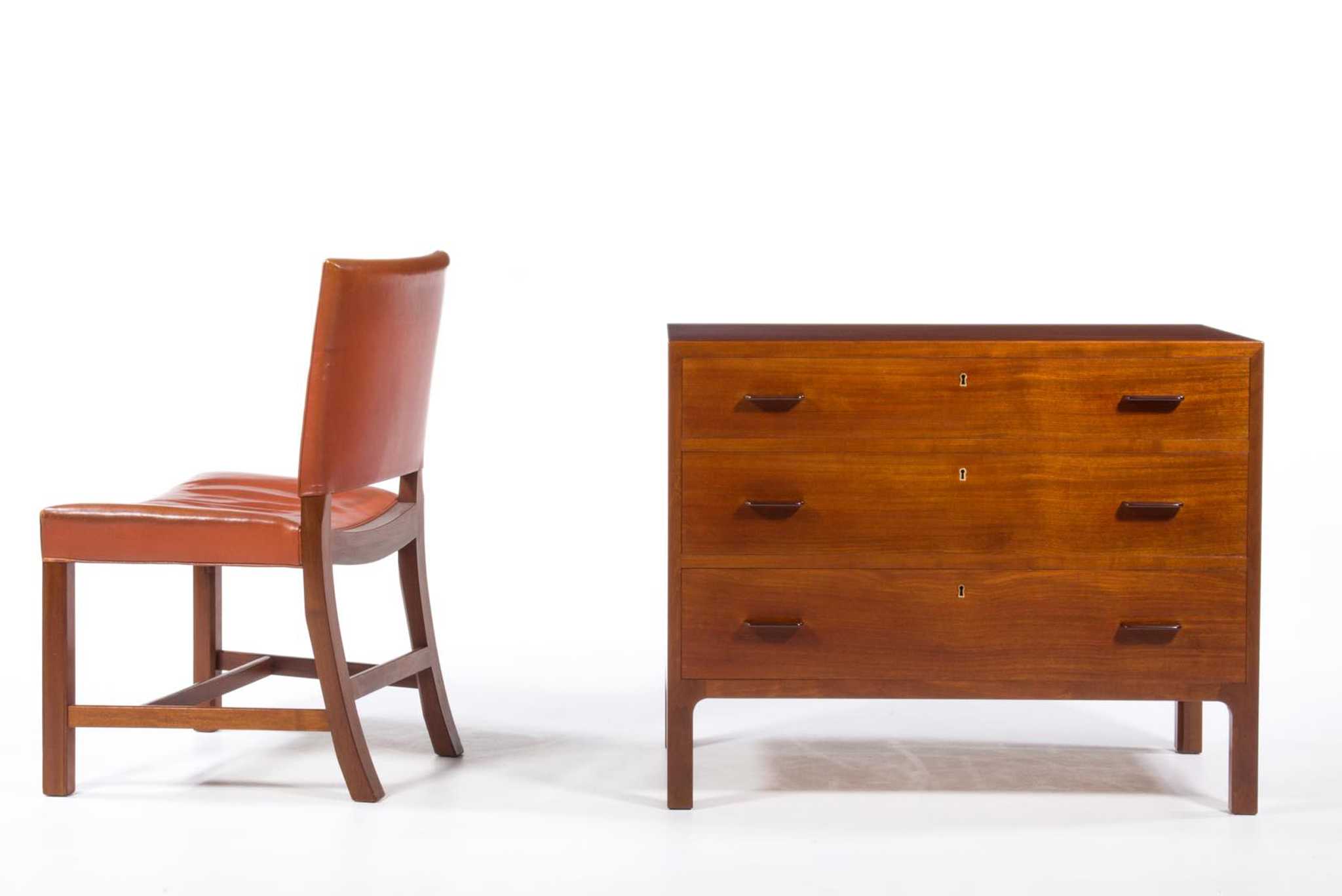 デンマークの名匠、Jacob Kjær/ヤコブ・ケアによるデザイン及び製作品としてデンマーク市場で扱われていたチェストです。資料に乏しく詳しい事は判っておりませんが、キューバンマホガニーと思しき良質な材が用いられており、側面の板は脚まで無垢の削り出しで作られています。量産品ではない、職人によってほぼ手作りで製作されたもので、1940年代頃のものでしょう。職人家具ですが、モダンなデザインによって重くなりすぎず、軽快な佇まいが特徴です。最上位の抽斗の鍵穴の縁に僅かな補修がありますが、その他とても綺麗な状態です。